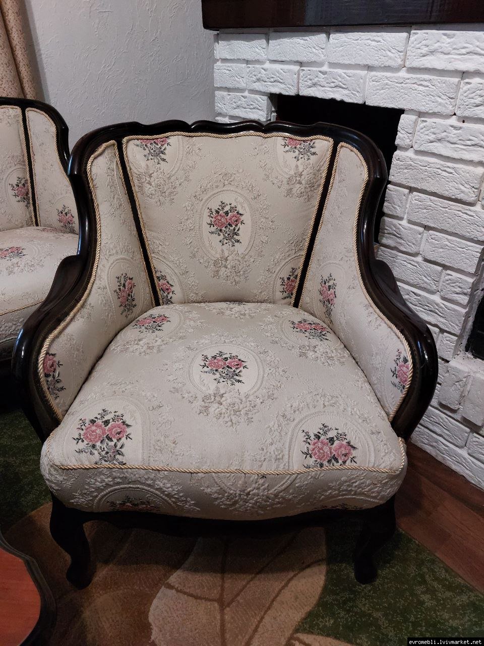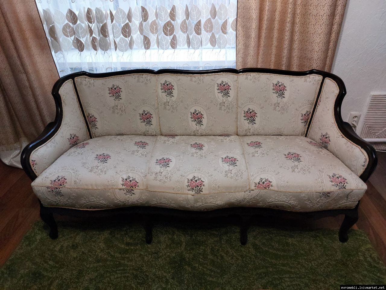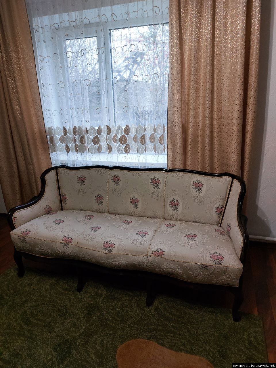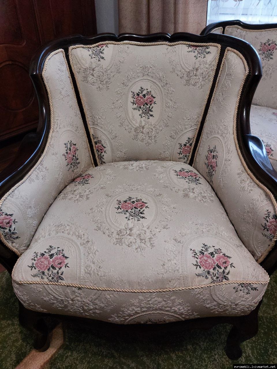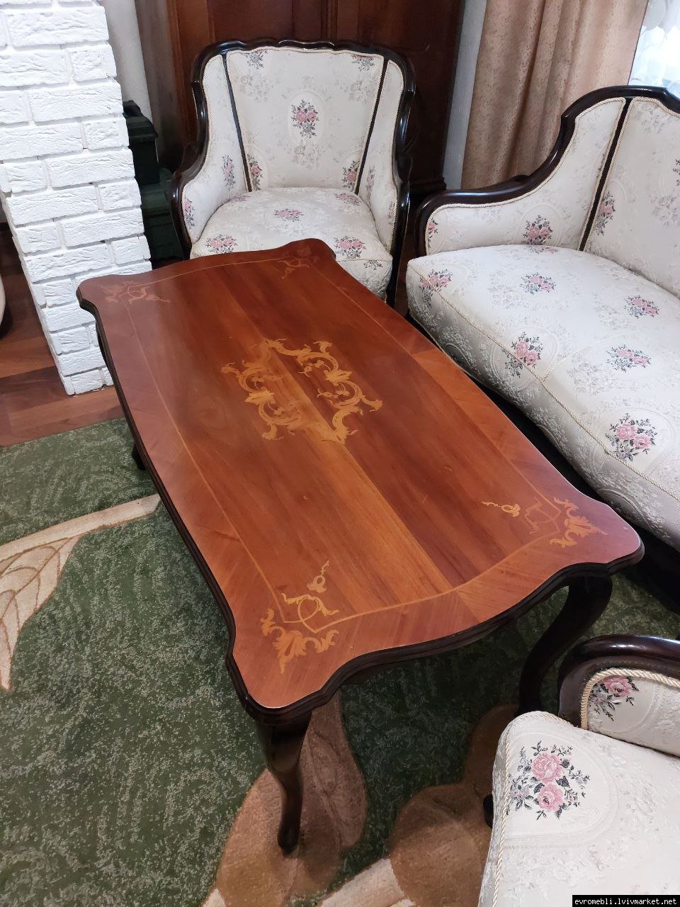 Комплект мяких меблів на деревяній основі в стилі Балатон. До комплекту входить диванчик та два крісла з підлокотниками і журнальний столик. Комплект виготовлений з натурального дерева, перетягнутий тканиною.
