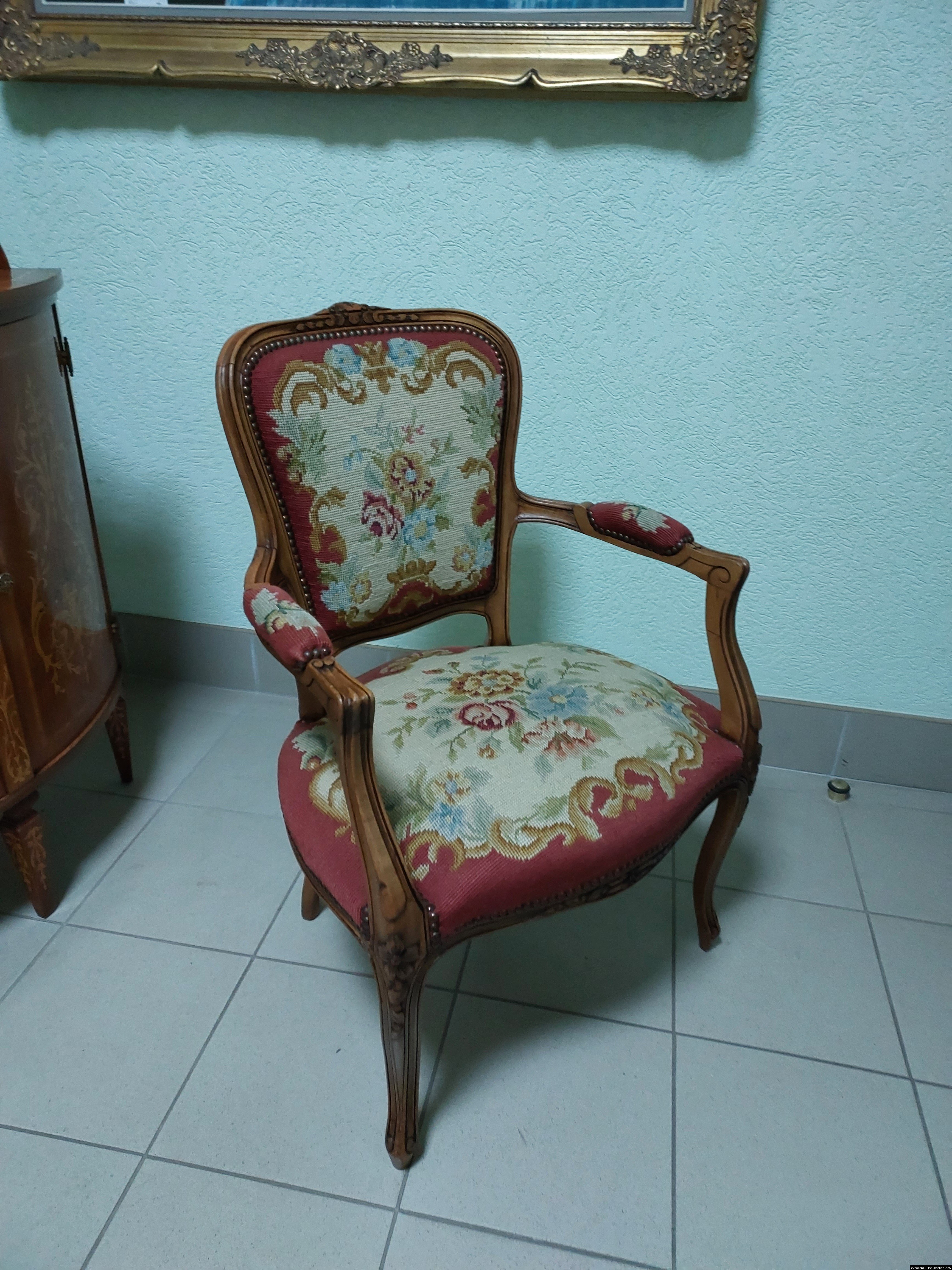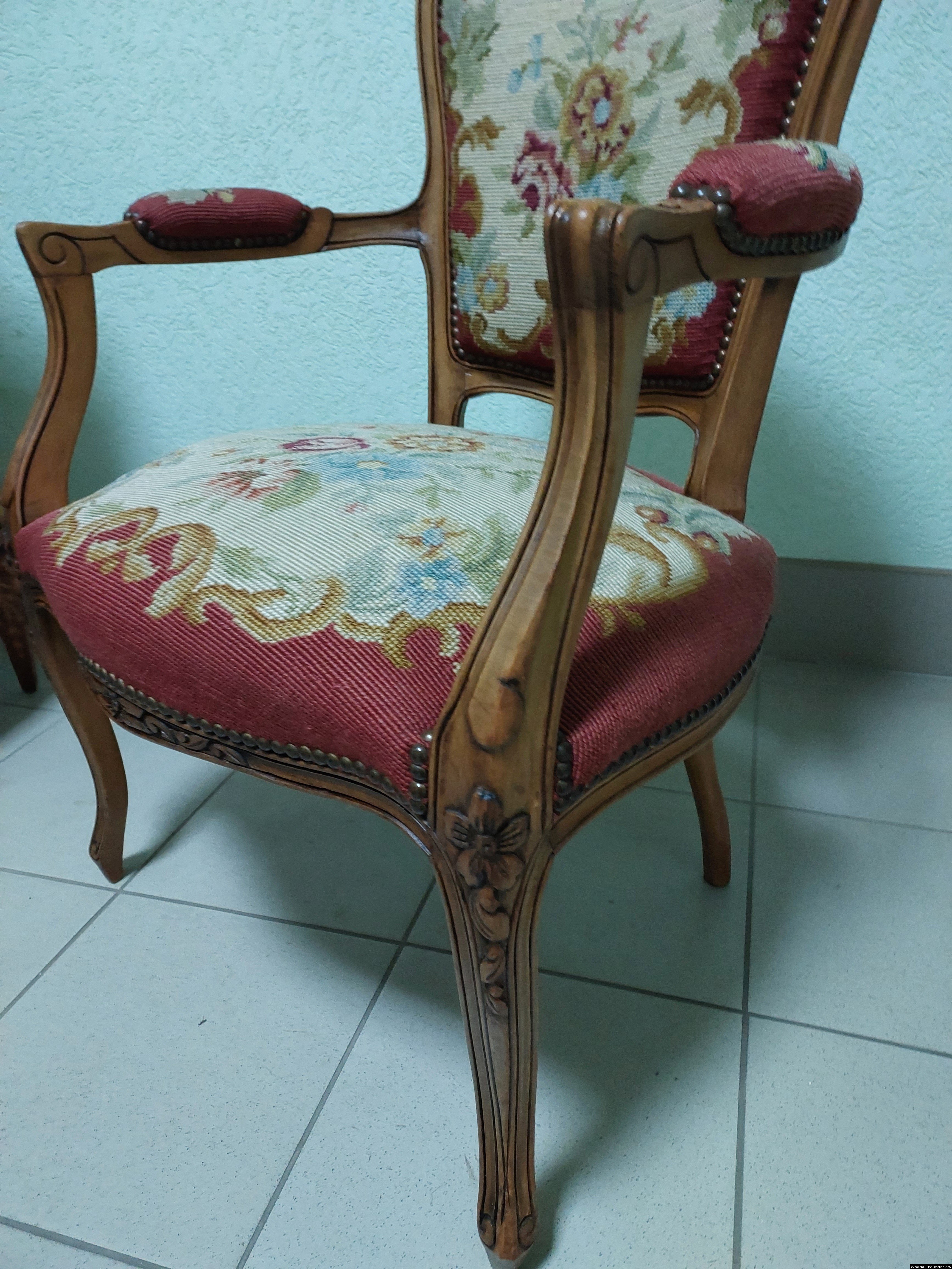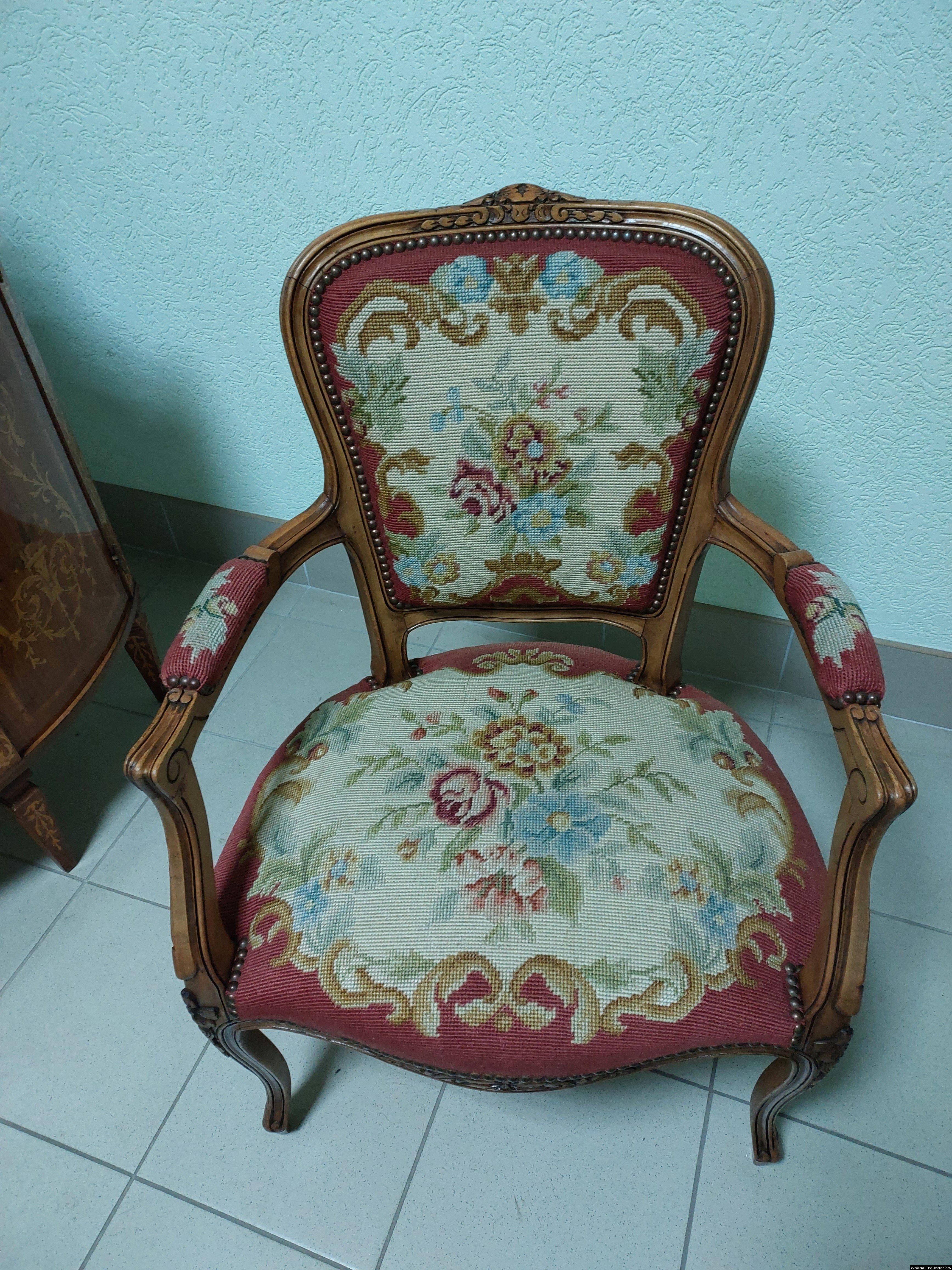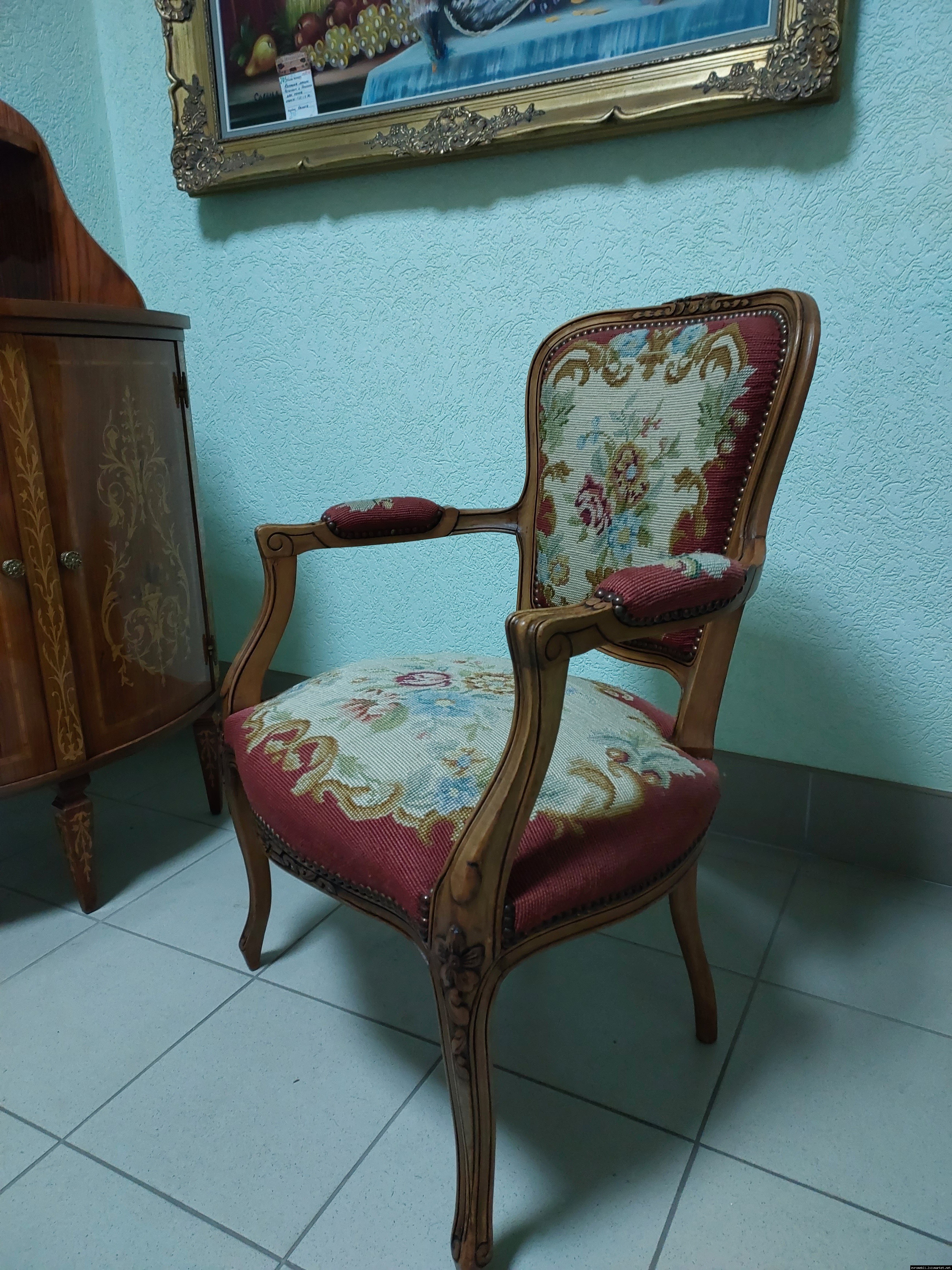 Красиве вінтажне крісло з підлокотниками в стилі Луї XV. Крісло виготовлене з натурального дерева, темний дуб, масив, щедро декоровані елементами різьби ручної роботи, обшите тканиною вишневого кольору, тканина оздоблена вишивкою ручної роботи та декоративними цвяшками. Крісло зручне та комфортне, в хорошому стані, привезене з Бельгії.