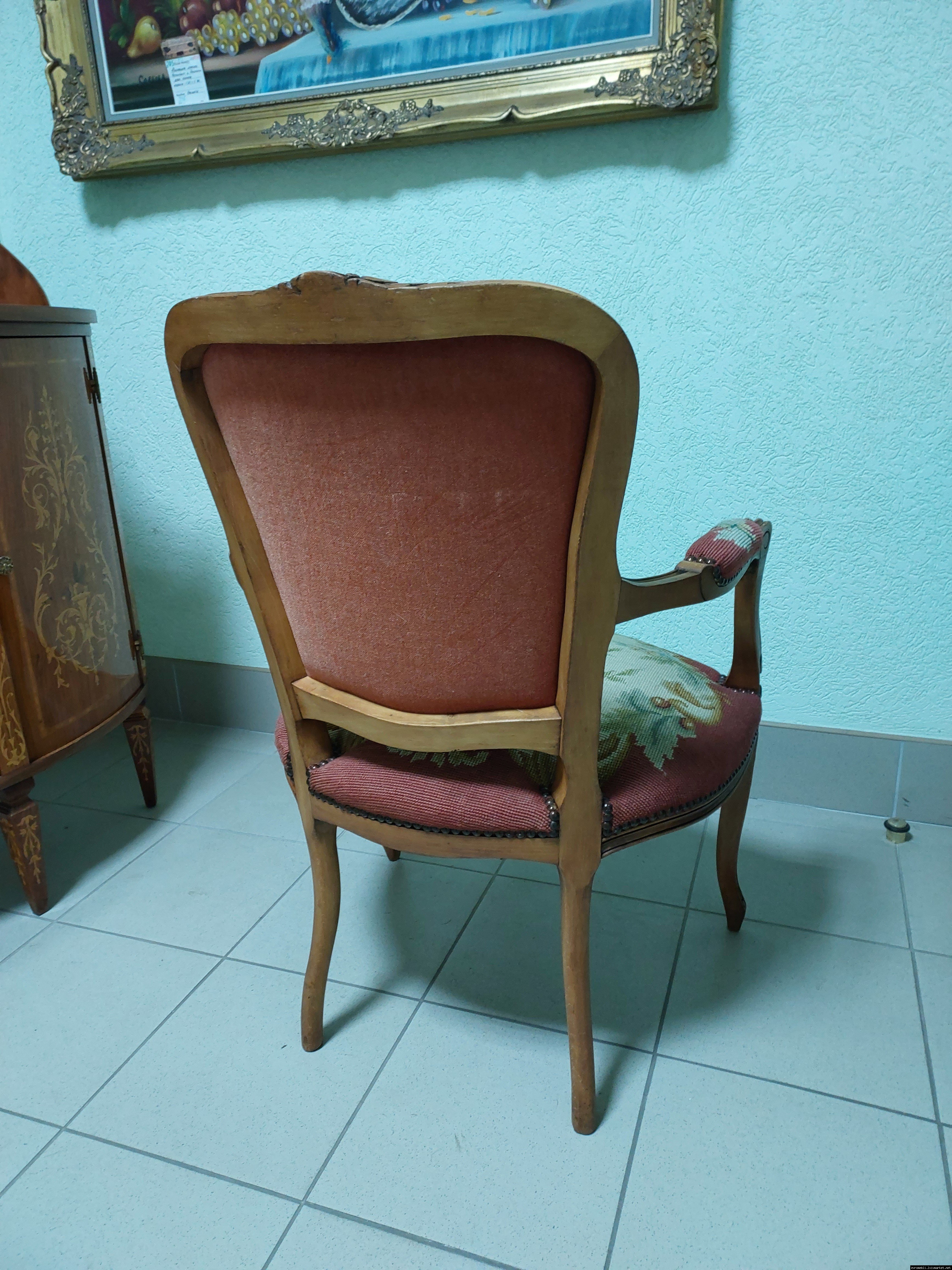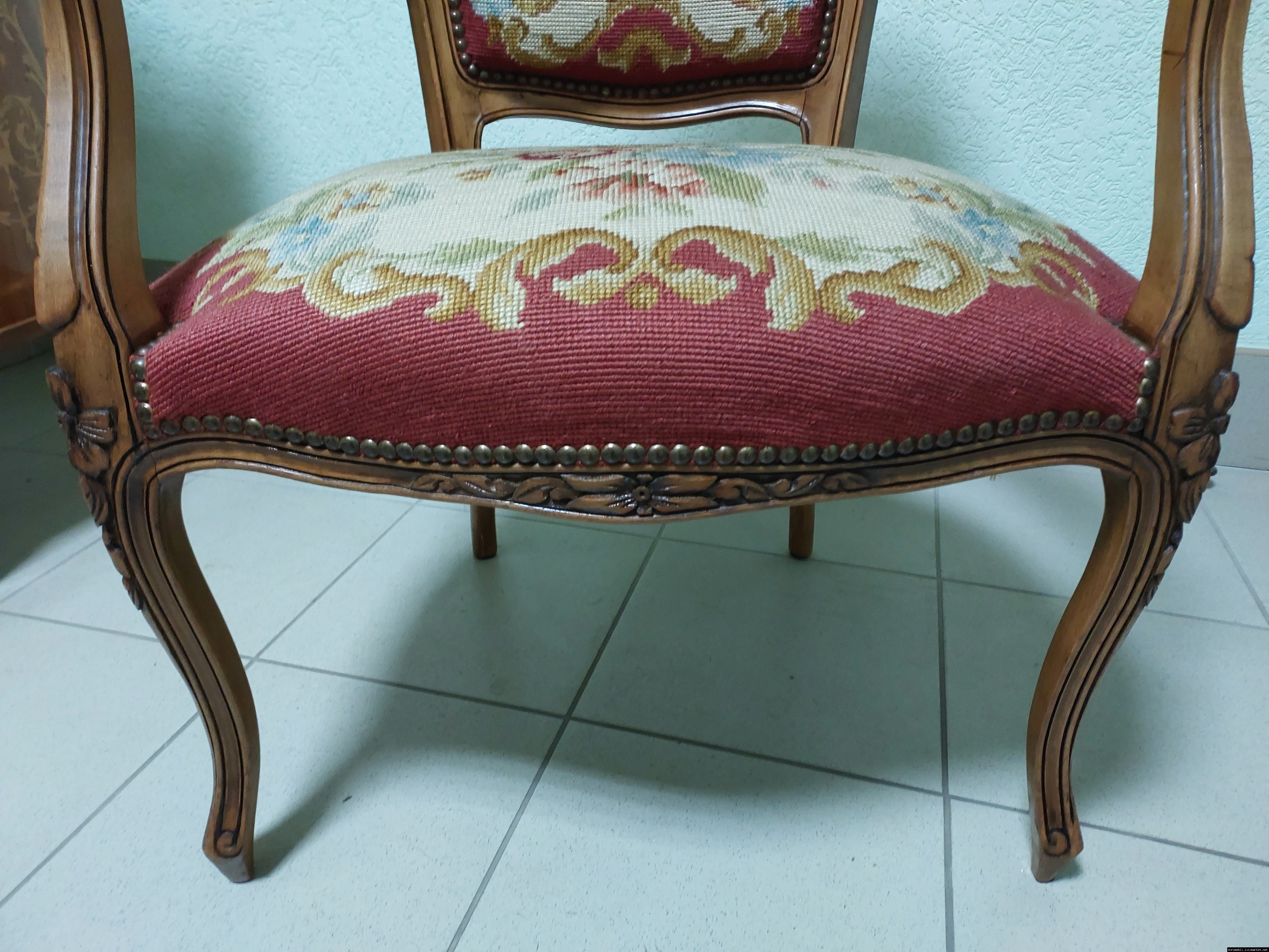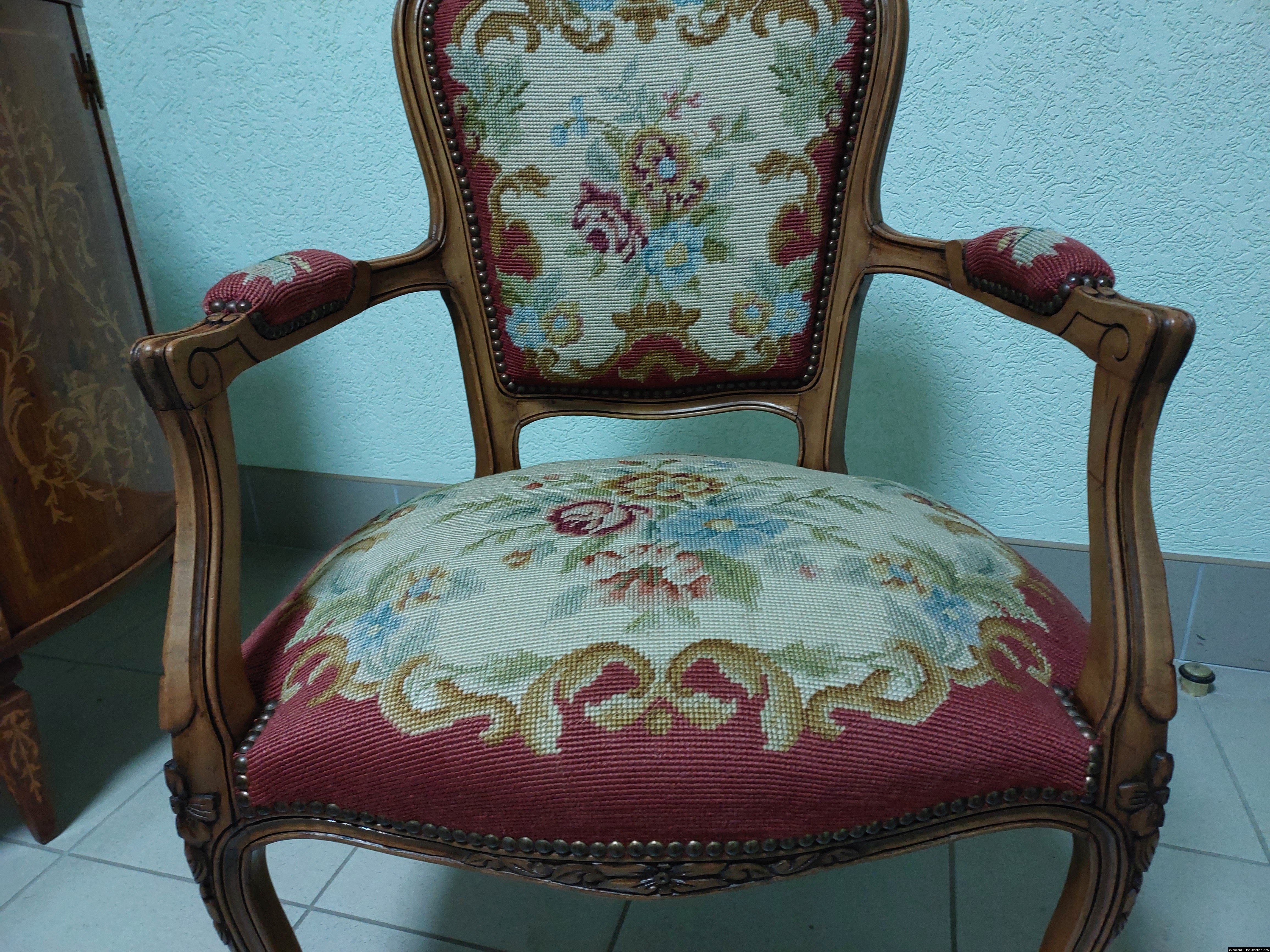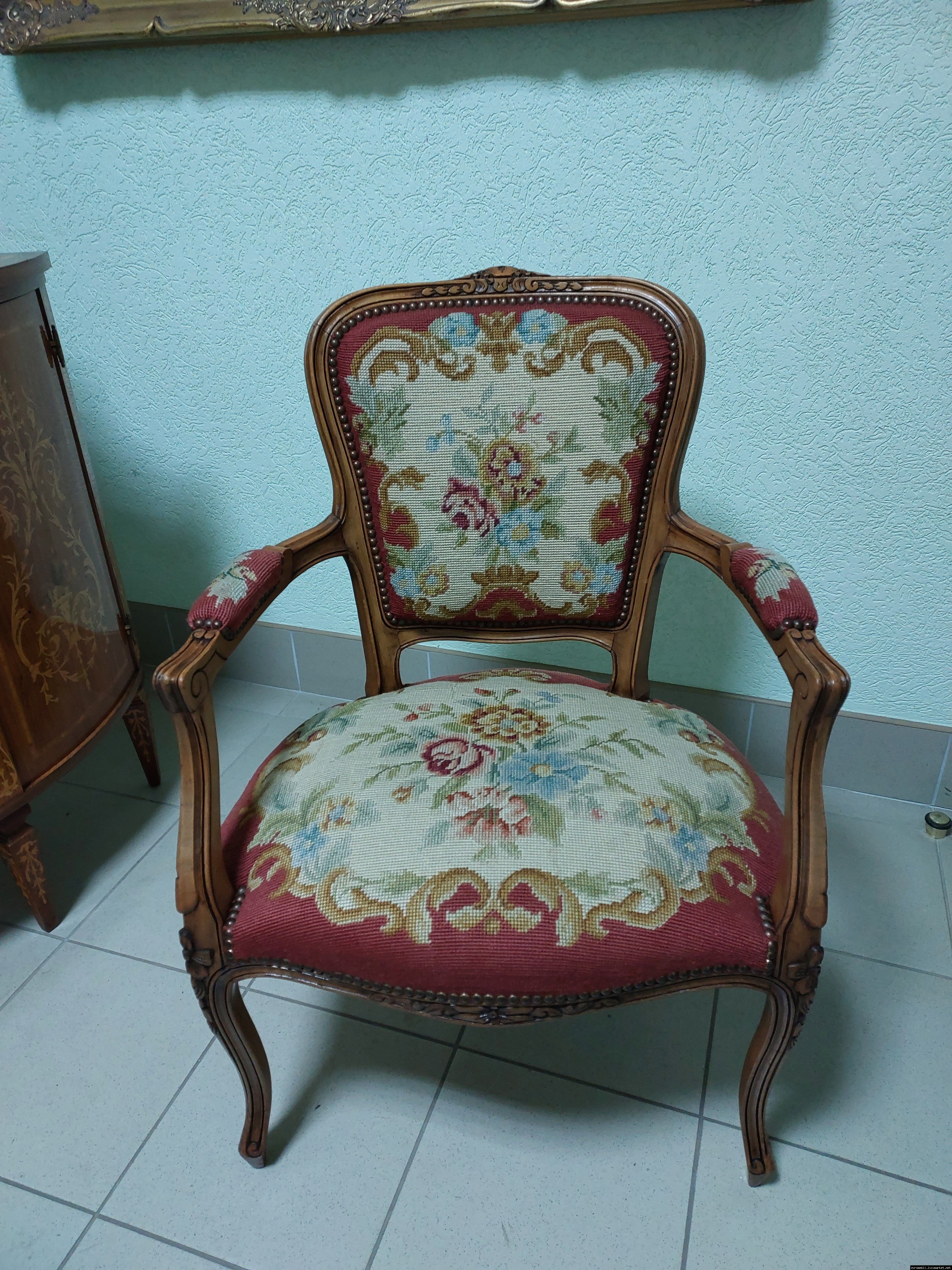 Красиве вінтажне крісло з підлокотниками в стилі Луї XV. Крісло виготовлене з натурального дерева, темний дуб, масив, щедро декоровані елементами різьби ручної роботи, обшите тканиною вишневого кольору, тканина оздоблена вишивкою ручної роботи та декоративними цвяшками. Крісло зручне та комфортне, в хорошому стані, привезене з Бельгії.