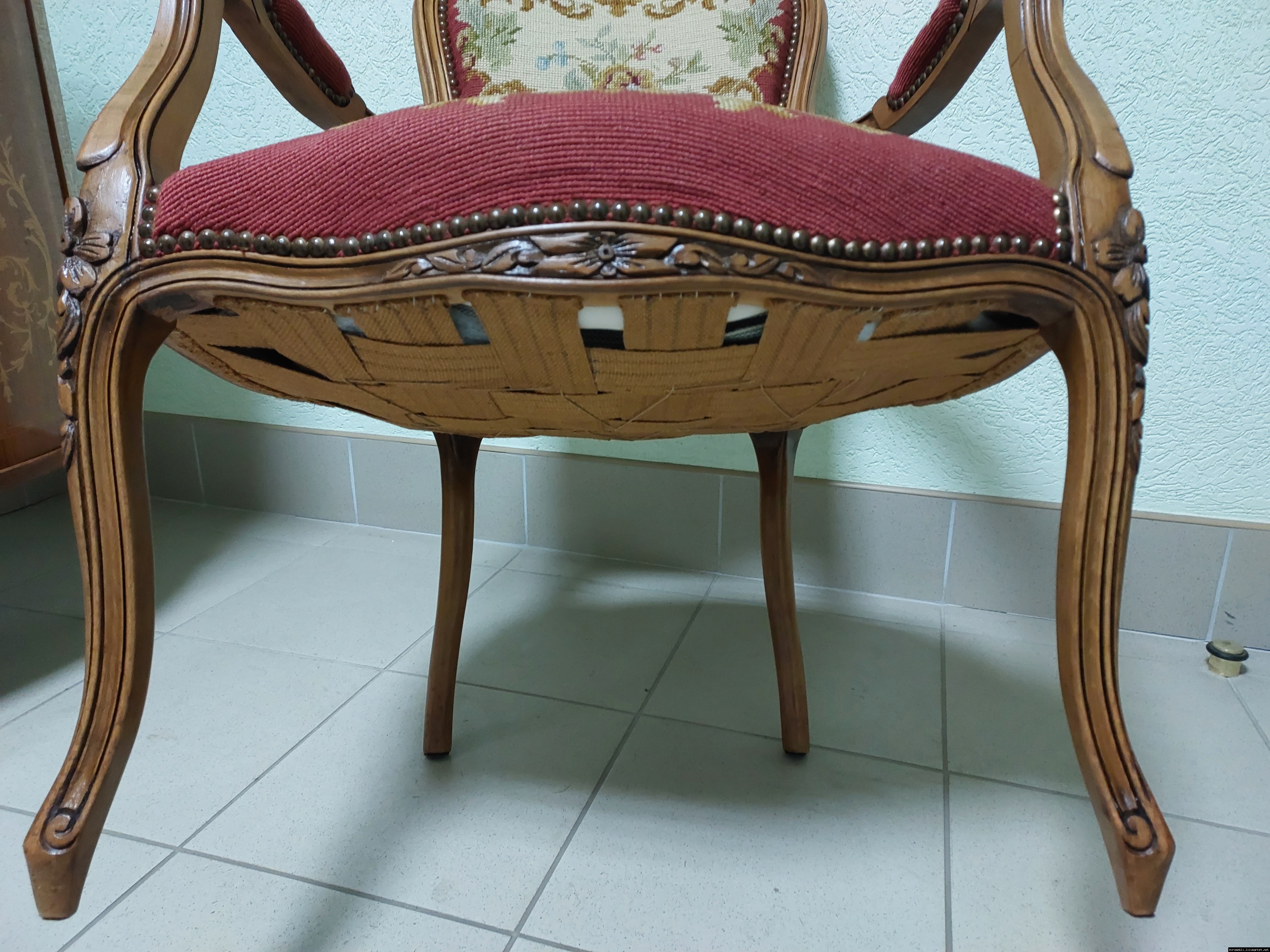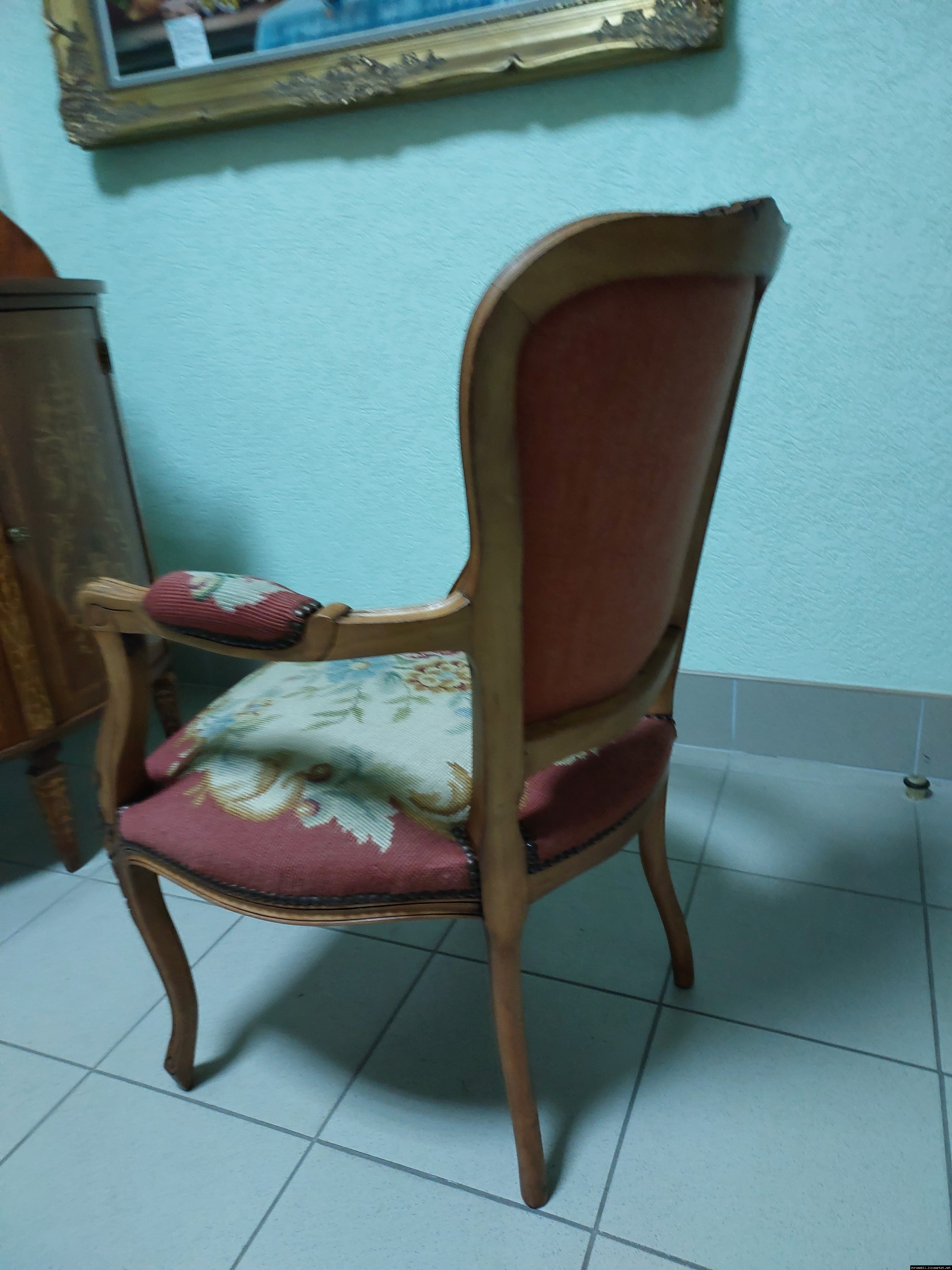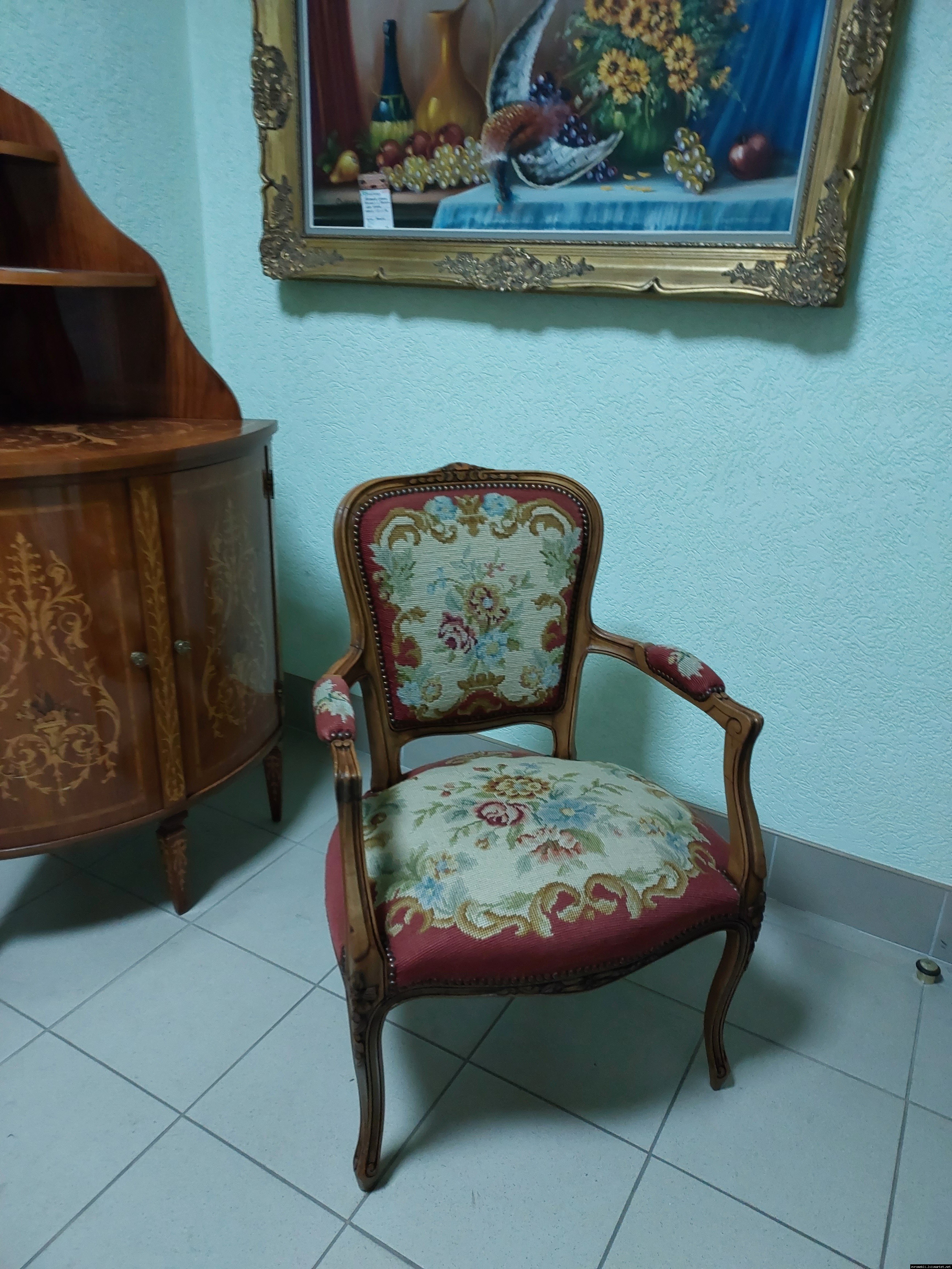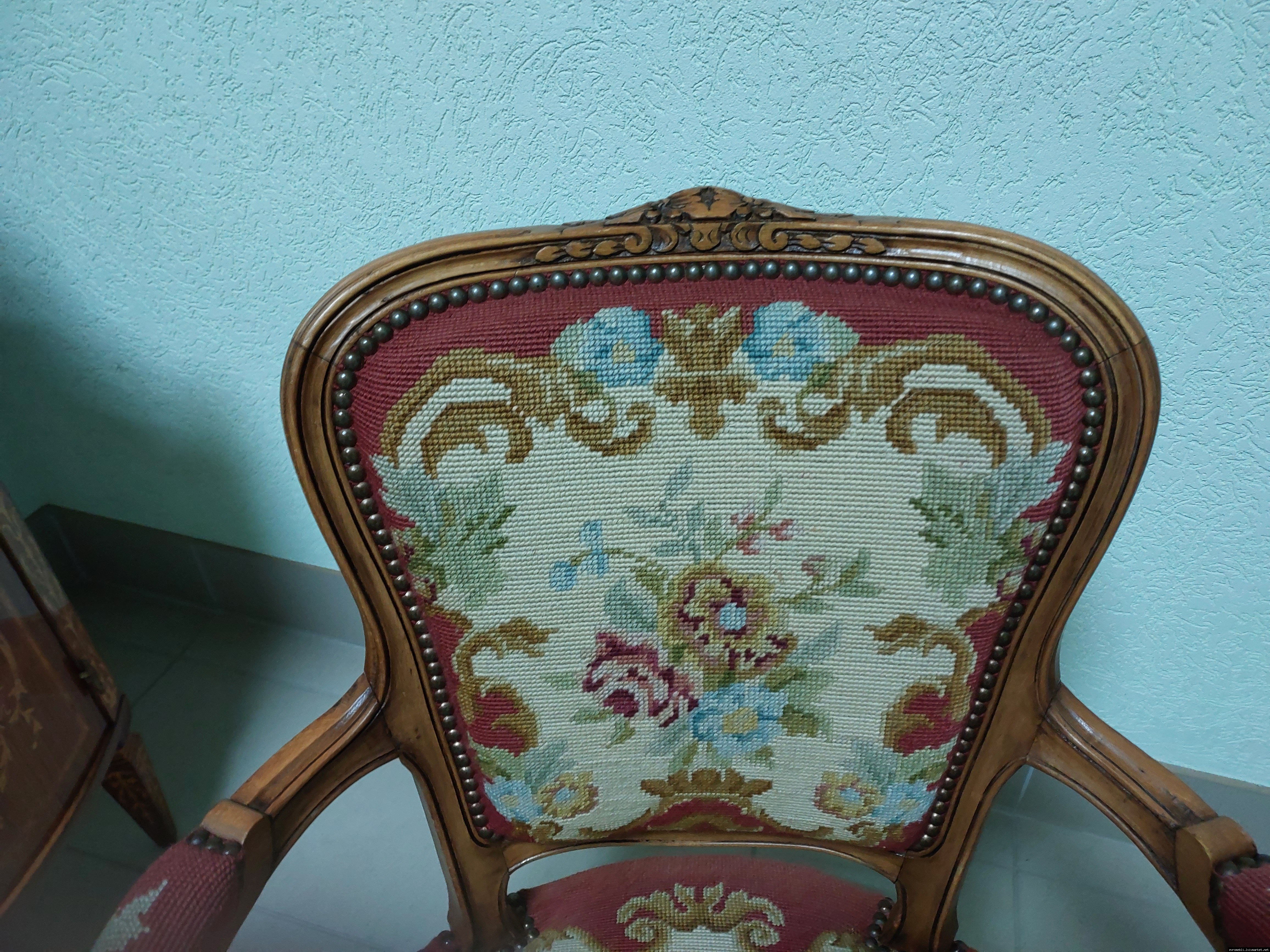 Красиве вінтажне крісло з підлокотниками в стилі Луї XV. Крісло виготовлене з натурального дерева, темний дуб, масив, щедро декоровані елементами різьби ручної роботи, обшите тканиною вишневого кольору, тканина оздоблена вишивкою ручної роботи та декоративними цвяшками. Крісло зручне та комфортне, в хорошому стані, привезене з Бельгії.