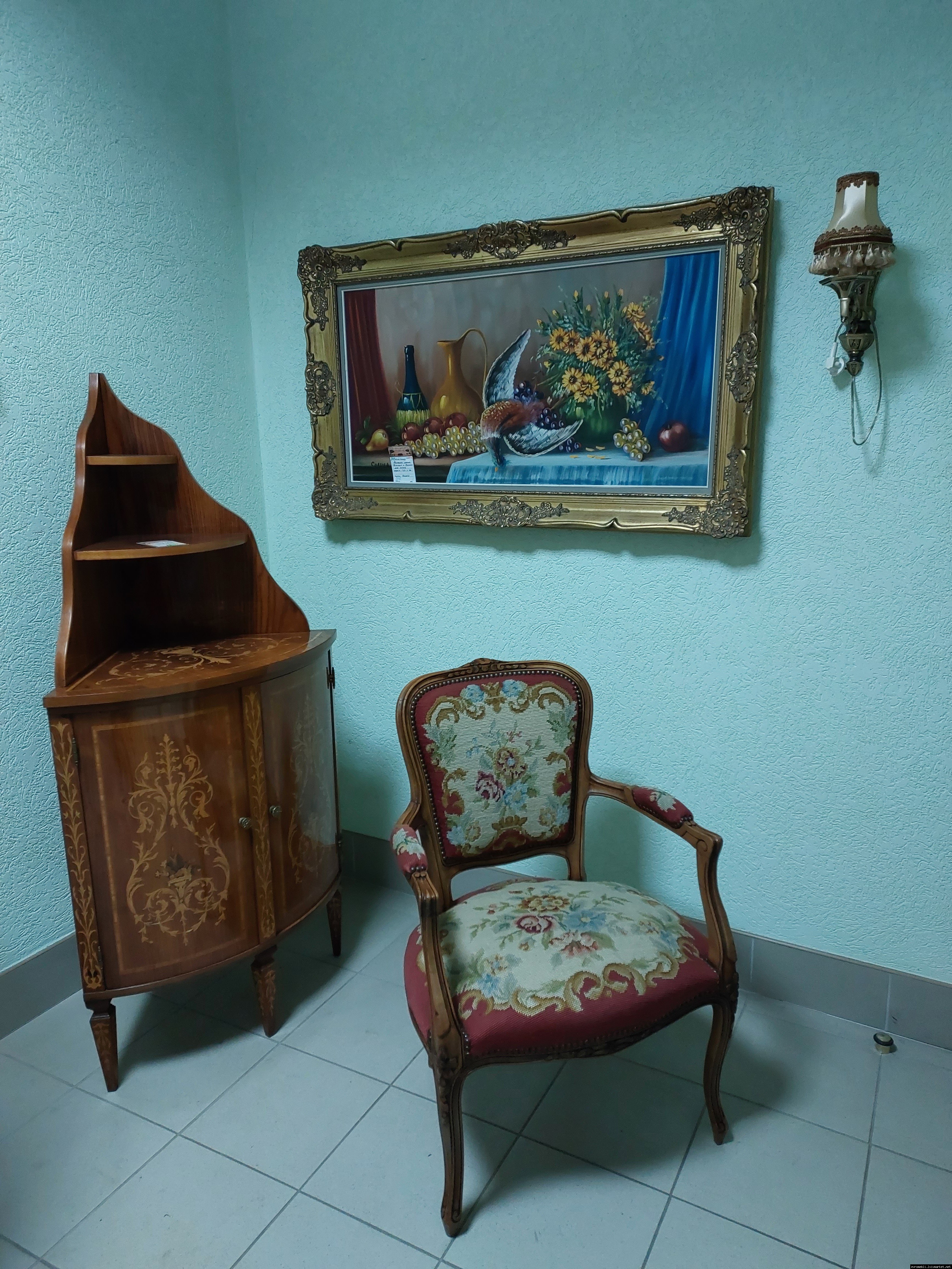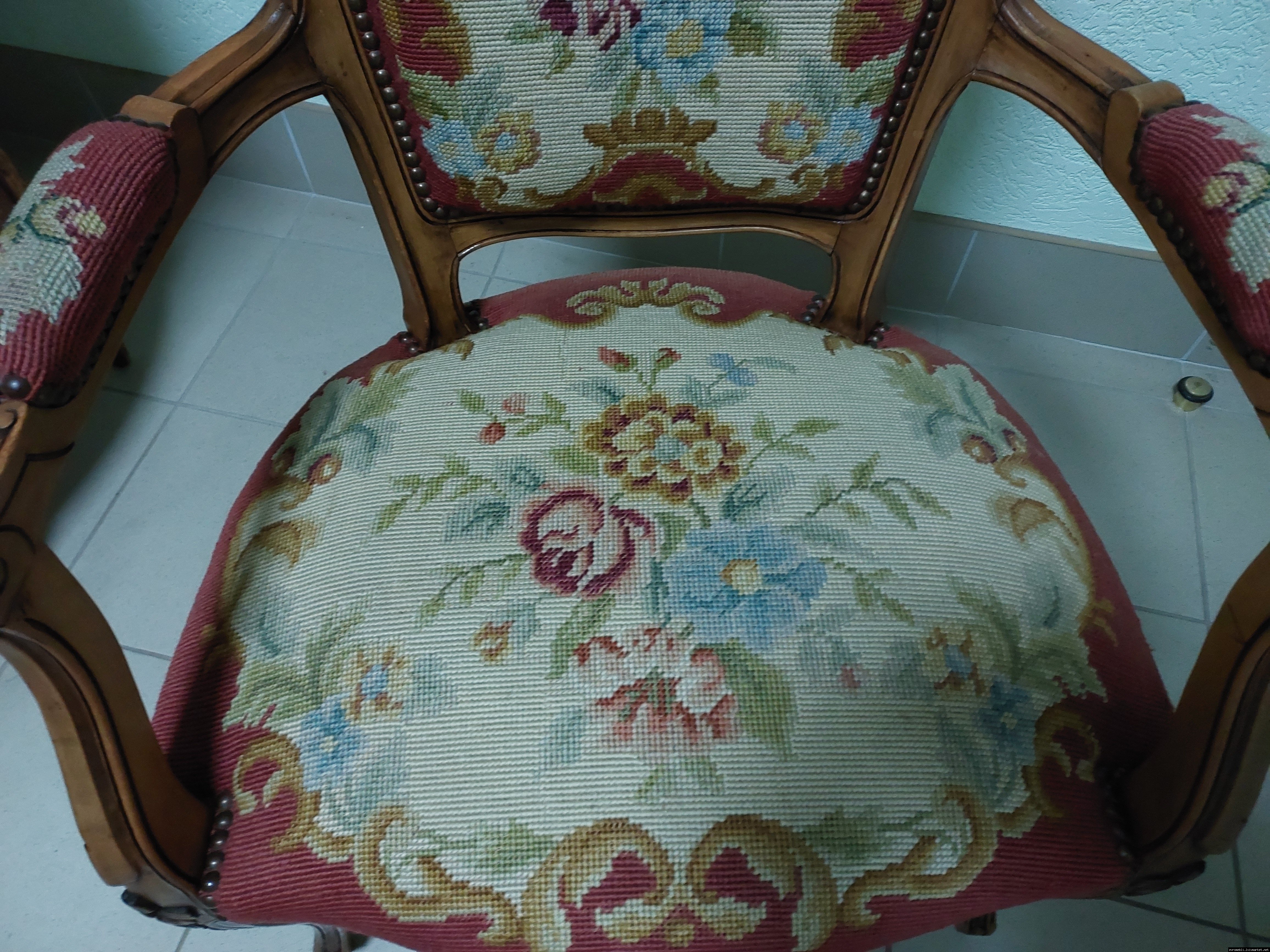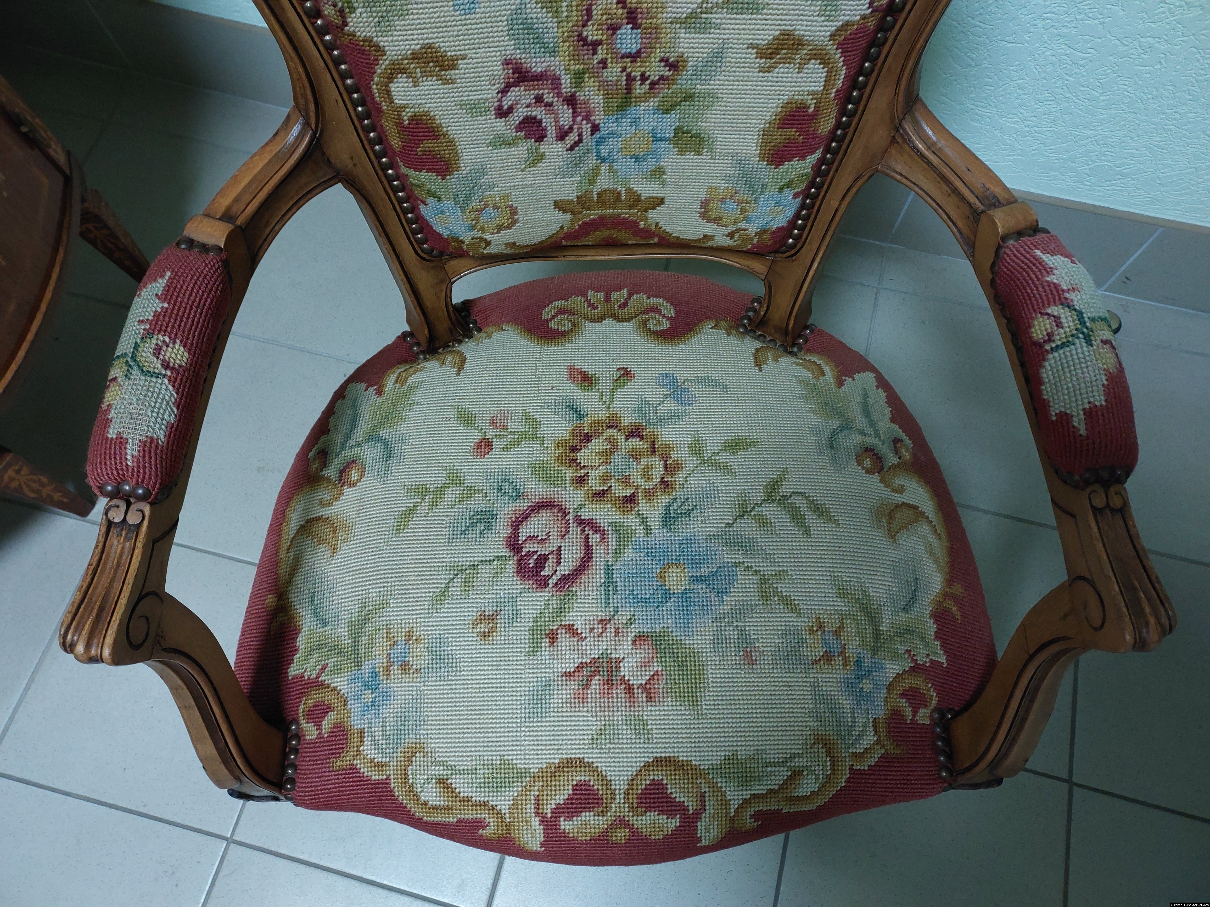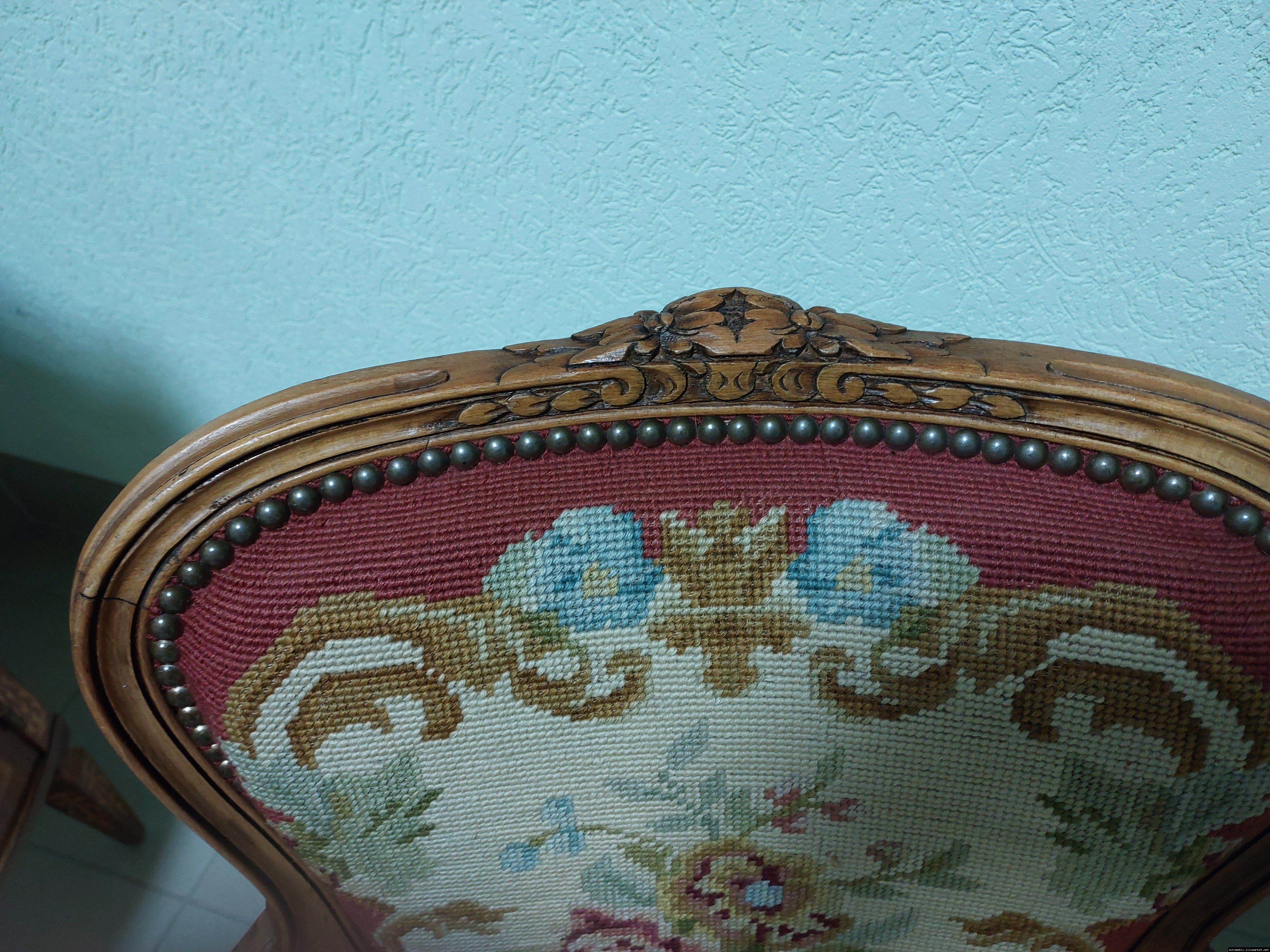 Красиве вінтажне крісло з підлокотниками в стилі Луї XV. Крісло виготовлене з натурального дерева, темний дуб, масив, щедро декоровані елементами різьби ручної роботи, обшите тканиною вишневого кольору, тканина оздоблена вишивкою ручної роботи та декоративними цвяшками. Крісло зручне та комфортне, в хорошому стані, привезене з Бельгії.