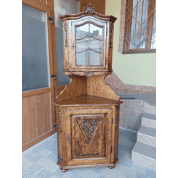 Деревяна кутова вітрина в стилі Луї. Вітрина виготовлена з натурального дерева, темно- золотистий дуб, масив, щедро декорована елементами різьби ручної роботи. Вітрина має дві дверки, одна з них зі склом та одну відкриту полицю, дверки вітрини зачиняються на ключ, всередині є деревяні полиці. Вітрина в хорошому стані, вмістима та зручна в користуванні, привезена з Бельгії.