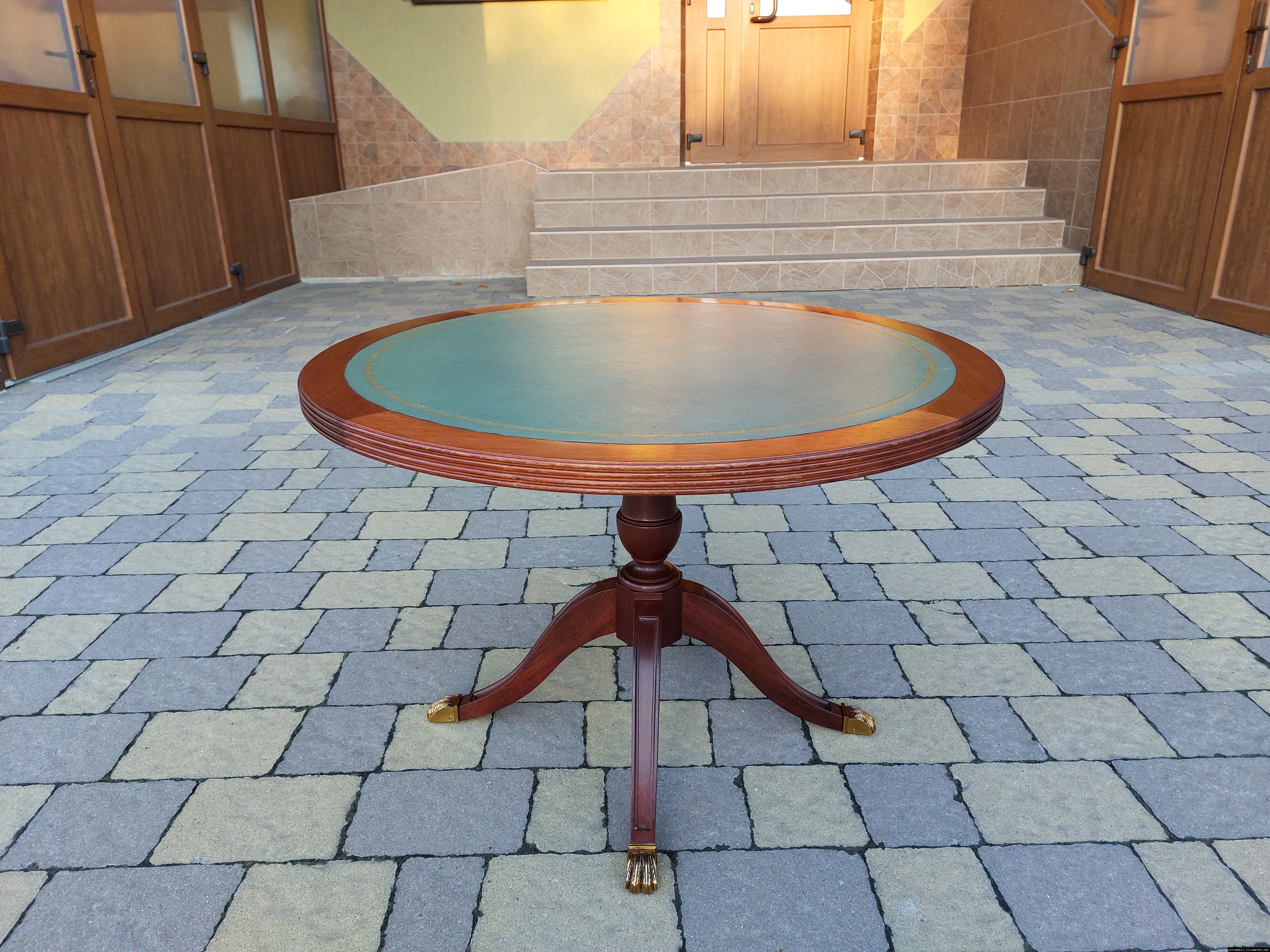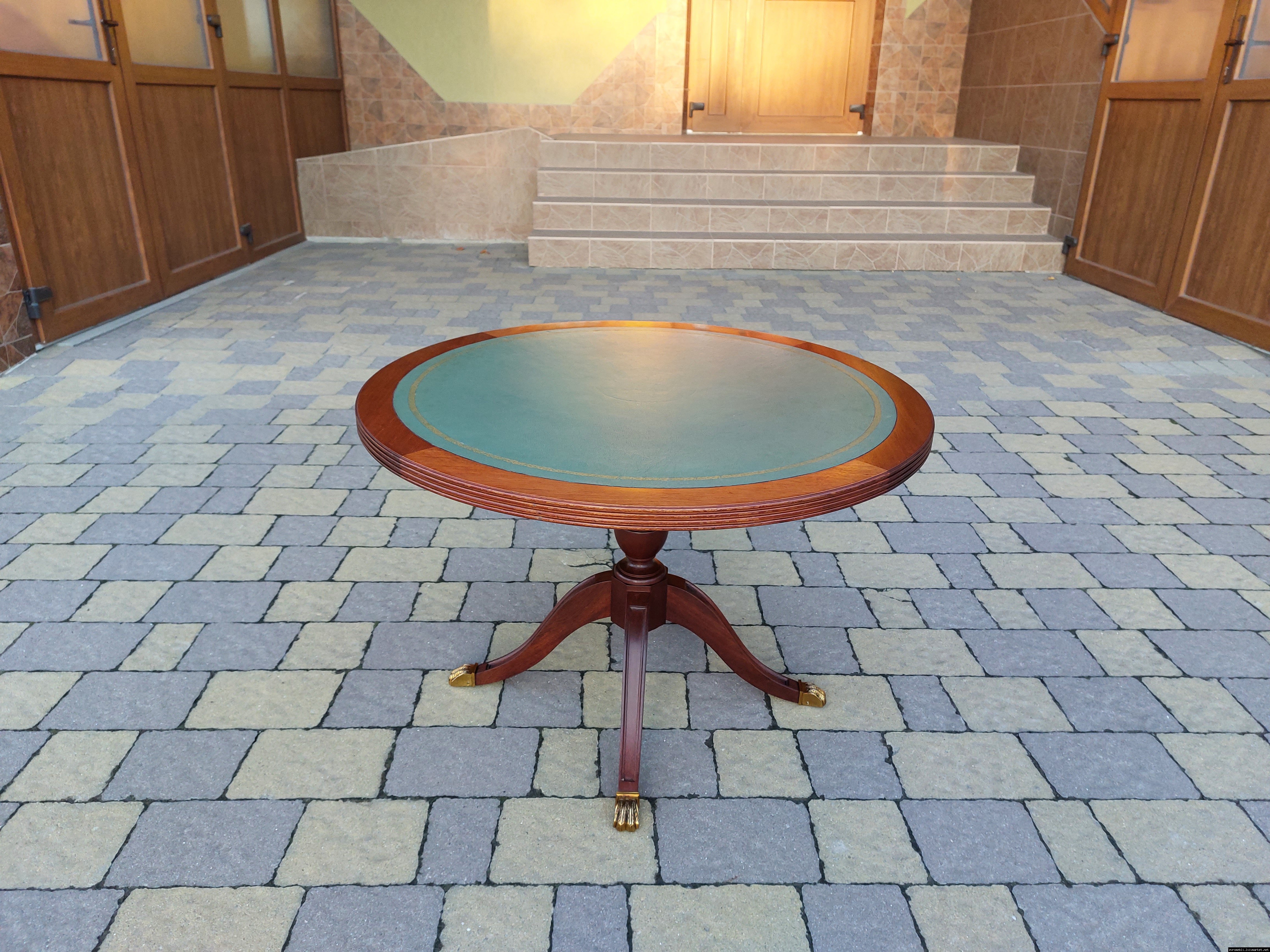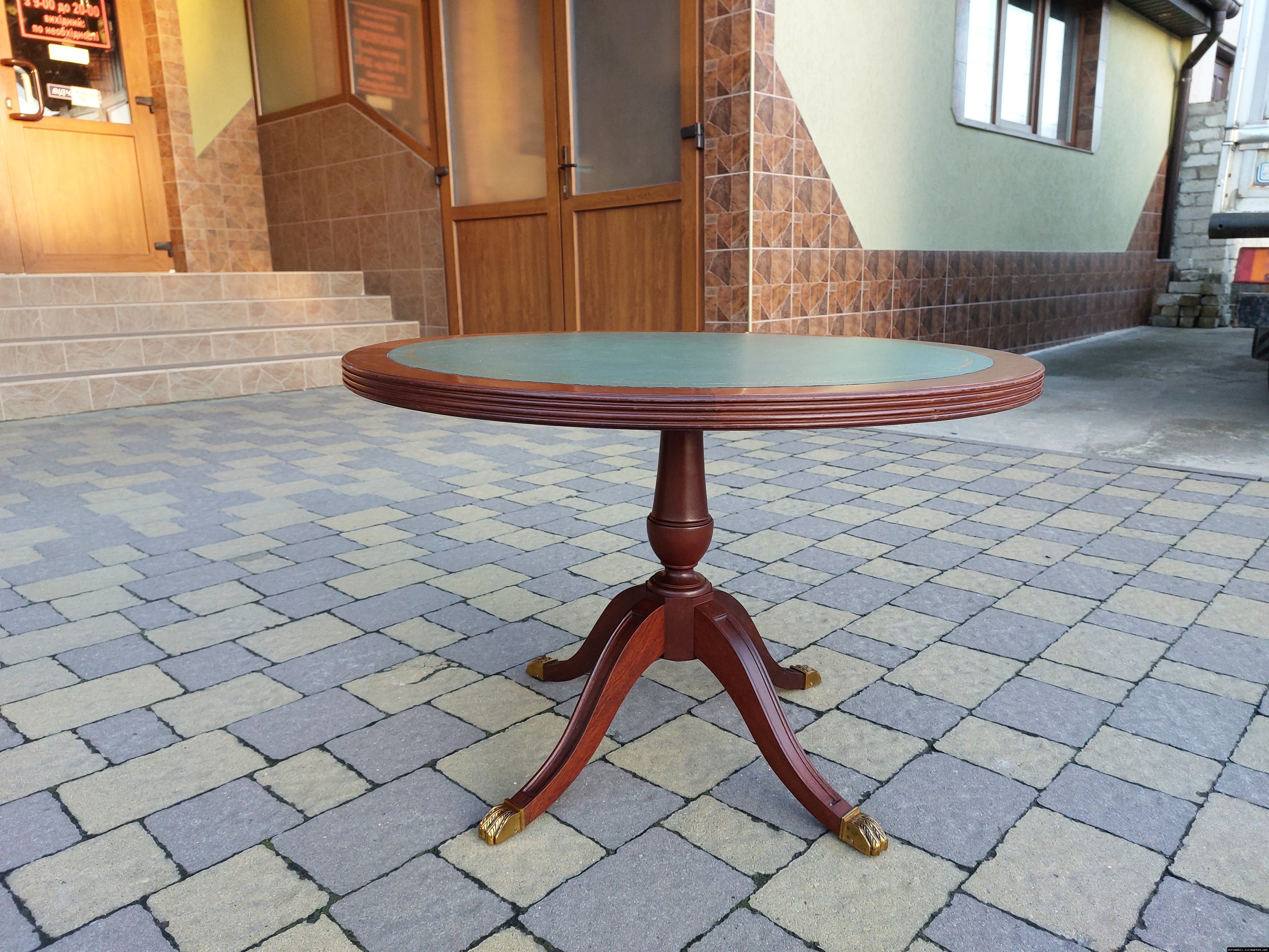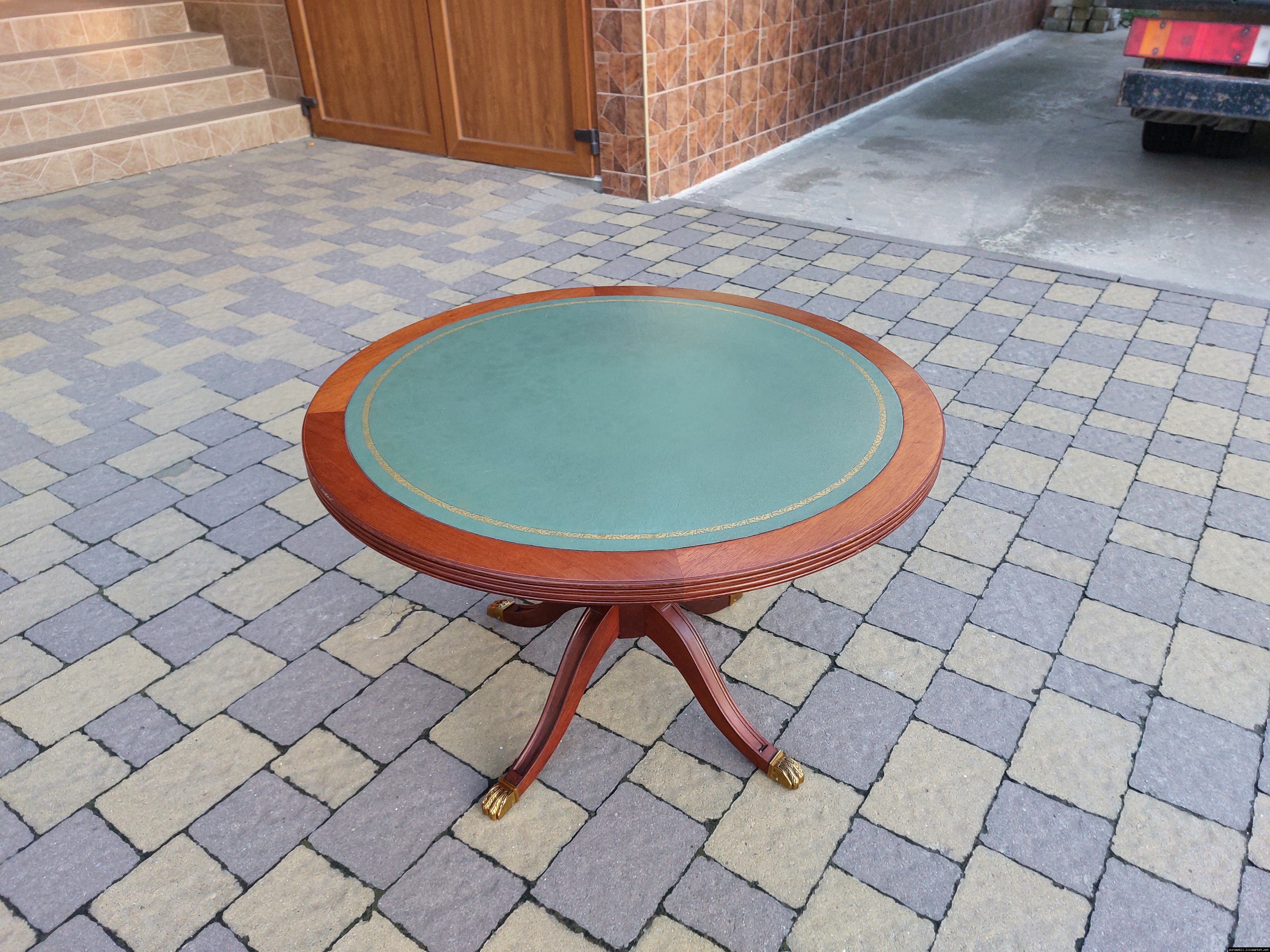 Красивий столик з дерева ручної роботи. Столик на трьох ніжках, виготовлений з натурального дерева, столешня круглої форми, обтягнута якісним замінником зеленого кольору. Ніжки столу декоровані латунним литтям у вигляді лап. Стіл в хорошому стані, компактний та зручний в користуванні, привезений з Бельгії.