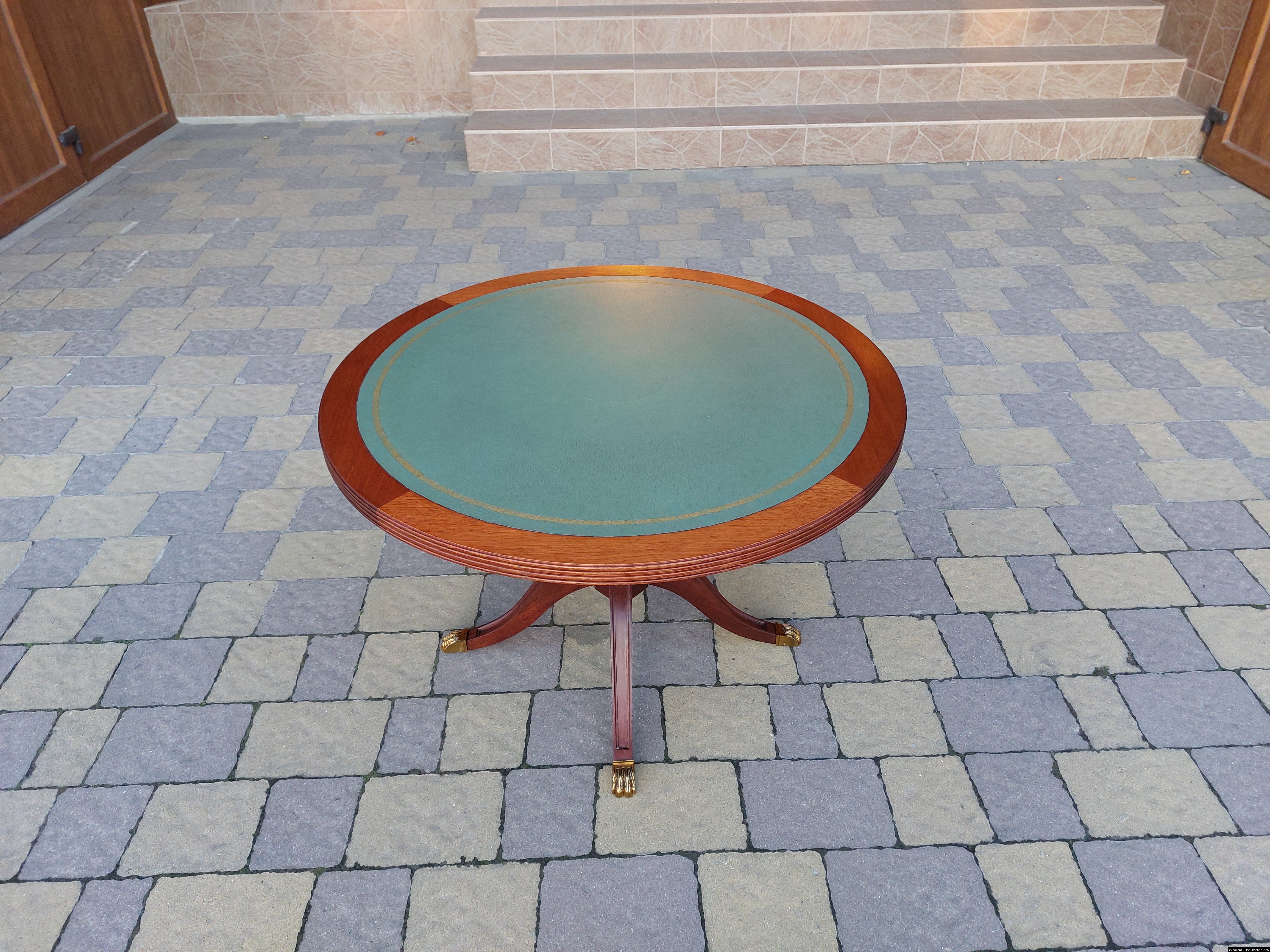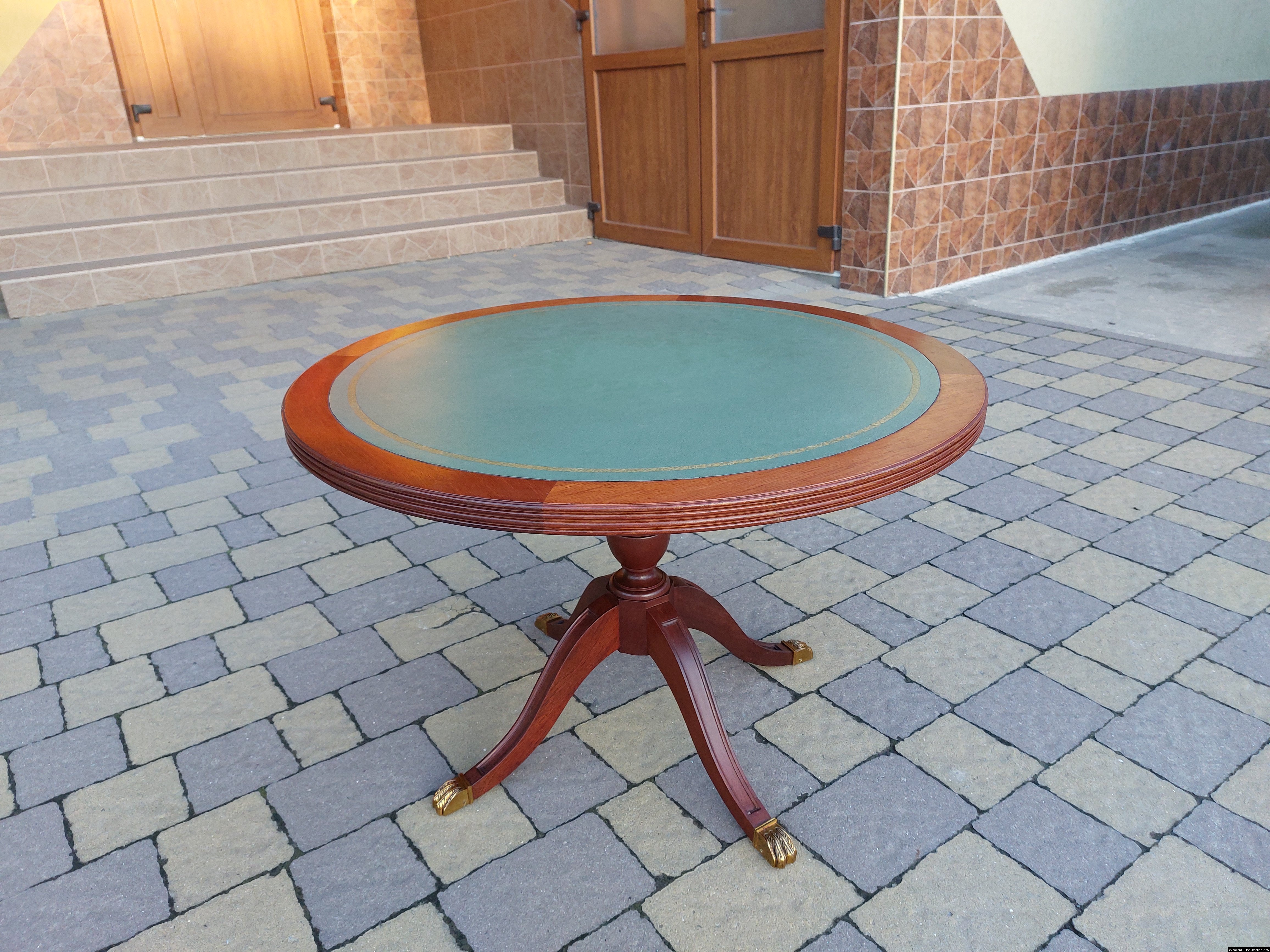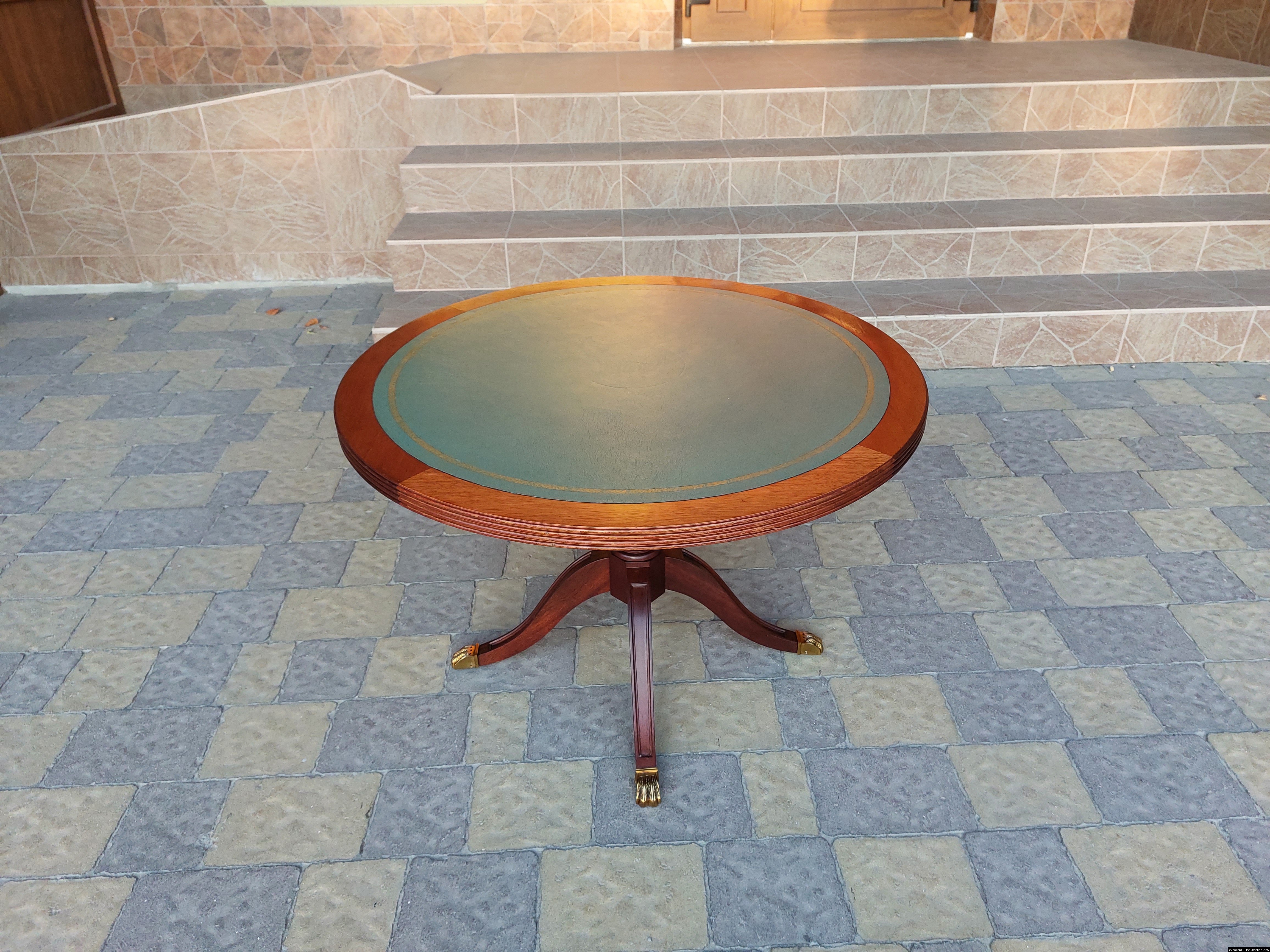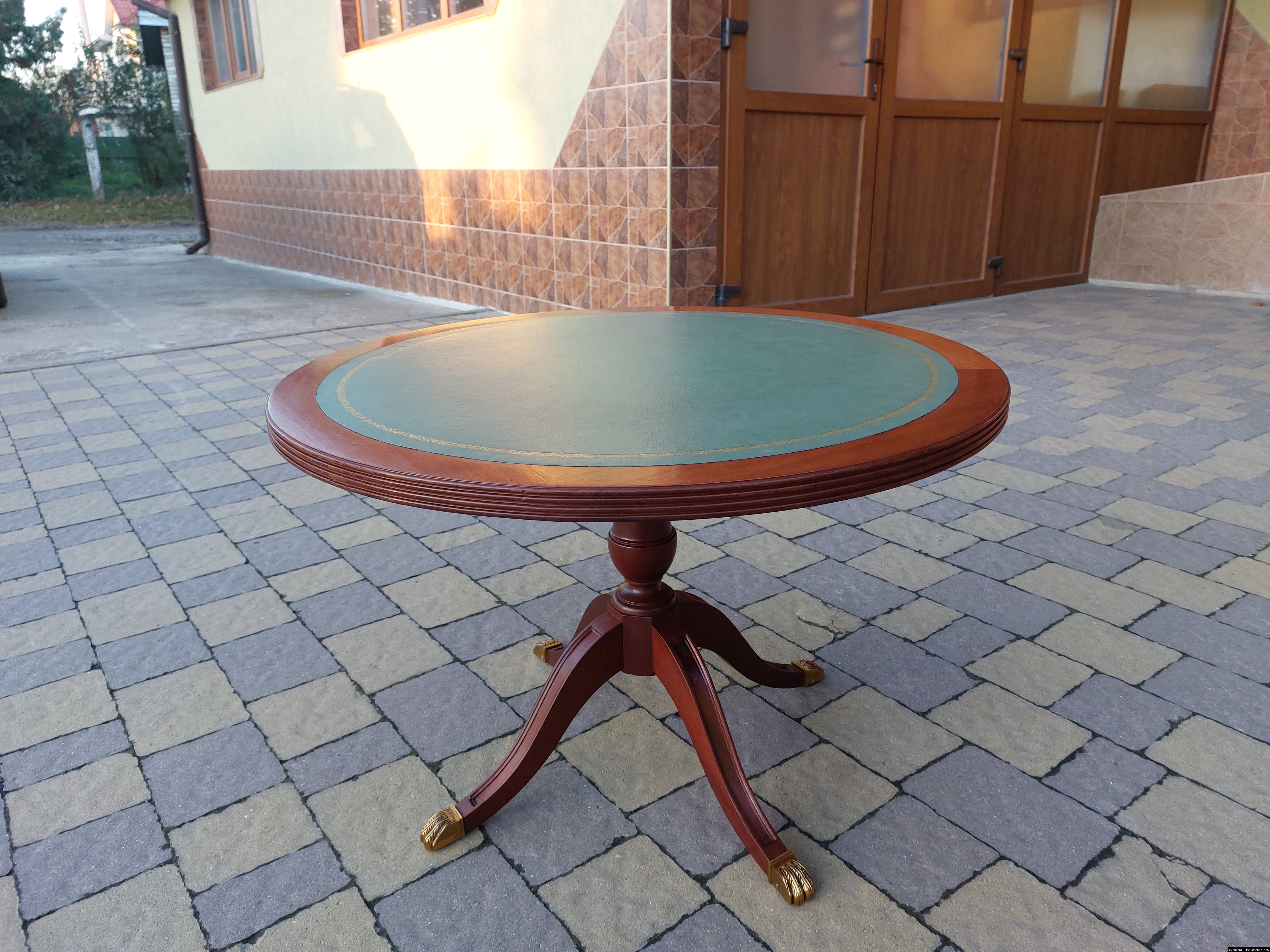 Красивий столик з дерева ручної роботи. Столик на трьох ніжках, виготовлений з натурального дерева, столешня круглої форми, обтягнута якісним замінником зеленого кольору. Ніжки столу декоровані латунним литтям у вигляді лап. Стіл в хорошому стані, компактний та зручний в користуванні, привезений з Бельгії.