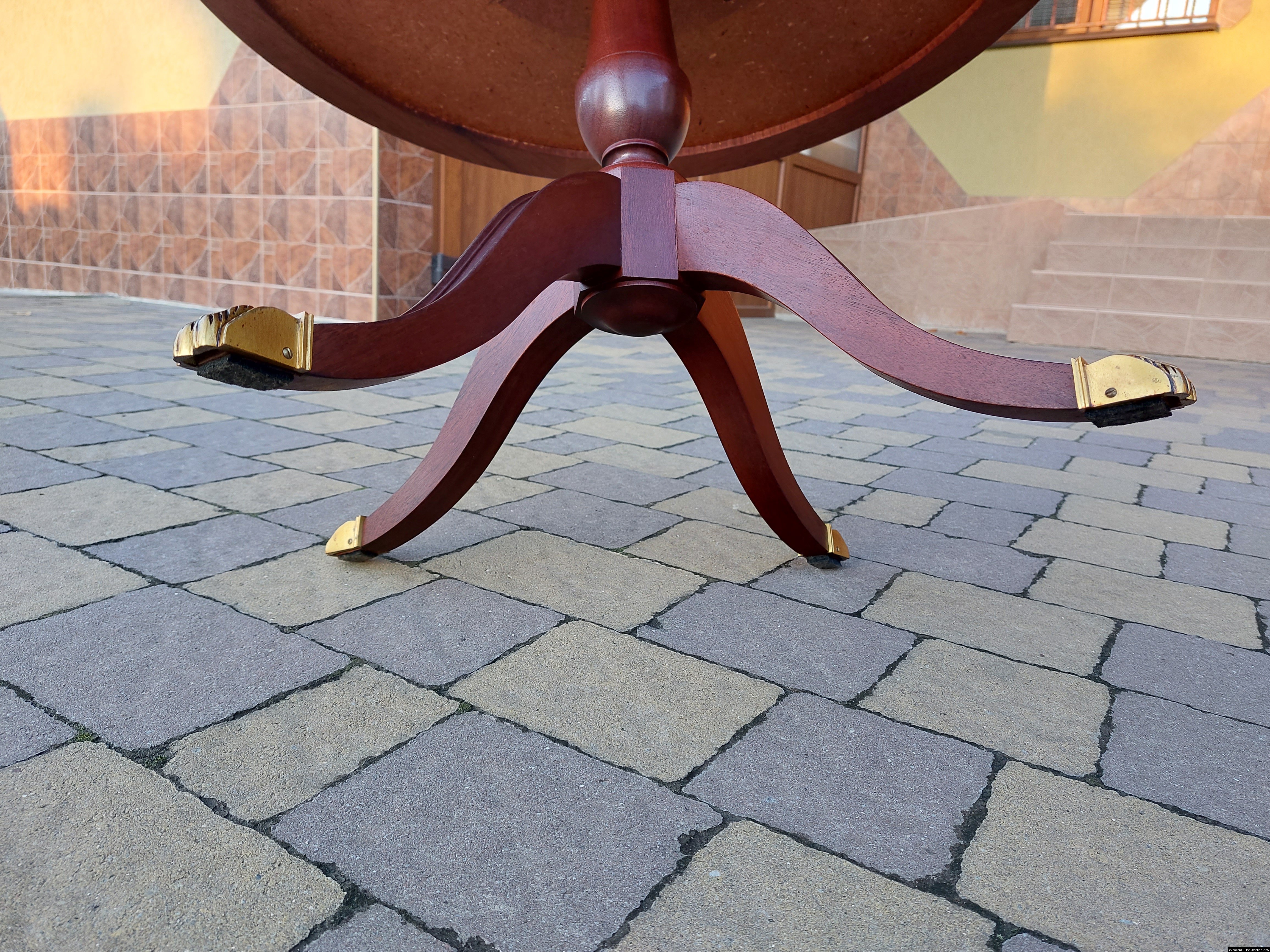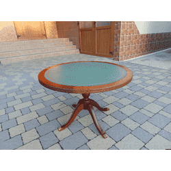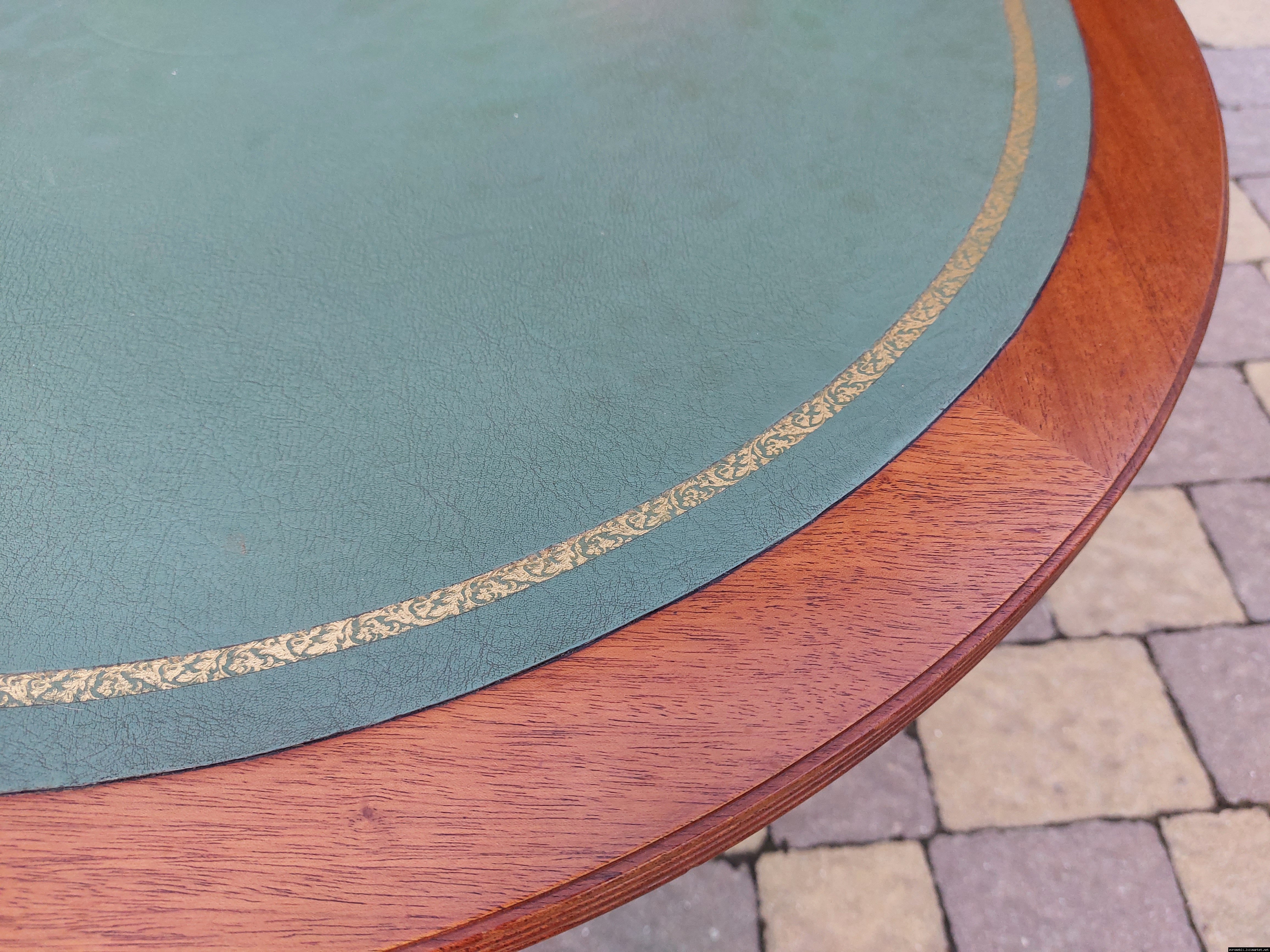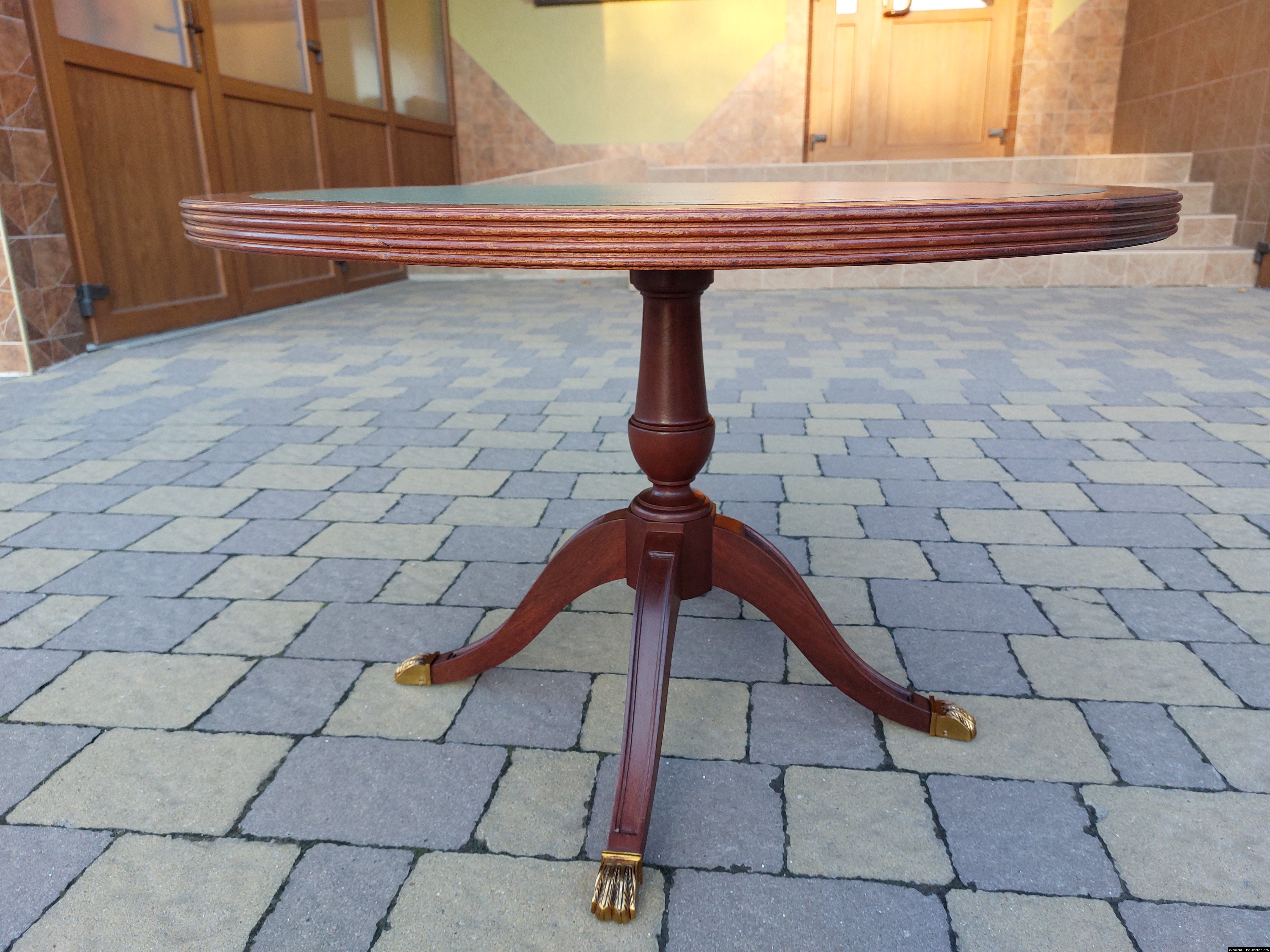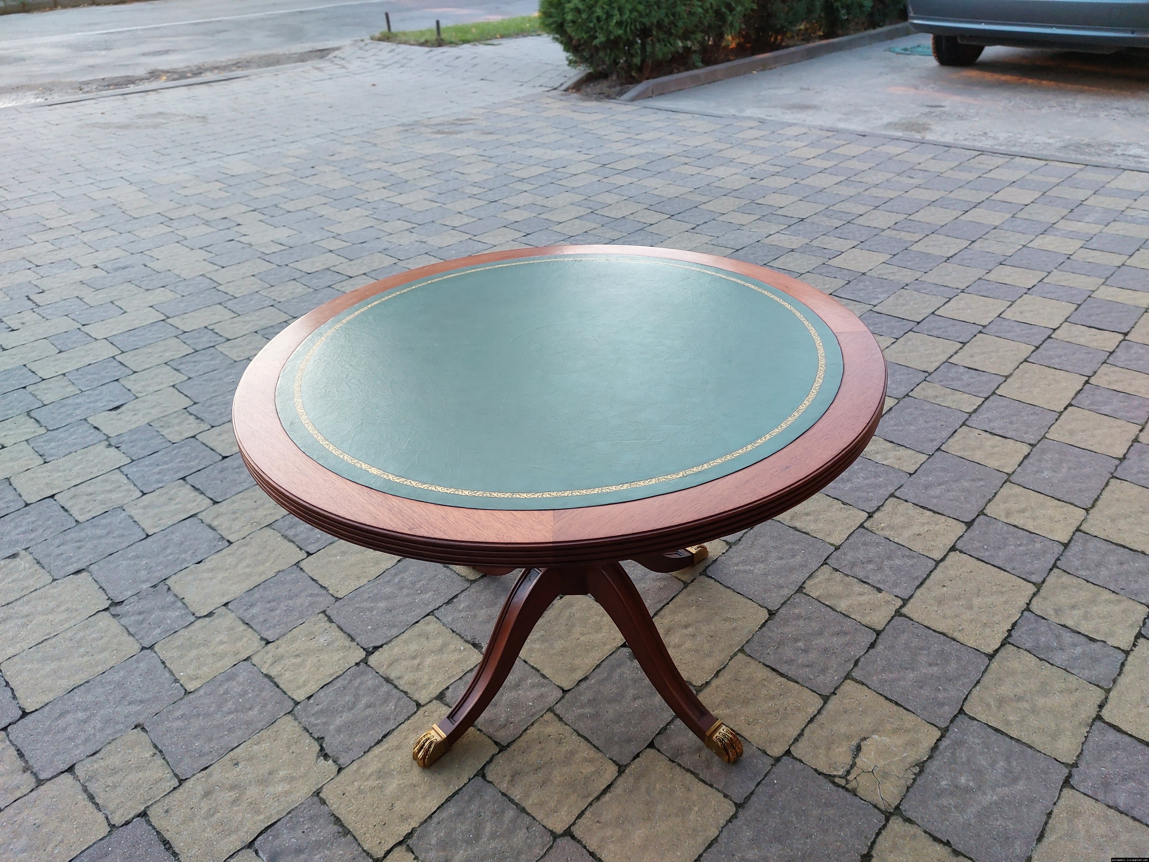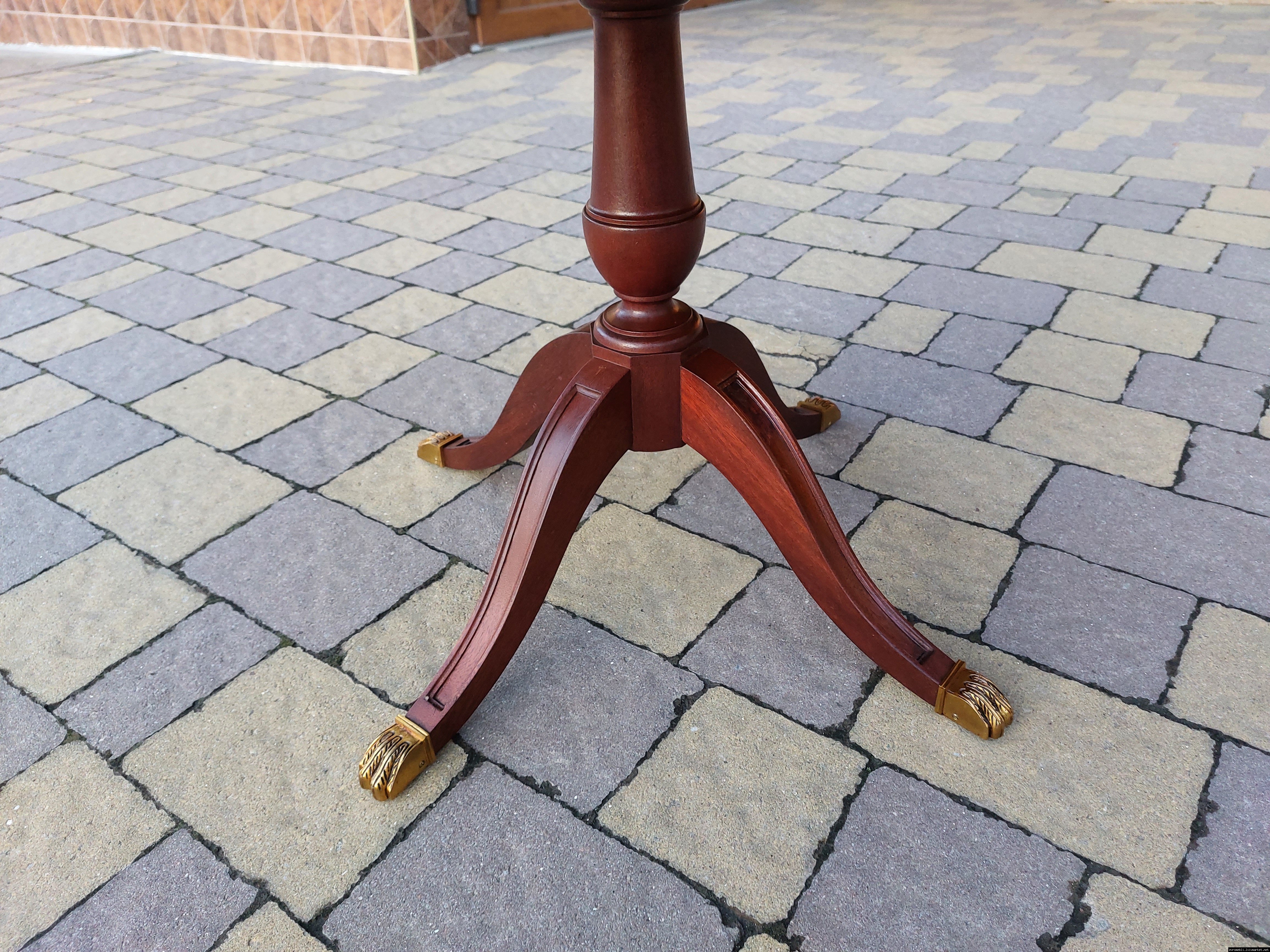 Красивий столик з дерева ручної роботи. Столик на трьох ніжках, виготовлений з натурального дерева, столешня круглої форми, обтягнута якісним замінником зеленого кольору. Ніжки столу декоровані латунним литтям у вигляді лап. Стіл в хорошому стані, компактний та зручний в користуванні, привезений з Бельгії.