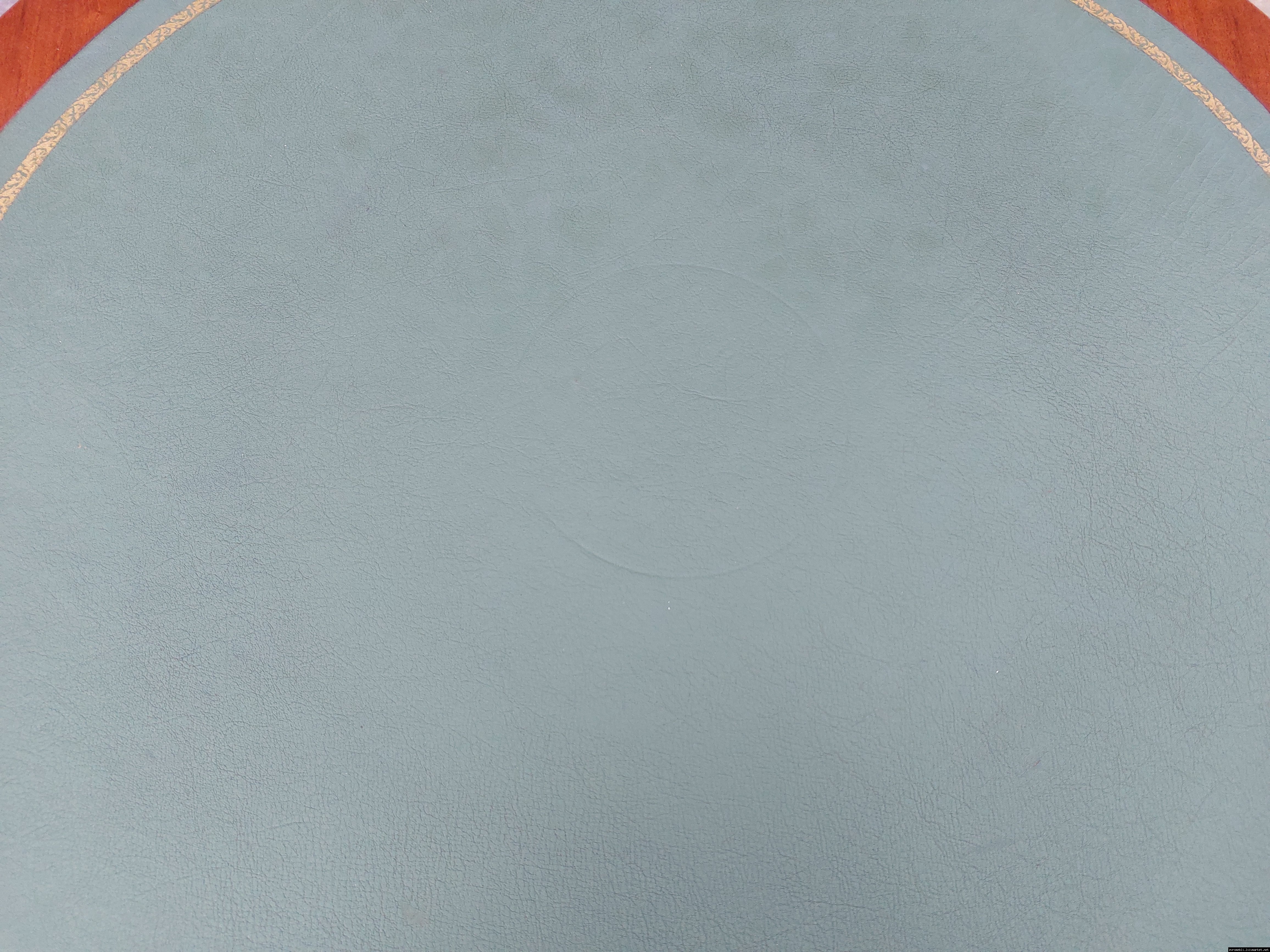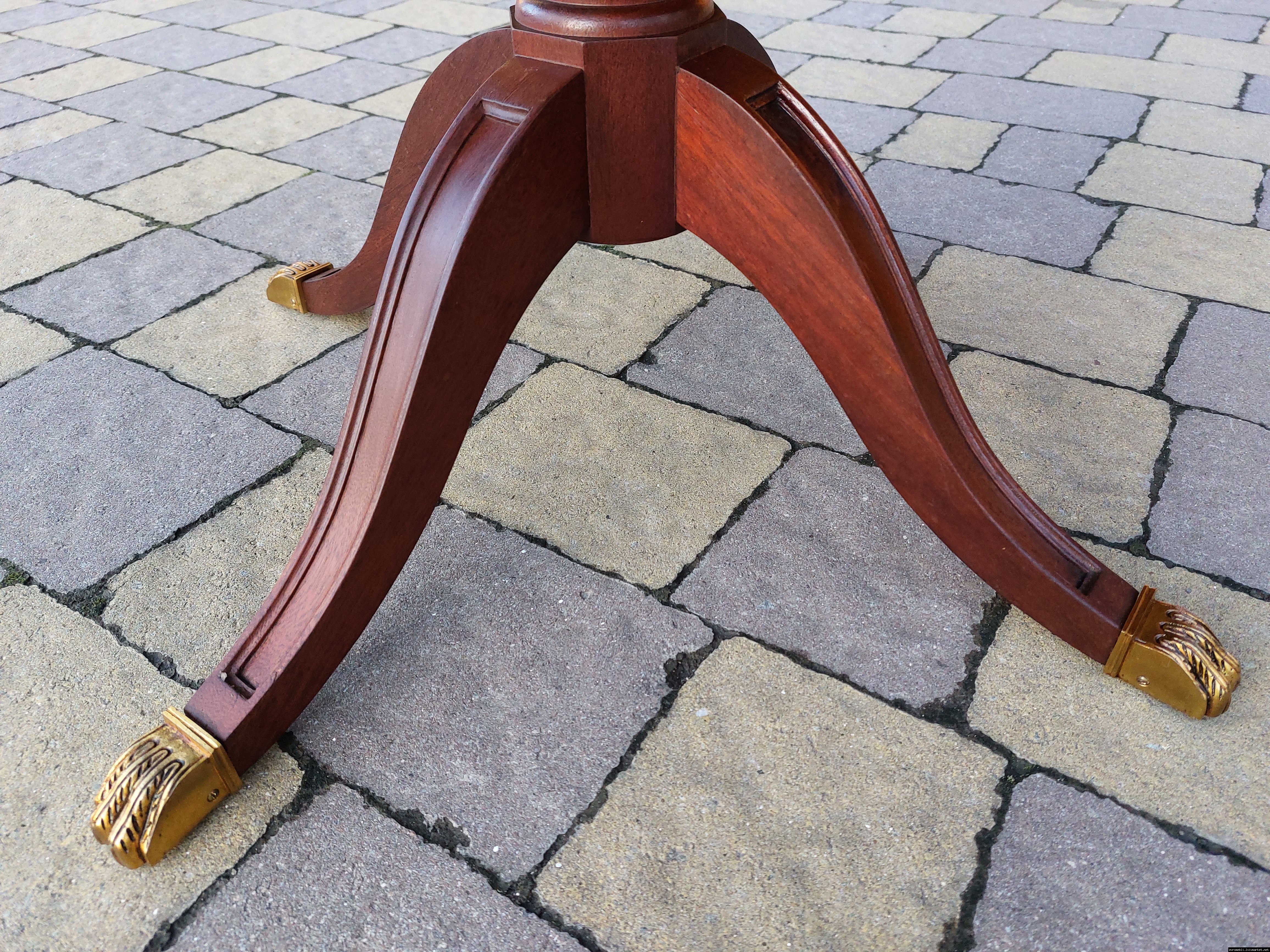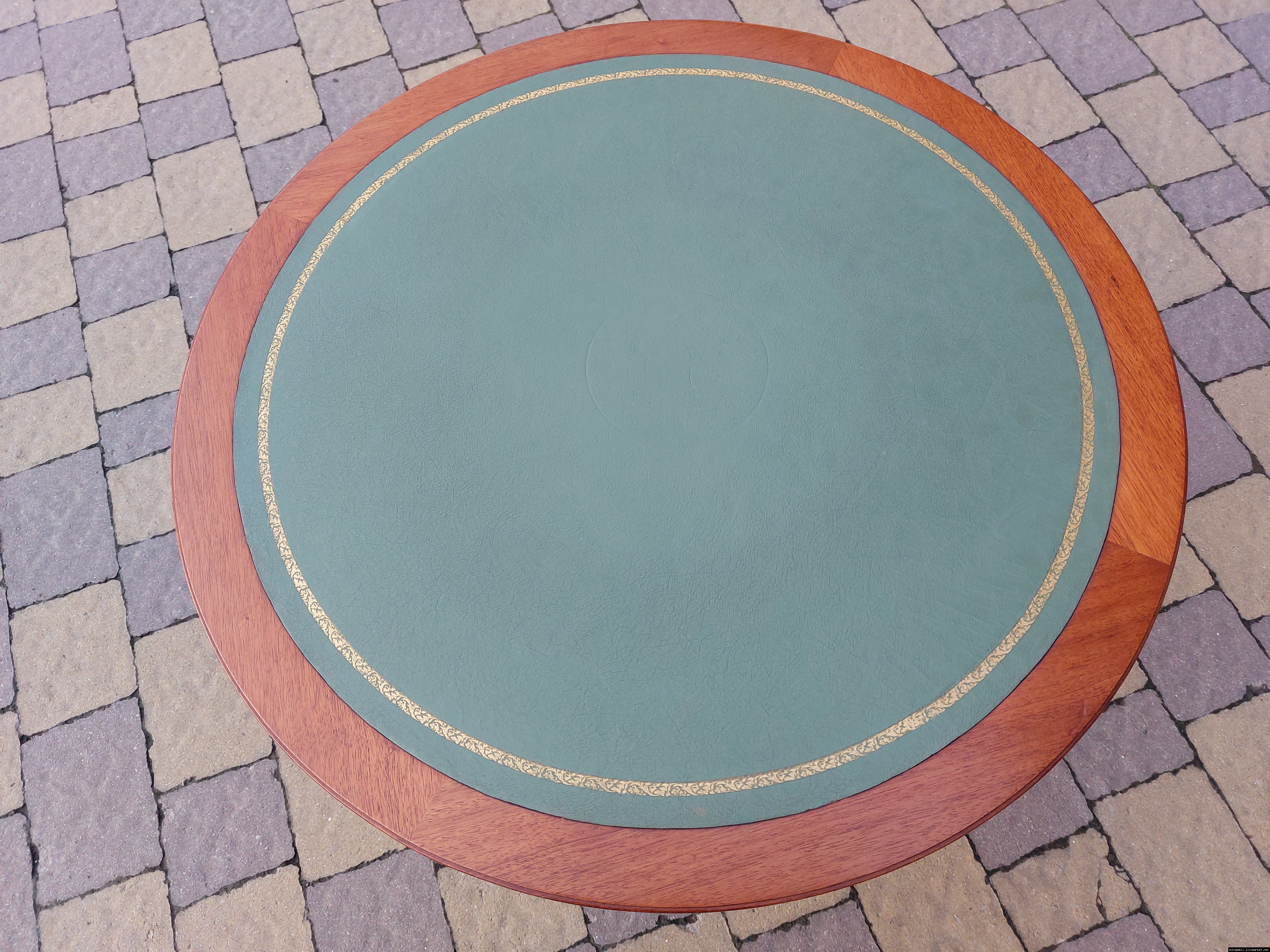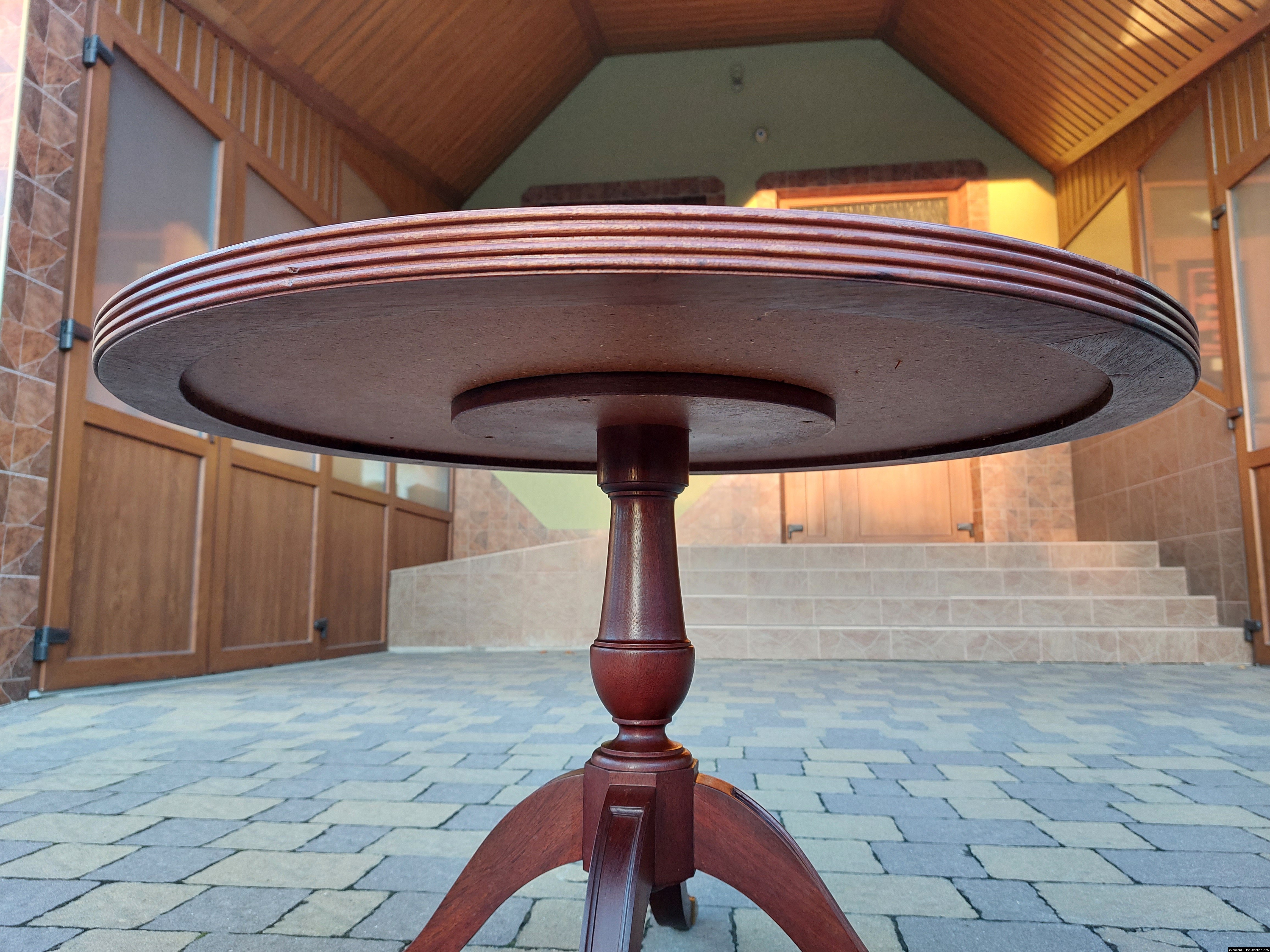 Красивий столик з дерева ручної роботи. Столик на трьох ніжках, виготовлений з натурального дерева, столешня круглої форми, обтягнута якісним замінником зеленого кольору. Ніжки столу декоровані латунним литтям у вигляді лап. Стіл в хорошому стані, компактний та зручний в користуванні, привезений з Бельгії.