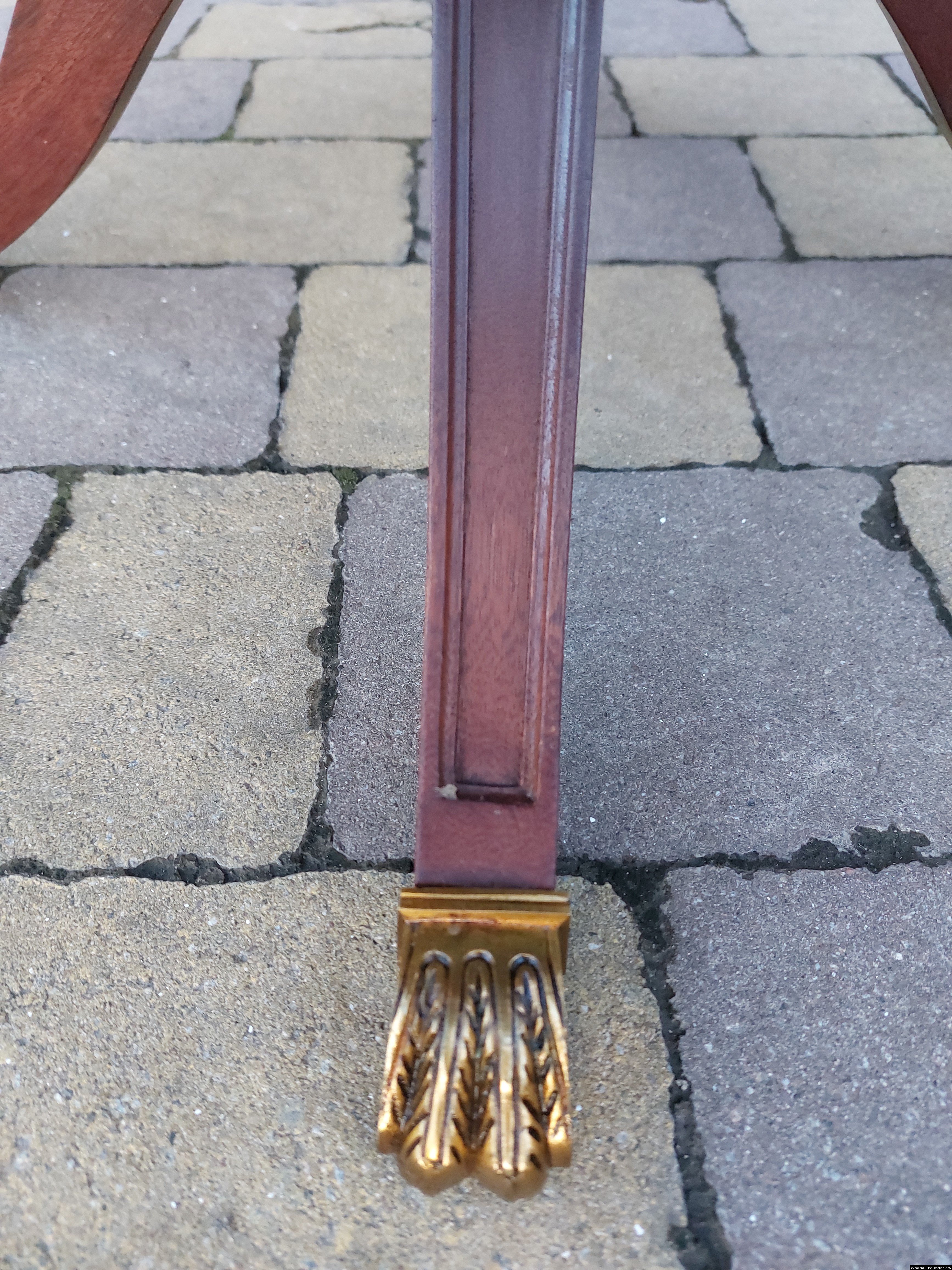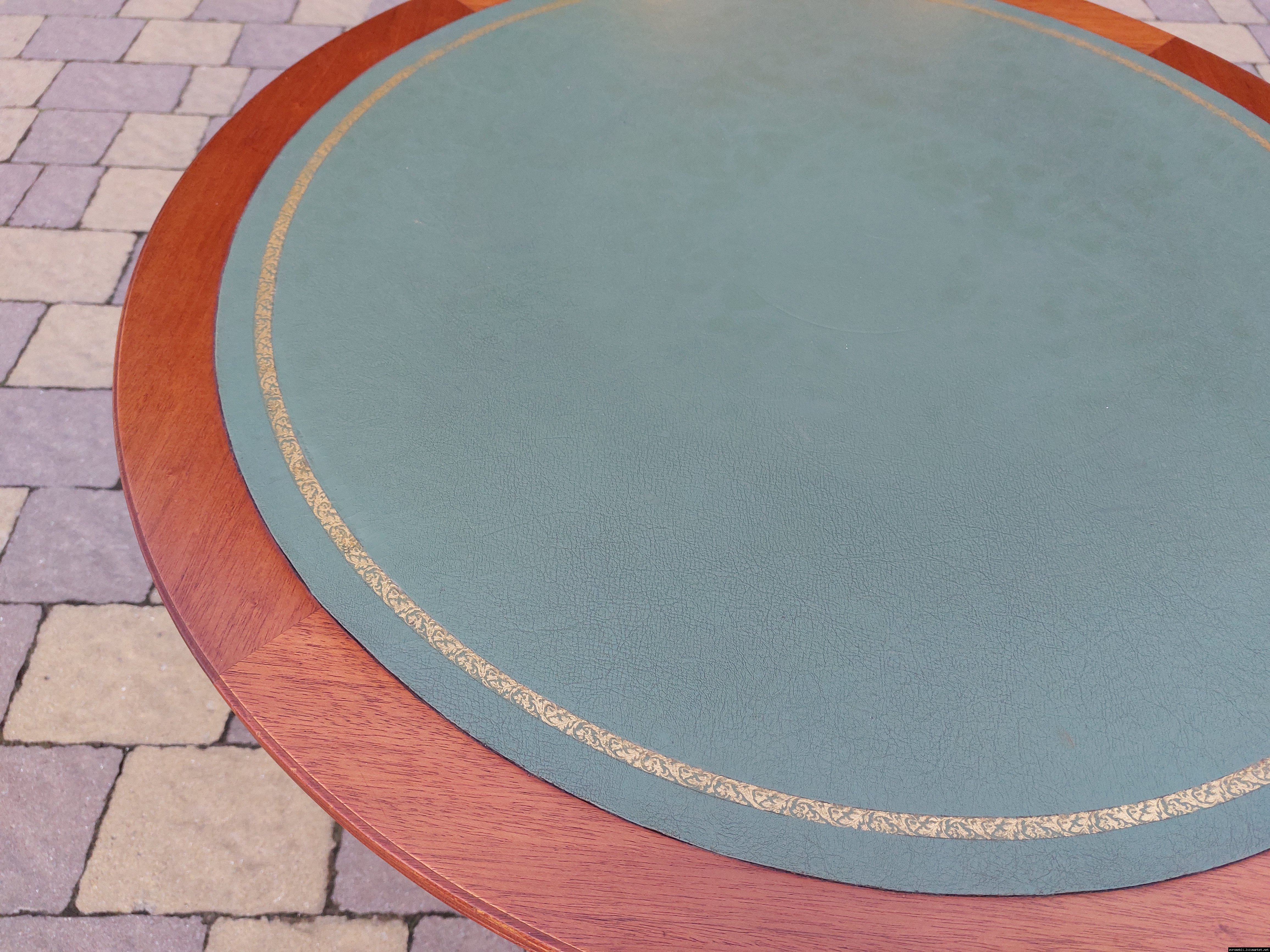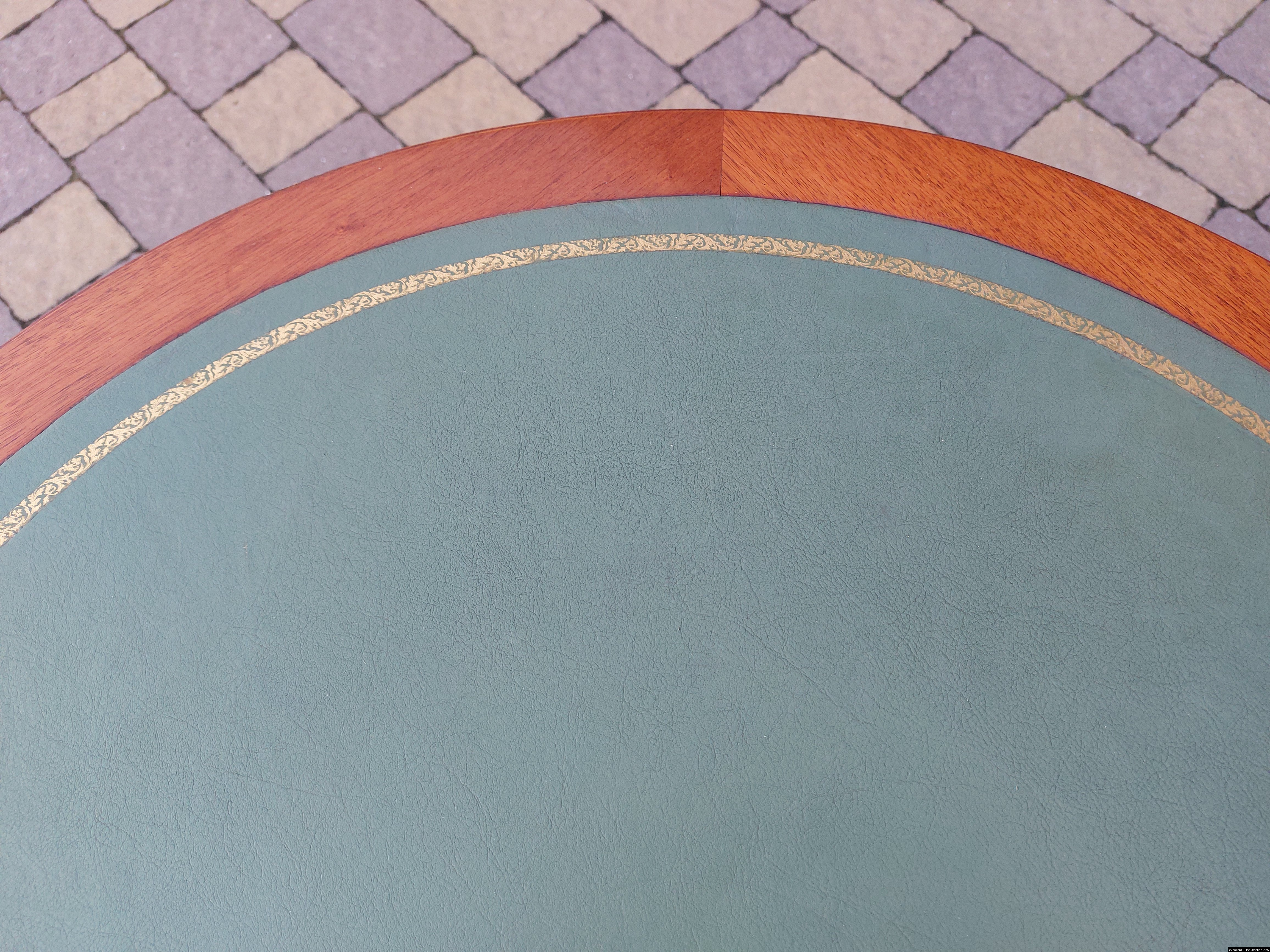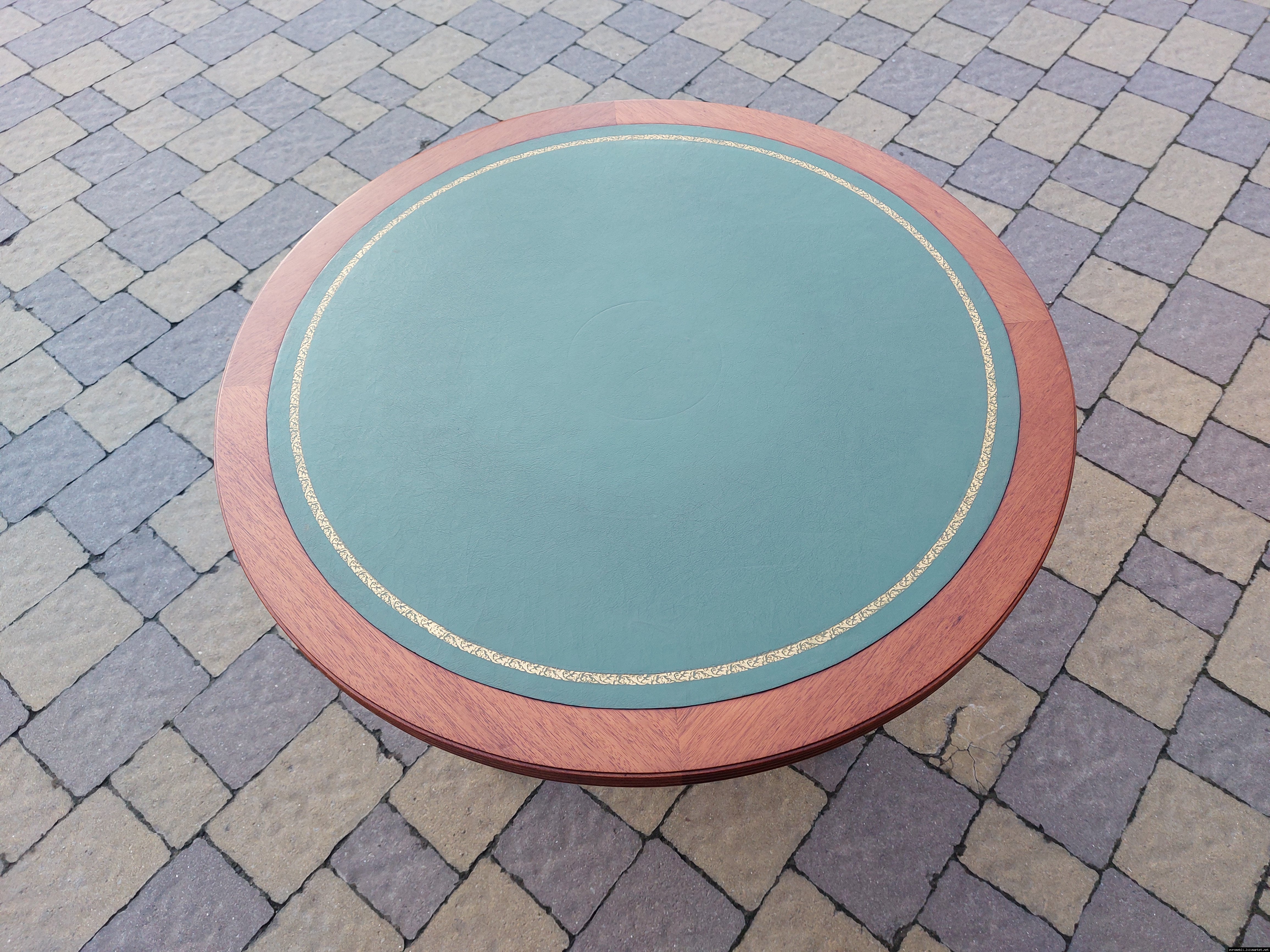 Красивий столик з дерева ручної роботи. Столик на трьох ніжках, виготовлений з натурального дерева, столешня круглої форми, обтягнута якісним замінником зеленого кольору. Ніжки столу декоровані латунним литтям у вигляді лап. Стіл в хорошому стані, компактний та зручний в користуванні, привезений з Бельгії.