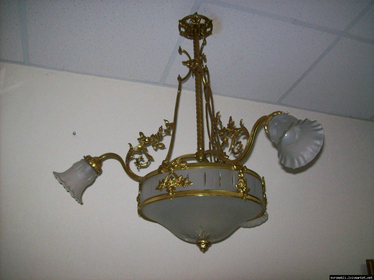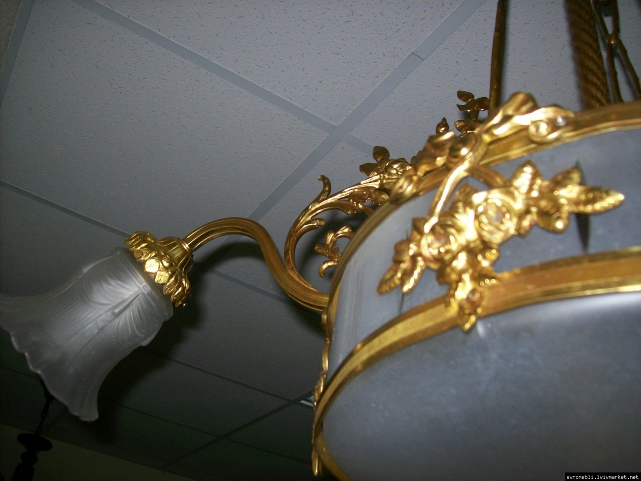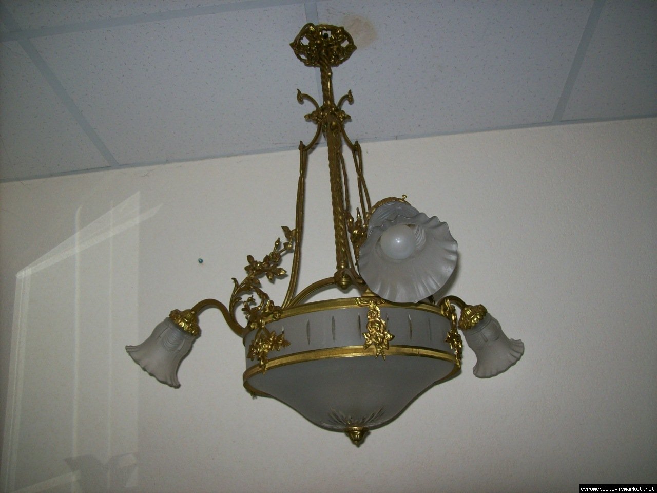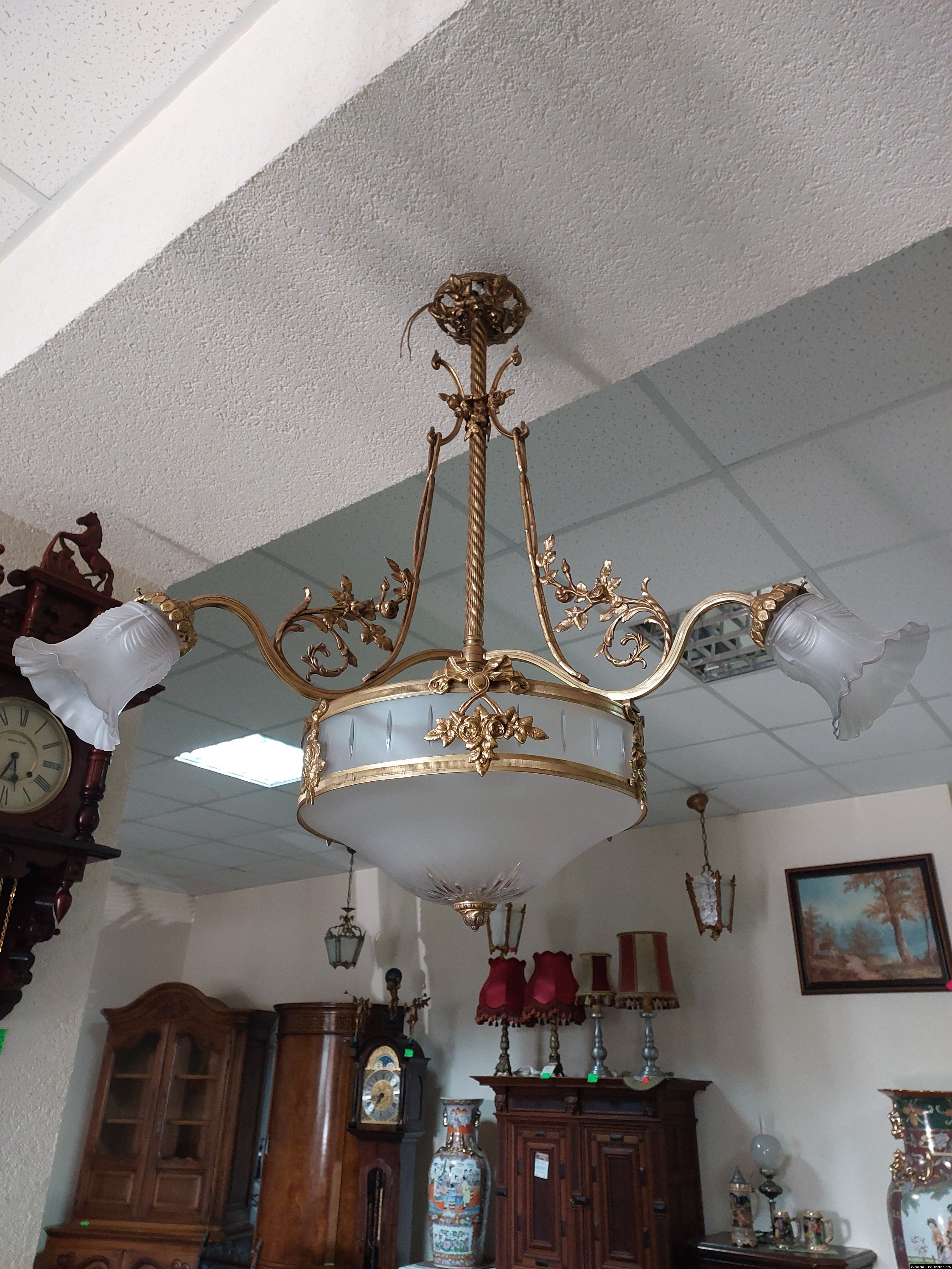 Велика підвісна люстра на чотири плафони (один великий плафон та три маленьких). Люстра виготовлена з латуні та декорована литтям у вигляді листочків і завитків, плафони виготовлені з матового скла. Люстра велика і масивна, в хорошому, справному стані, привезена з Бельгії.
