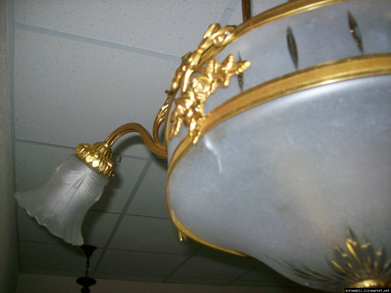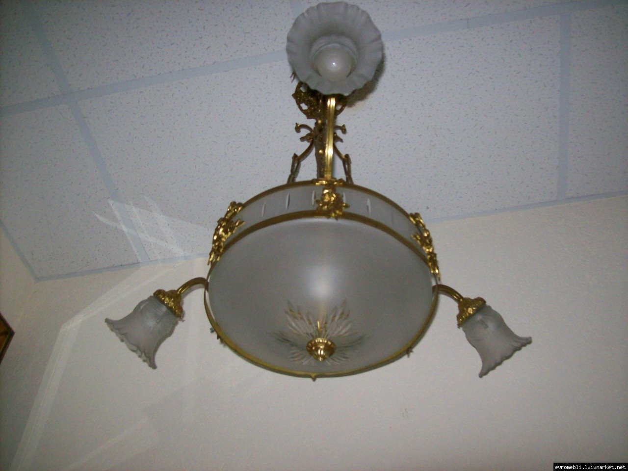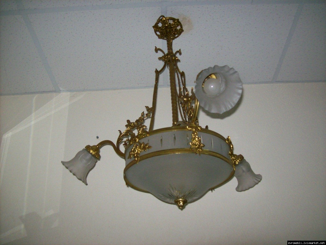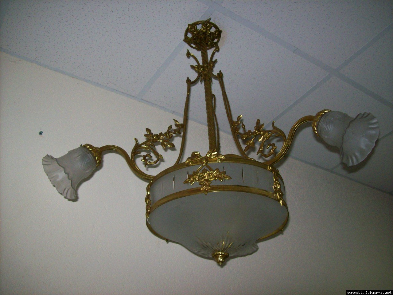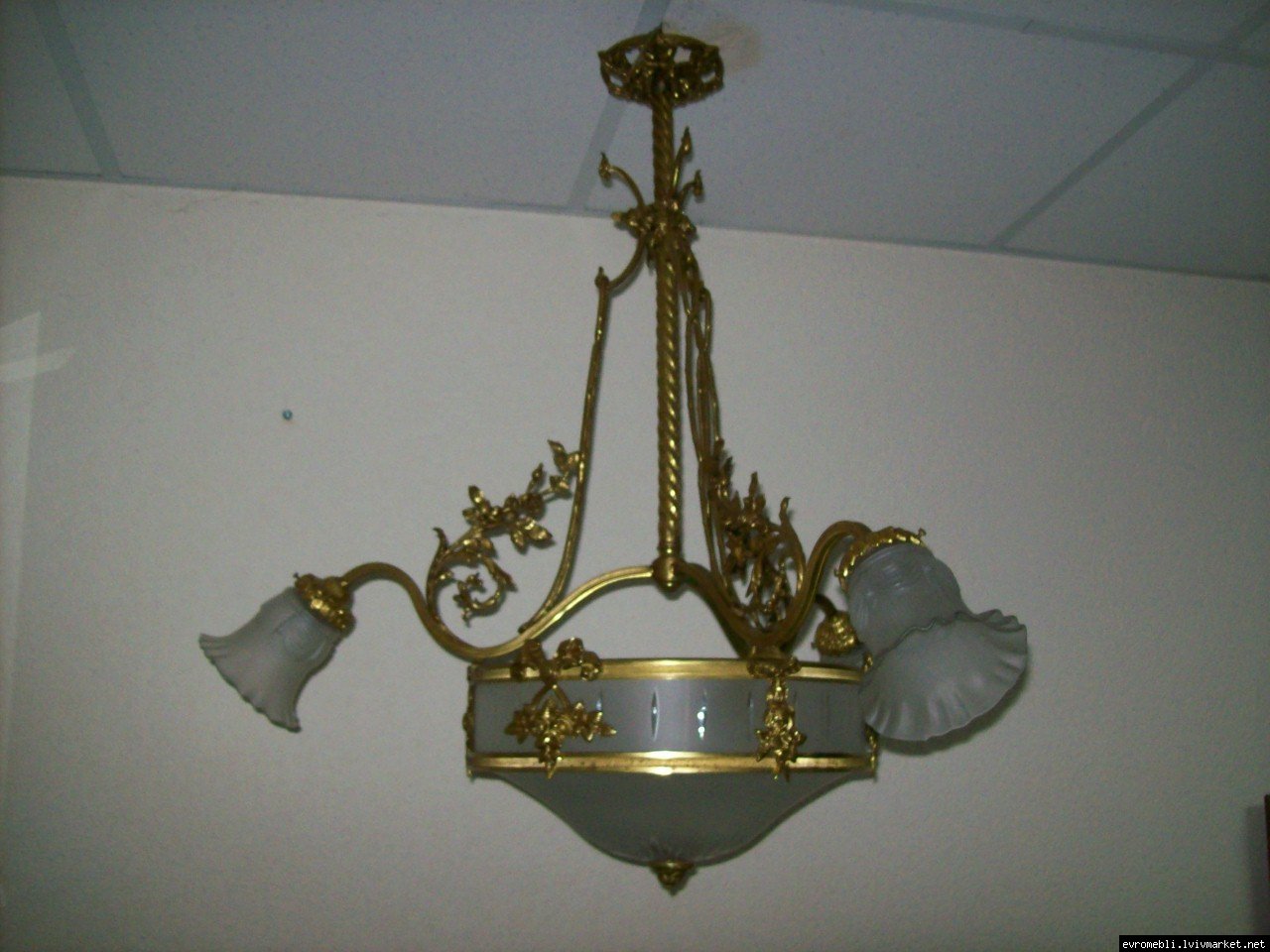 Велика підвісна люстра на чотири плафони (один великий плафон та три маленьких). Люстра виготовлена з латуні та декорована литтям у вигляді листочків і завитків, плафони виготовлені з матового скла. Люстра велика і масивна, в хорошому, справному стані, привезена з Бельгії.