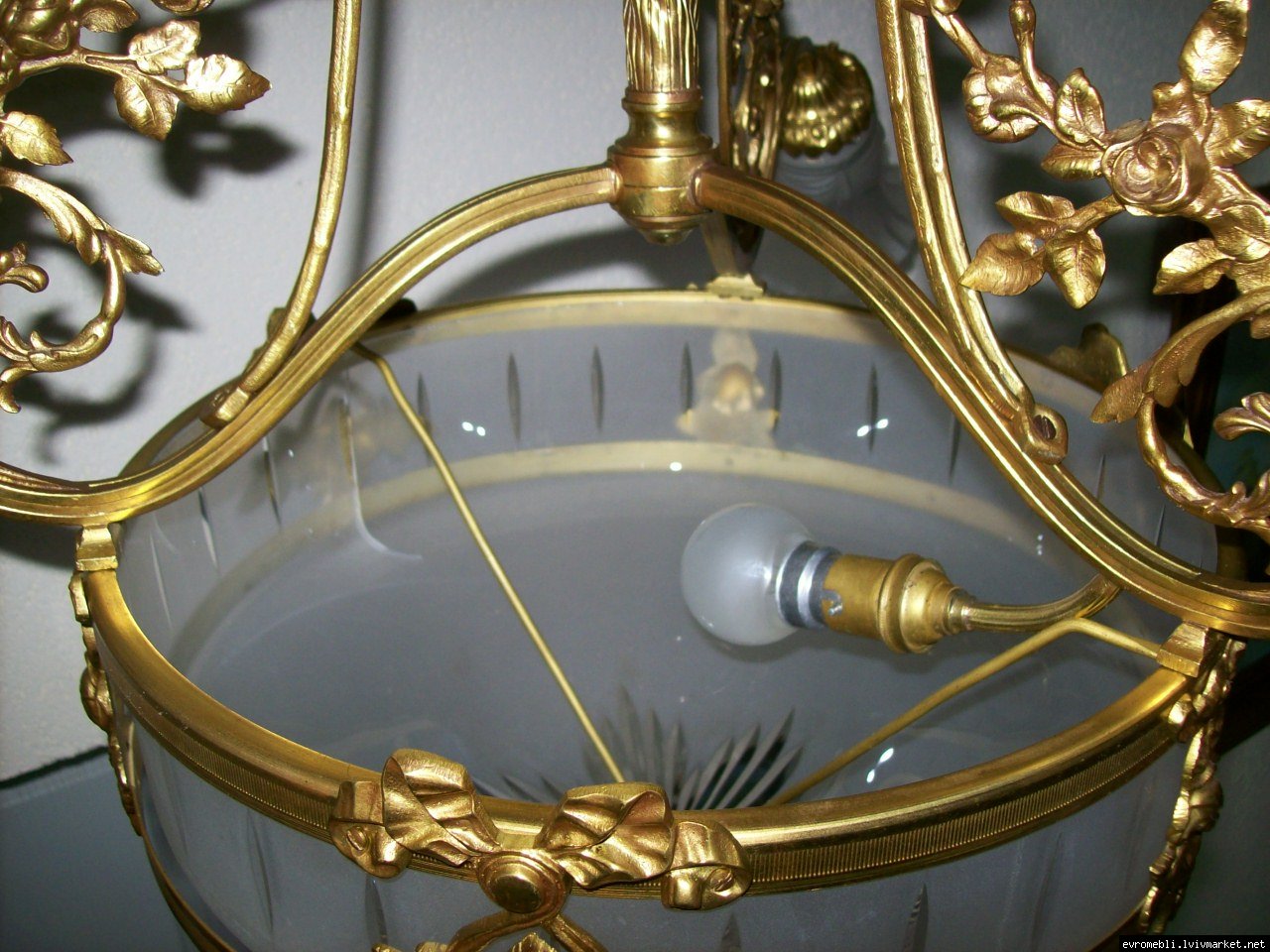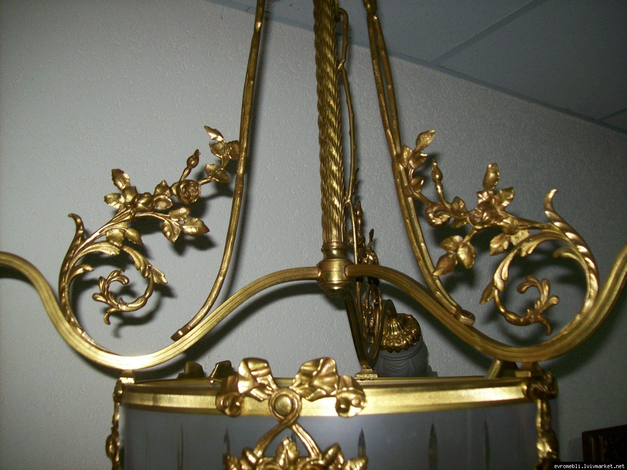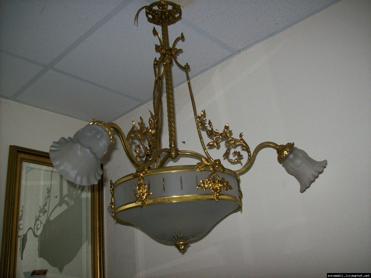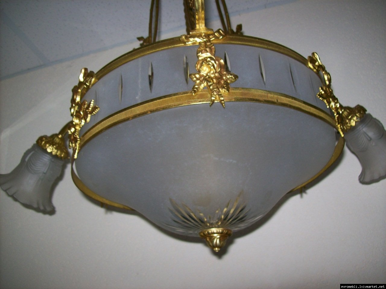 Велика підвісна люстра на чотири плафони (один великий плафон та три маленьких). Люстра виготовлена з латуні та декорована литтям у вигляді листочків і завитків, плафони виготовлені з матового скла. Люстра велика і масивна, в хорошому, справному стані, привезена з Бельгії.