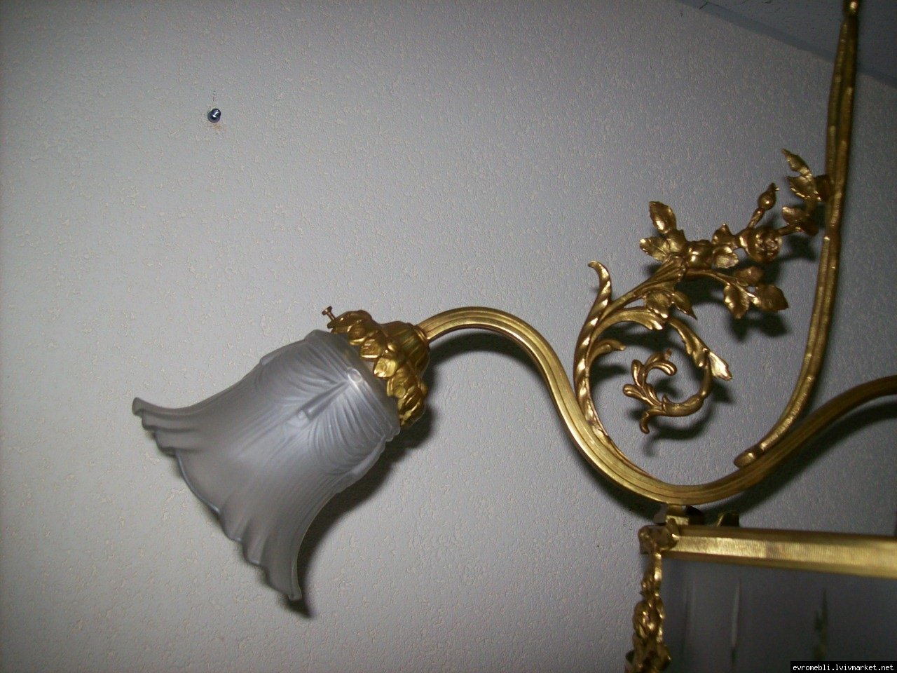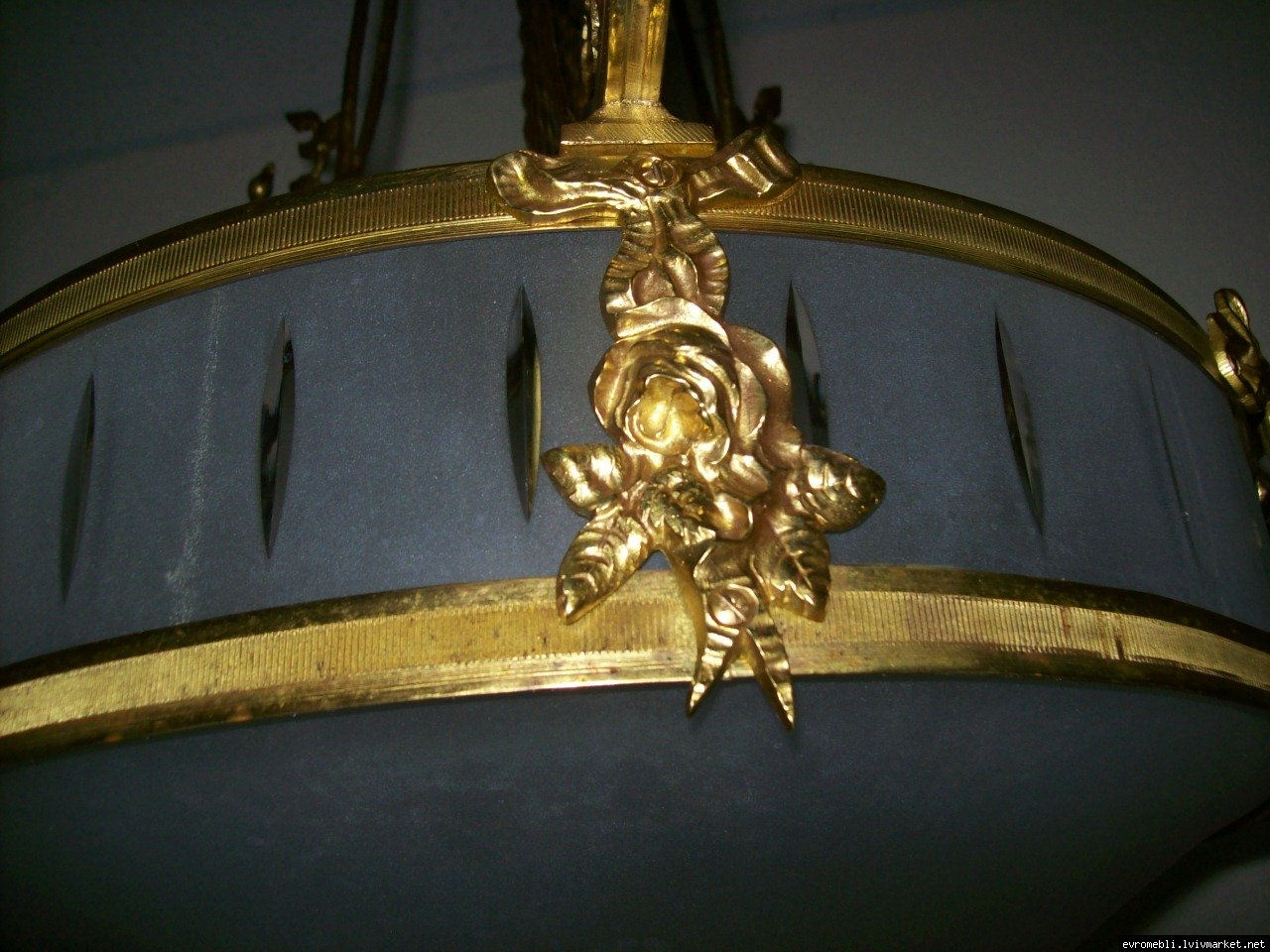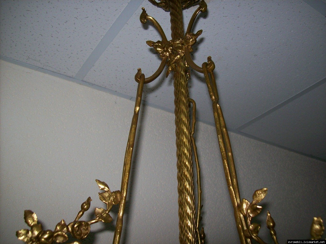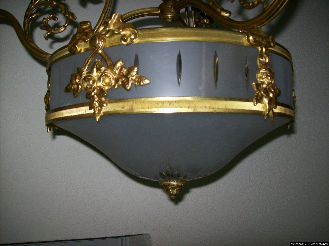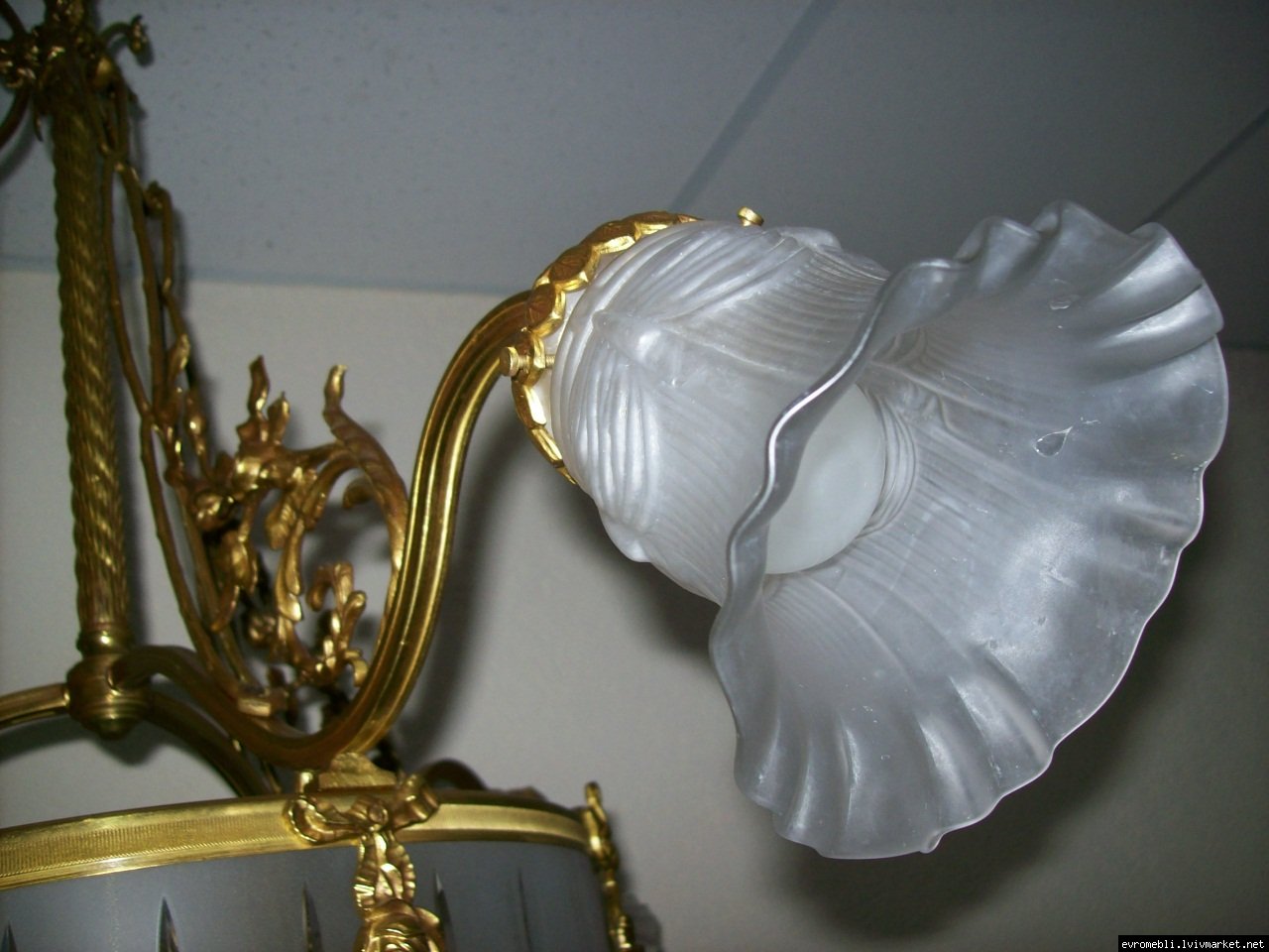 Велика підвісна люстра на чотири плафони (один великий плафон та три маленьких). Люстра виготовлена з латуні та декорована литтям у вигляді листочків і завитків, плафони виготовлені з матового скла. Люстра велика і масивна, в хорошому, справному стані, привезена з Бельгії.