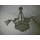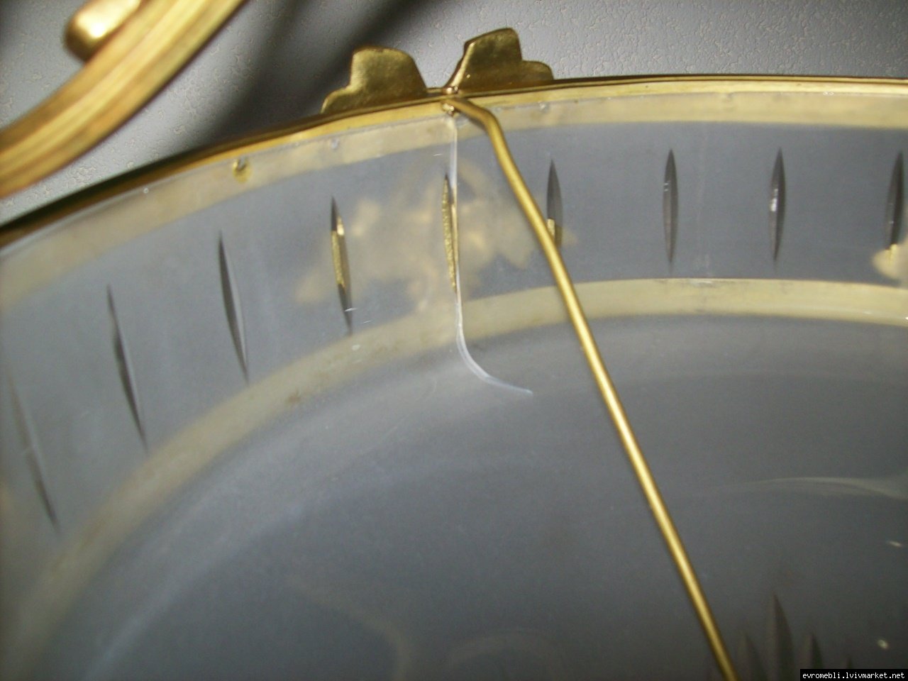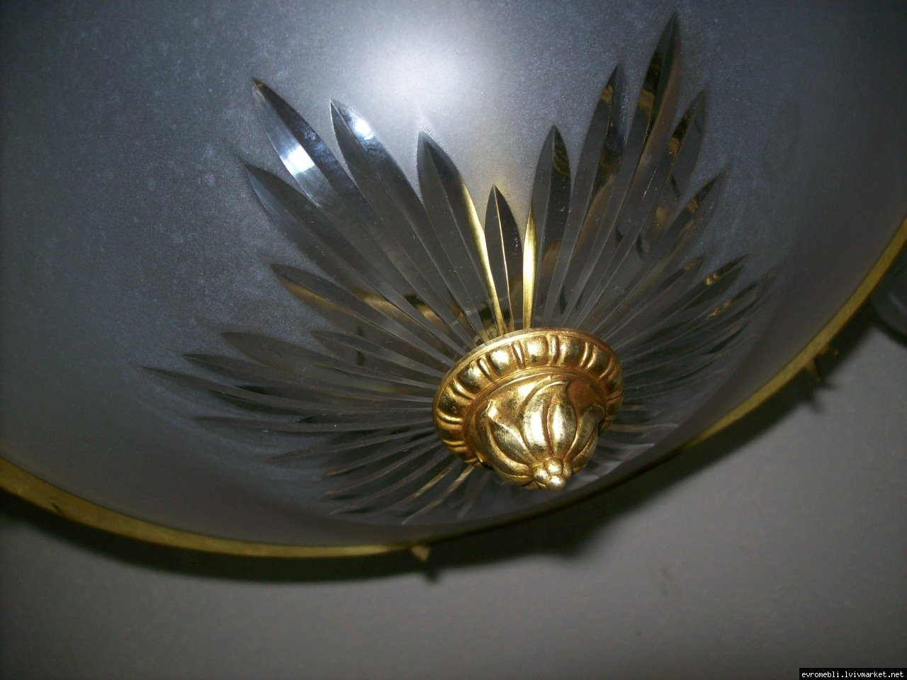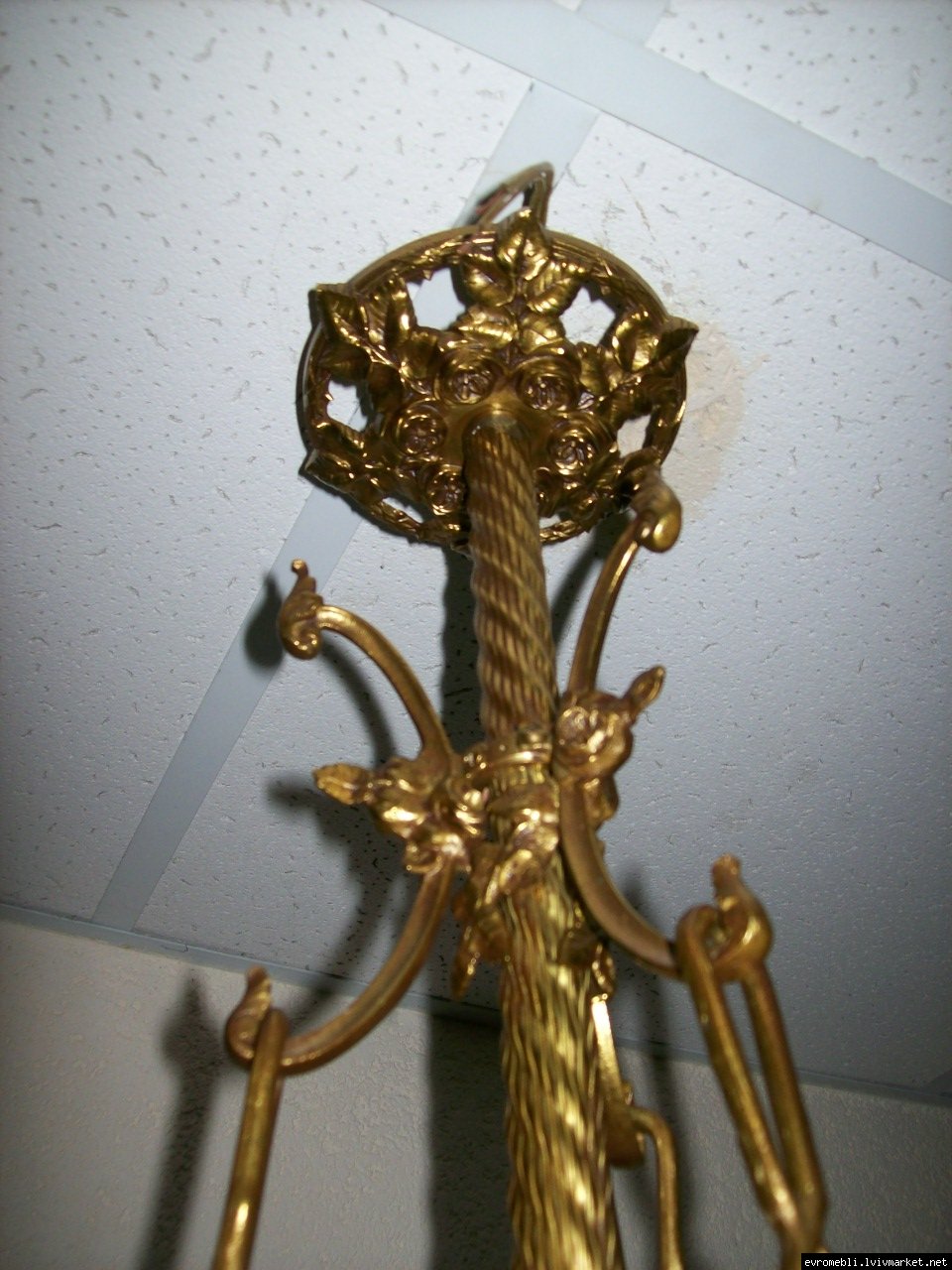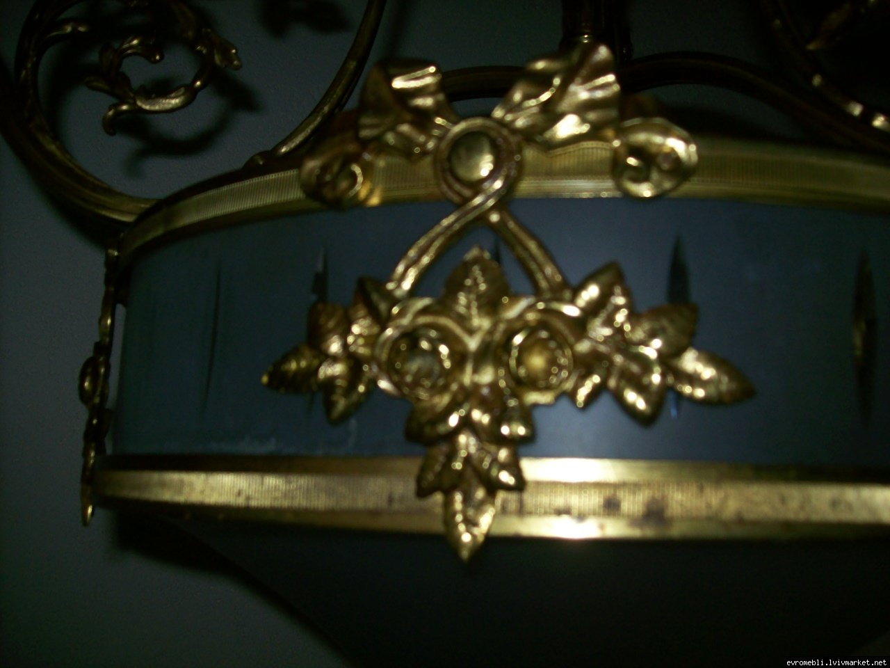 Велика підвісна люстра на чотири плафони (один великий плафон та три маленьких). Люстра виготовлена з латуні та декорована литтям у вигляді листочків і завитків, плафони виготовлені з матового скла. Люстра велика і масивна, в хорошому, справному стані, привезена з Бельгії.