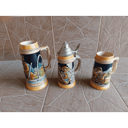 Набір вінтажних, керамічних пивних кухлів, ручна робота, в наборі три штуки. Західна Німеччина. Кухлі декоровані ручним розписом, один має оловяну кришку. Чудовий чоловічий подарунок і відмінний предмет в колекцію. Прекрасне доповнення до інтерєру заміського будиночка, мисливського будинку, а також можливо свого ресторану. Стан кухлів нормальний, не протікають, повністю функціональні, вмятин не виявлено, є тавро DBGM.
