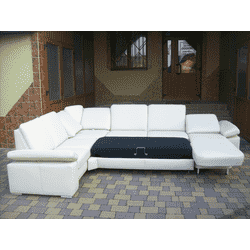Новий шкіряний, розкладний П- подібний диван. POLINOVA. Німеччина. Диван з нішею для білизни, з релаксуючими кутовими подушками та підлокотником (підіймається, опускається), з висувним механізмом на електроприводі (права бокова частина дивану- алігатор з функцією електрорелаксу). Диван розкладний, модерновий, на металевих ніжках, обтягнутий шкірою світло- бежевого кольору, зручний і комфортний для сну та відпочинку, країна виробник- Німеччина.