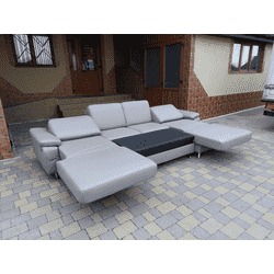 Новий шкіряний, розкладний П- подібний диван. Німеччина. Диван з висувним механізмом на електроприводі (ліва та права бокова частина дивану- алігатор з функцією електрорелаксу). Диван розкладний, модерновий, на металевих ніжках, обтягнутий шкірою сірого кольору, зручний і комфортний для сну та відпочинку, країна виробник- Німеччина.