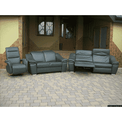 Новий шкіряний комплект мяких меблів з функцією релаксу. До комплекту входить два дивани, трьохмісний з функцією електрорелаксу, двомісний, нерозкладний та відпочинкове крісло- реклайнер. Комплект обтягнутий шкірою сірого кольору, дві з трьох частин більшого дивану мають функцію релаксу (дві бокові частини дивана), обидва дивани також мають релаксуючі підголовники ( підіймаються/ опускаються). Крісло на металевій хромованій ніжці, з високою спинкою та поворотним механізмом. Комплект повністю шкіряний, мякий, зручний та комфортний, країна виробник- Німеччина.