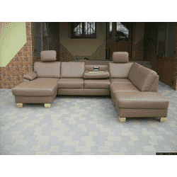 Новий шкіряний П-подібний диван з баром, релексуючими підголовниками (підіймаються, опускаються, нахиляються), з шухлядою і нішою для білизни та висувним механізмом на електроприводі (права бокова частина дивану- алігатор з функцією елетрорелаксу). Диван розкладний, модерновий, на деревяних ніжках, повністю обтягнутий шкірою кольору капучіно, зручний і комфортний для сну та відпочинку, країна виробник- Німеччина.