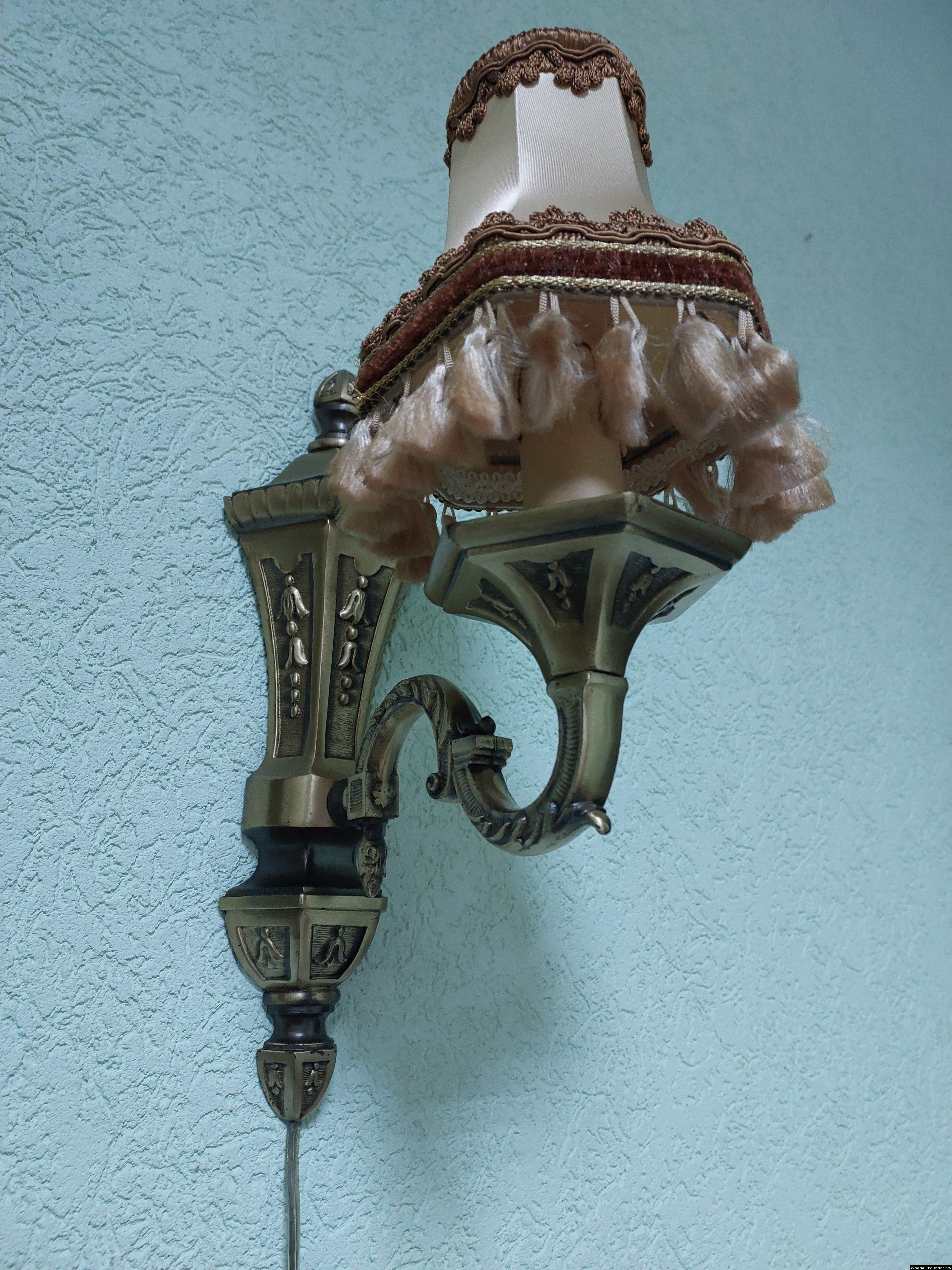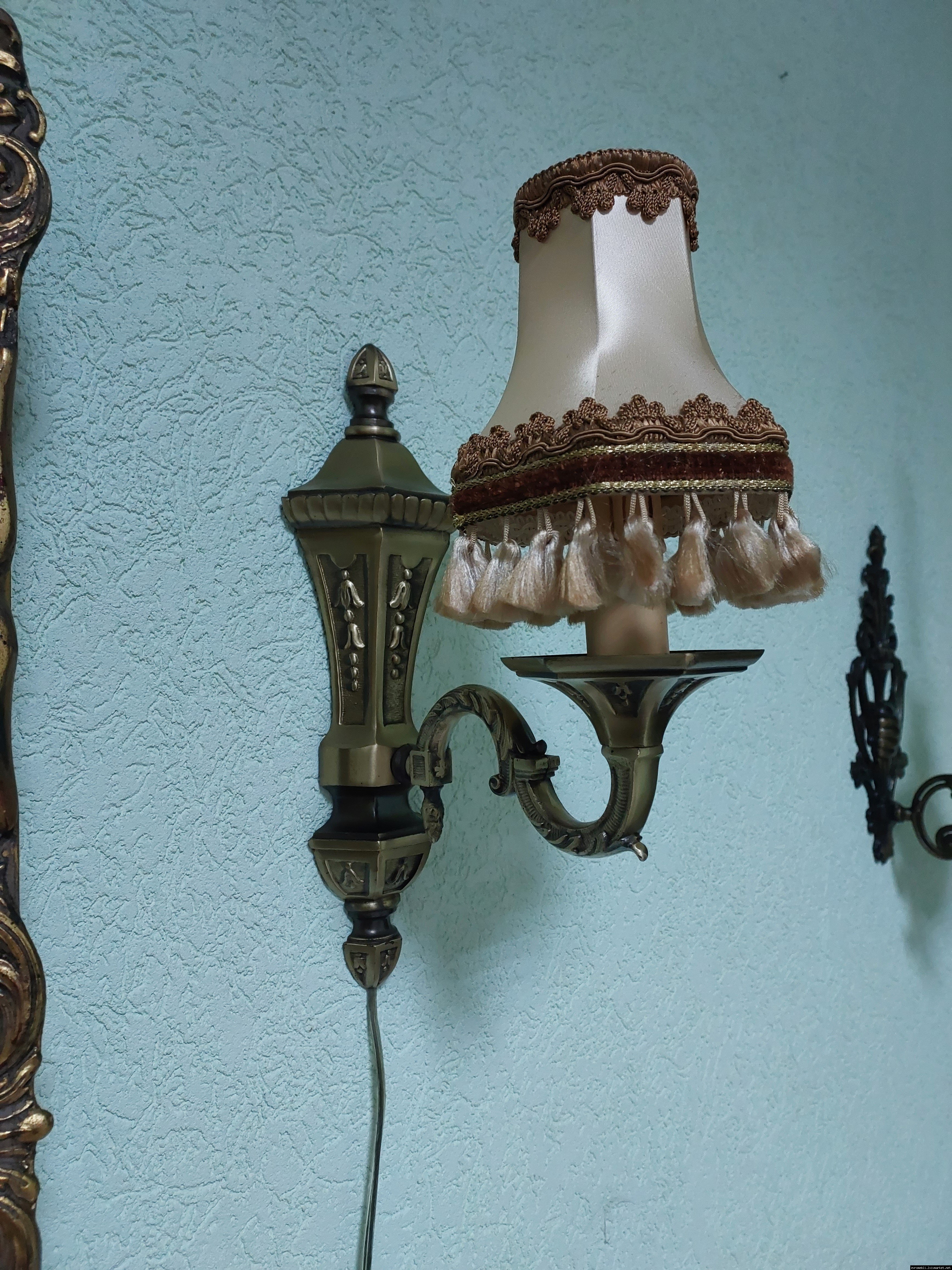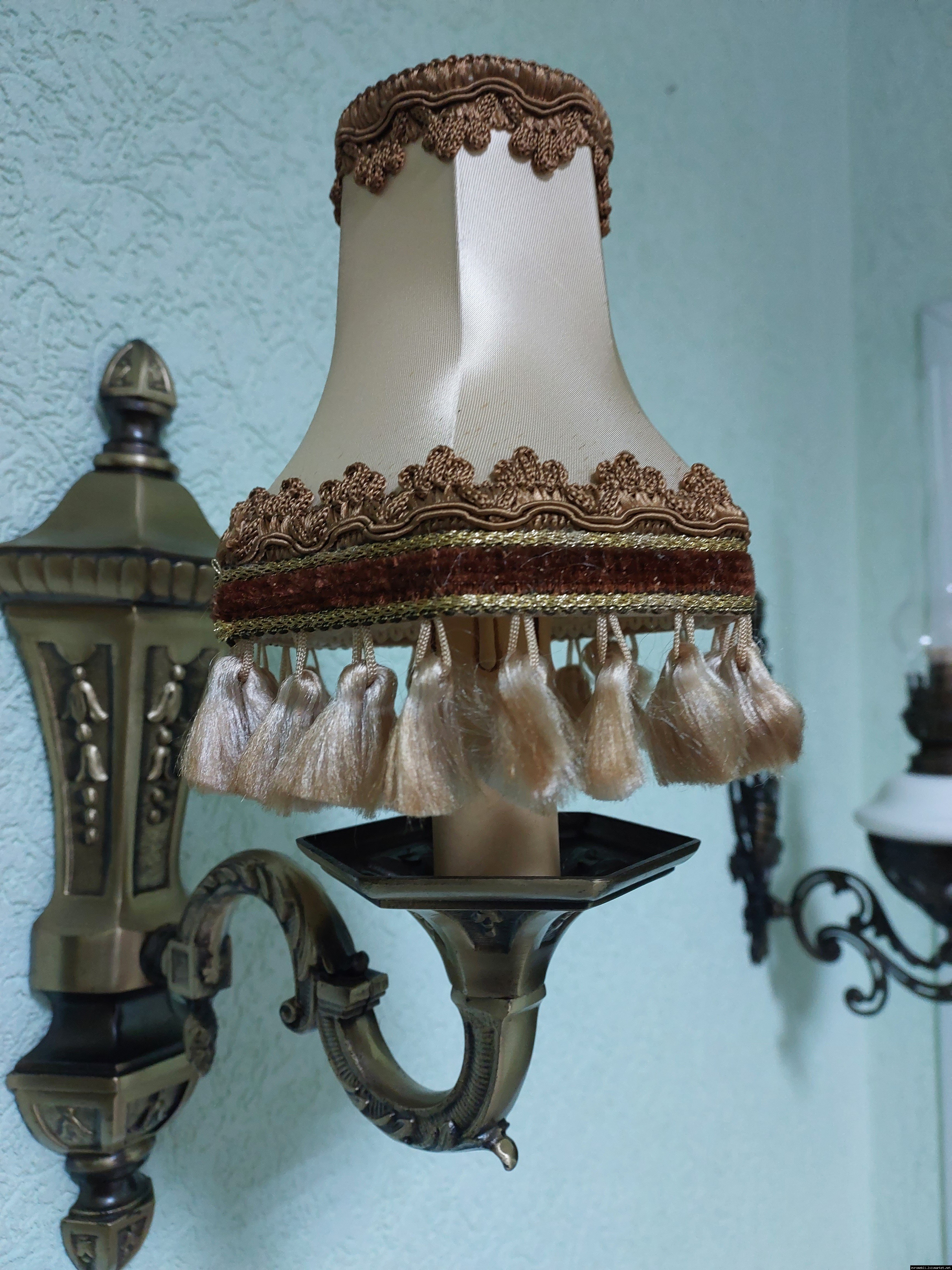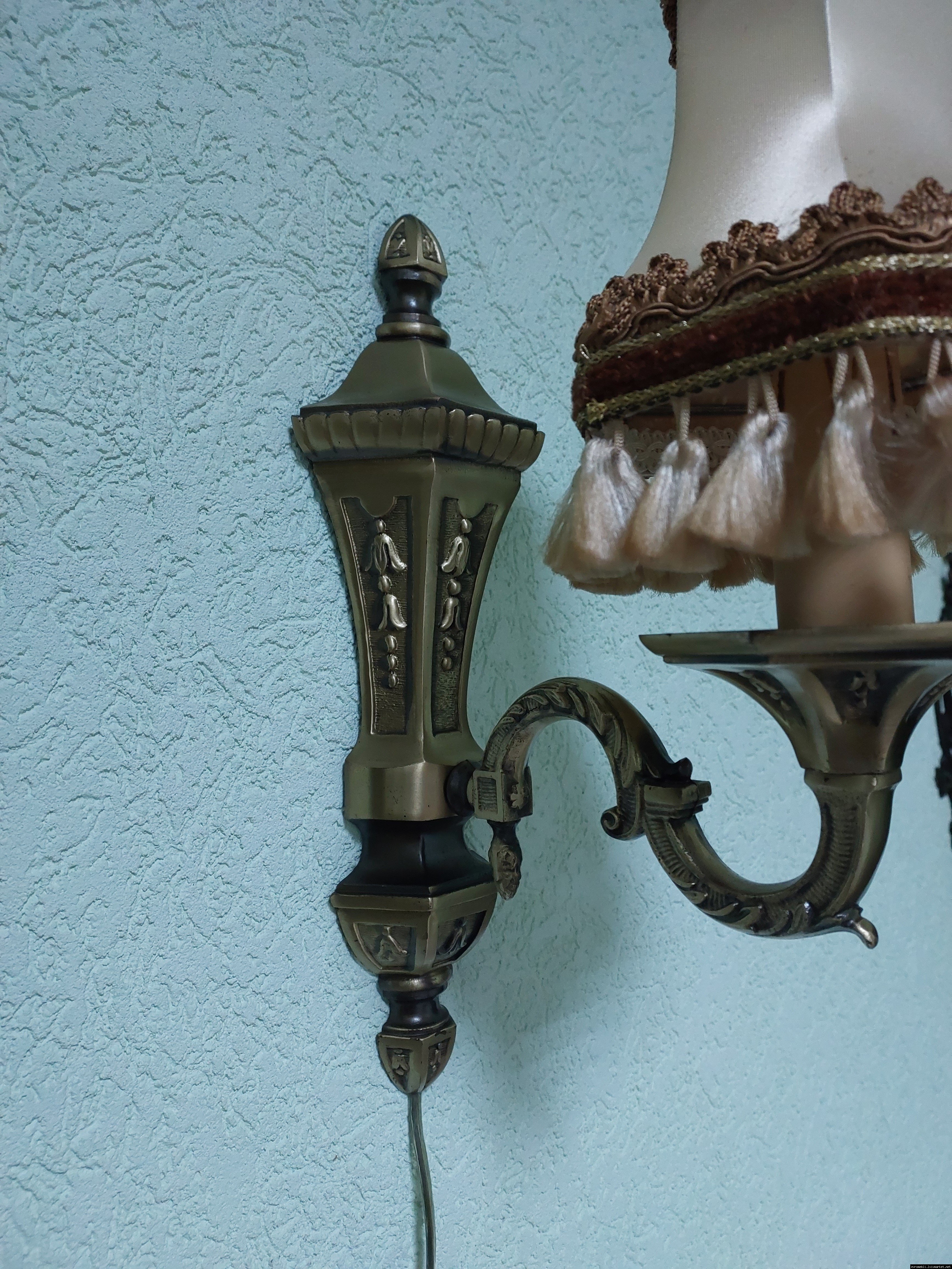 Старовинний, настінний світильник (бра) з тканинним абажуром, декорований бахромою та китицями, латунна основа. Бра в хорошому, робочому стані, привезено з Бельгії.