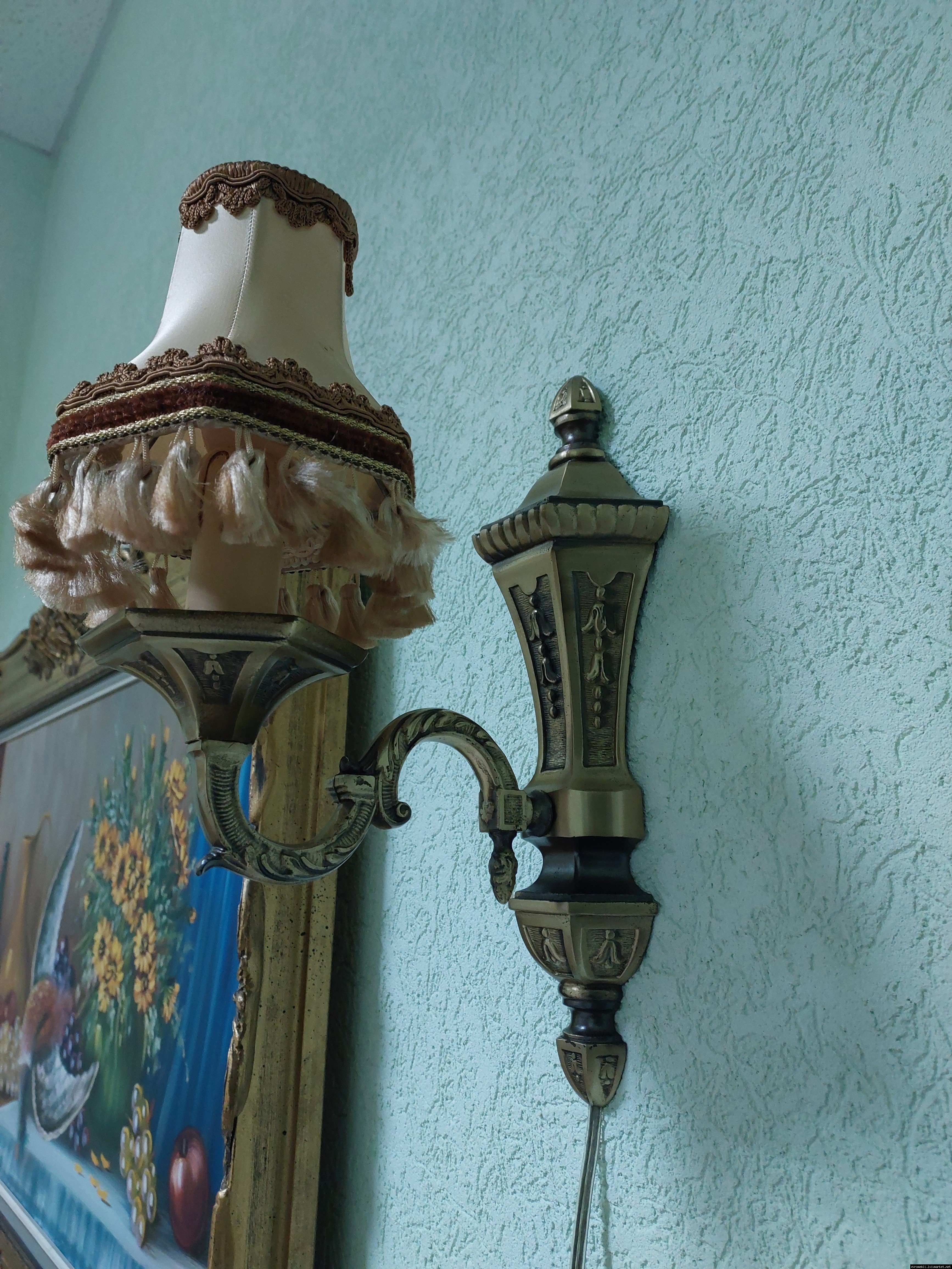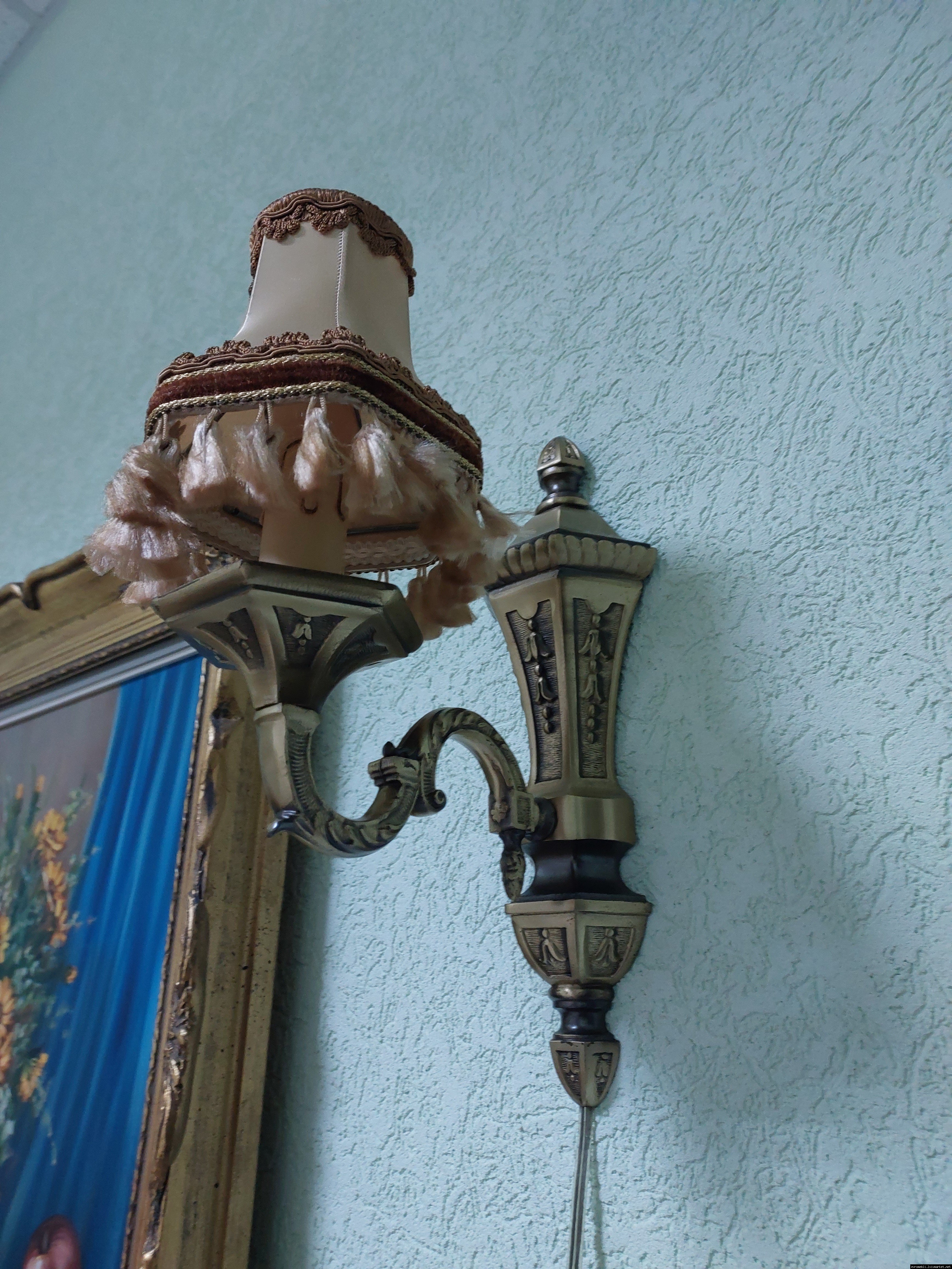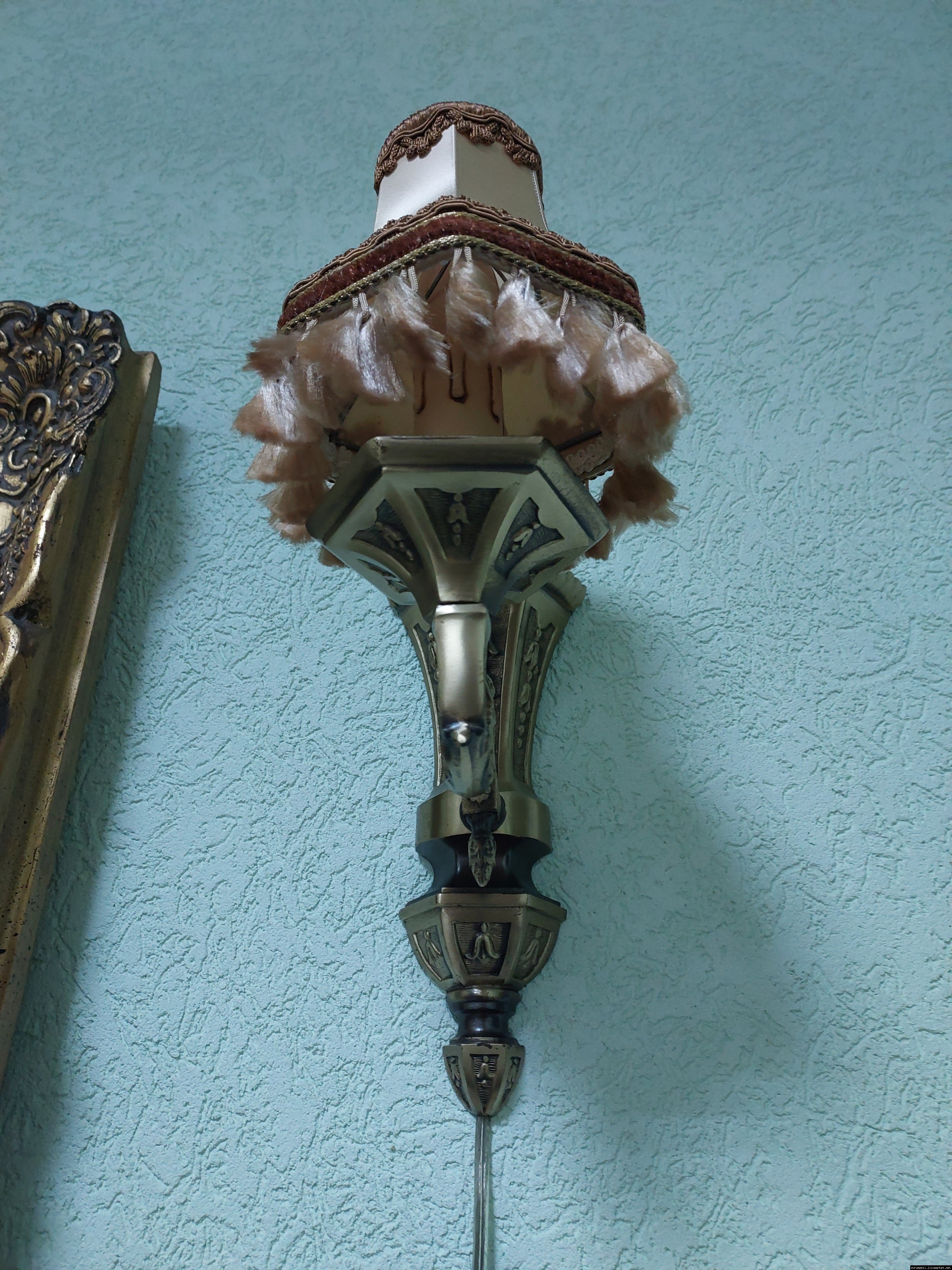 Старовинний, настінний світильник (бра) з тканинним абажуром, декорований бахромою та китицями, латунна основа. Бра в хорошому, робочому стані, привезено з Бельгії.