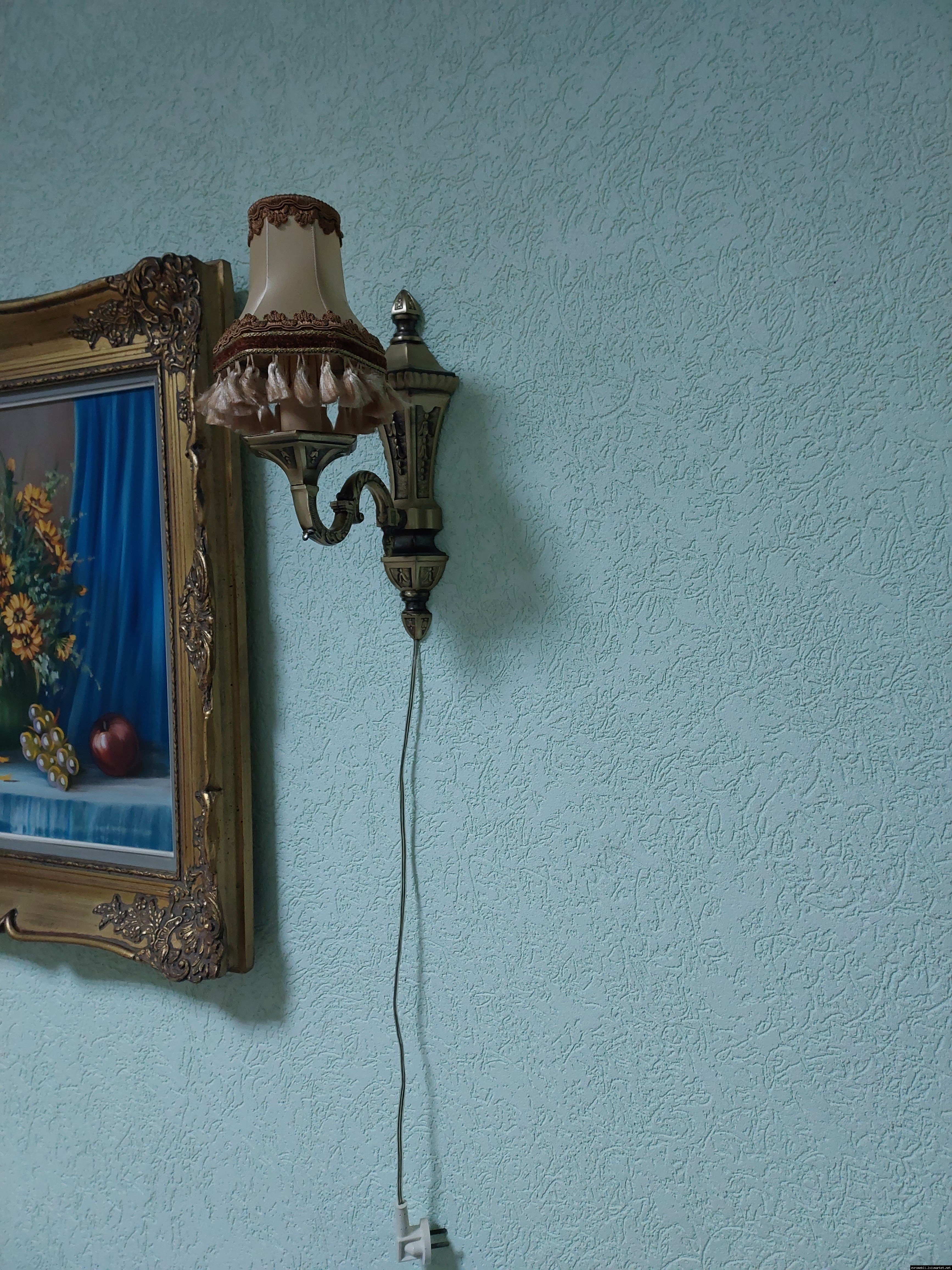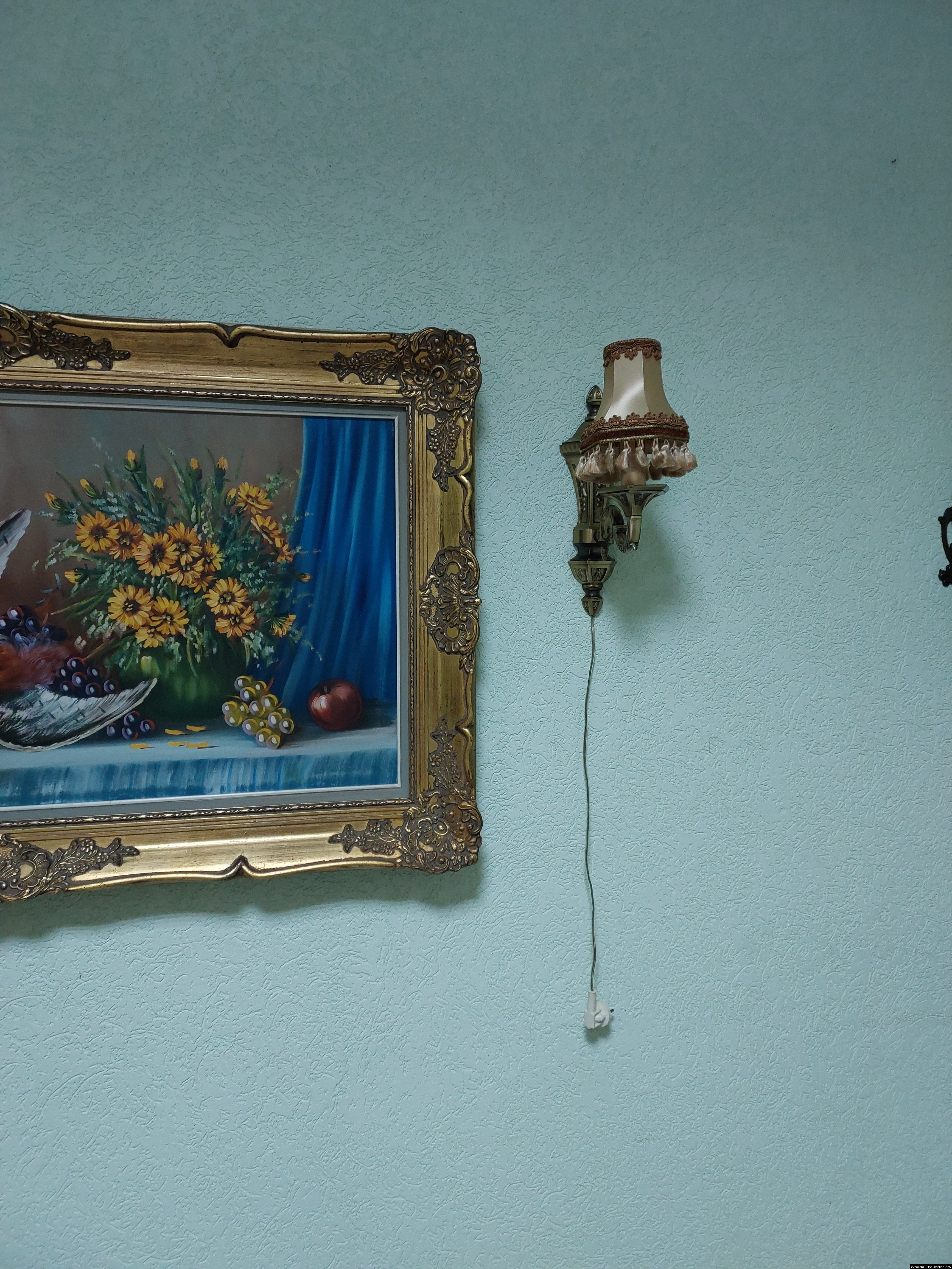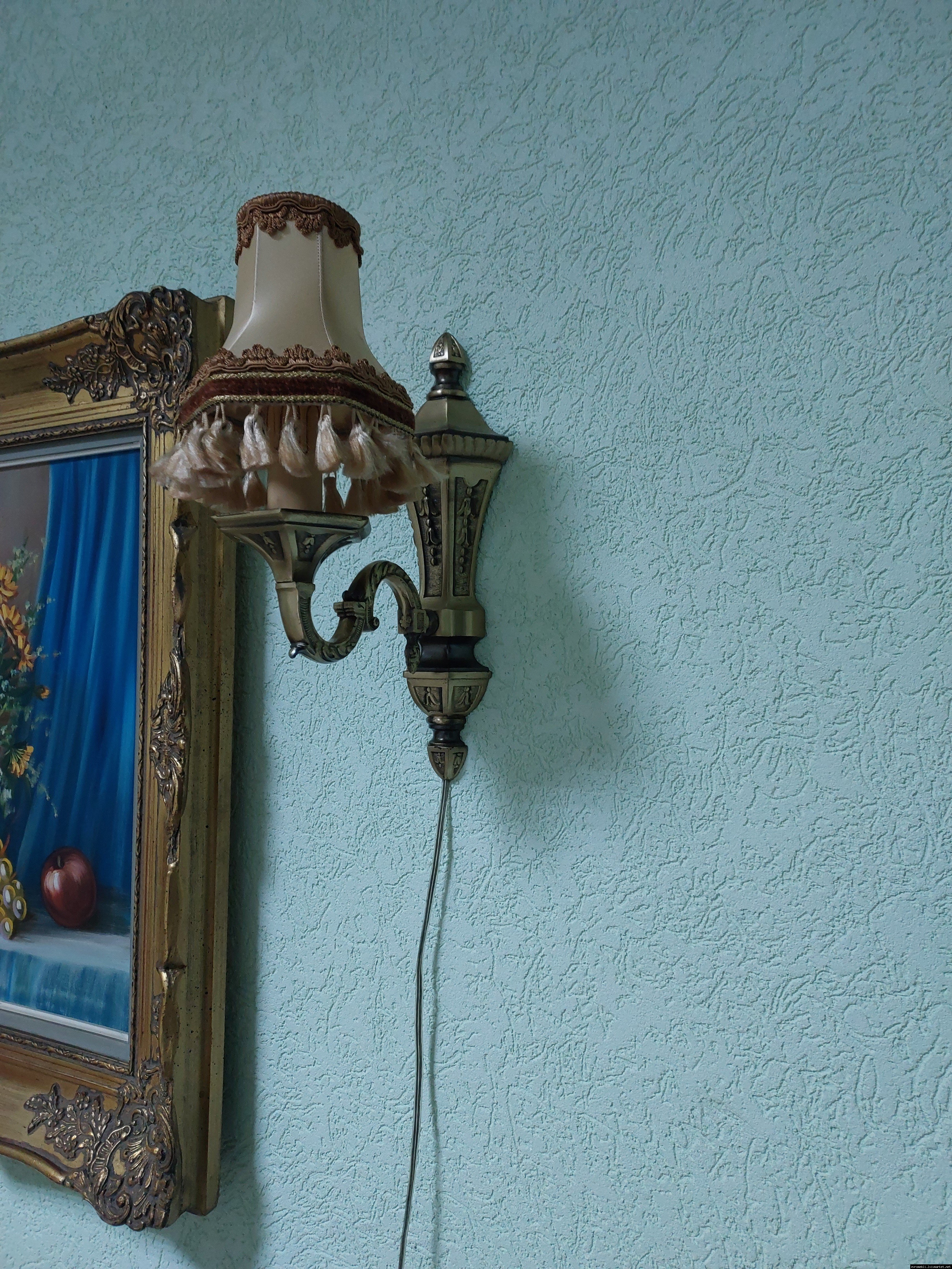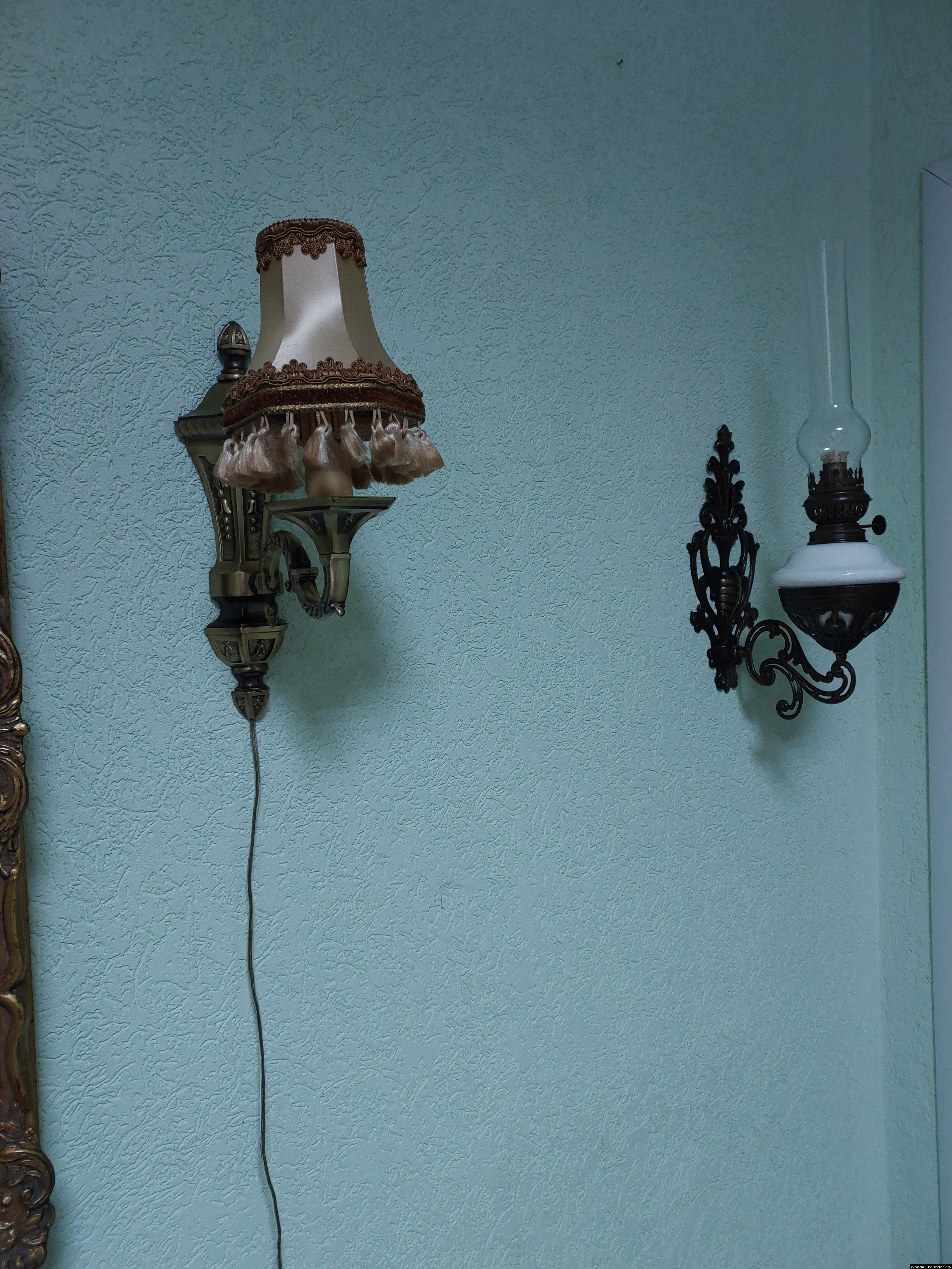 Старовинний, настінний світильник (бра) з тканинним абажуром, декорований бахромою та китицями, латунна основа. Бра в хорошому, робочому стані, привезено з Бельгії.