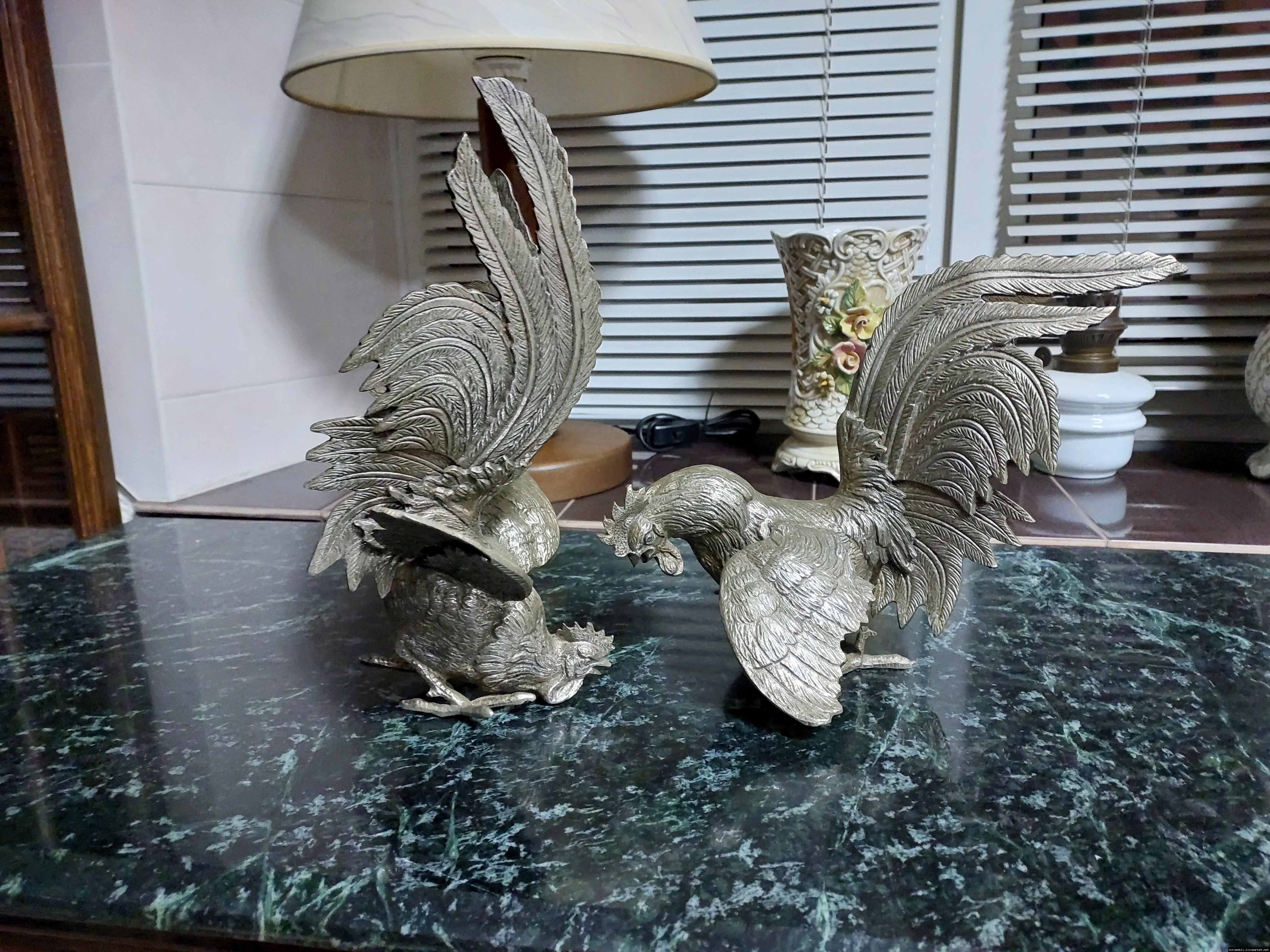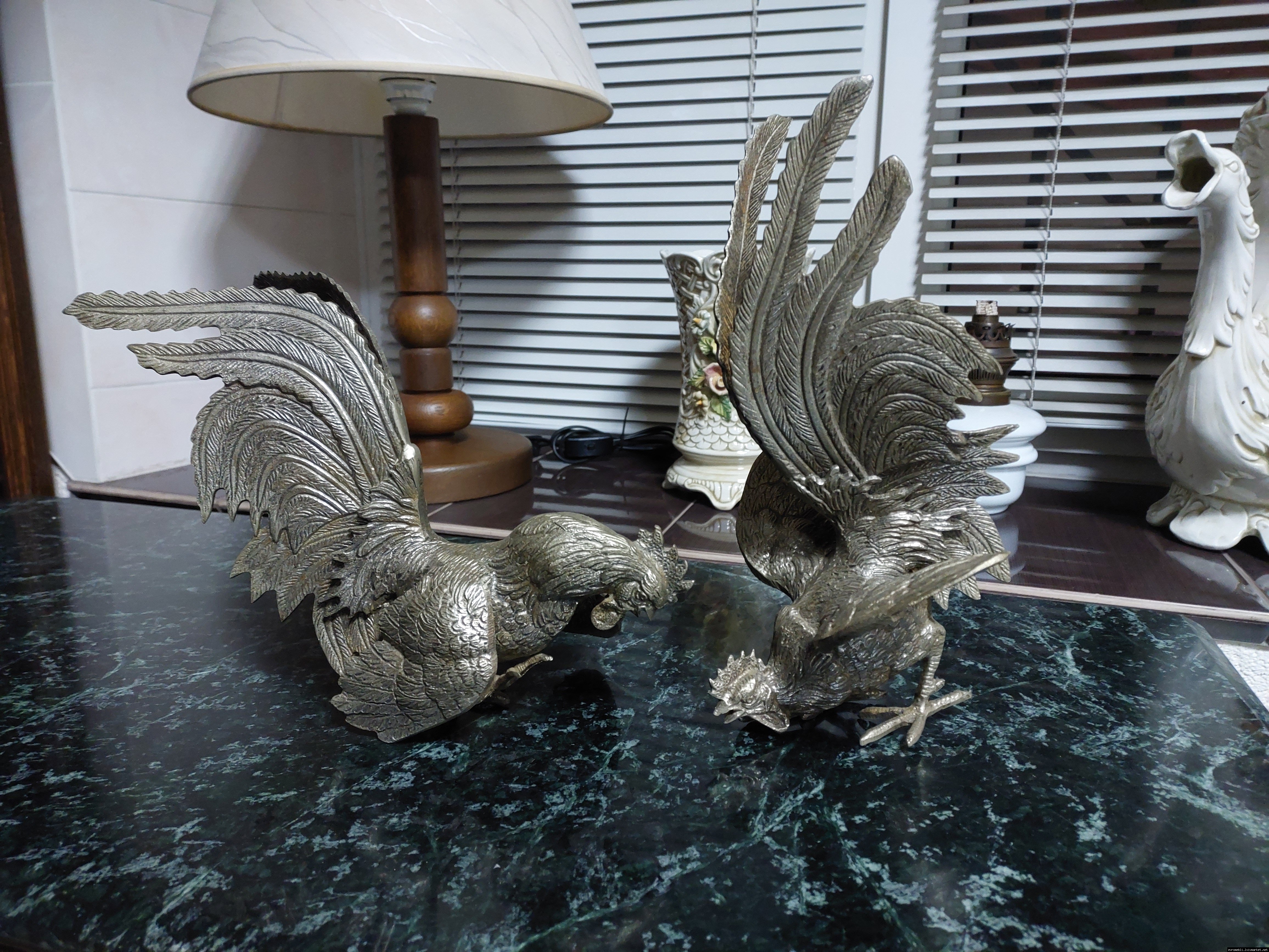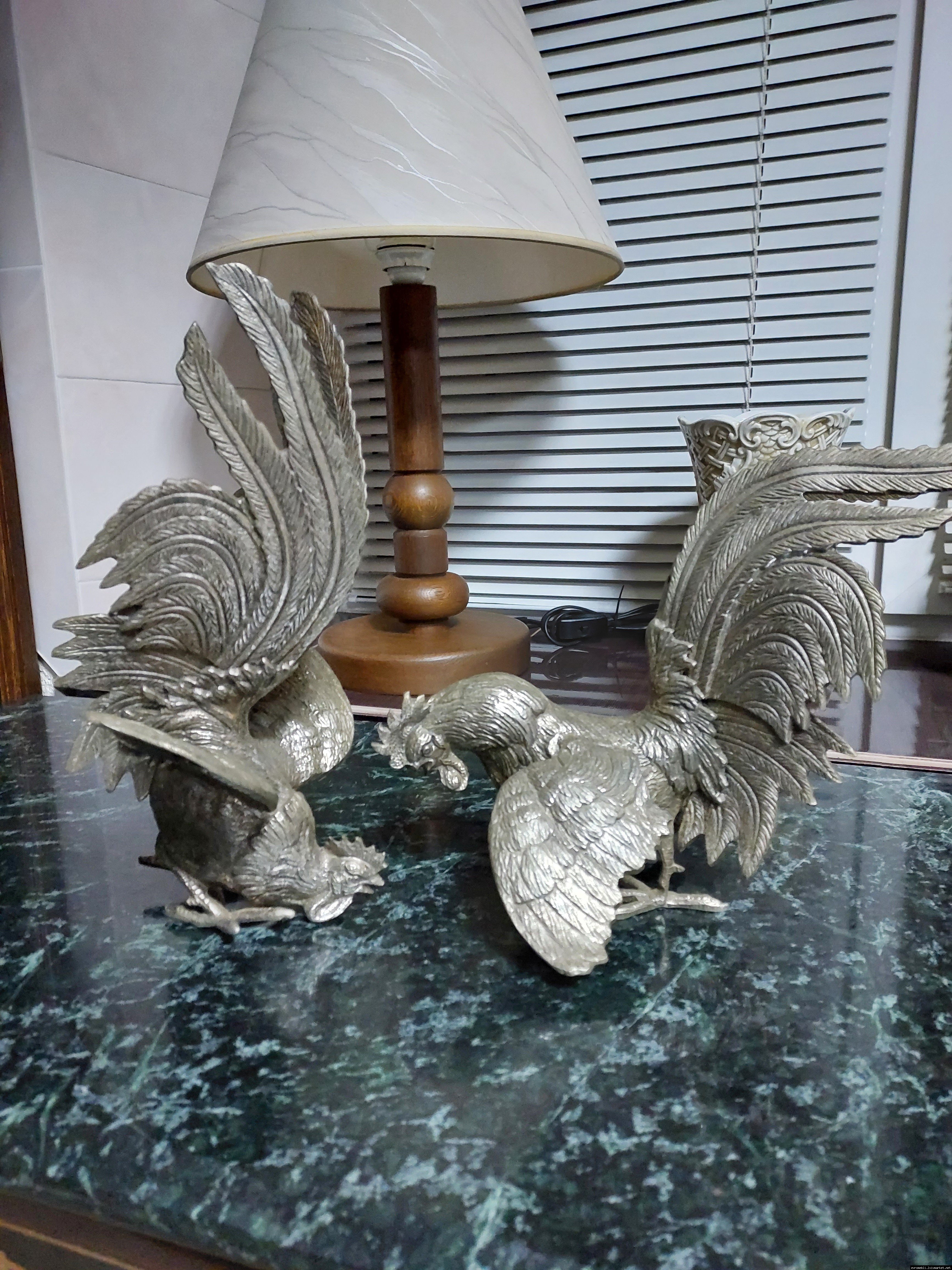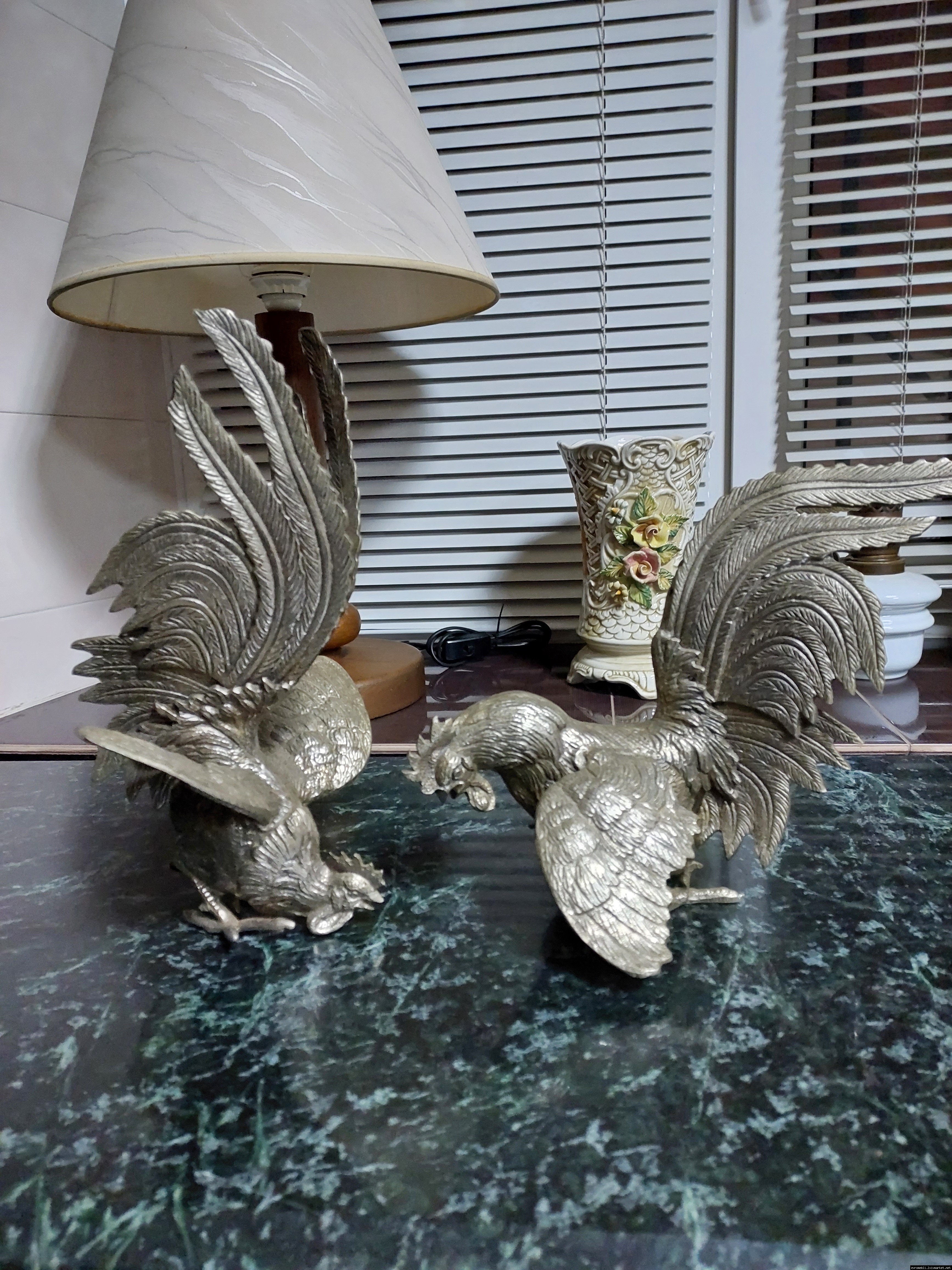 Старовинна парна статуетка "Бій півнів", велика та масивна. Композиція виготовлена з латуні та бронзи, прочеканена, в хорошому стані, привезена з Бельгії. Кожне пірячко опрацьовано руками професіонала. Прекрасна витончена робота у вигляді подарунка.