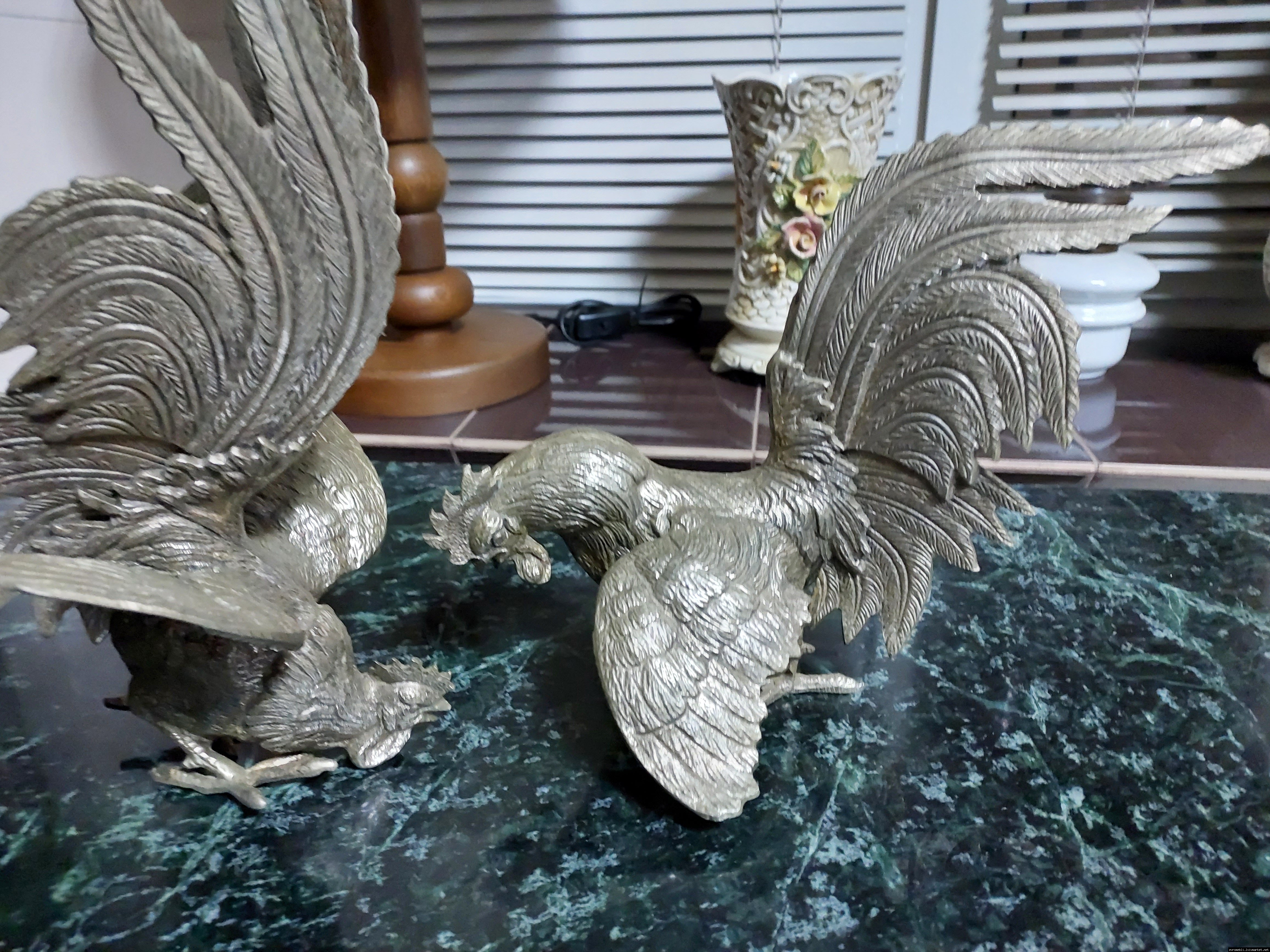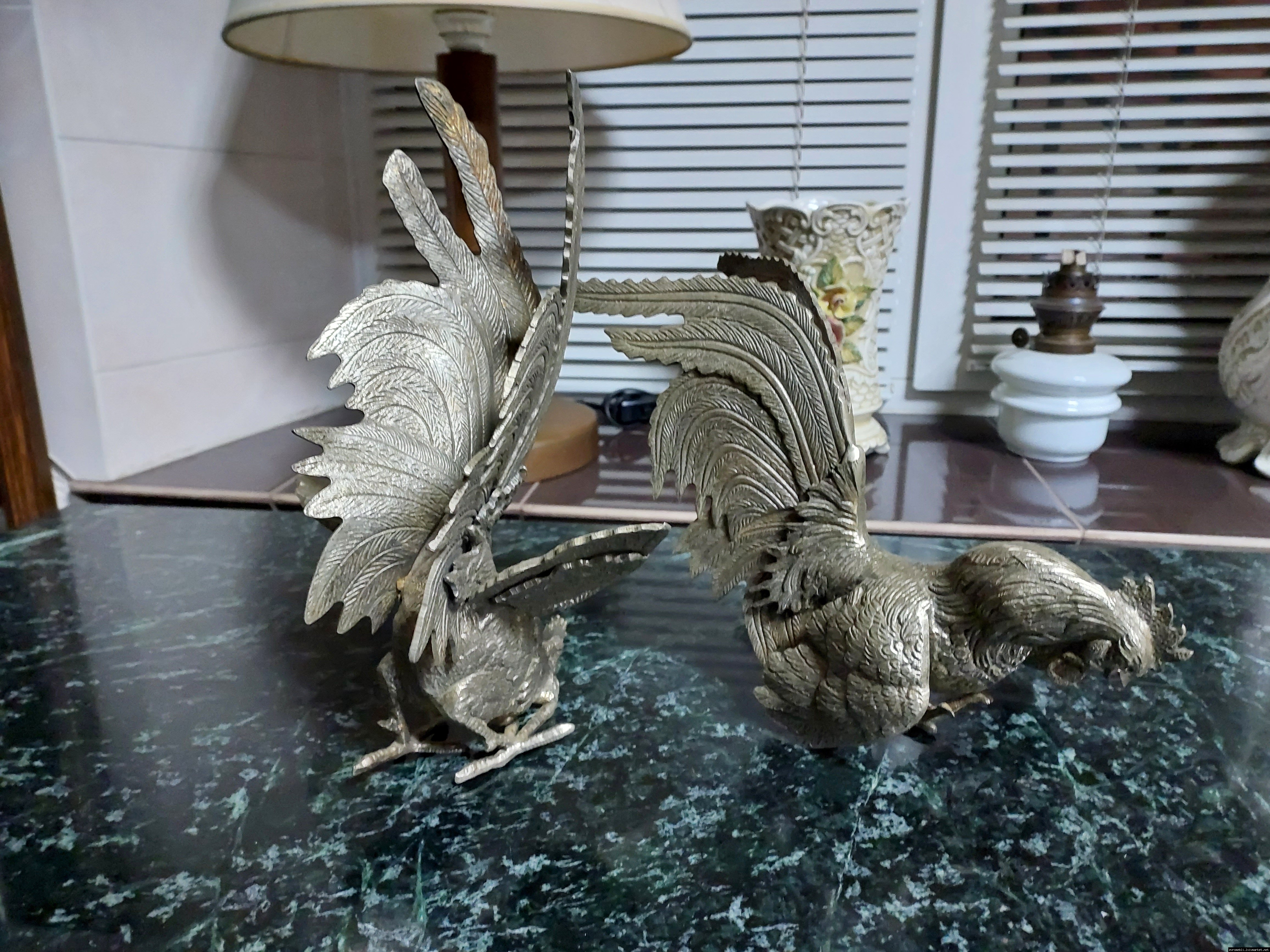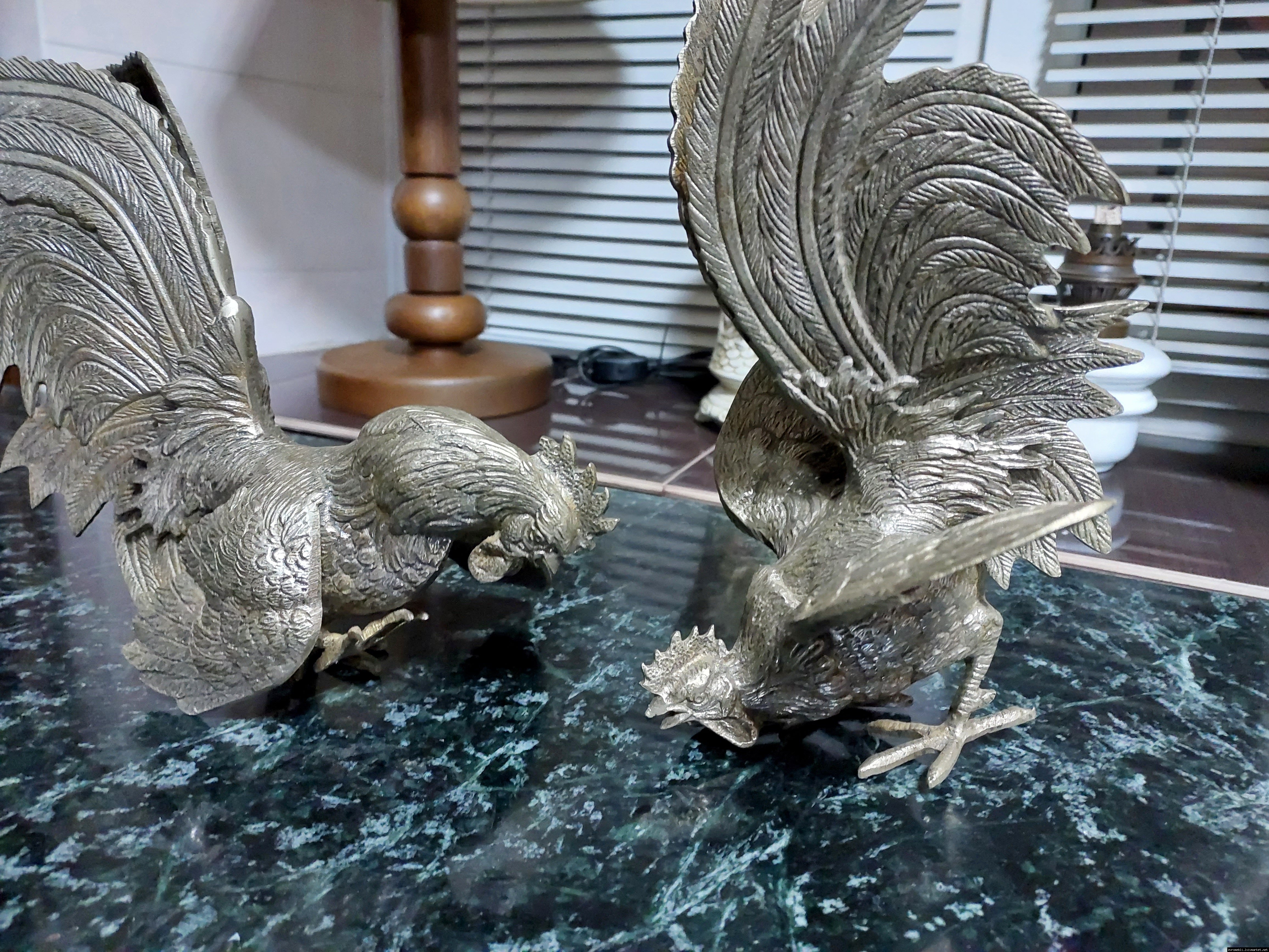 Старовинна парна статуетка "Бій півнів", велика та масивна. Композиція виготовлена з латуні та бронзи, прочеканена, в хорошому стані, привезена з Бельгії. Кожне пірячко опрацьовано руками професіонала. Прекрасна витончена робота у вигляді подарунка.