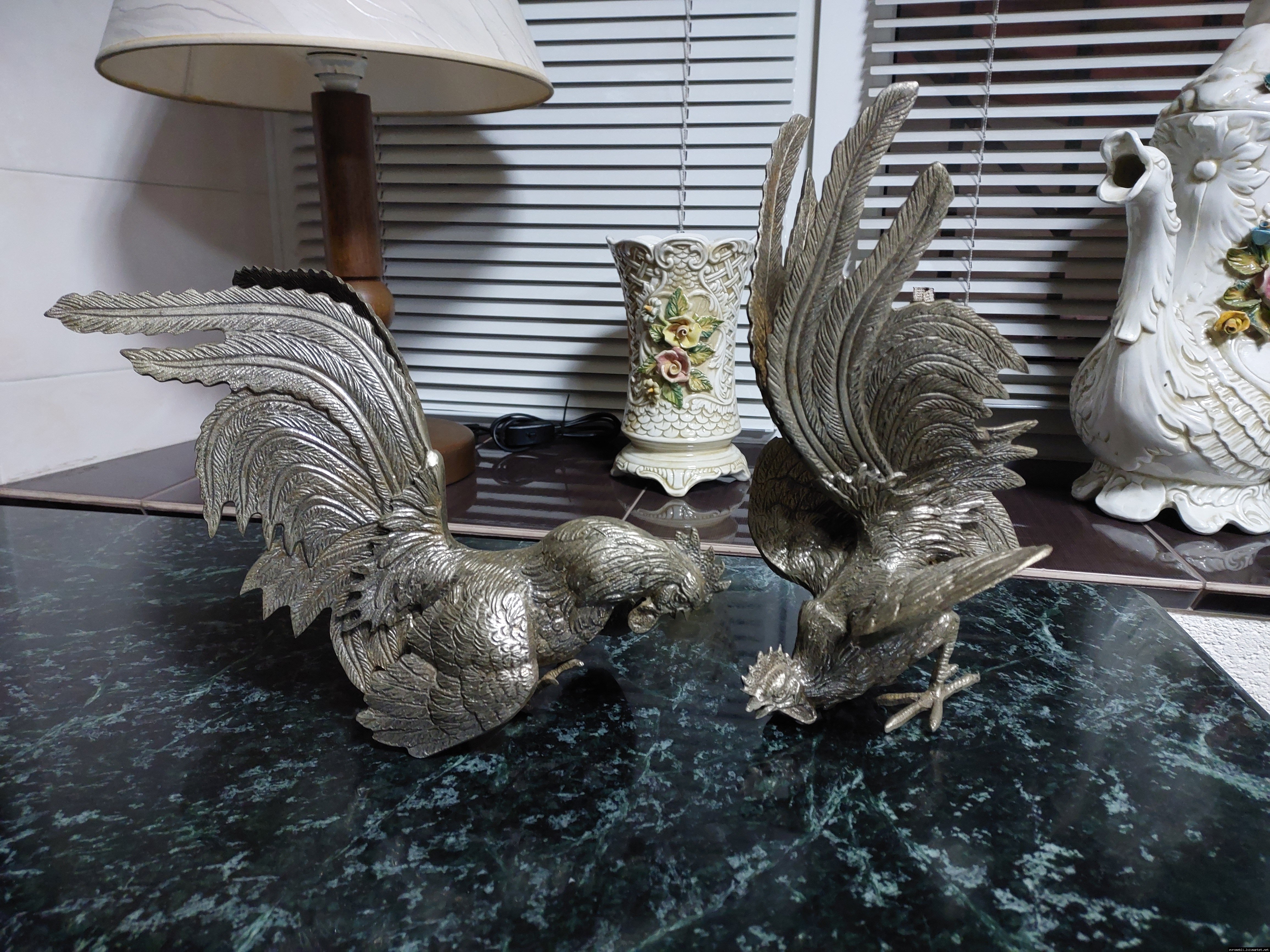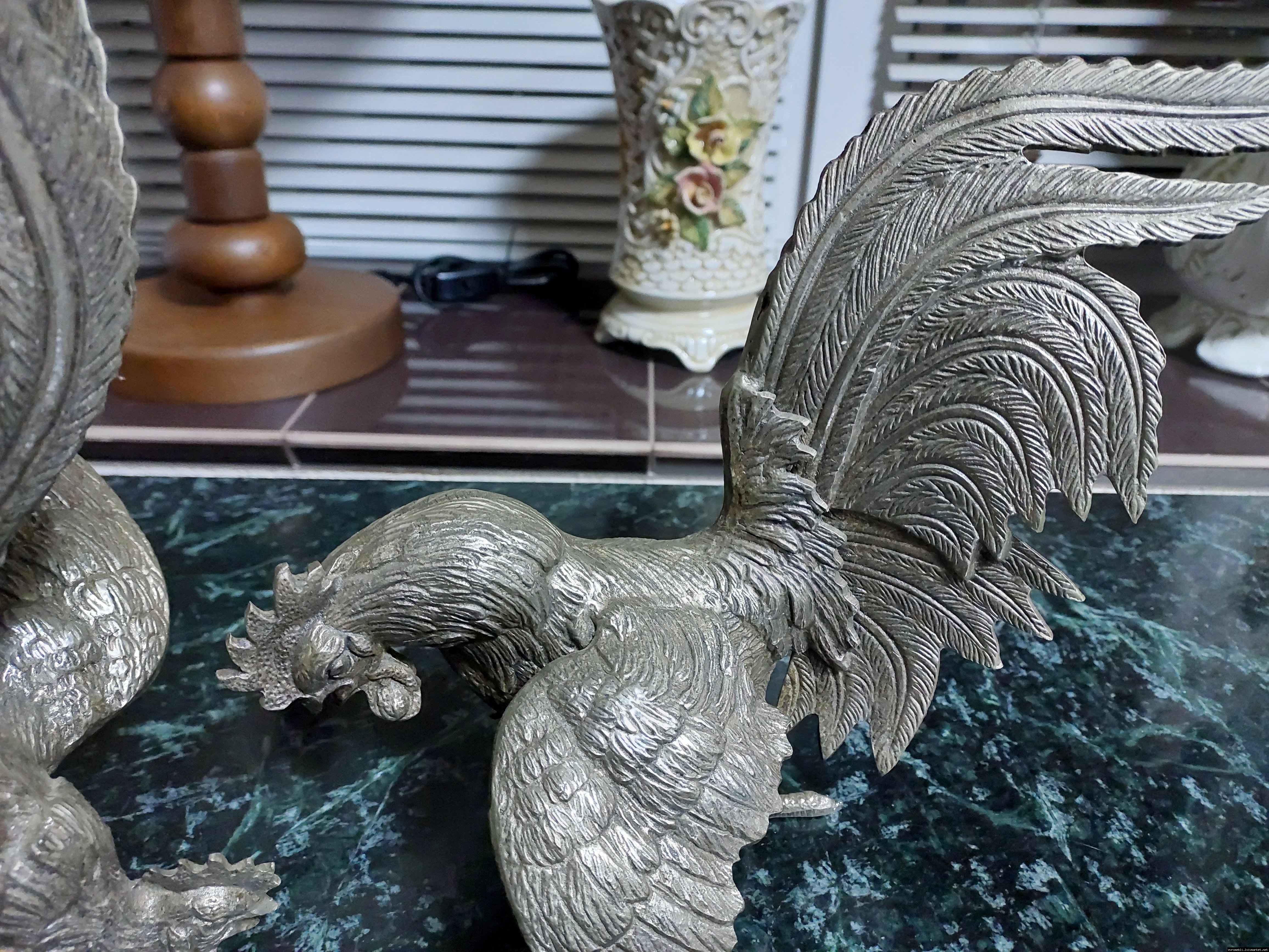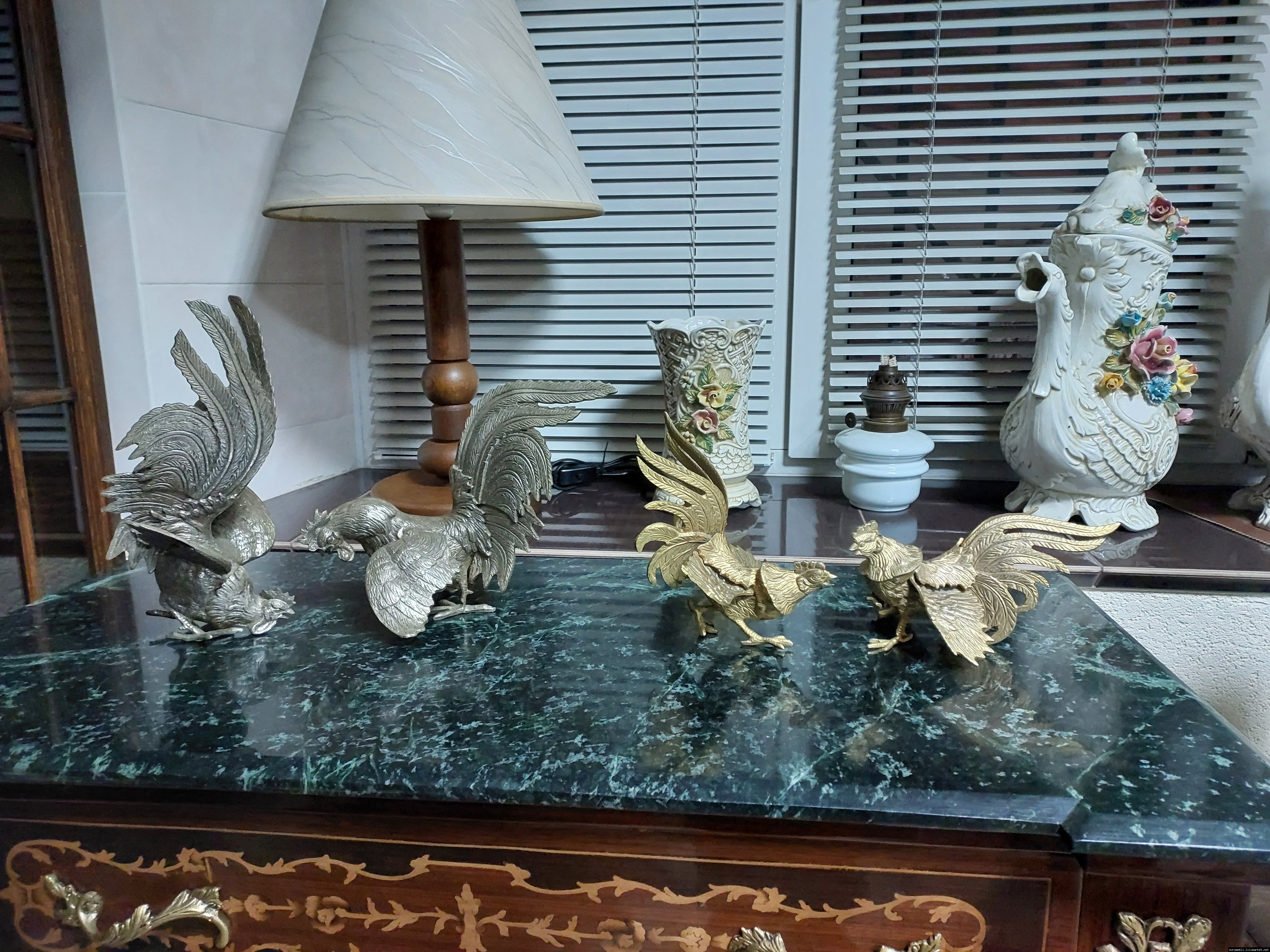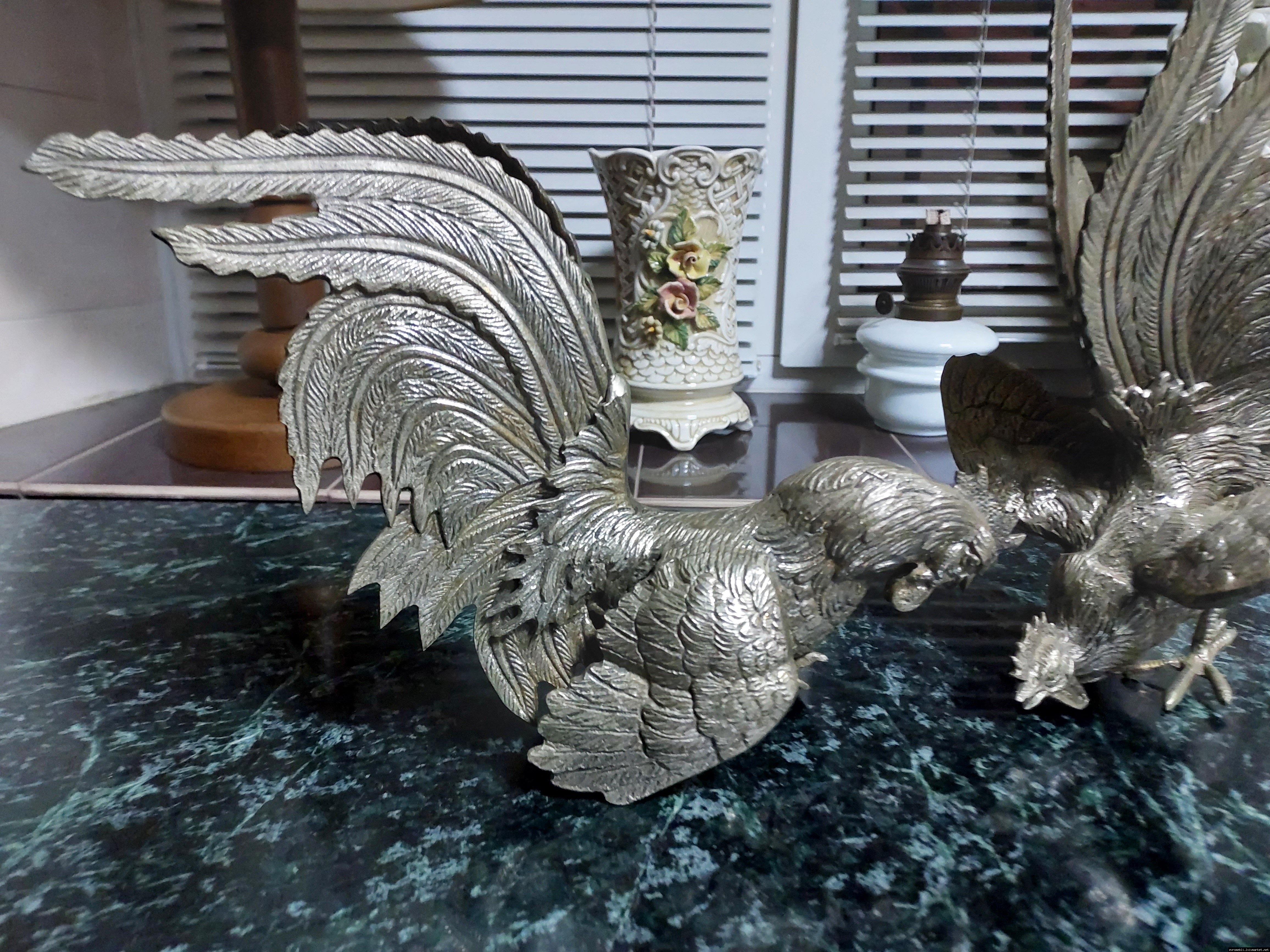 Старовинна парна статуетка "Бій півнів", велика та масивна. Композиція виготовлена з латуні та бронзи, прочеканена, в хорошому стані, привезена з Бельгії. Кожне пірячко опрацьовано руками професіонала. Прекрасна витончена робота у вигляді подарунка.