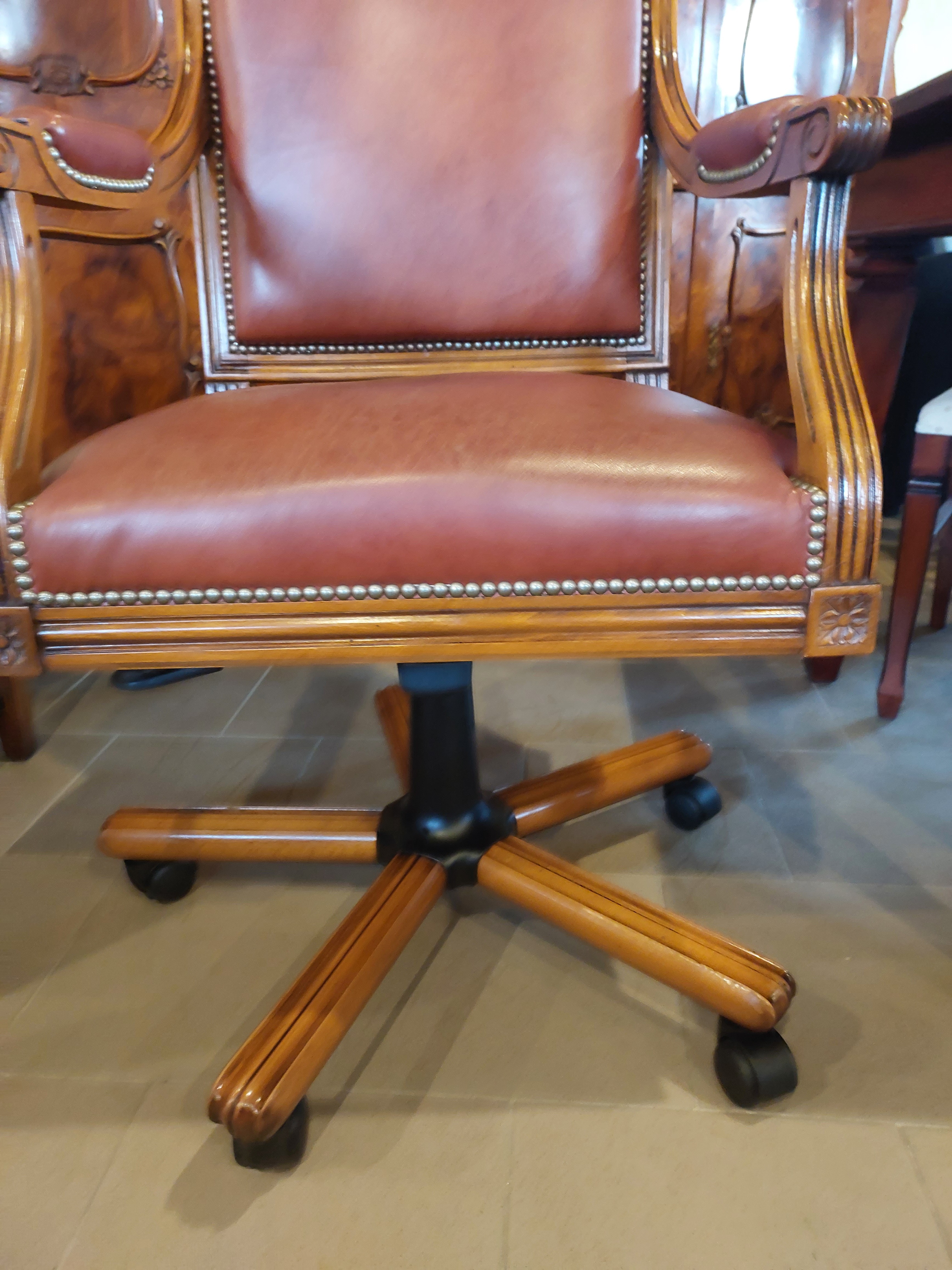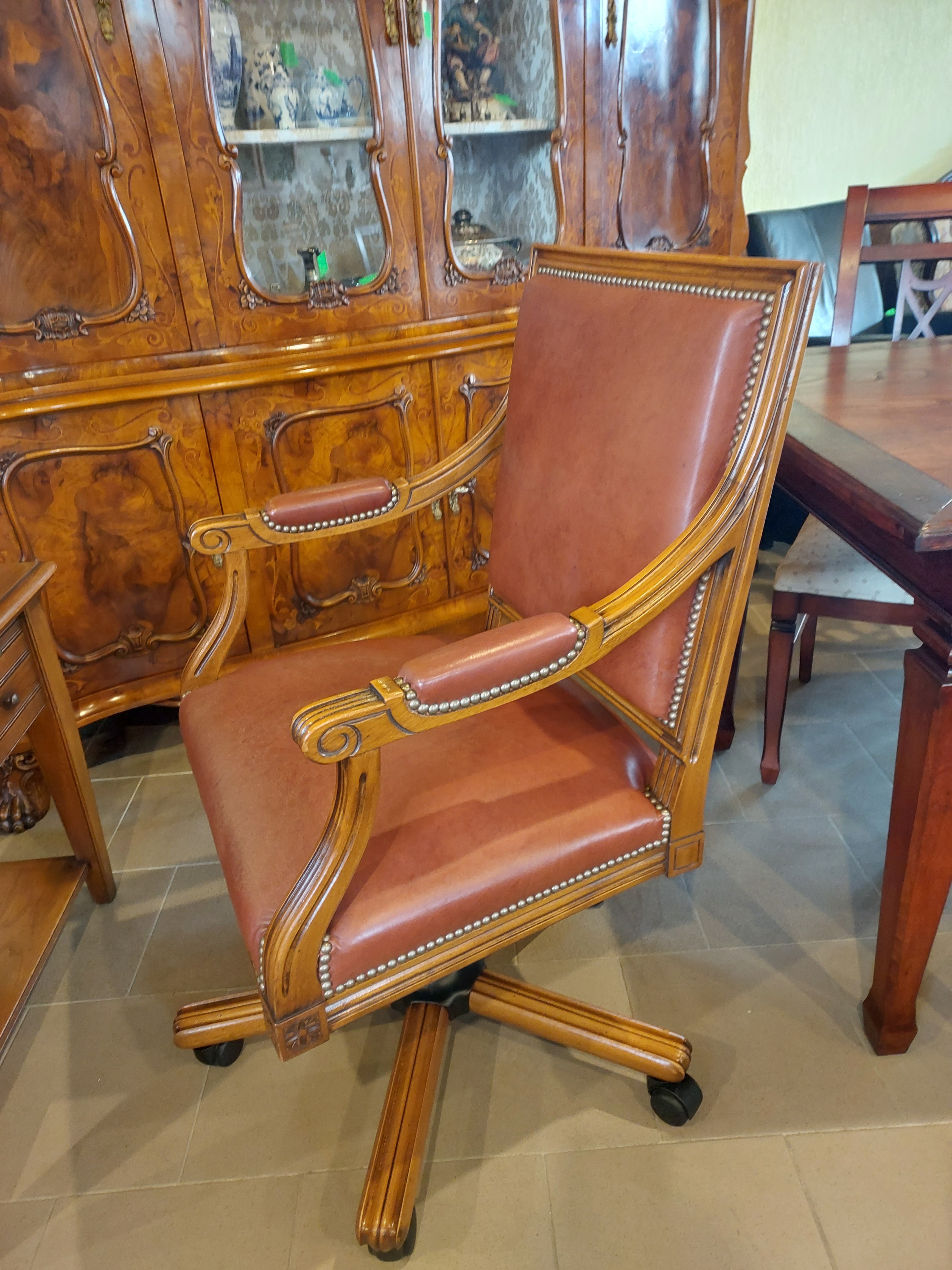 Шкіряне крісло в стилі Chesterfield. Англія. Крісло кабінетне (офісне), ручної роботи, з підлокотниками, на деревяній основі, масив, обтягнуте шкірою світло-коричневого кольору, оздоблене декоративними цвяшками. Крісло на коліщатах, оснащене регулятором висоти та високоякісним механізмом гойдання з регулятором ваги, які забезпечують комфорт при сидячій роботі. Крісло велике, масивне, дуже зручне та комфортне, в хорошому стані, привезене з Бельгії.