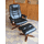 Шкіряний комплект: крісло відпочинкове + пуфік. Крісло та пуфік на деревяних ніжках, шкіра чорного кольору. Крісло з поворотним механізмом (обертається по колу), без регулятора висоти, спинка крісла регулюється (опускається, підіймається). Комплект дуже зручний в користуванні, мякий та комфортний, в хорошому стані, привезений з Бельгії.