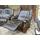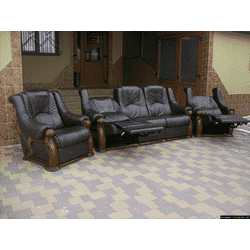Шкіряний комплект 3+1+1 на дубовому каркасі з функцією електрорелаксу. До комплекту входить трьохмісний, нерозкладний диван (одна з трьох частин дивану має функцію релаксу) та два крісла ( одне з двох крісел має функцію релаксу), на електроприводі. Комплект на деревяному каркасі, темний дуб, масив, декорований елементами різьби, шкіра темно-коричневого кольору, оздоблена декоративними цвяшками. Комплект мякий, зручний та комфортний, в хорошому стані, країна виробник- Німеччина.