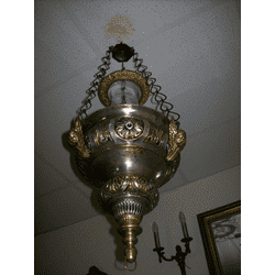 Старовинна, антикварна, раритетна підвісна лампада. Греція. Лампада зі скляною чашею, виготовлена з міді та латуні, декорована елеменами лиття та карбування. Лампада в хорошому, збереженому стані.