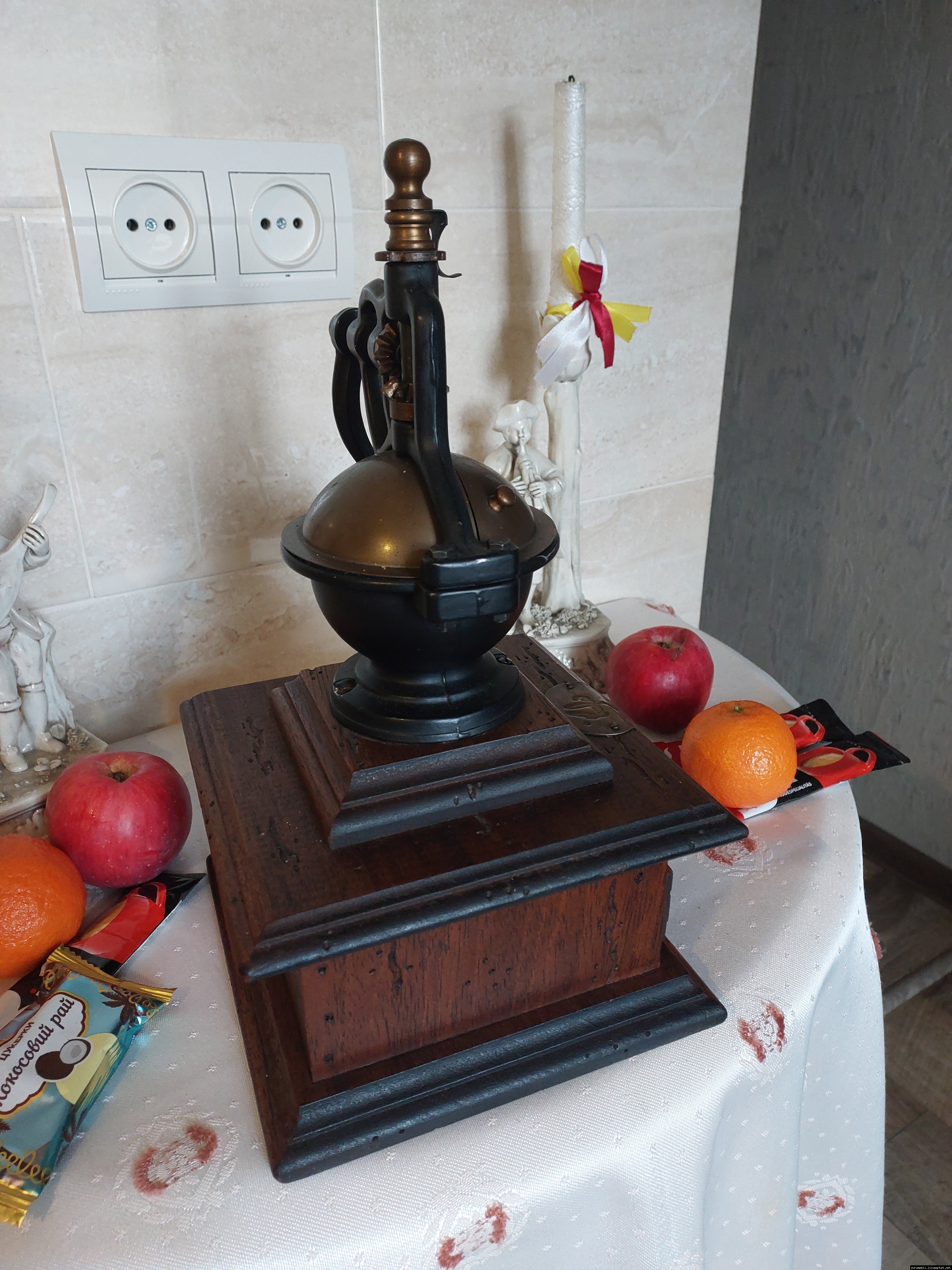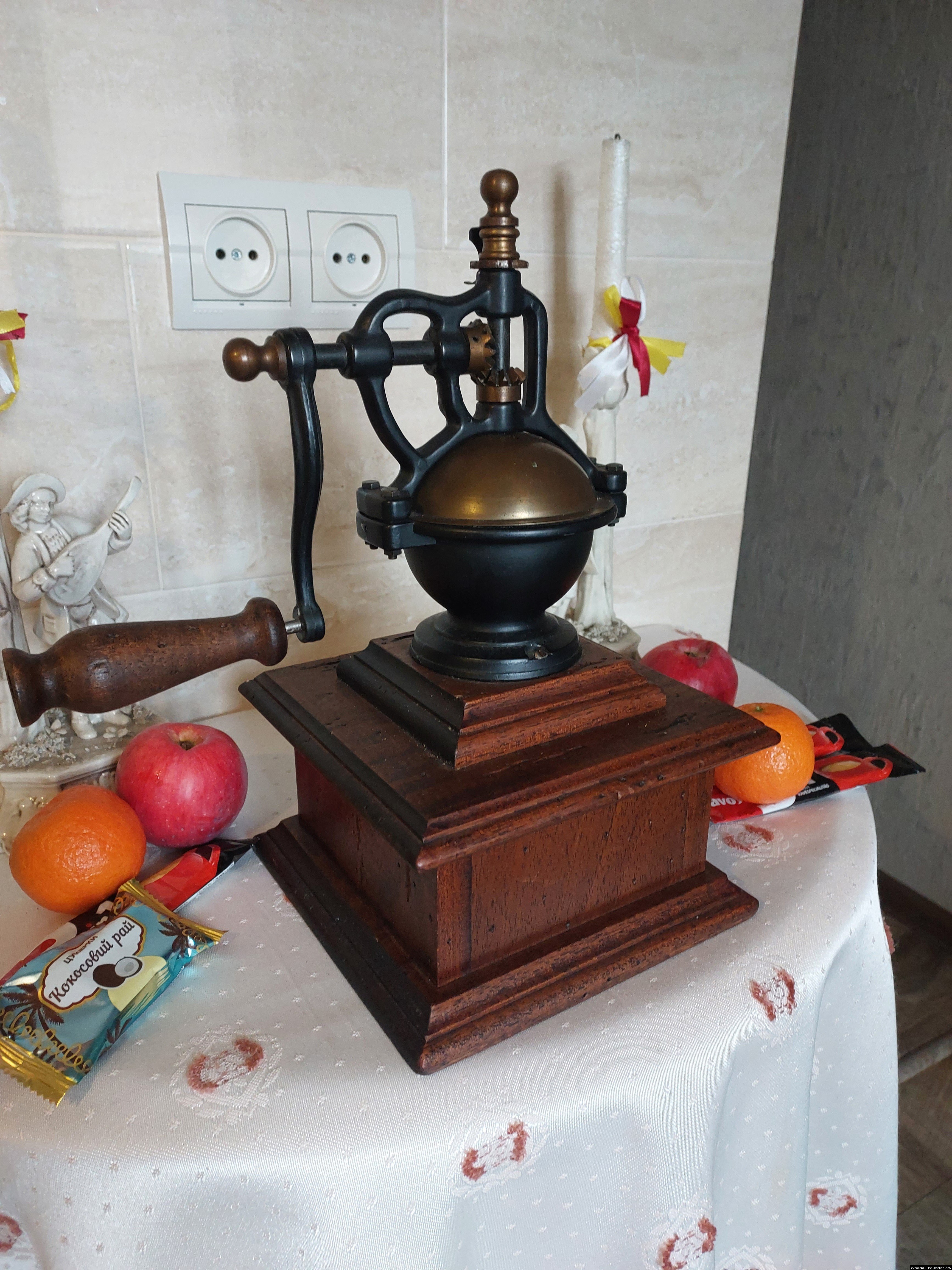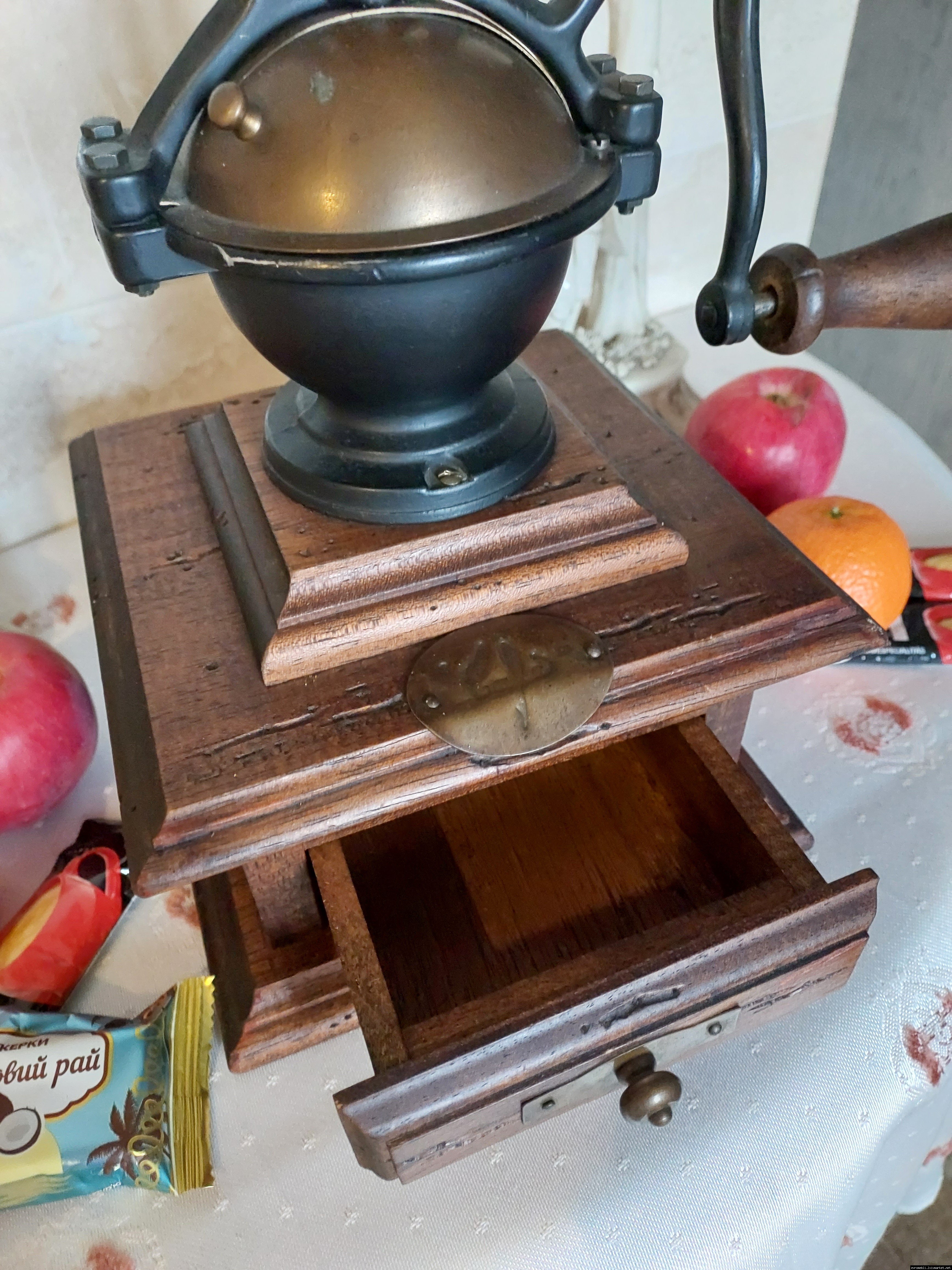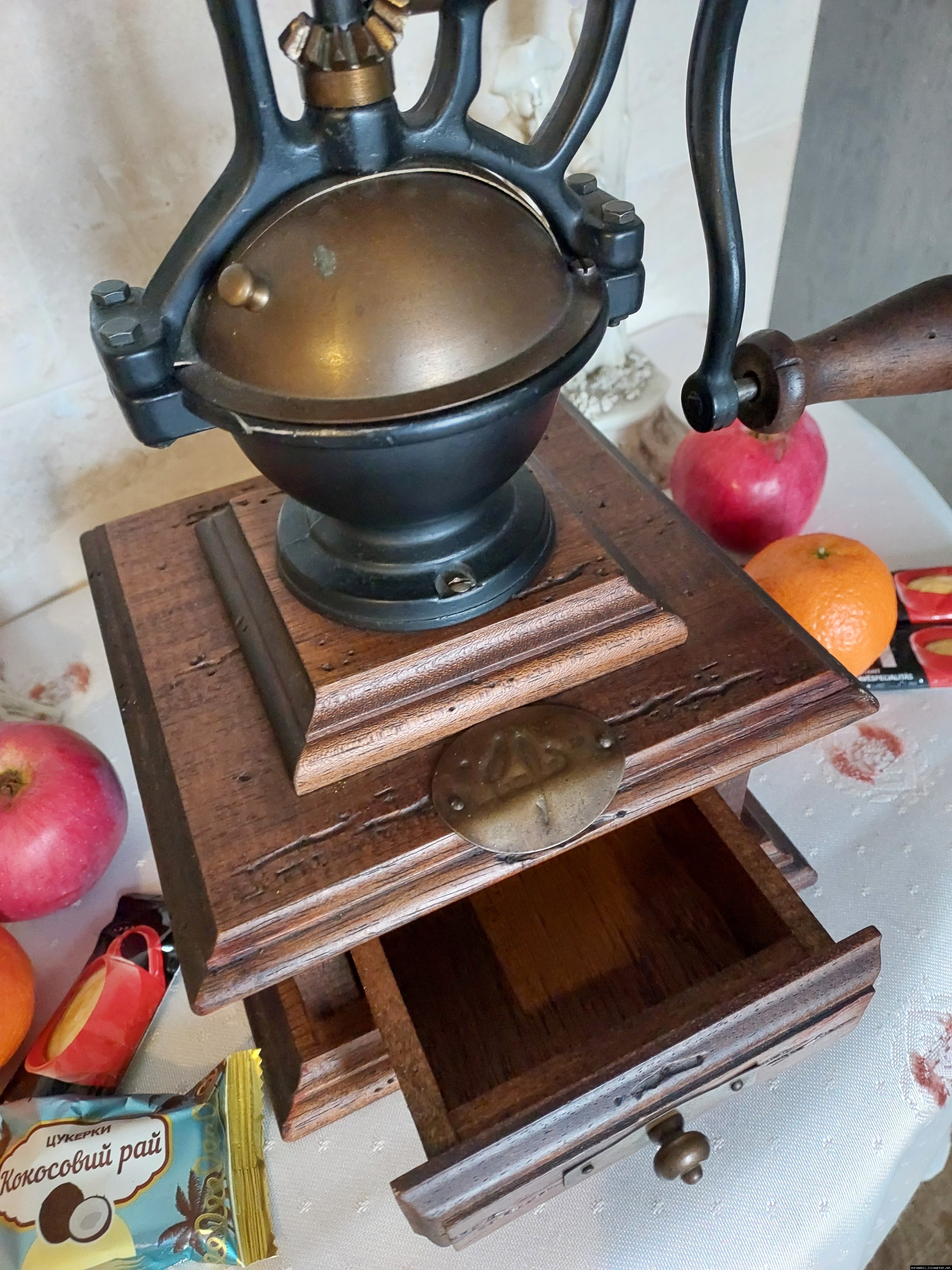 Дуже красива ручна кавомолка виготовлена з дерева та металу. Прекрасне поєднання натурального дерева та латуні дозволять вписати кавомолку в інтер'єр будь-якої кухні. Особливо добре буде виглядати в кухнях в стилі кантрі. Механізм виготовлений з металу- латунь. Кавомолка в хорошому робочому стані, з регулюванням рівня помолу, без пошкоджень, стане яскравим елементом в декорі, а справжні поціновувачі кави можуть використовувати її за призначенням.