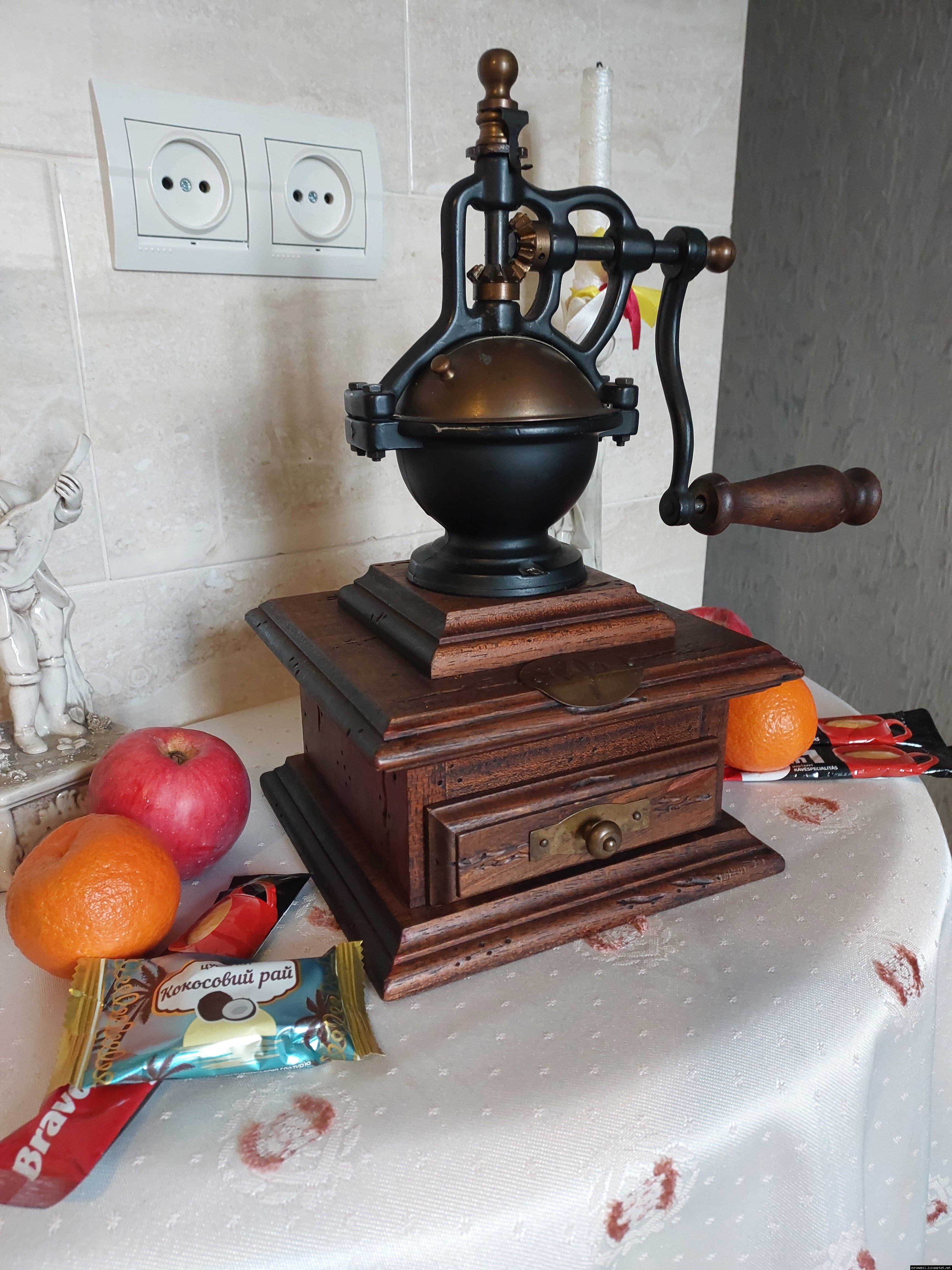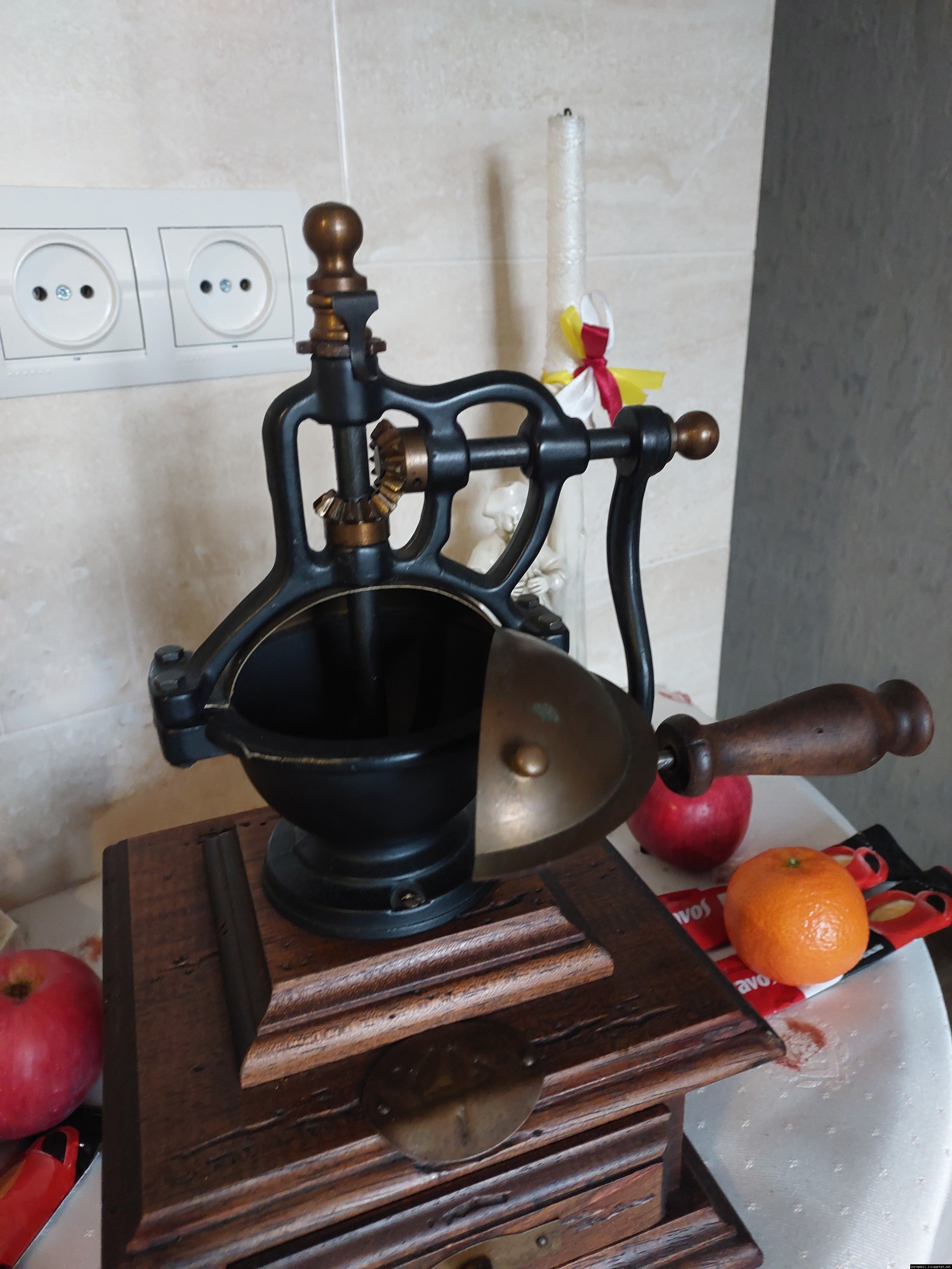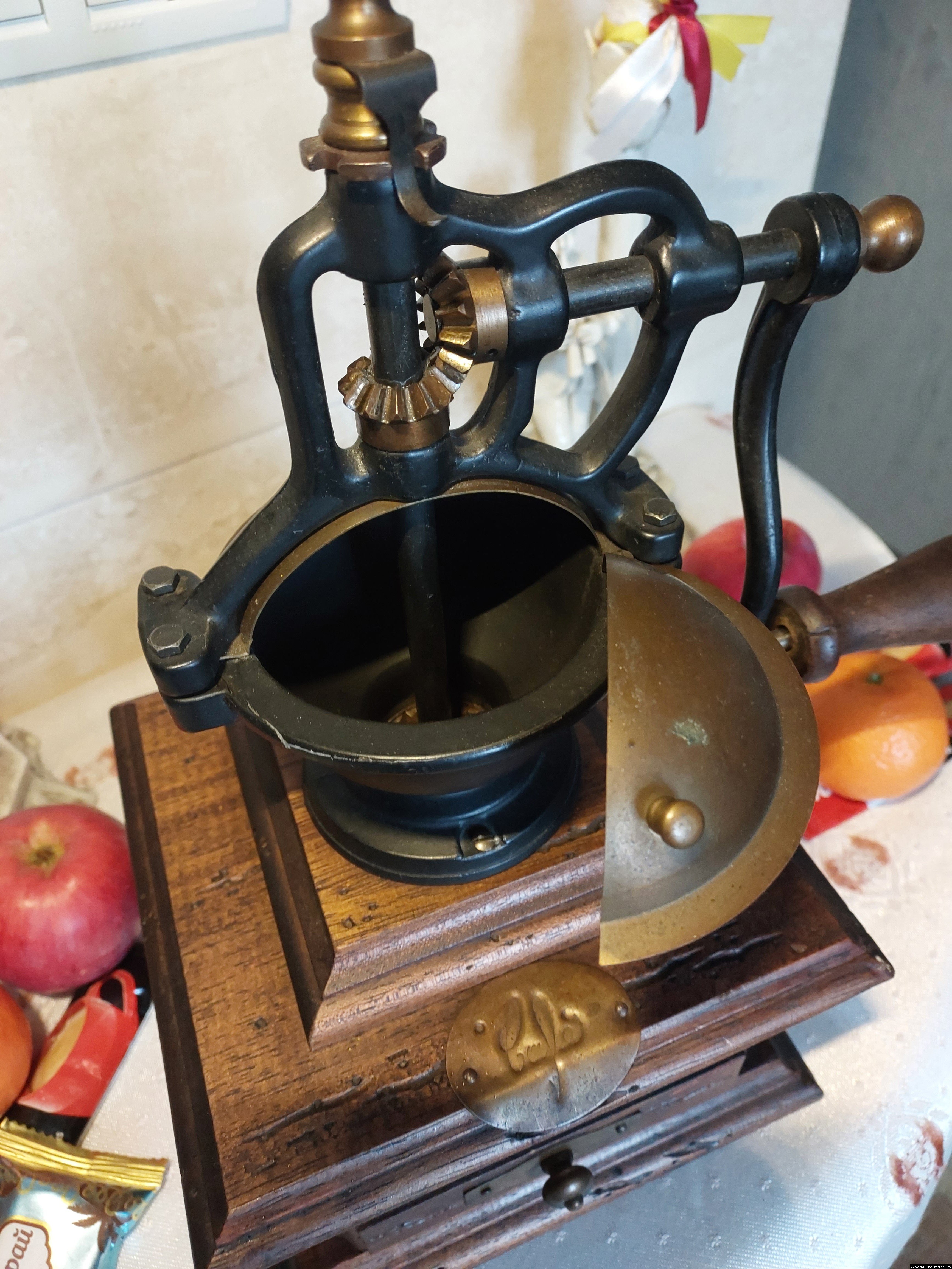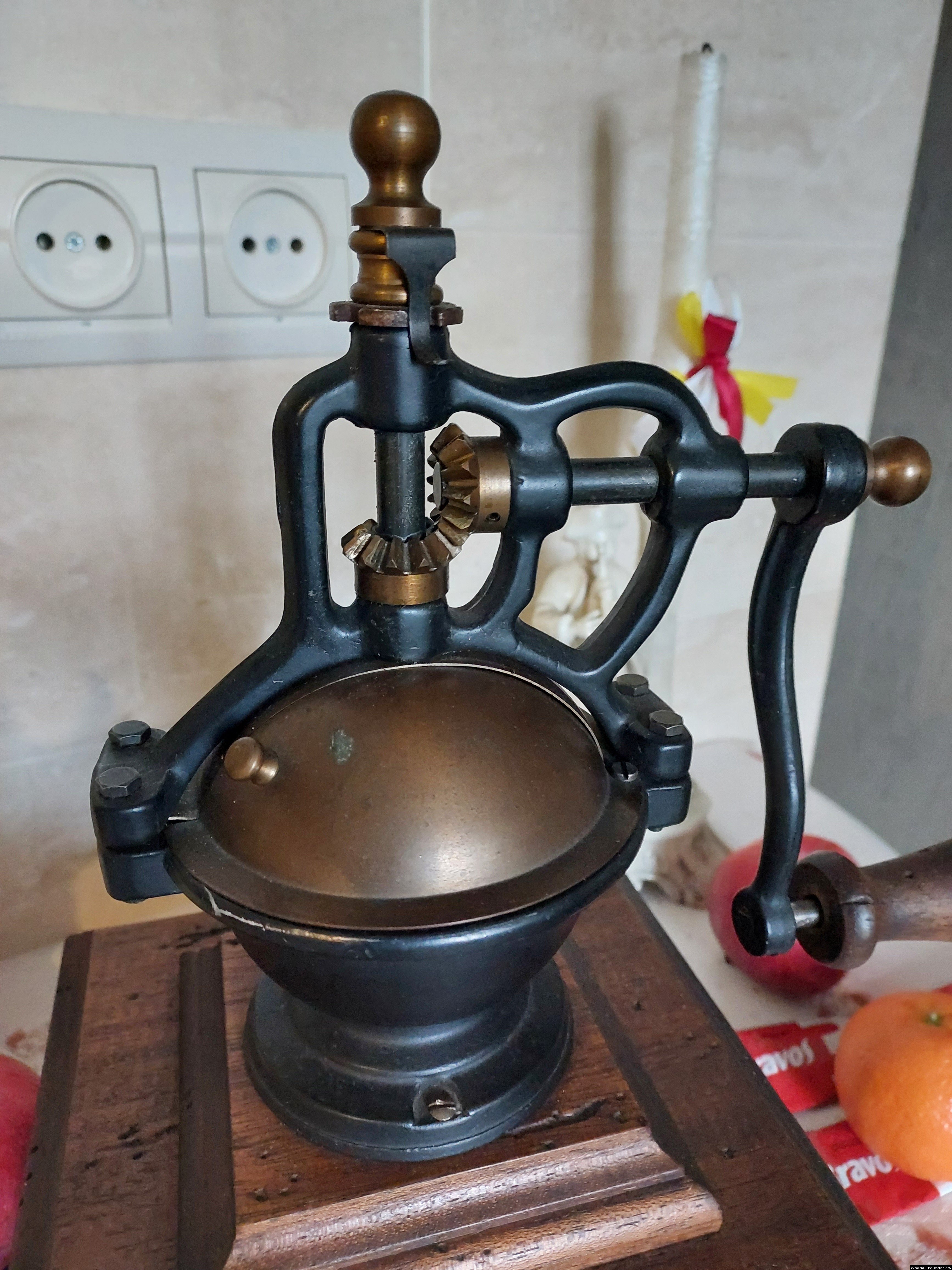 Дуже красива ручна кавомолка виготовлена з дерева та металу. Прекрасне поєднання натурального дерева та латуні дозволять вписати кавомолку в інтер'єр будь-якої кухні. Особливо добре буде виглядати в кухнях в стилі кантрі. Механізм виготовлений з металу- латунь. Кавомолка в хорошому робочому стані, з регулюванням рівня помолу, без пошкоджень, стане яскравим елементом в декорі, а справжні поціновувачі кави можуть використовувати її за призначенням.