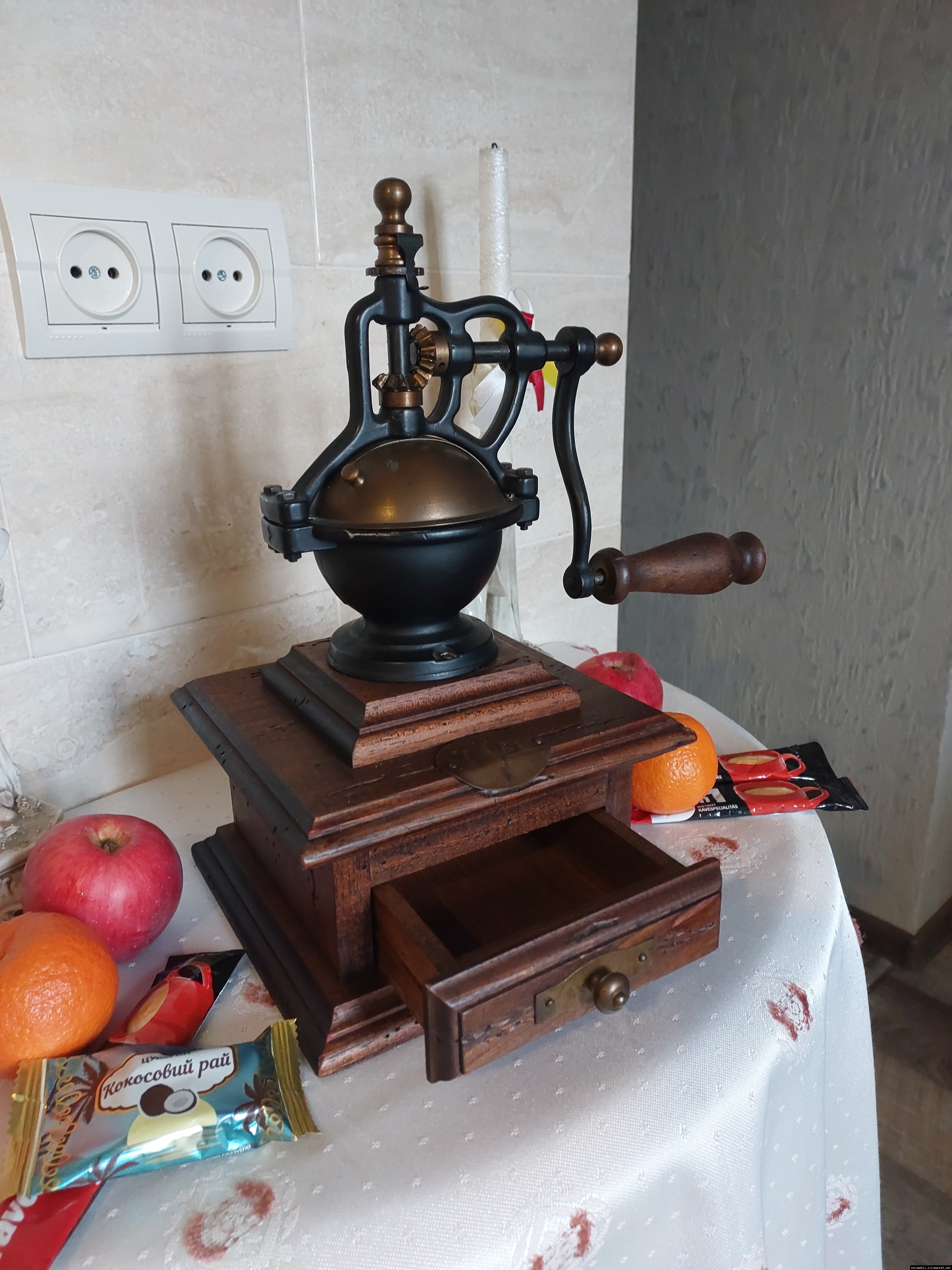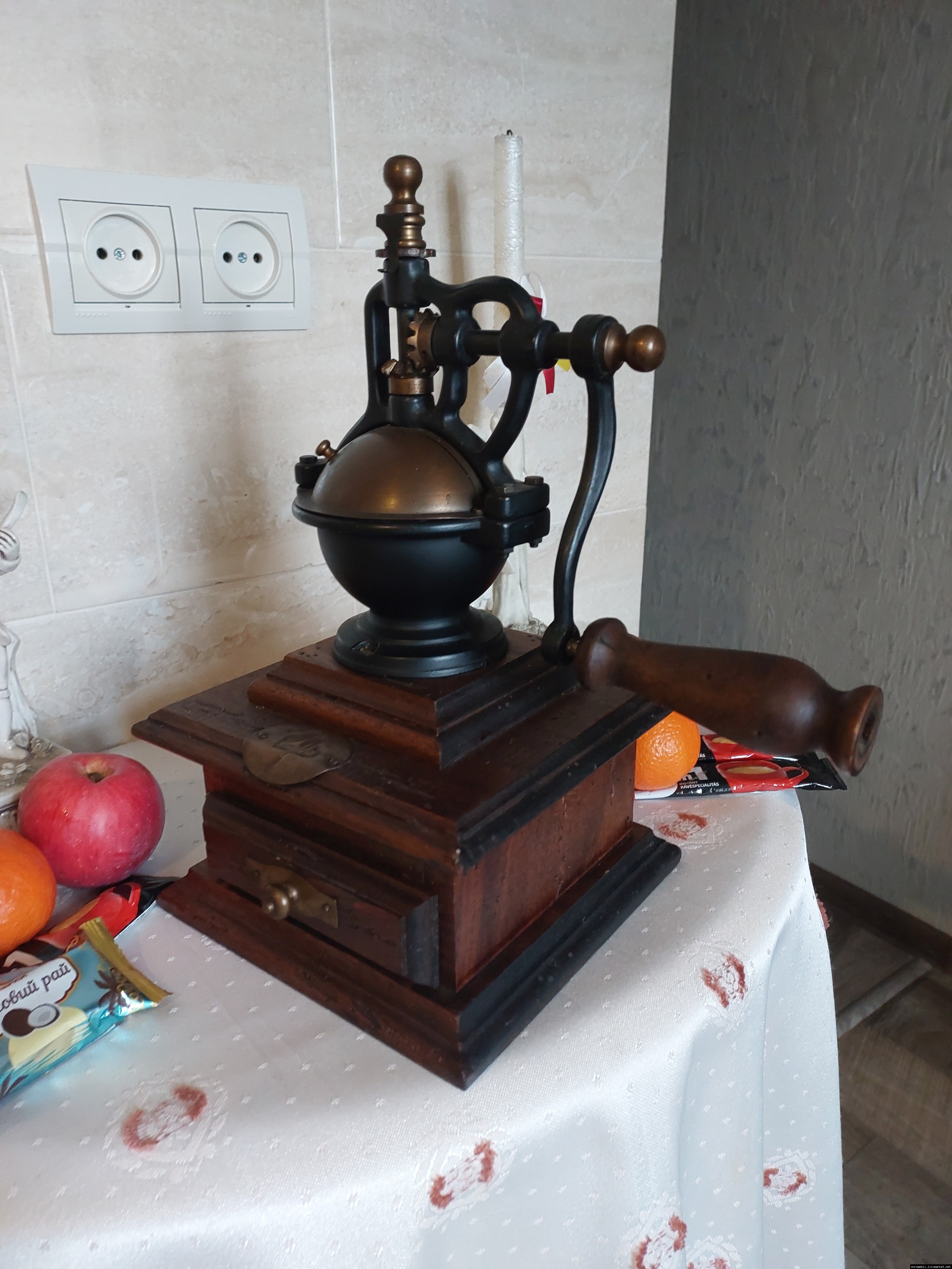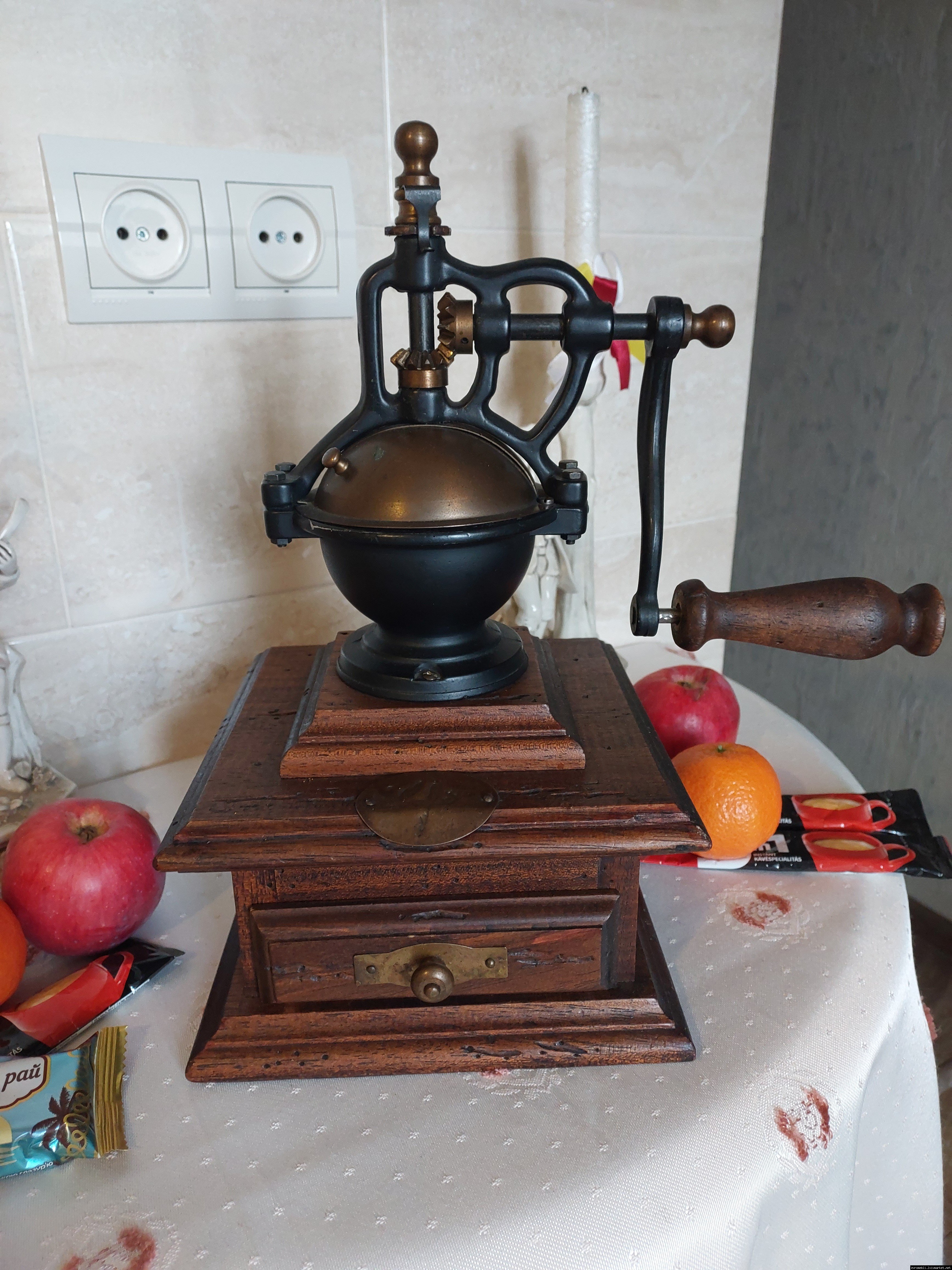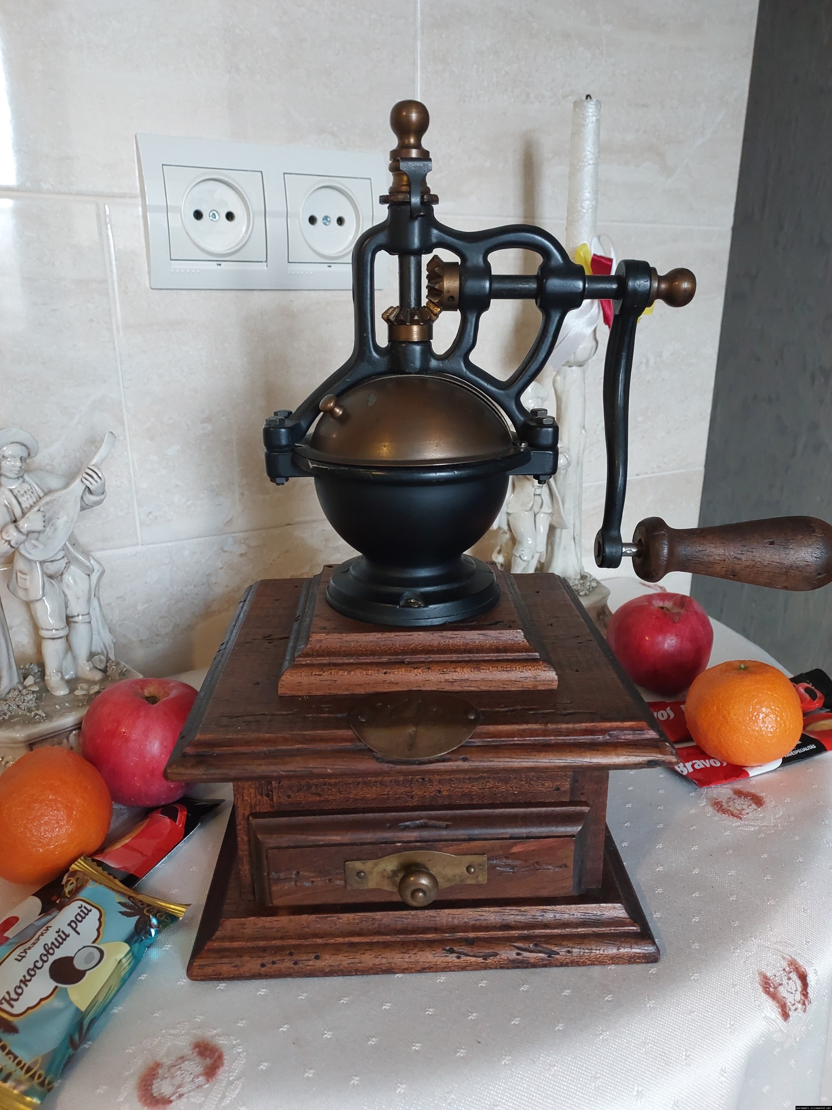 Дуже красива ручна кавомолка виготовлена з дерева та металу. Прекрасне поєднання натурального дерева та латуні дозволять вписати кавомолку в інтер'єр будь-якої кухні. Особливо добре буде виглядати в кухнях в стилі кантрі. Механізм виготовлений з металу- латунь. Кавомолка в хорошому робочому стані, з регулюванням рівня помолу, без пошкоджень, стане яскравим елементом в декорі, а справжні поціновувачі кави можуть використовувати її за призначенням.