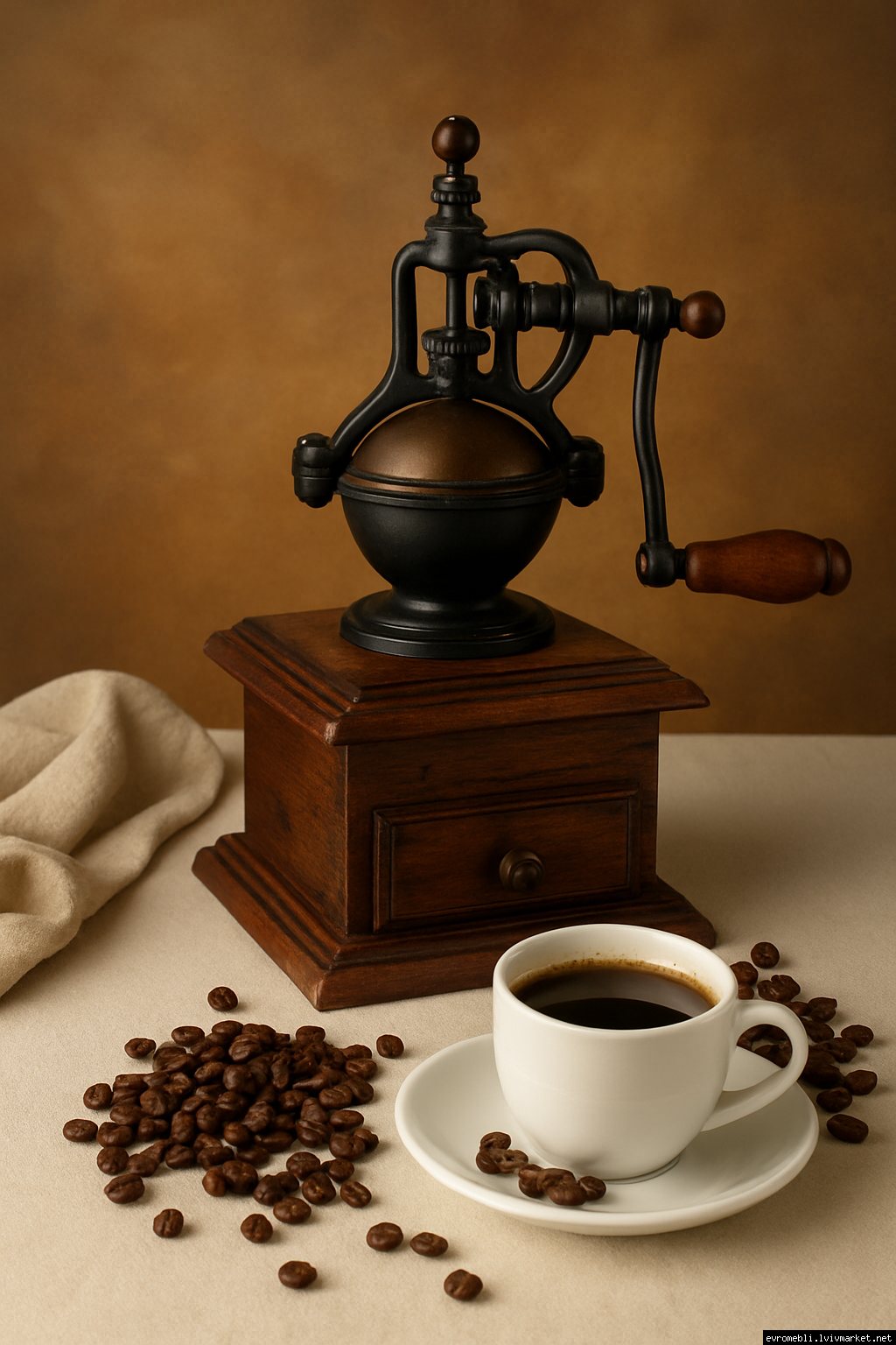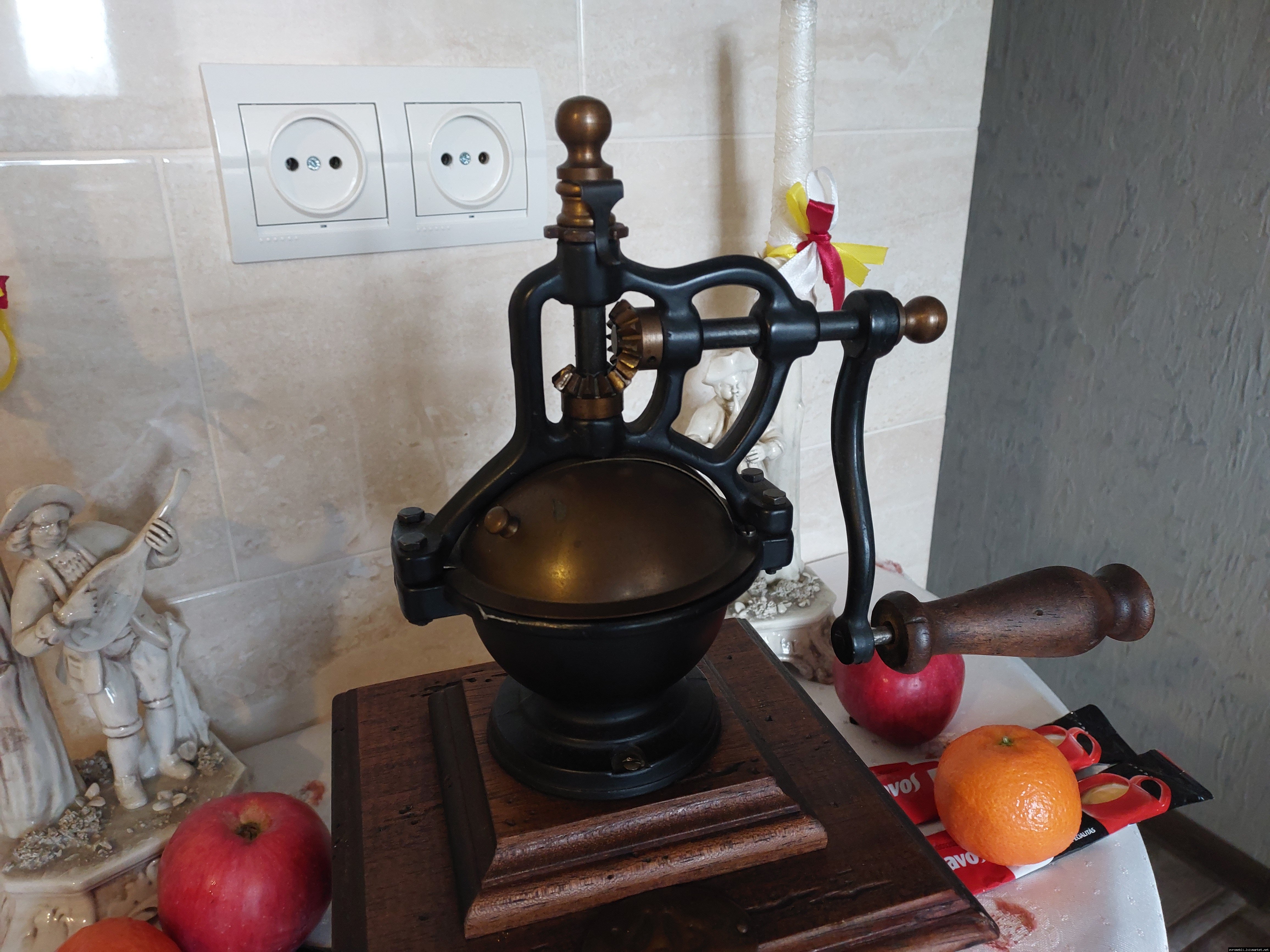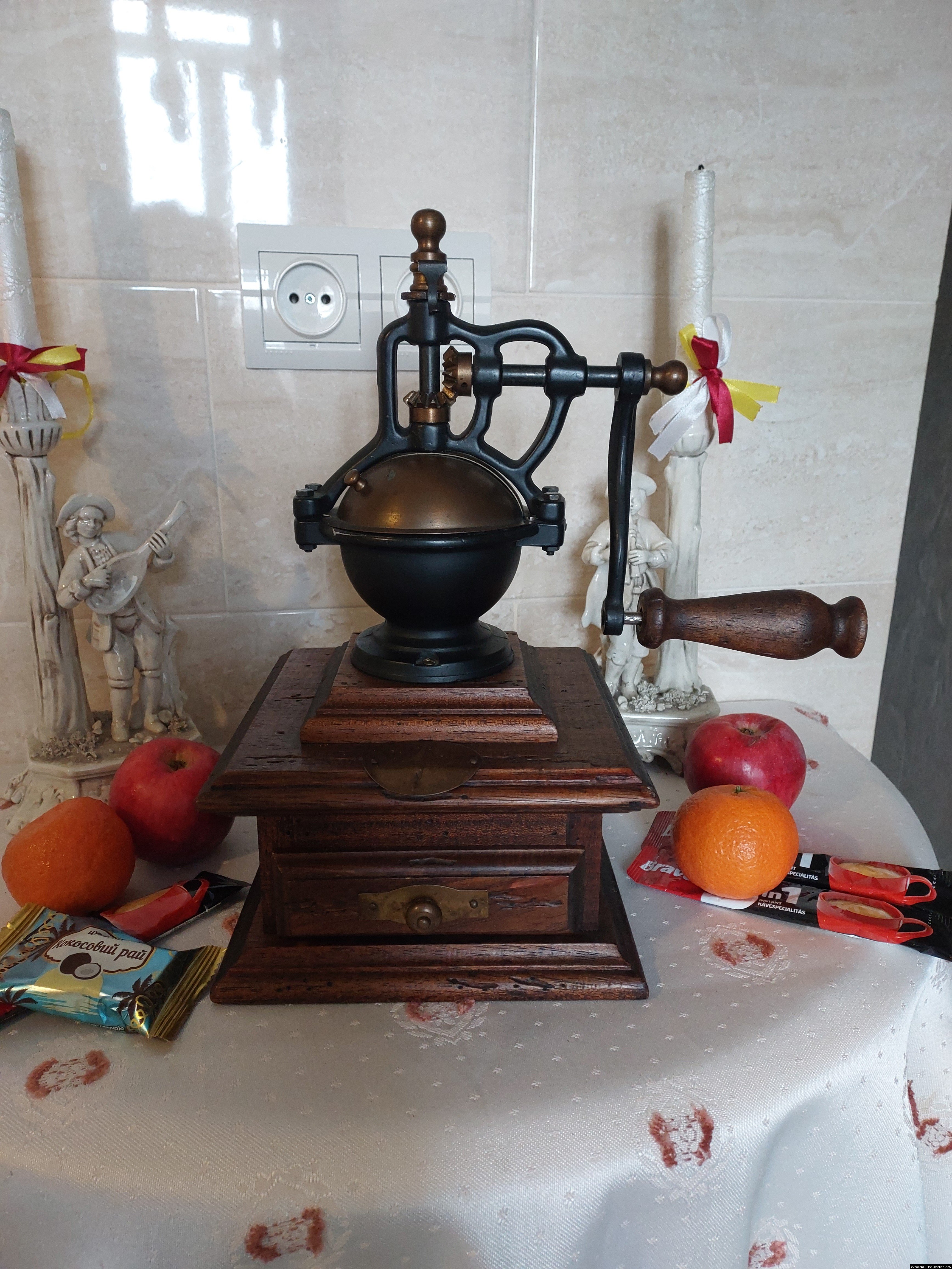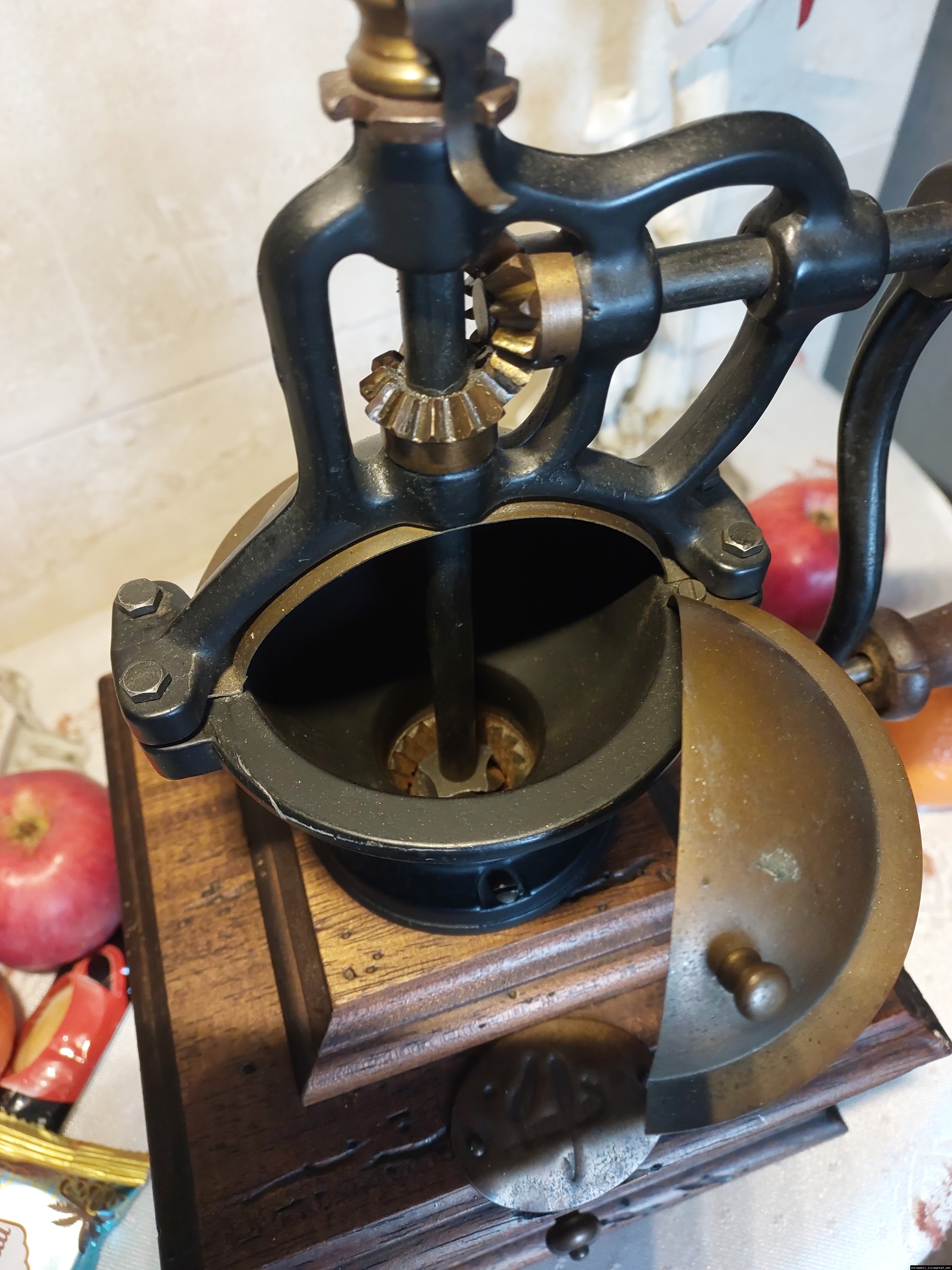 Дуже красива ручна кавомолка виготовлена з дерева та металу. Прекрасне поєднання натурального дерева та латуні дозволять вписати кавомолку в інтер'єр будь-якої кухні. Особливо добре буде виглядати в кухнях в стилі кантрі. Механізм виготовлений з металу- латунь. Кавомолка в хорошому робочому стані, з регулюванням рівня помолу, без пошкоджень, стане яскравим елементом в декорі, а справжні поціновувачі кави можуть використовувати її за призначенням.