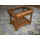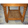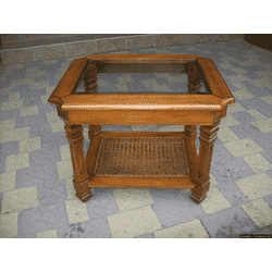 Деревяний журнальний стіл в класичному стилі. Стіл на чотирьох точених ніжках, виготовлений з натурального дерева, темно-золотистий дуб, масив, столешня прямокутної форми зі зрізаними кутиками, виложена склом з фацетом, є додаткова поличка з плетеного ротангу. Стіл маленький, розбірний, простий і водночас вишуканий та елегантний, в хорошому стані, привезений з Бельгії.