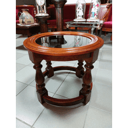 Стіл журнальний, деревяний, на чотирьох ніжках, виготовлений з масиву натурального дерева, дуб, столешня столика круглої форми, зі склом. Стіл маленький, повністю масивний, в хорошому стані, без видимих дефектів чи пошкоджень, привезений з Бельгії.
