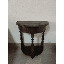 Деревяний столик - консоль в класичному стилі. Столик виготовлений з натурального дерева, темний дуб, масив, на трьох точених ніжках, внизу є маленька поличка. Столик в хорошому стані, без видимих пошкоджень чи дефектів, привезений з Бельгії.