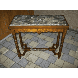 Маленький, компактний, красивий туалетний столик (консоль). Столик на чотирьох точених ніжках, виготовлений з натурального дерева, темний дуб, масив, декорований елементами різьби, стільниця виложена натуральним каменем- мармур сірого та графітового кольорів. Столик зручний в користуванні, в хорошому збереженому стані, привезений з Бельгії.