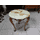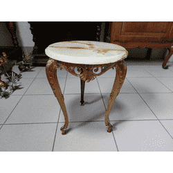 Столик-підставка на металевій основі, столешня круглої форми. Столешня столика виготовлена з натурального каменю-онікс білого та коричневого кольорів, основа (каркас) підставки на трьох ніжках, виготовлена з латуні та декорована латунним литтям. Столик в хорошому стані, привезений з Бельгії.