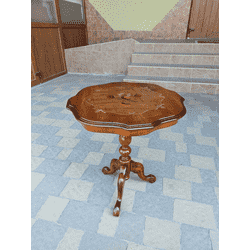 Красивий журнальний столик, деревяний, на одній ніжці, виготовлений з натурального дерева, декорований елементами різьби, столешня кругло- фігурної форми декорована інкрустаціїю з кореня горіха. Столик маленький, делікатний, зручний та компактний, в хорошому стані, привезений з Бельгії.