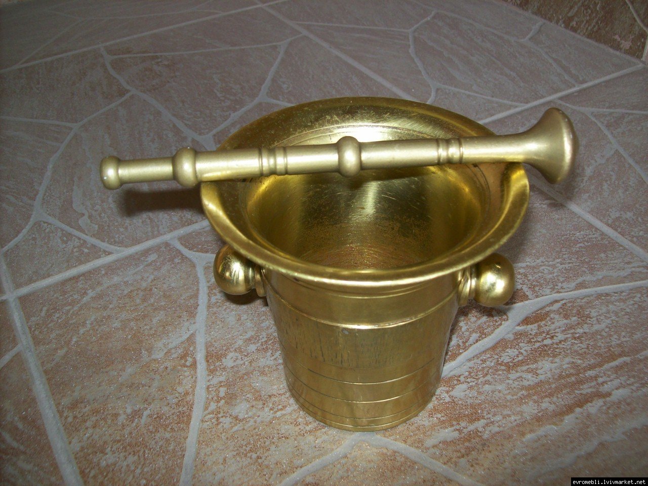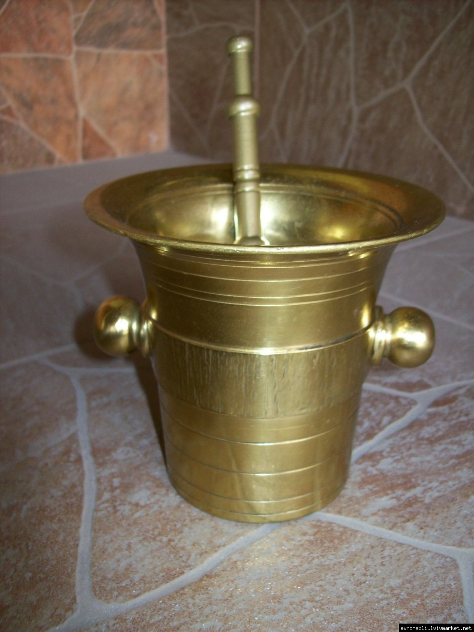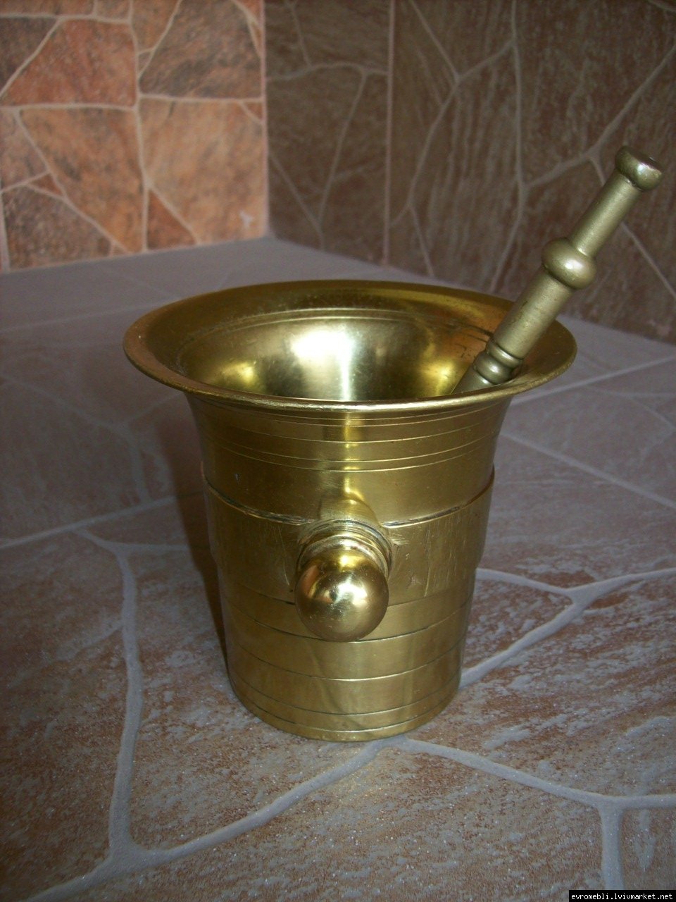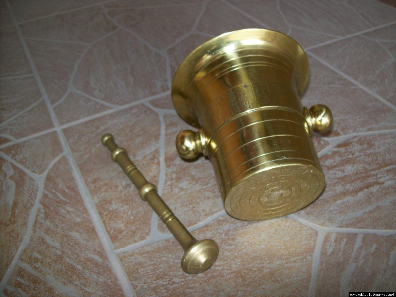 Старовинна ступка з товкачем, виготовлена з латуні. Дуже корисна в господарстві річ-ступка з товкачем, важка, красива та функціональна. Для тих, хто любить готувати блюда зі спеціями, така ступка - річ просто незамінна! Аромат свіжо змелених спецій - гарантія шикарного блюда! Ступка в хорошому стані, привезена з Бельгії.