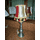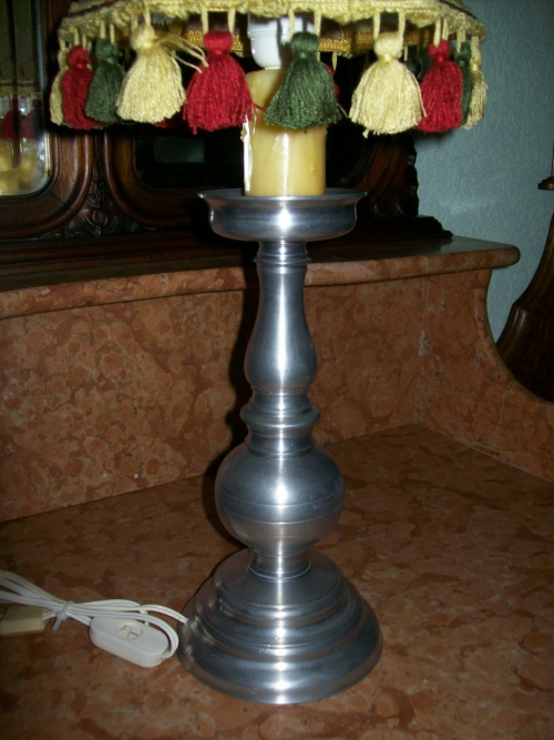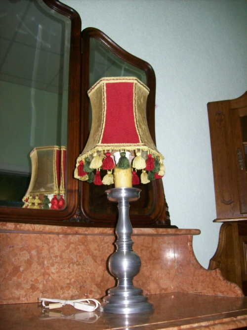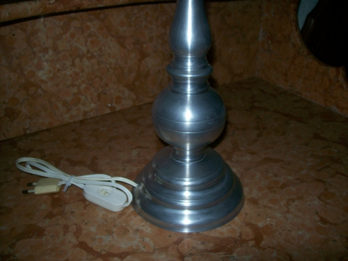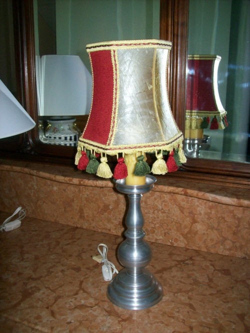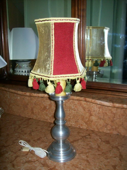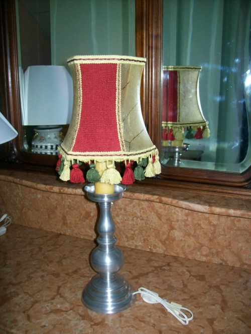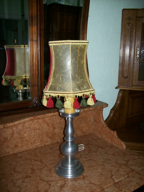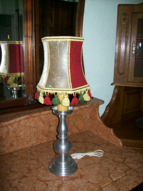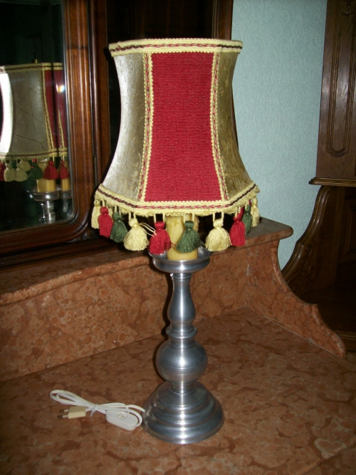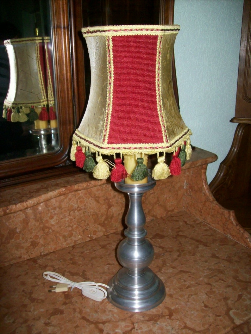 Торшер настільний, ніжка торшера виготовлена з металу сріблястого кольору, абажур виготовлений зі шкіри та тканини, декорований мереживом і тасьмою. Торшер в хорошому стані, привезений з Бельгії.