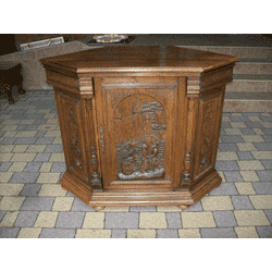 Дуже красива, старовинна кутова тумба в стилі Генрі. Тумба деревяна, виготовлена з масиву натурального дерева, темно-золотистий дуб, масив, має одну дверку, всередині є деревяна полиця. Тумба щедро декорована різьбою, повністю масивна, в хорошому стані, привезена з Бельгії.