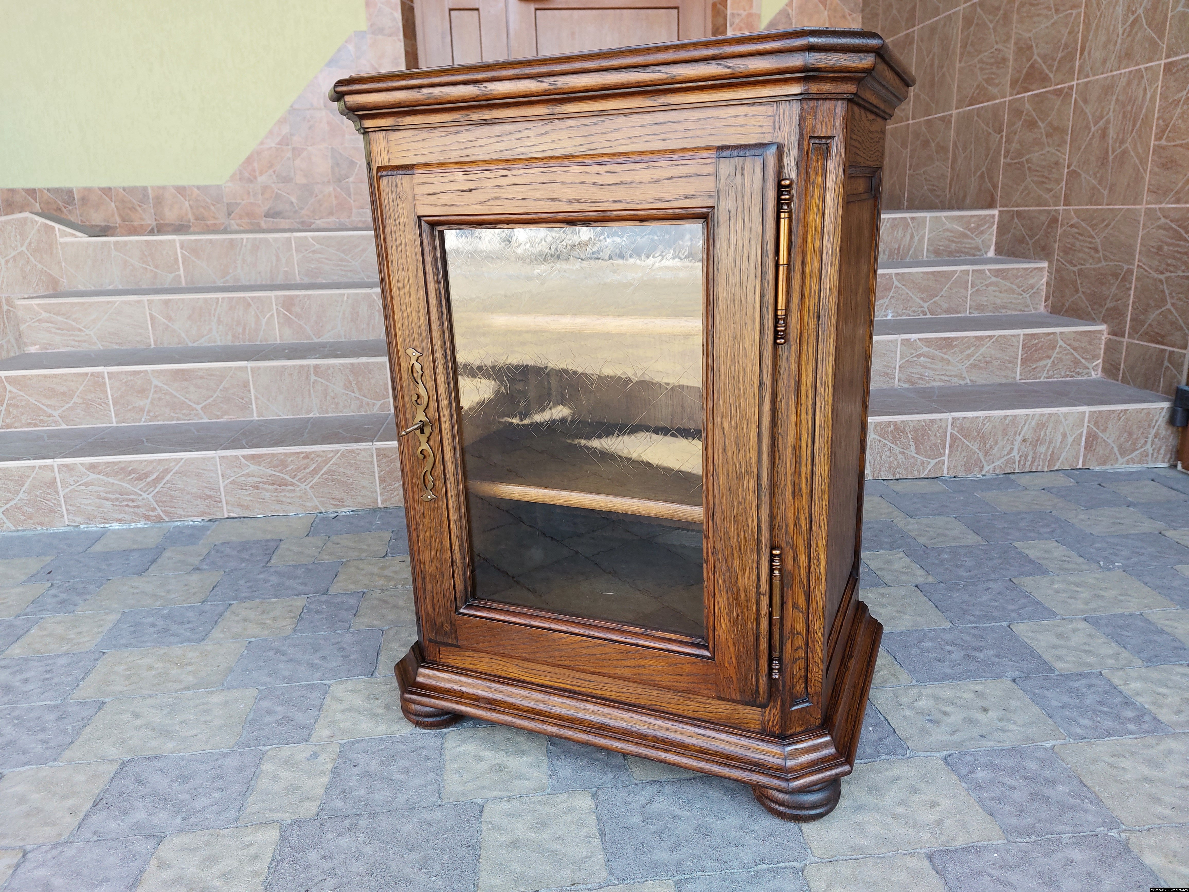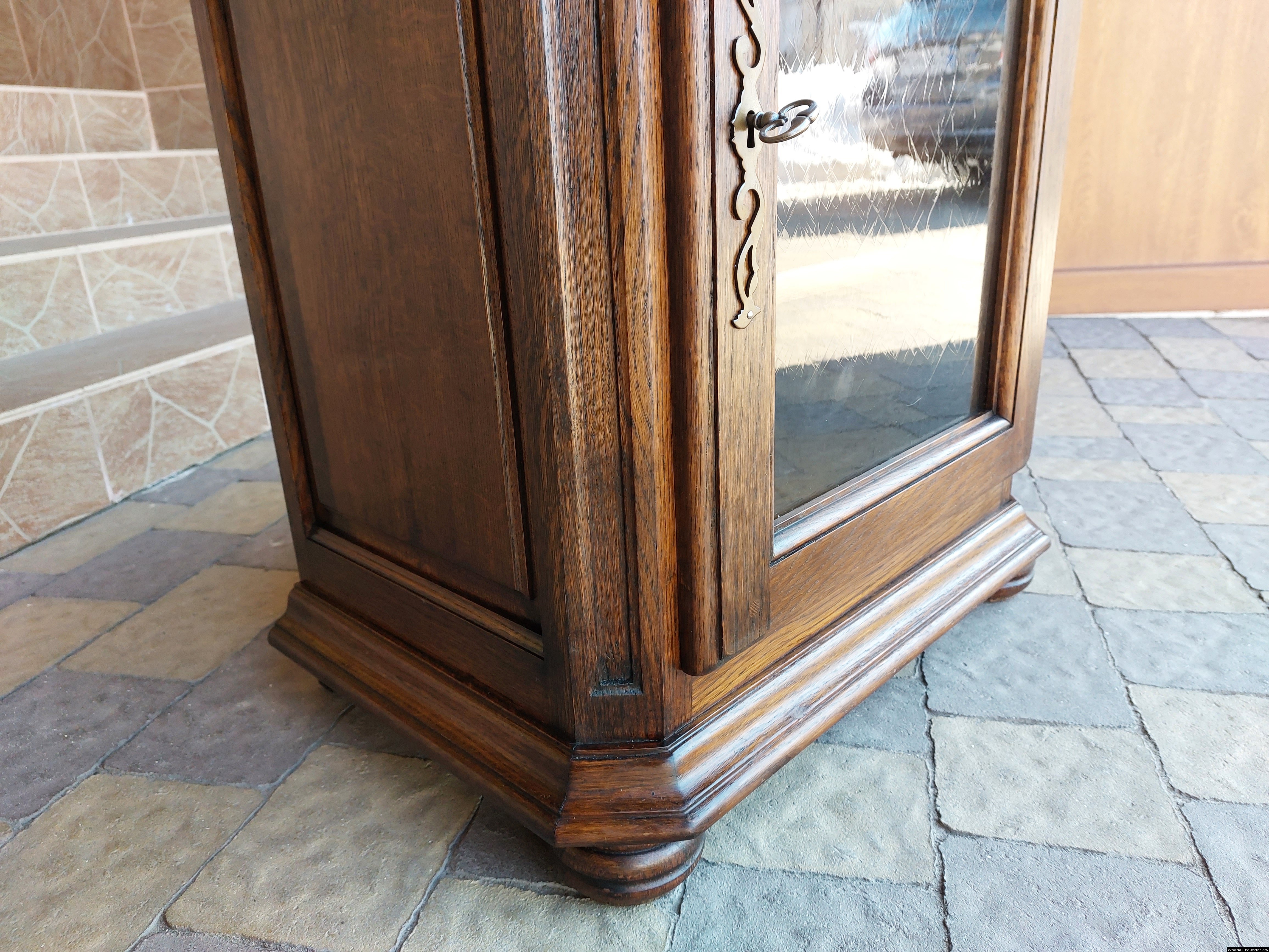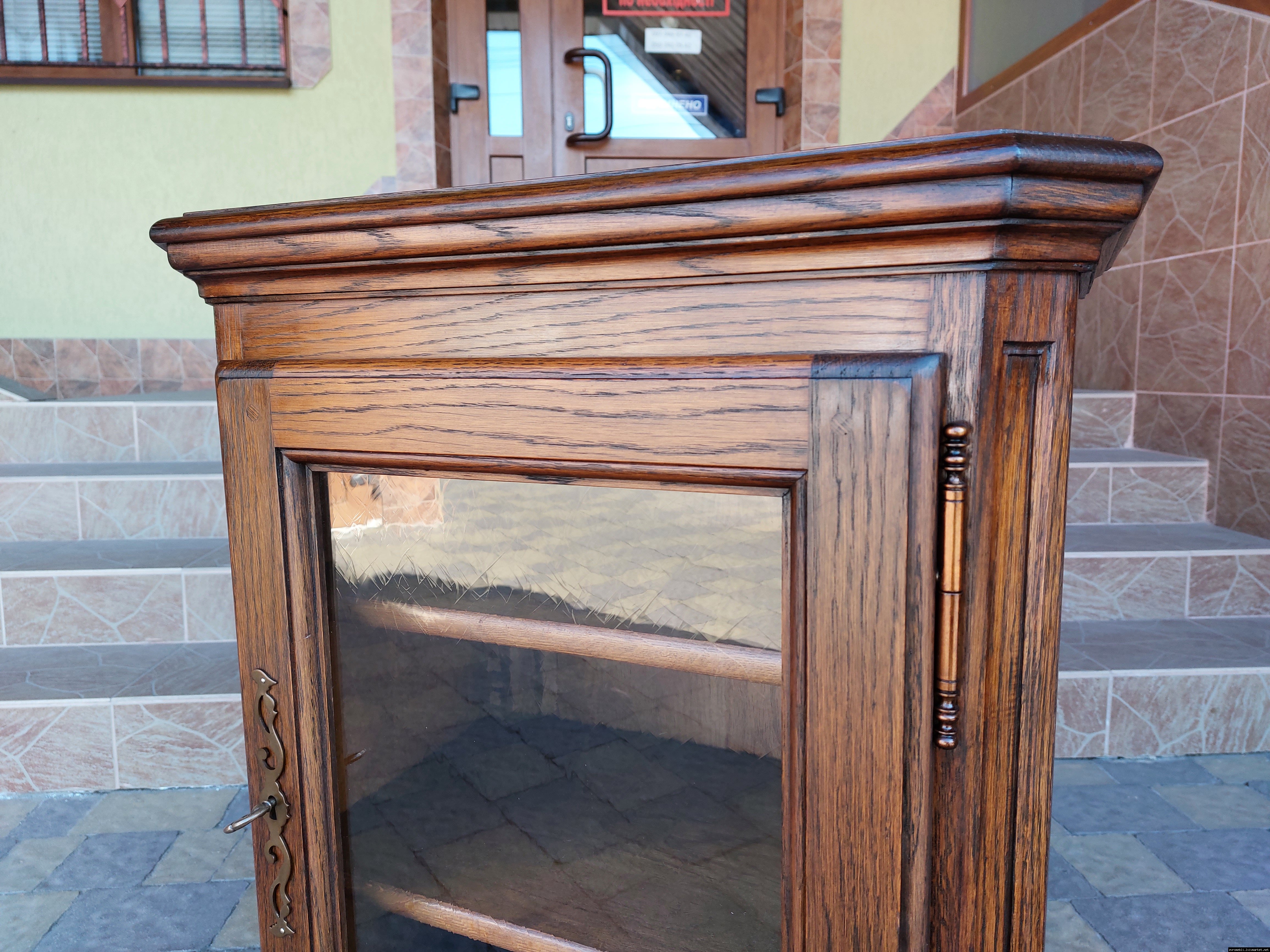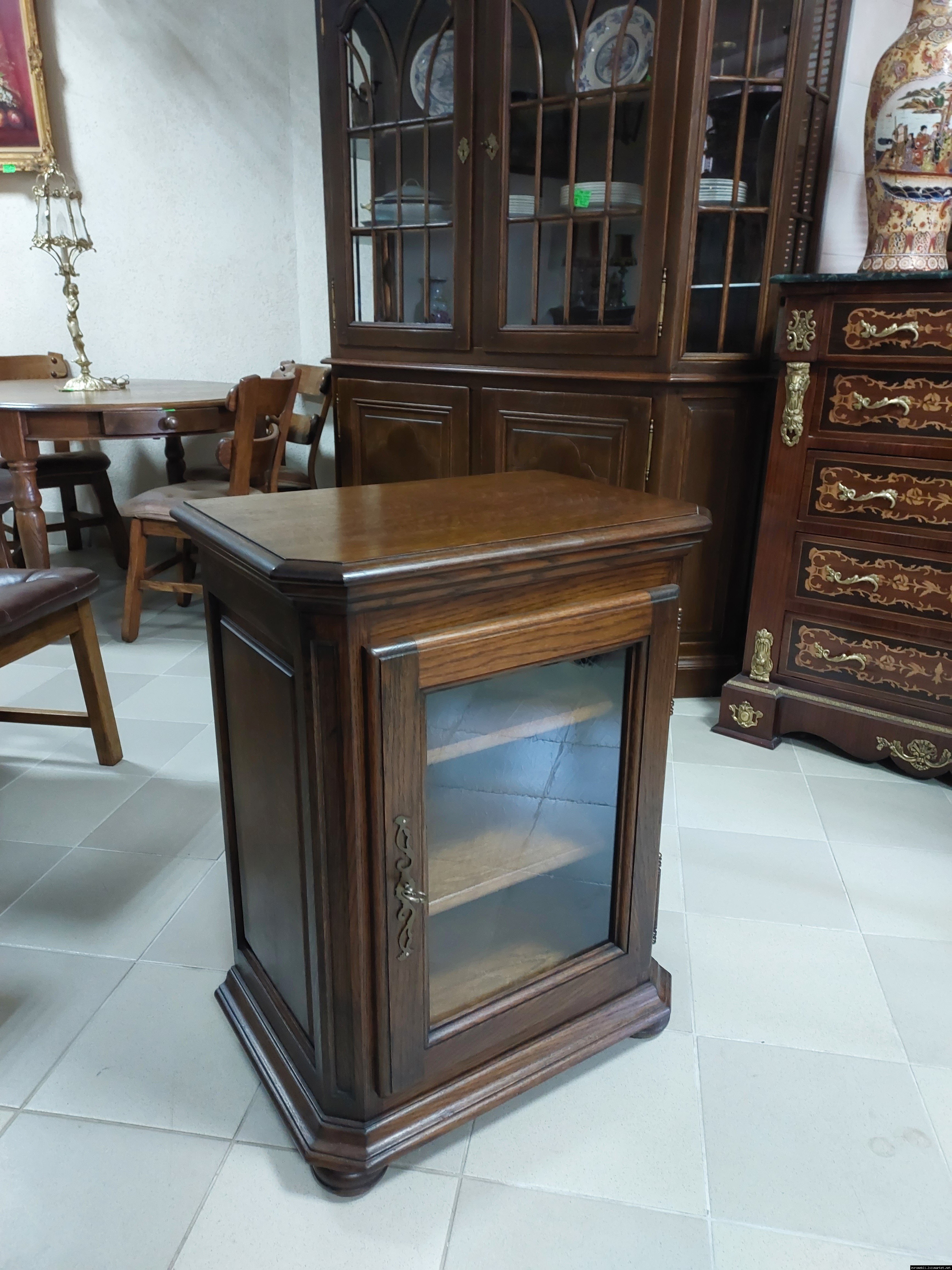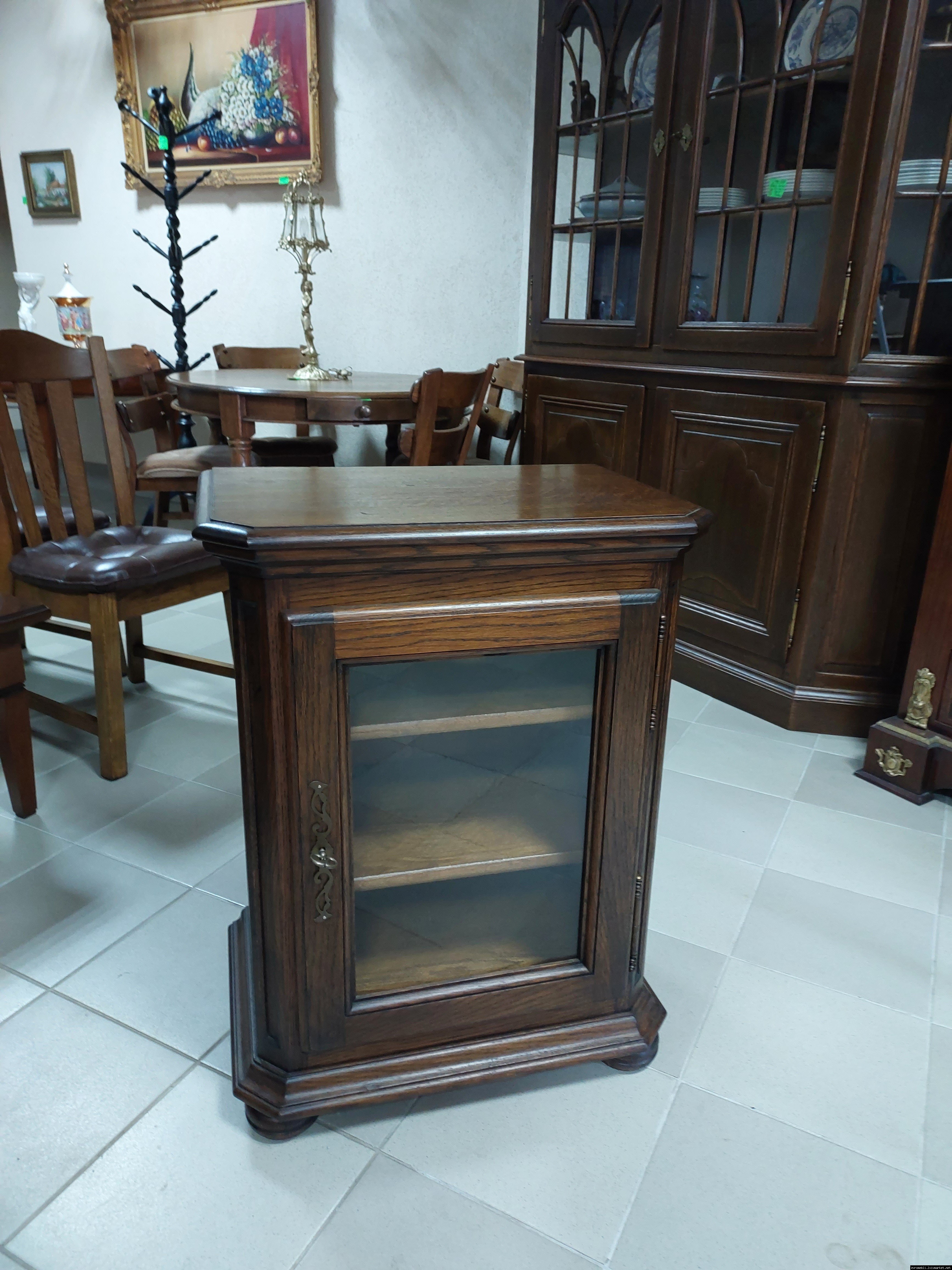 Дуже красива деревяна тумба в класичному стилі. Тумба виготовлена з натурального дерева, темний дуб, масив, має одну дверку зі склом, дверка зачиняється на ключ, всередині є деревяні полиці, висота полиць регулююється. Тумба в хорошому стані, проста та вишукана, повністю масивна, привезена з Бельгії.