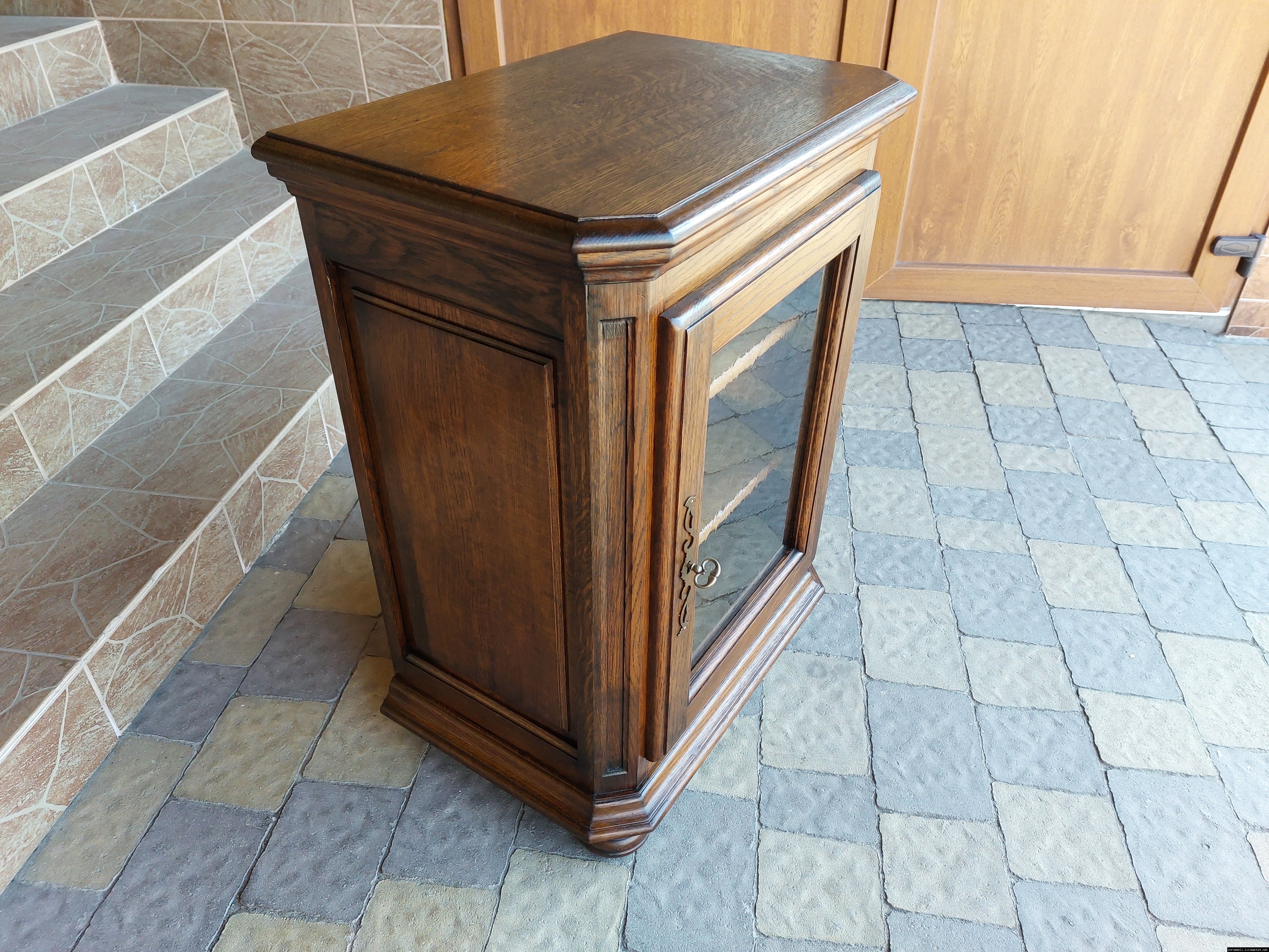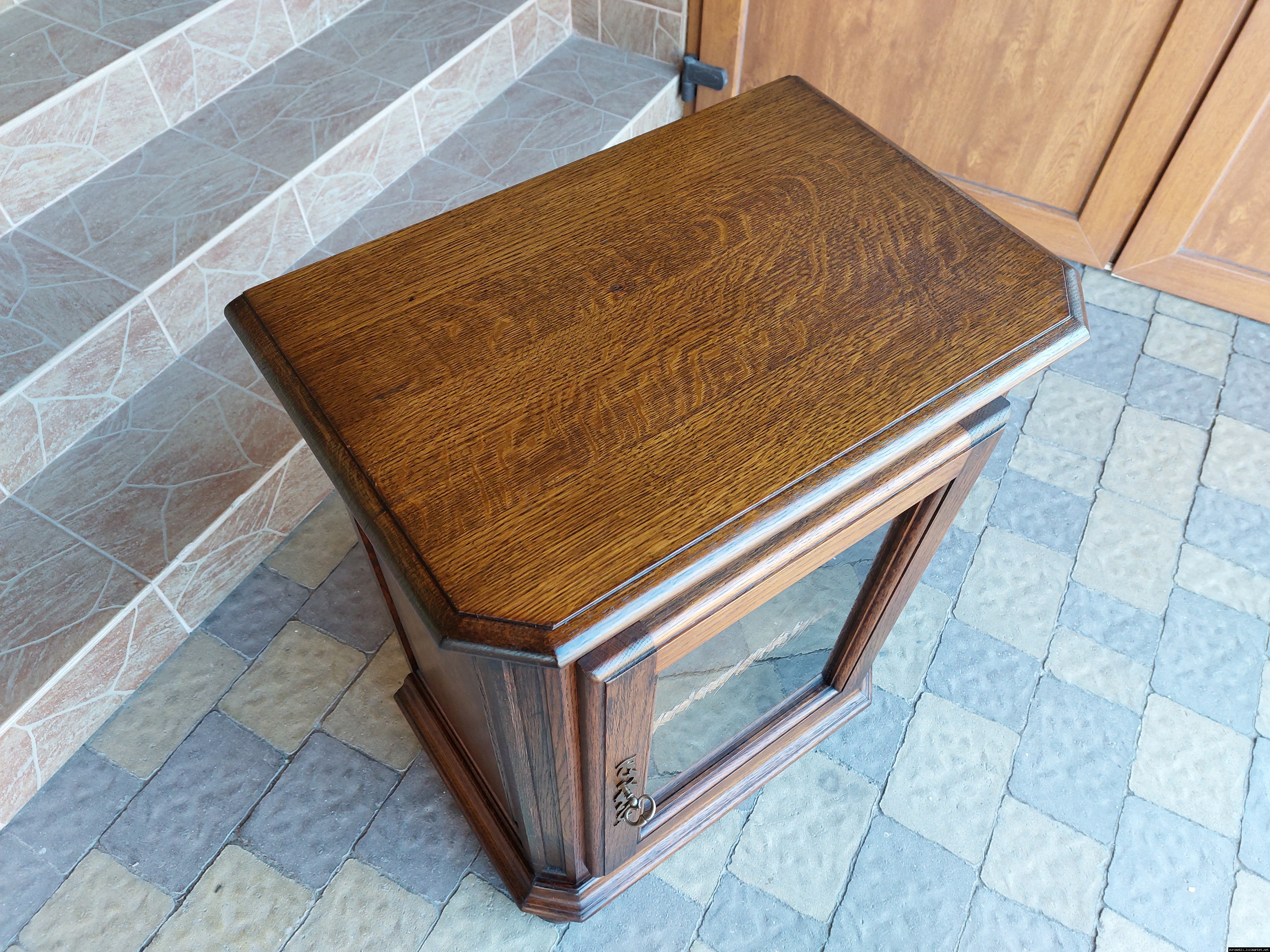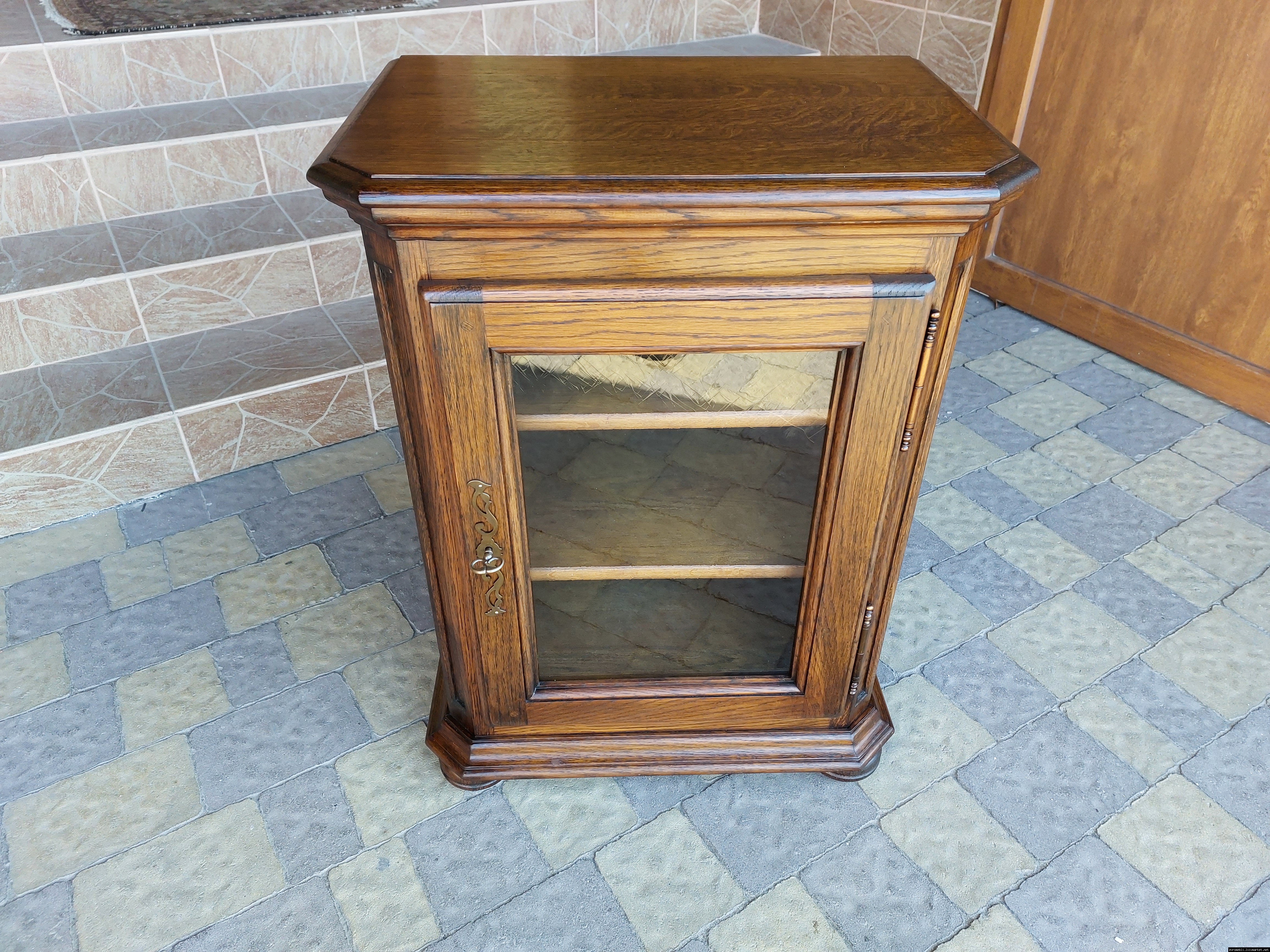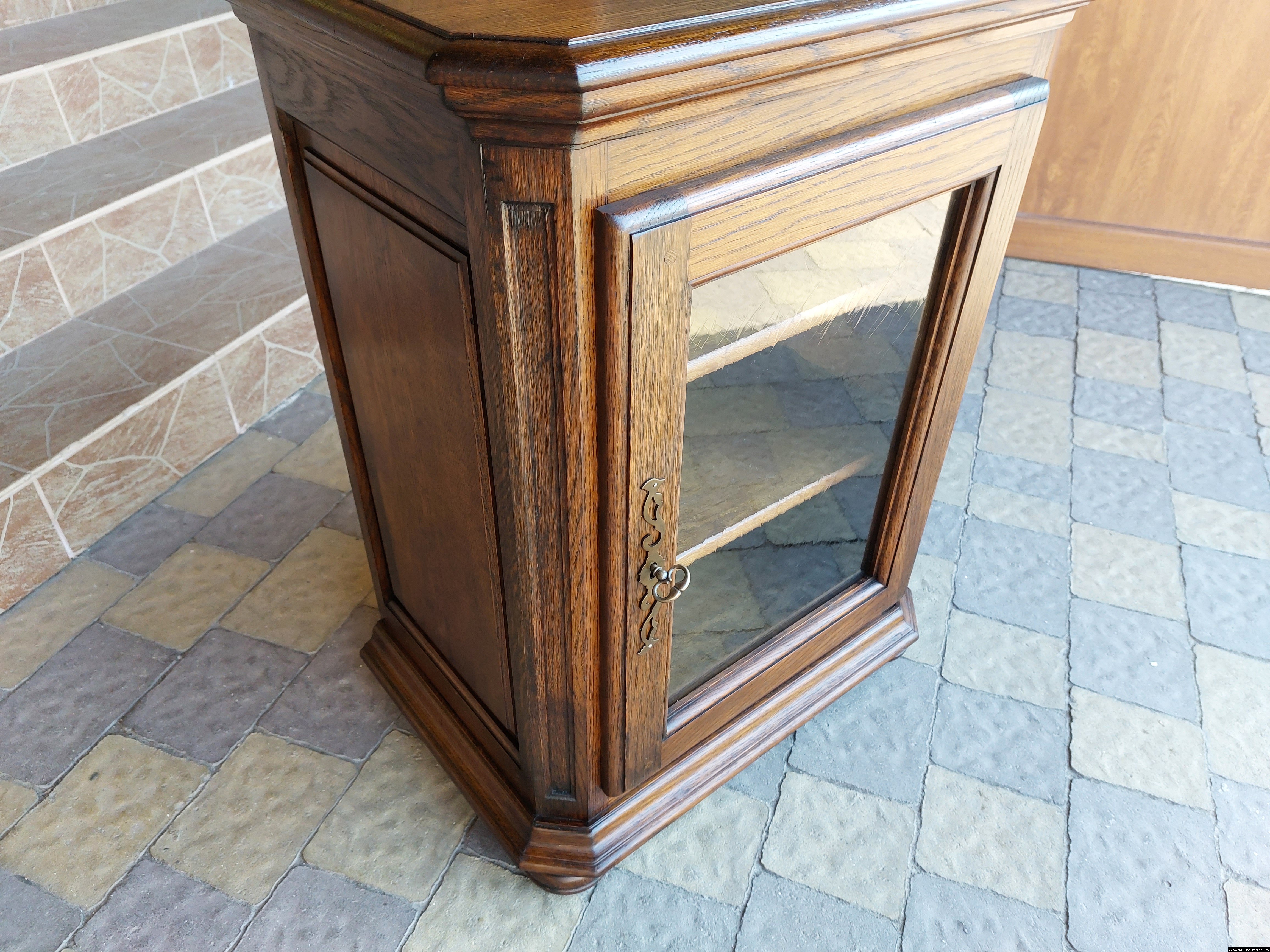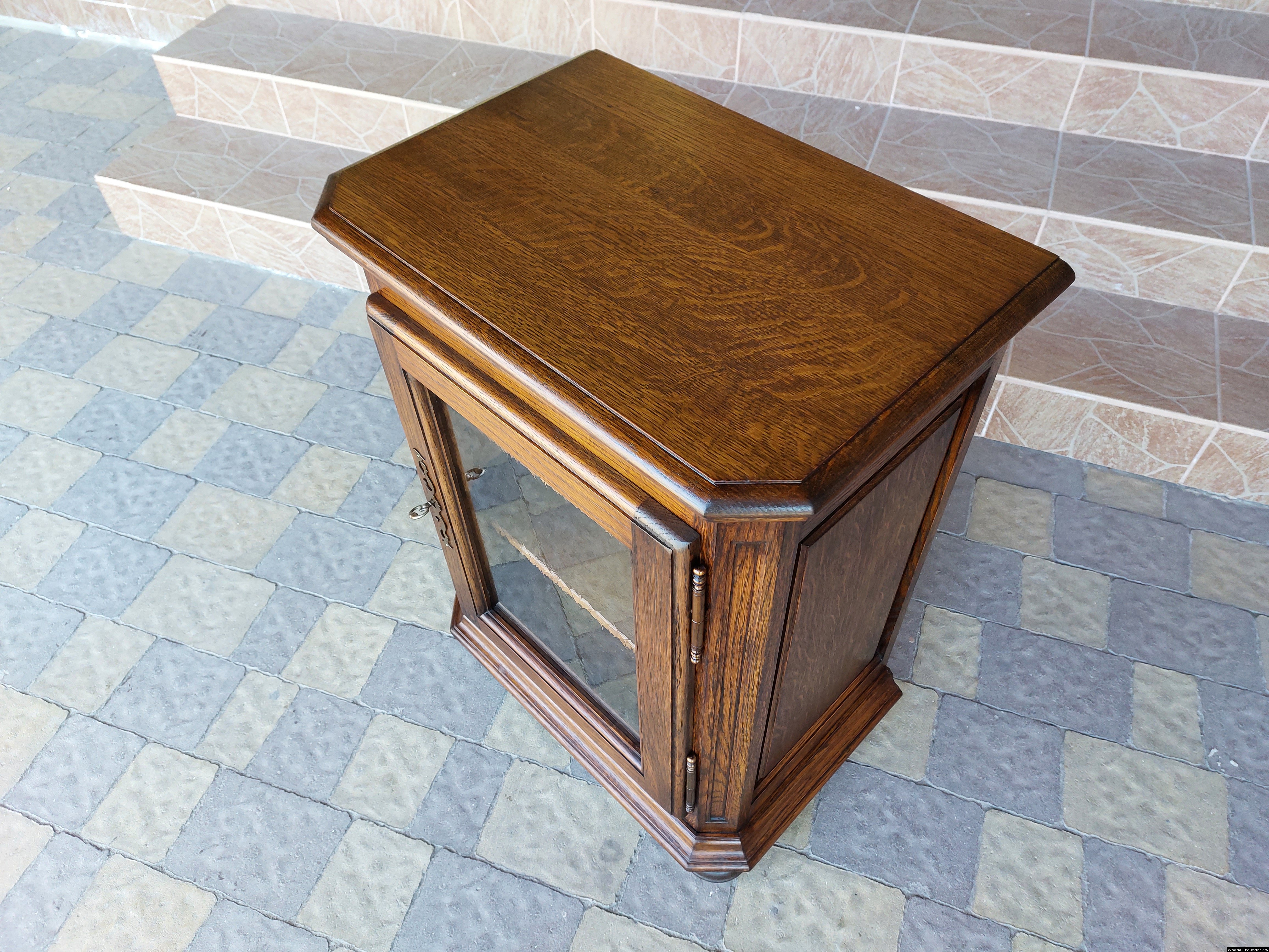 Дуже красива деревяна тумба в класичному стилі. Тумба виготовлена з натурального дерева, темний дуб, масив, має одну дверку зі склом, дверка зачиняється на ключ, всередині є деревяні полиці, висота полиць регулююється. Тумба в хорошому стані, проста та вишукана, повністю масивна, привезена з Бельгії.