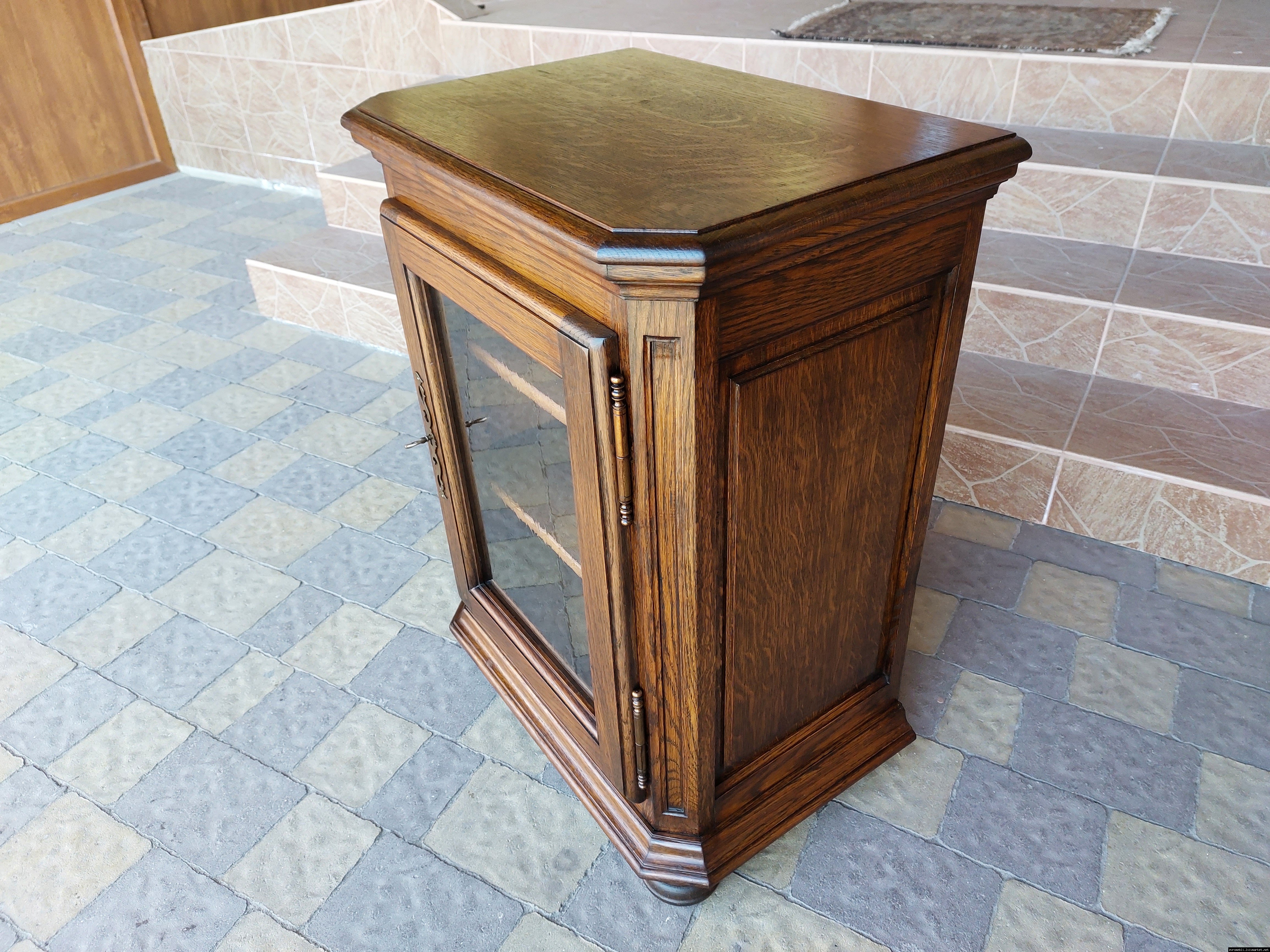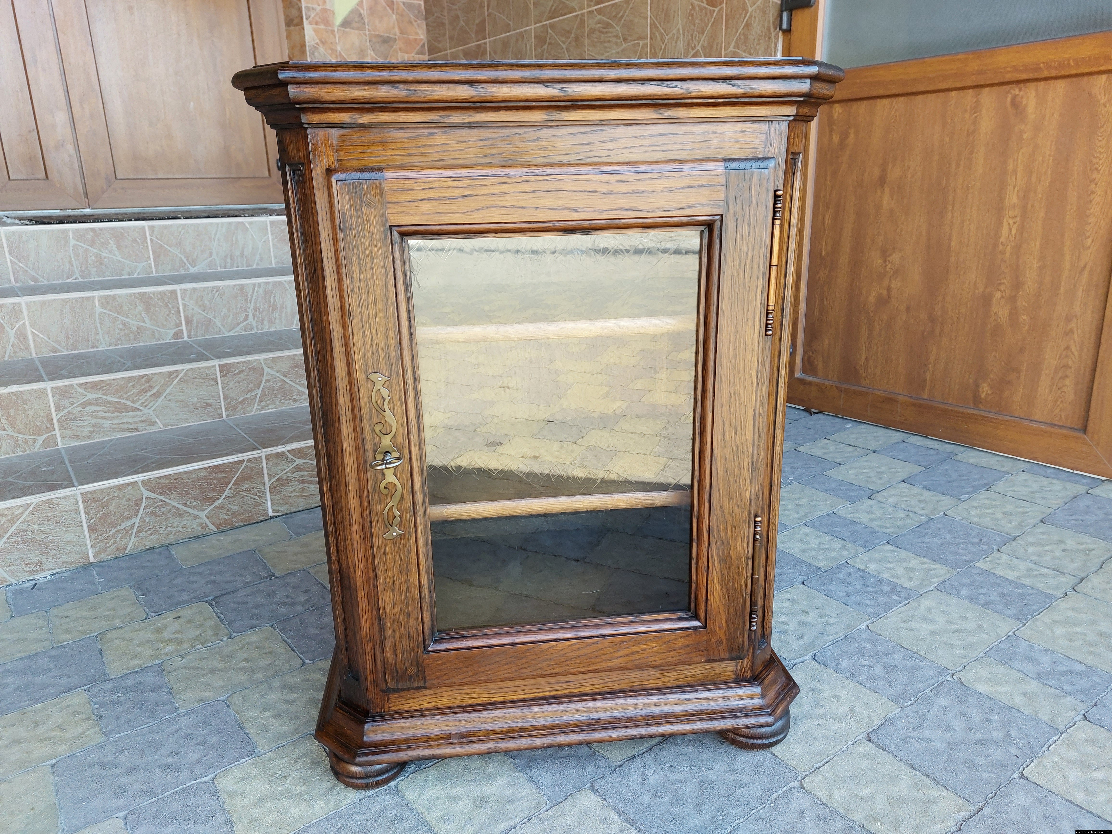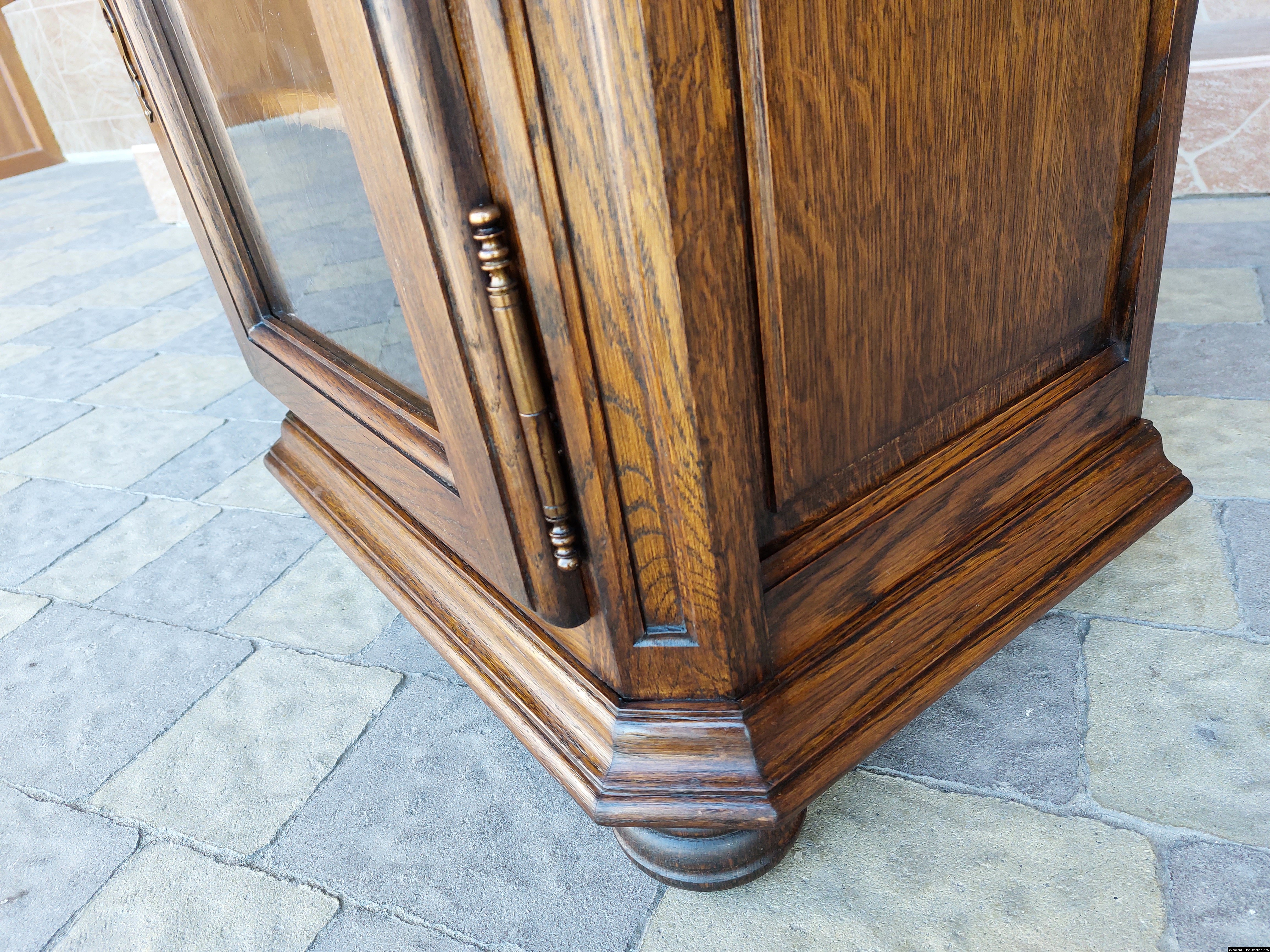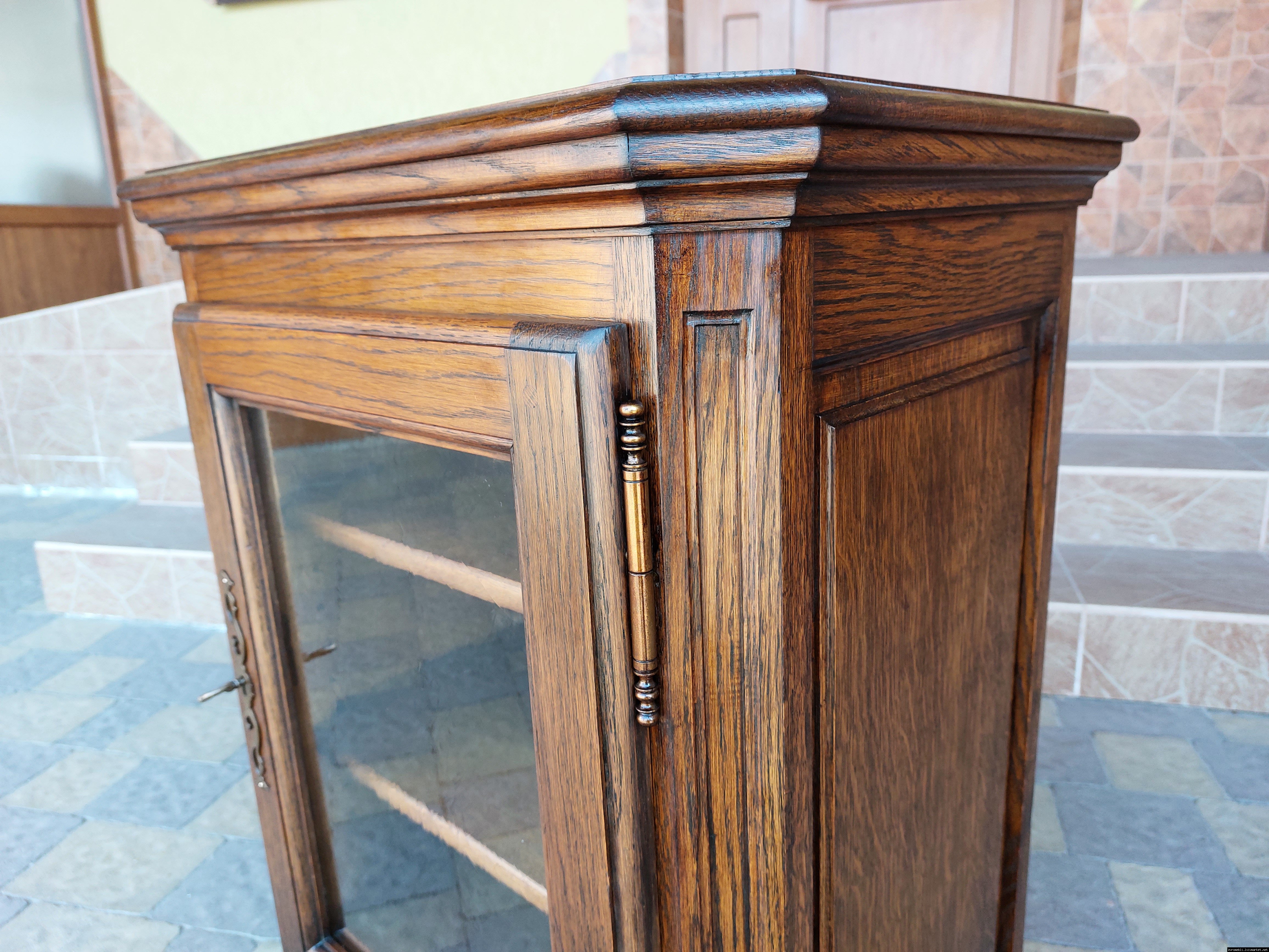 Дуже красива деревяна тумба в класичному стилі. Тумба виготовлена з натурального дерева, темний дуб, масив, має одну дверку зі склом, дверка зачиняється на ключ, всередині є деревяні полиці, висота полиць регулююється. Тумба в хорошому стані, проста та вишукана, повністю масивна, привезена з Бельгії.