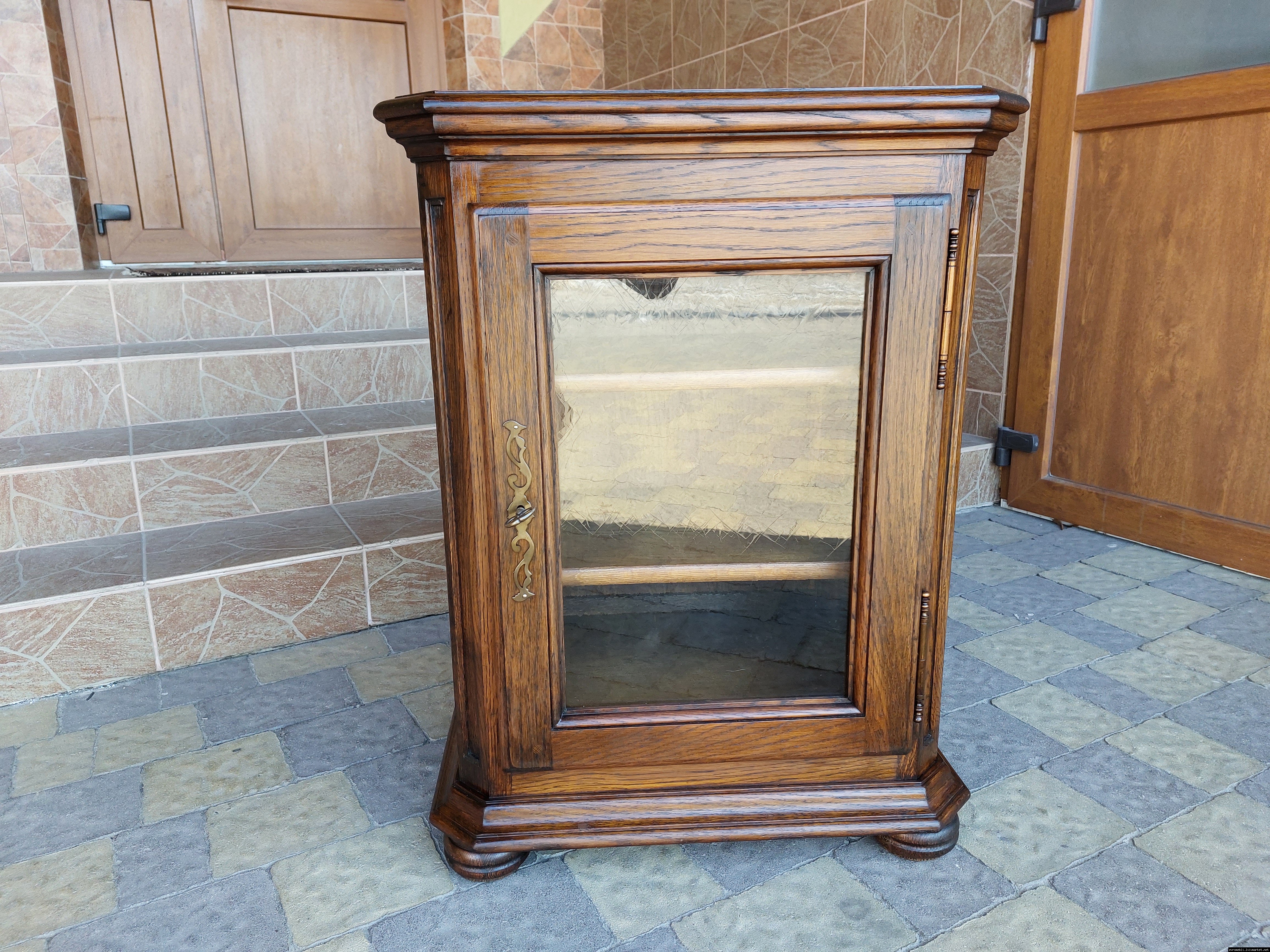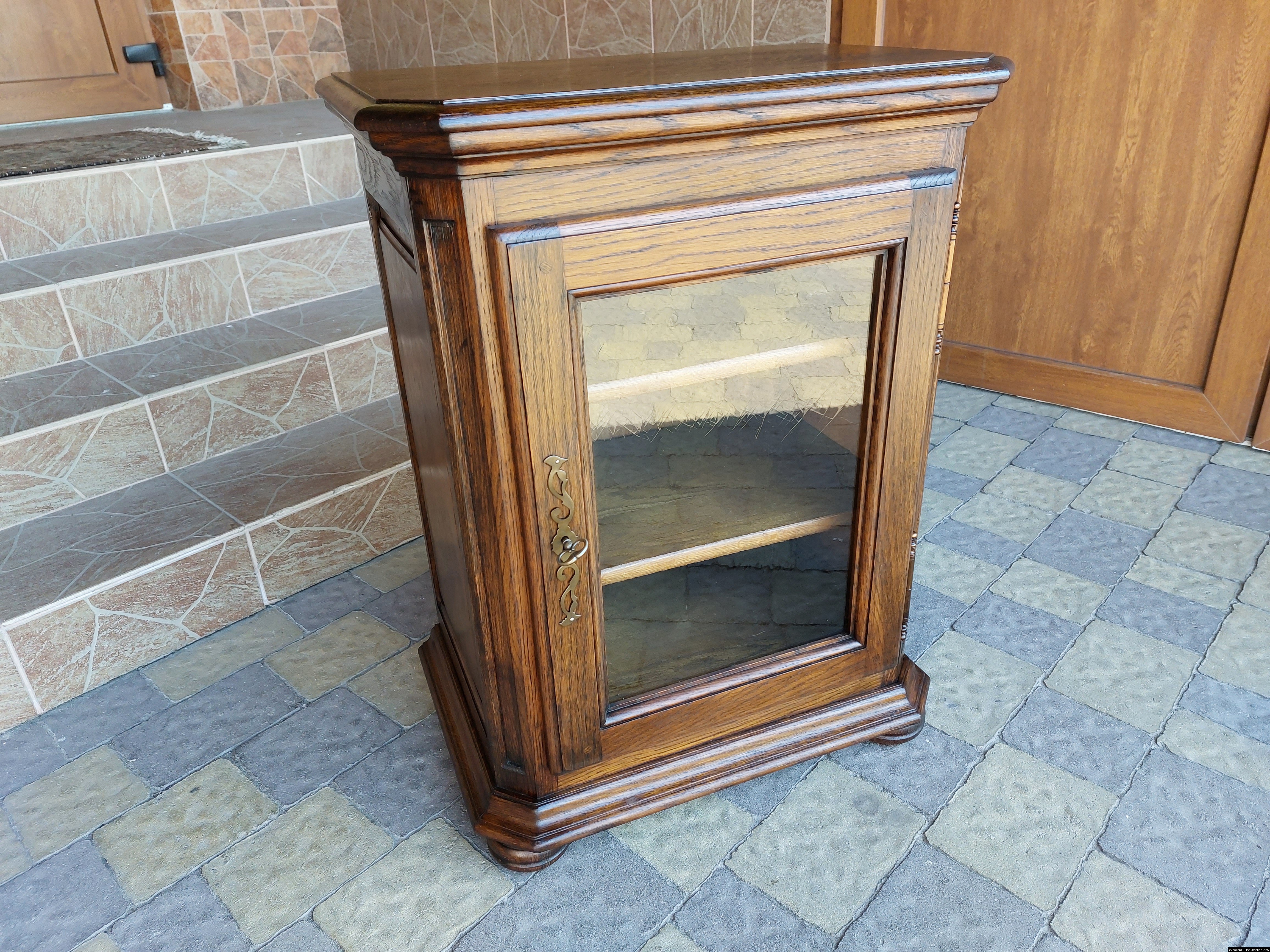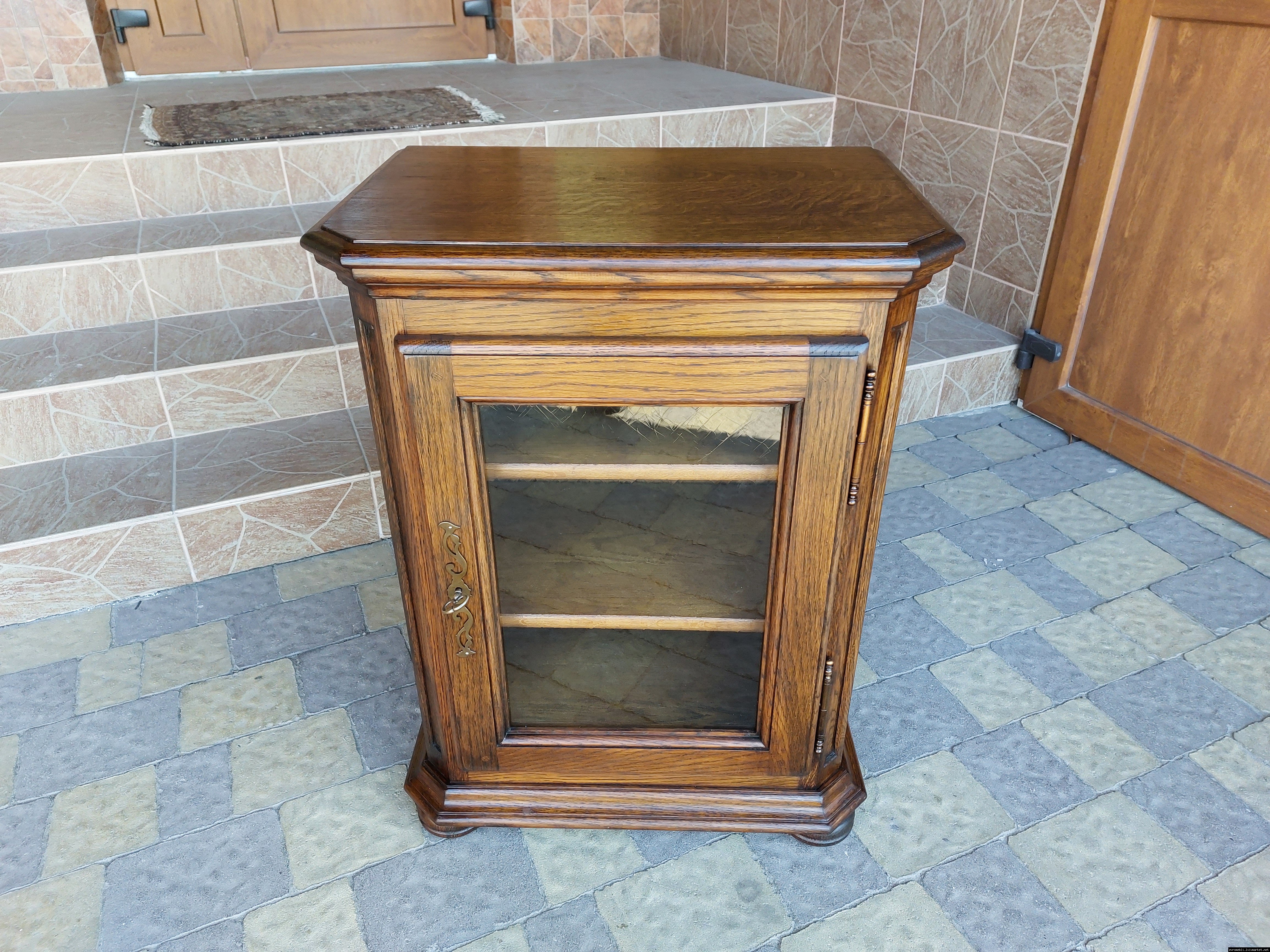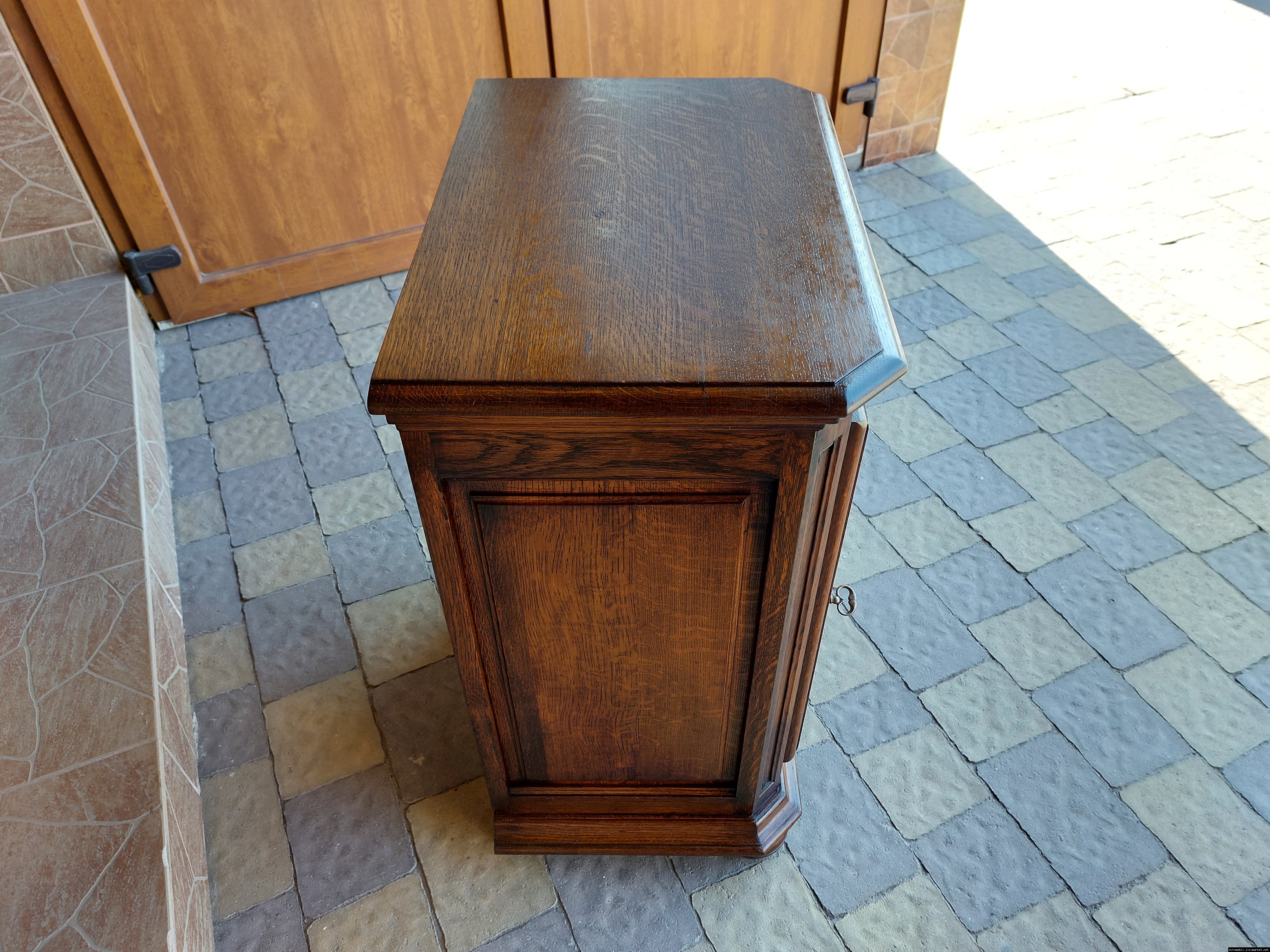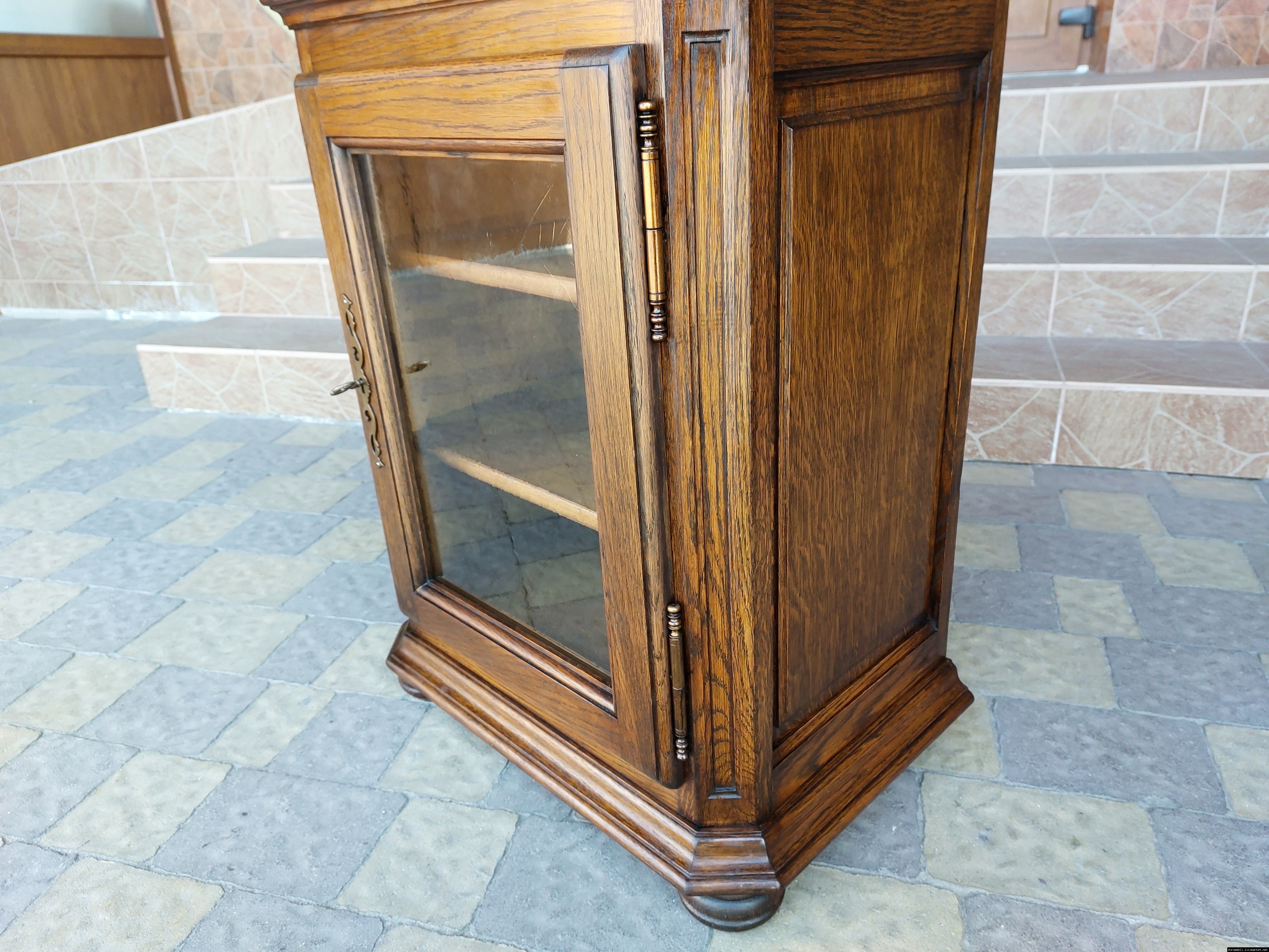 Дуже красива деревяна тумба в класичному стилі. Тумба виготовлена з натурального дерева, темний дуб, масив, має одну дверку зі склом, дверка зачиняється на ключ, всередині є деревяні полиці, висота полиць регулююється. Тумба в хорошому стані, проста та вишукана, повністю масивна, привезена з Бельгії.