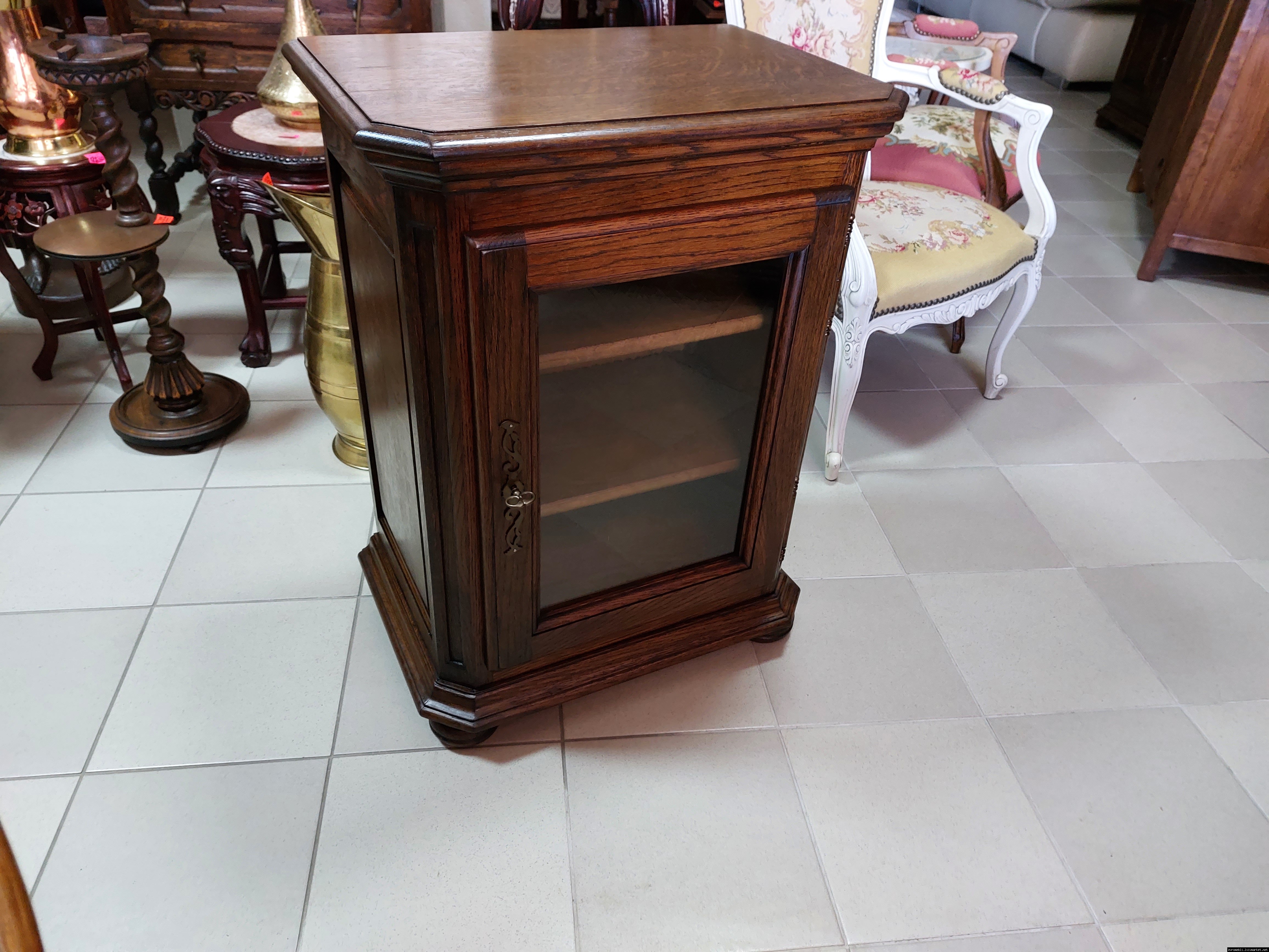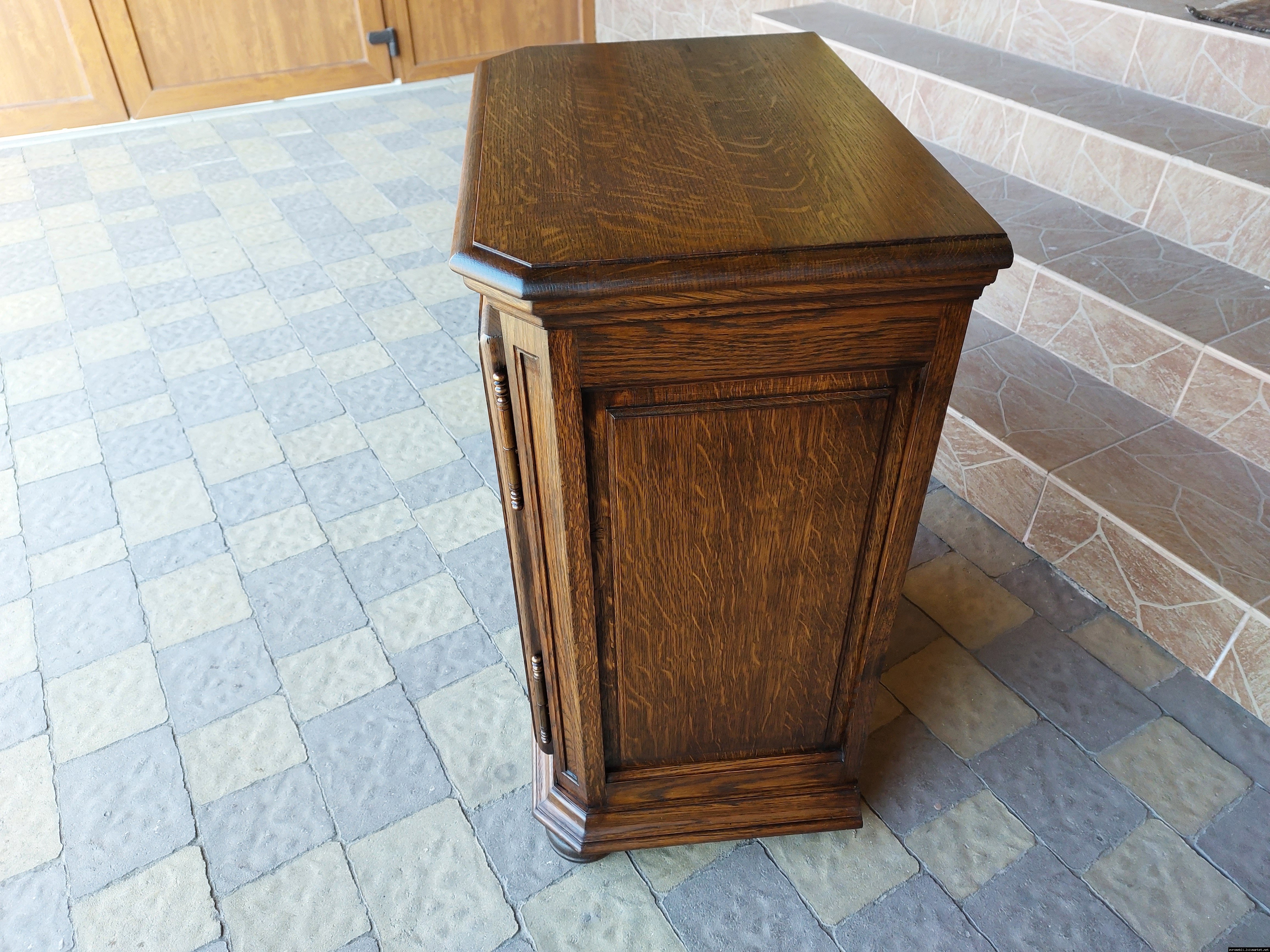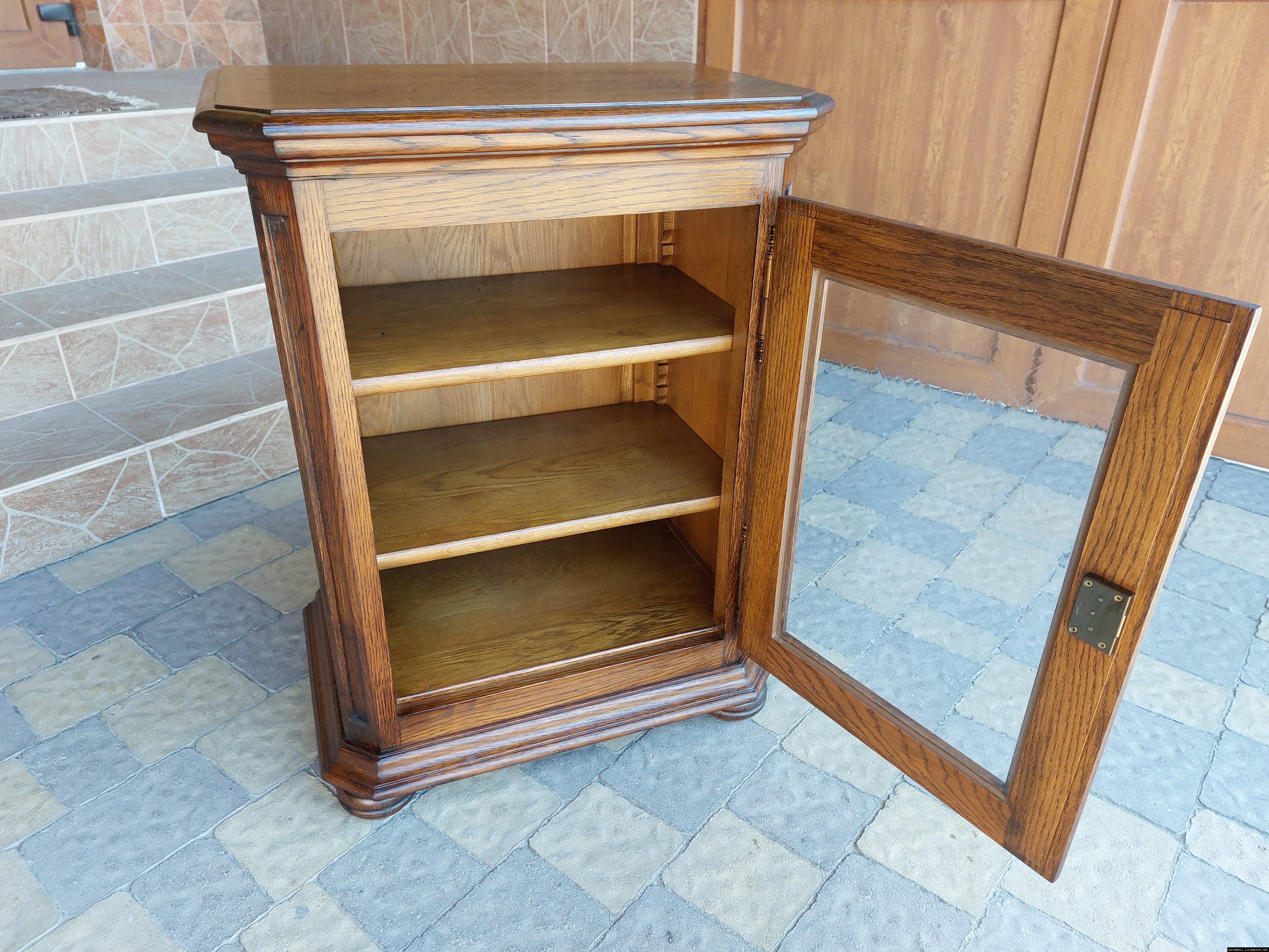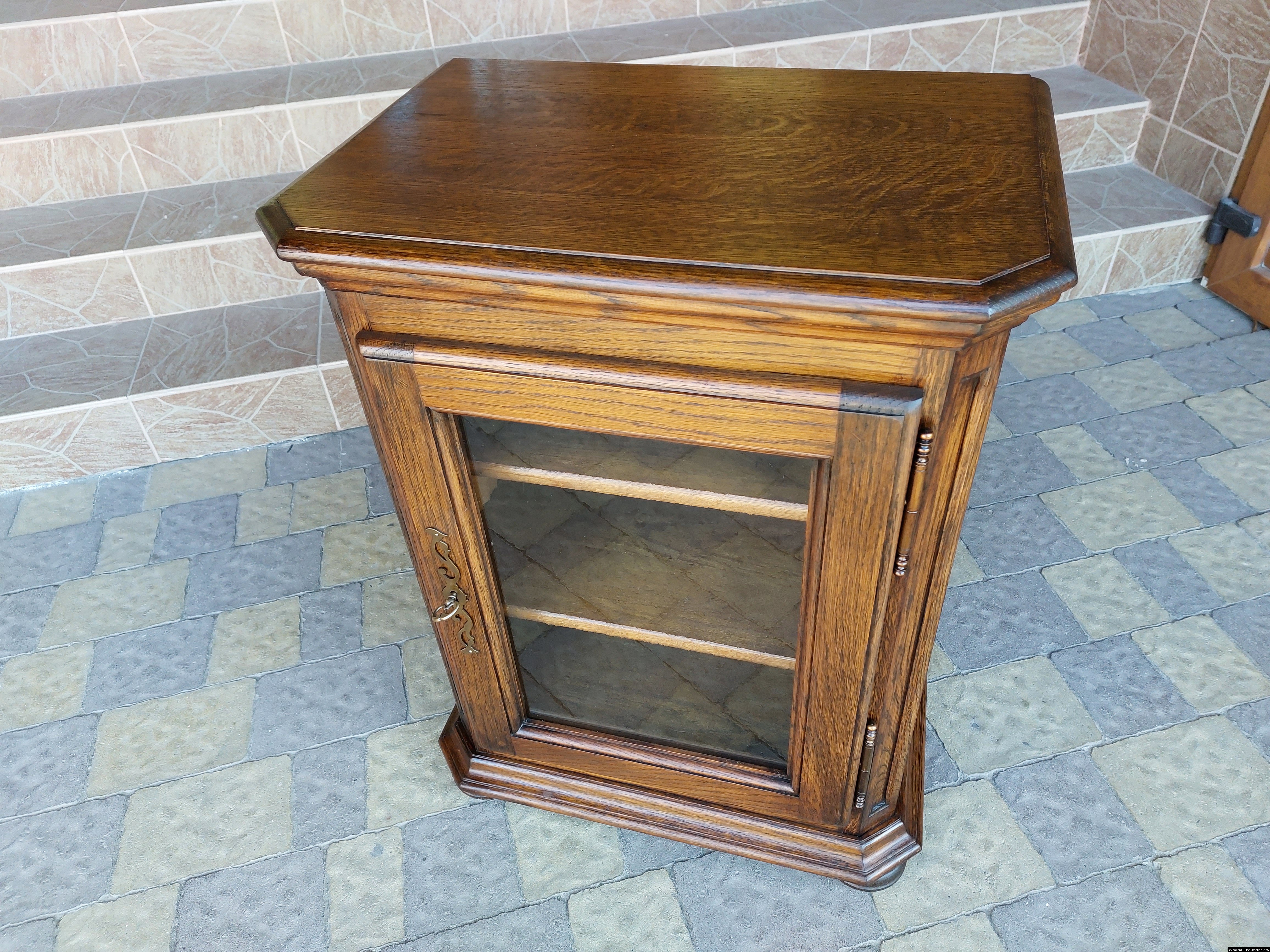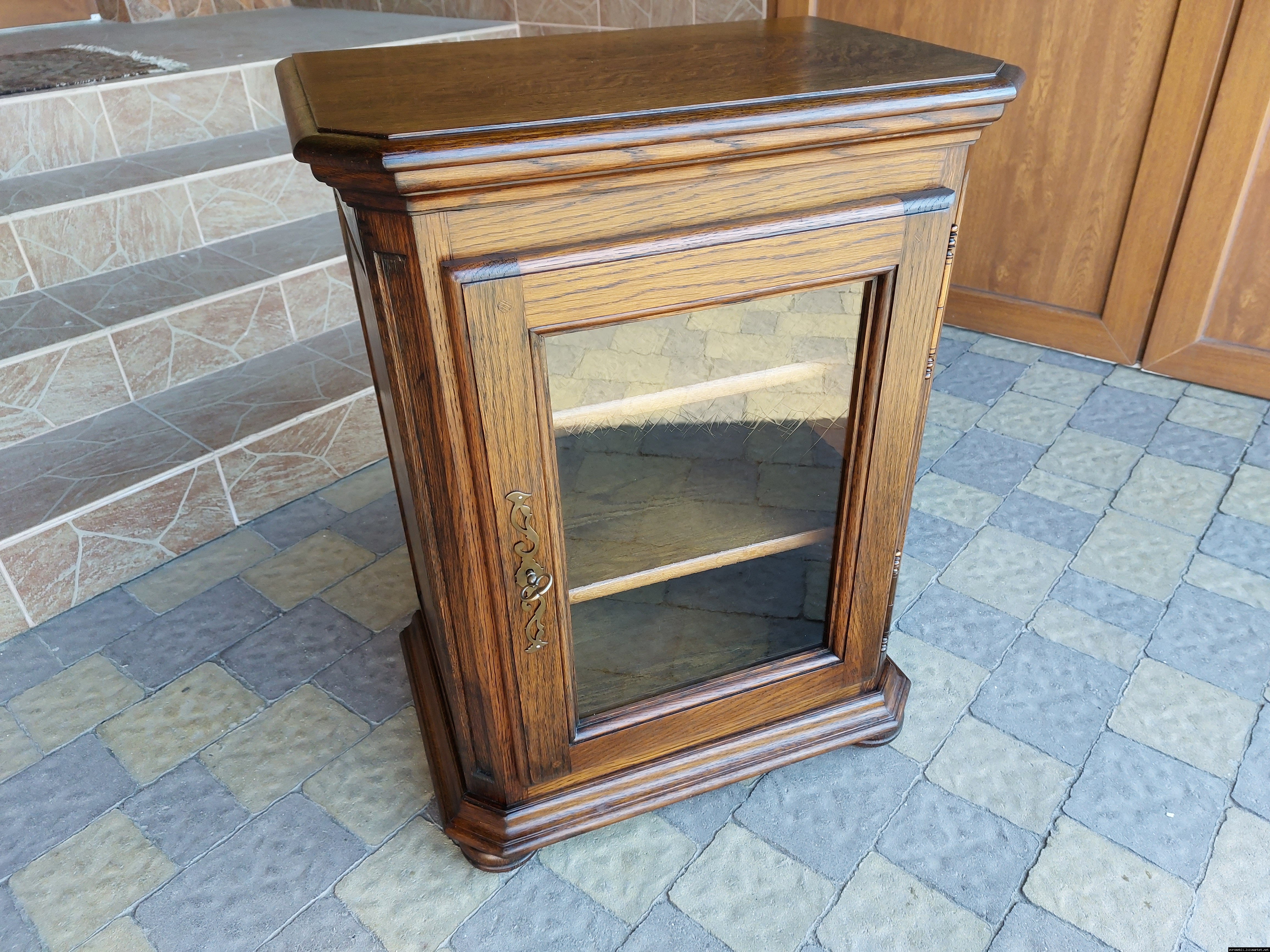 Дуже красива деревяна тумба в класичному стилі. Тумба виготовлена з натурального дерева, темний дуб, масив, має одну дверку зі склом, дверка зачиняється на ключ, всередині є деревяні полиці, висота полиць регулююється. Тумба в хорошому стані, проста та вишукана, повністю масивна, привезена з Бельгії.