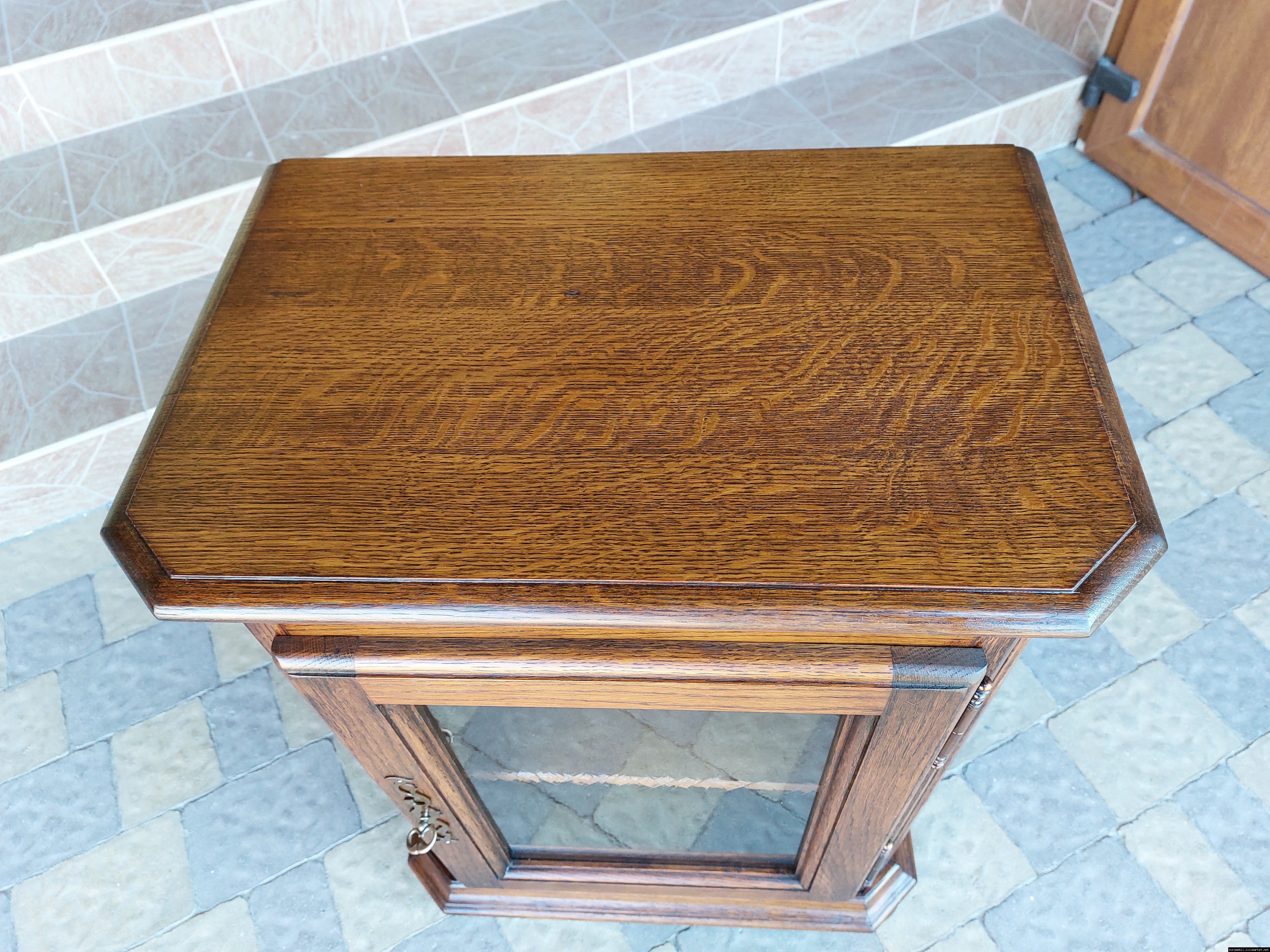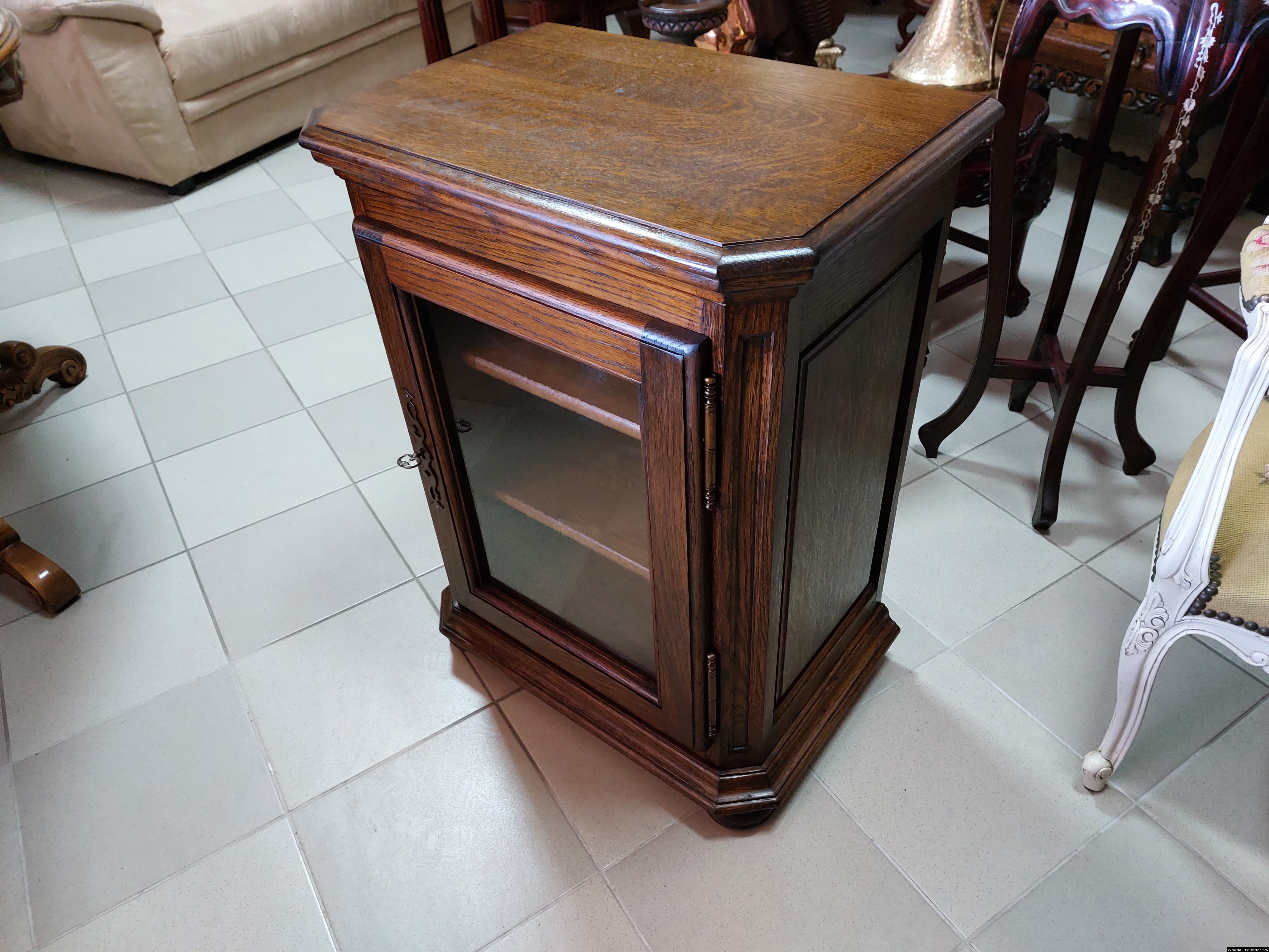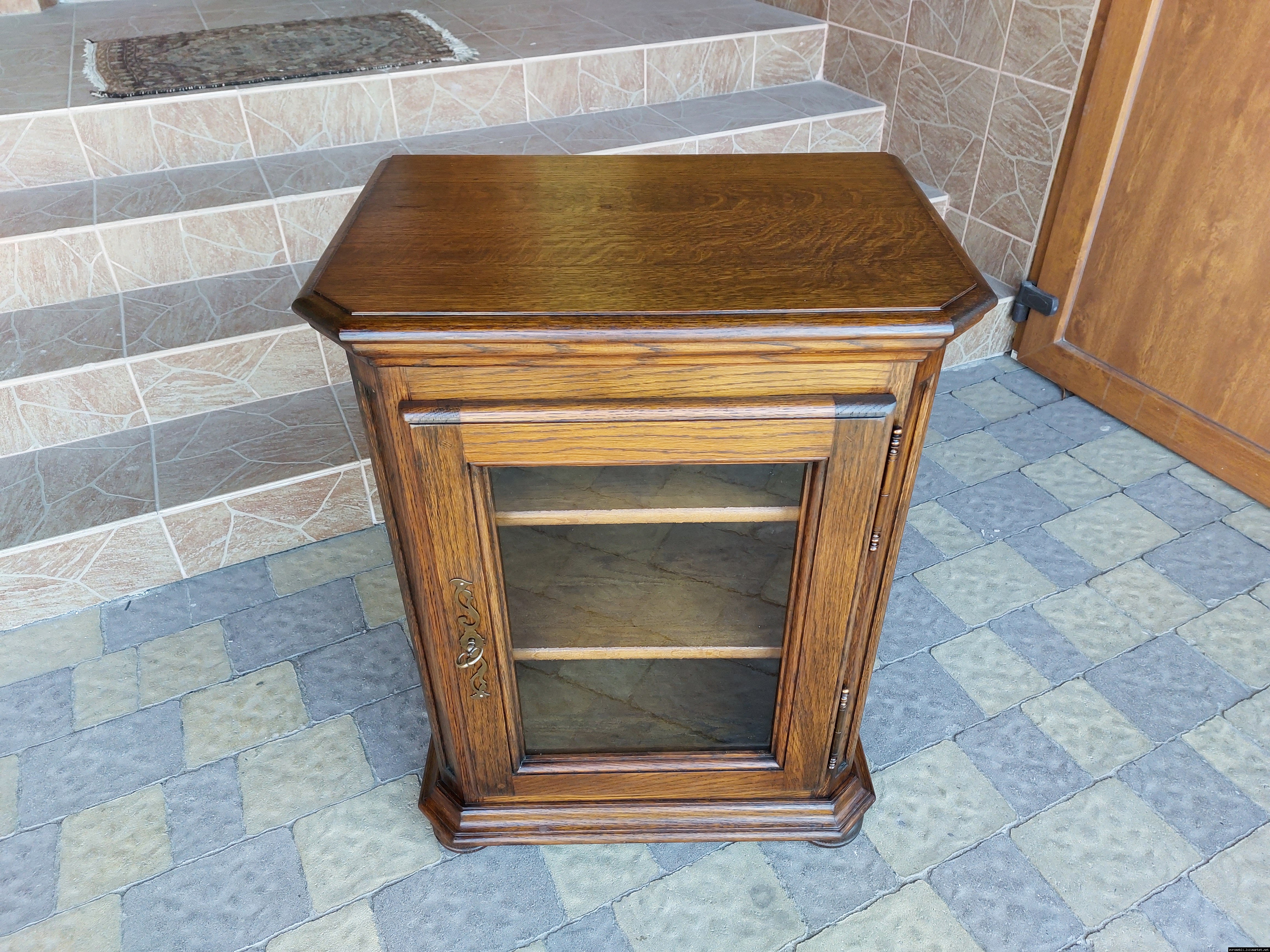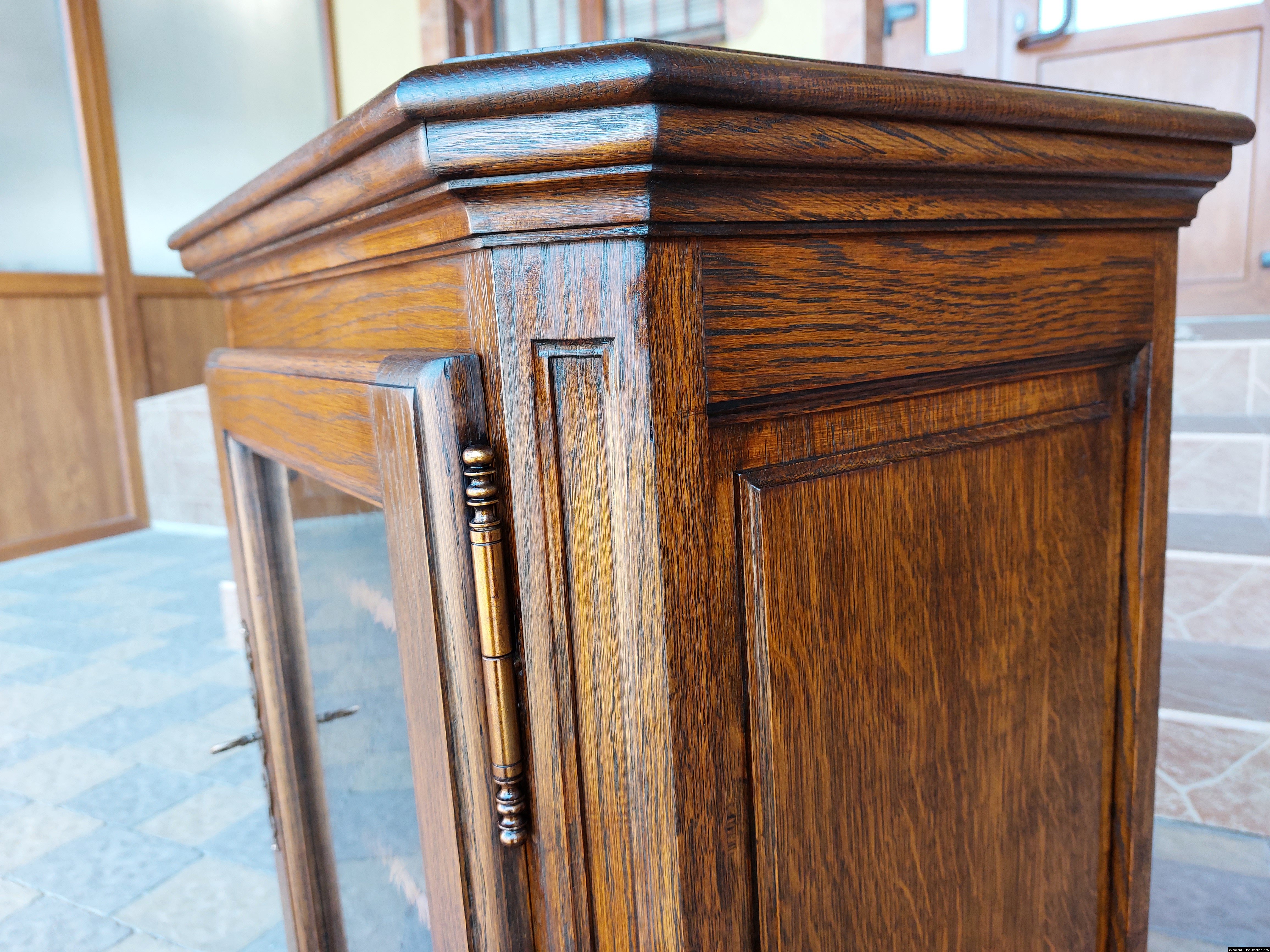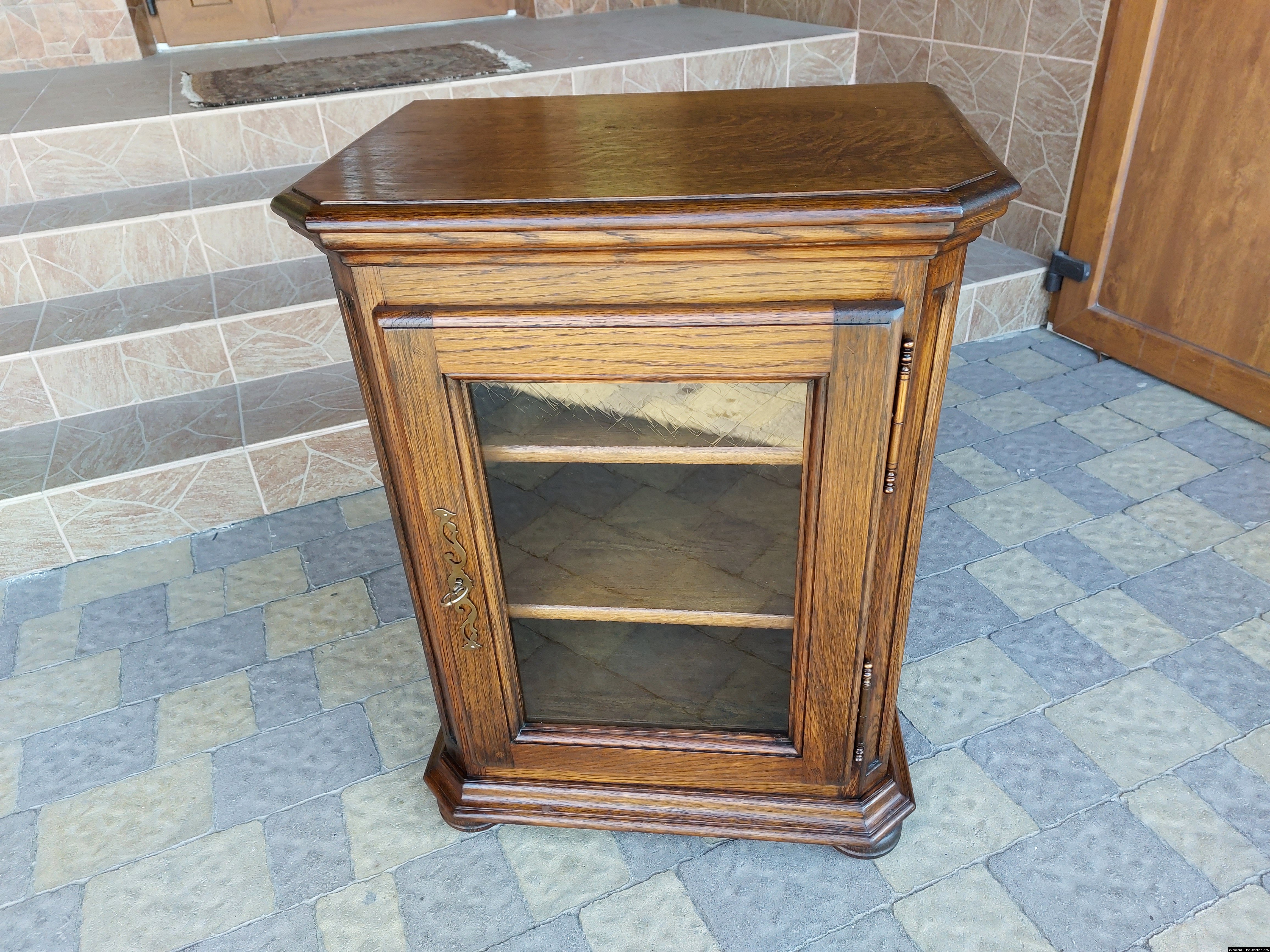Дуже красива деревяна тумба в класичному стилі. Тумба виготовлена з натурального дерева, темний дуб, масив, має одну дверку зі склом, дверка зачиняється на ключ, всередині є деревяні полиці, висота полиць регулююється. Тумба в хорошому стані, проста та вишукана, повністю масивна, привезена з Бельгії.